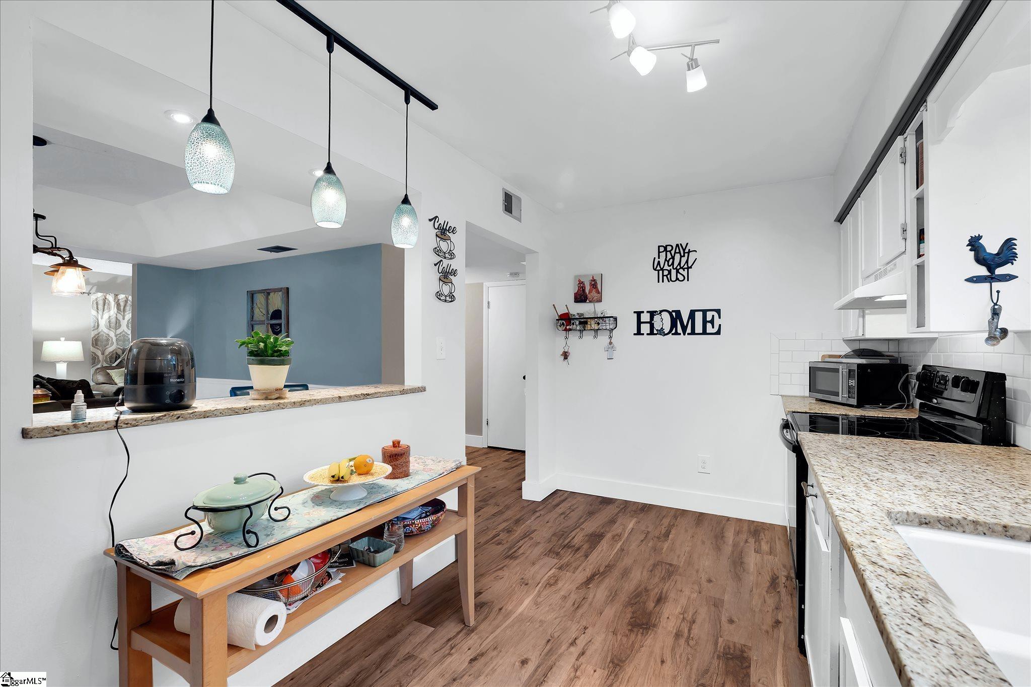 Conveniently located close to downtown with easy access to I-385 and I-85, this well-maintained community offers both connectivity and a quiet setting. Just minutes from the expanding Swamp Rabbit Trail and the new 10-acre Wheelsports Park off Haywood Road. Six months of HOA dues prepaid at closing! The HOA offers exceptional value including your water bill, trash pickup (no big bins required), weekly lawn care and landscape maintenance, roof and exterior maintenance, and pest control. Community amenities include a pool, clubhouse, wooded walking areas, and green space. Walk to Publix, Sprouts Farmers Market, and popular restaurants. Only five minutes to Haywood Mall for all your shopping needs and Roper Mountain Science Center to learn and explore. Inside this end-unit condo you’ll notice its bright, open floor plan and features like granite countertops, new LVP and hardwood flooring, wood and iron stair railings, a tiled primary shower, tile surround in the hall bath and an abundance of storage space. Large windows provide abundant natural light, and sliding doors open to a private, tree-shaded patio. The spacious primary suite offers large windows, multiple closets, and an updated bath. Two additional bedrooms provide generous closet space. Extra storage includes a pull-down attic and exterior patio closet. Great location, great upgrades—this one stands out in the community!
