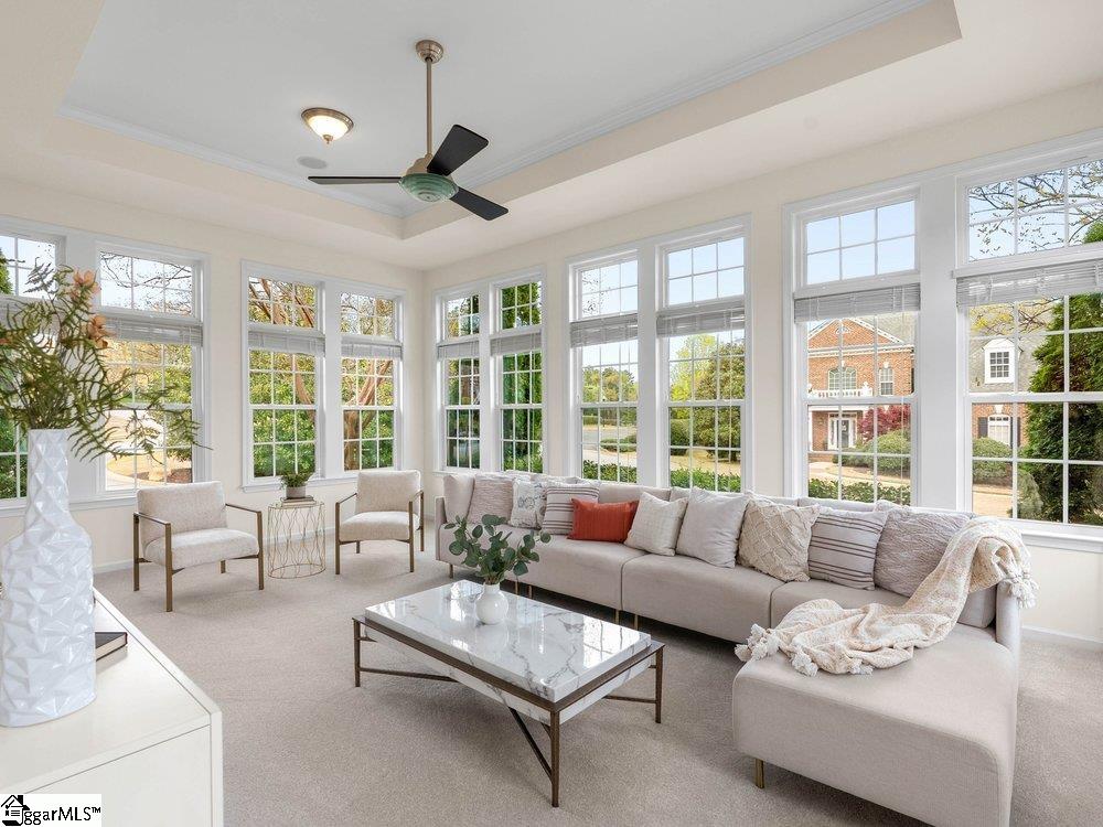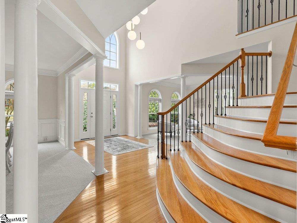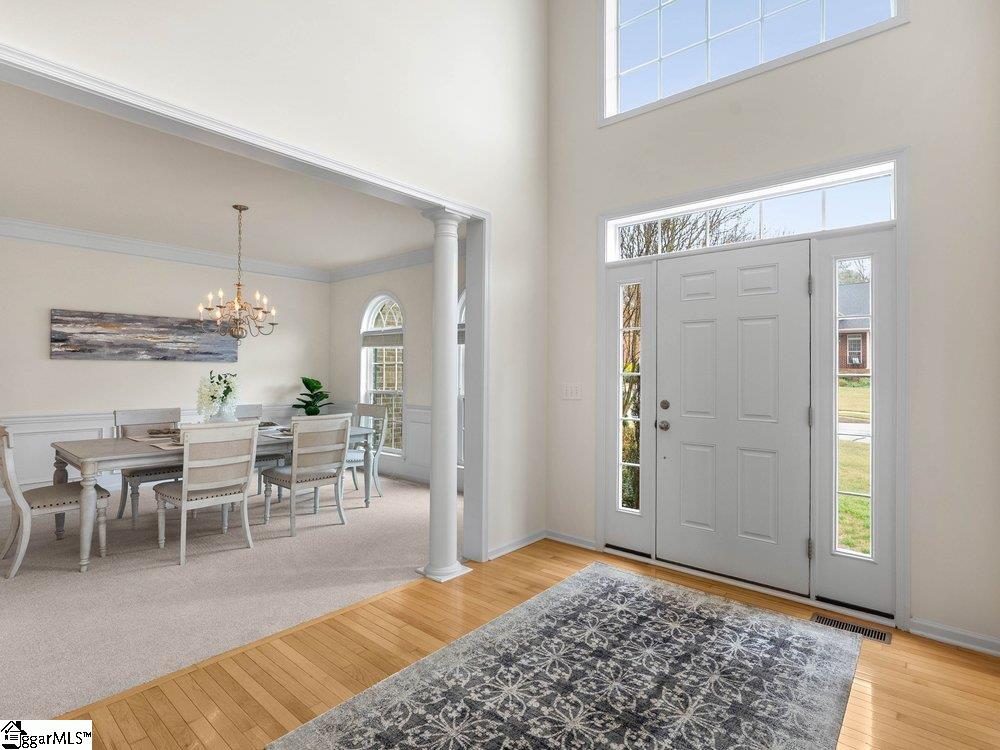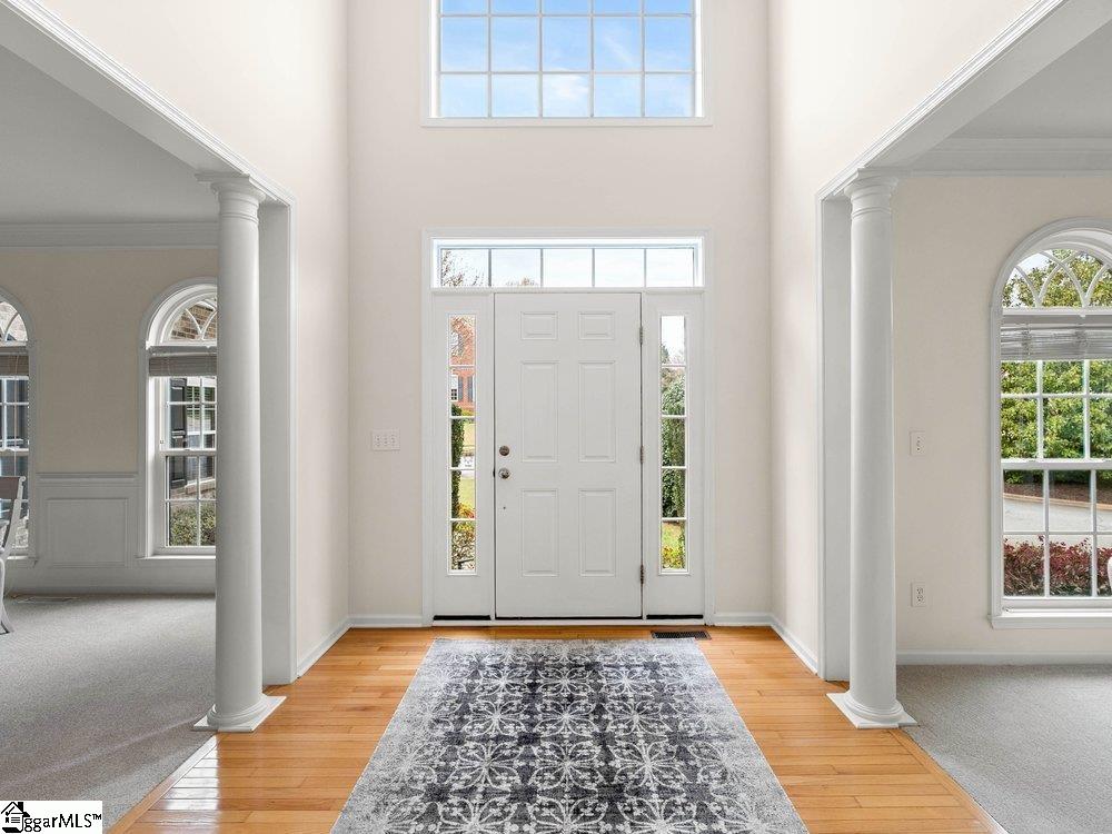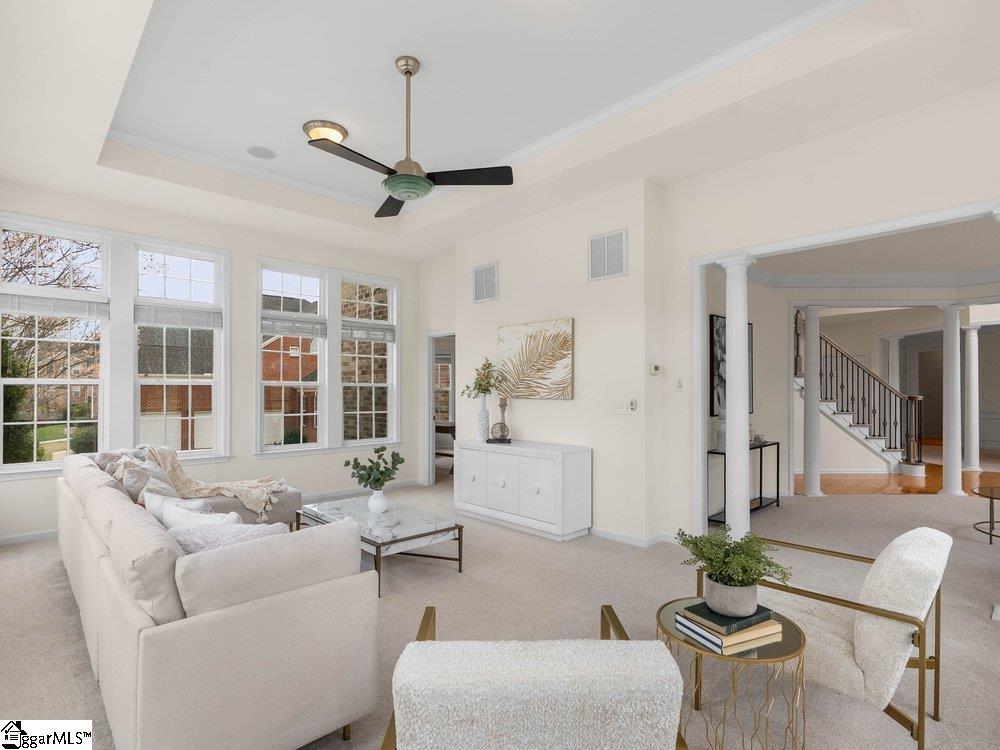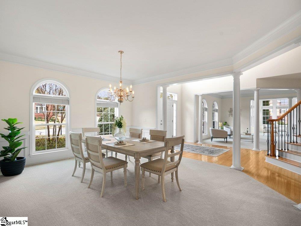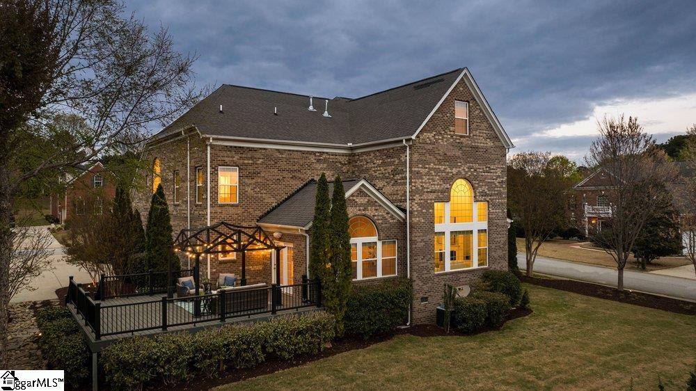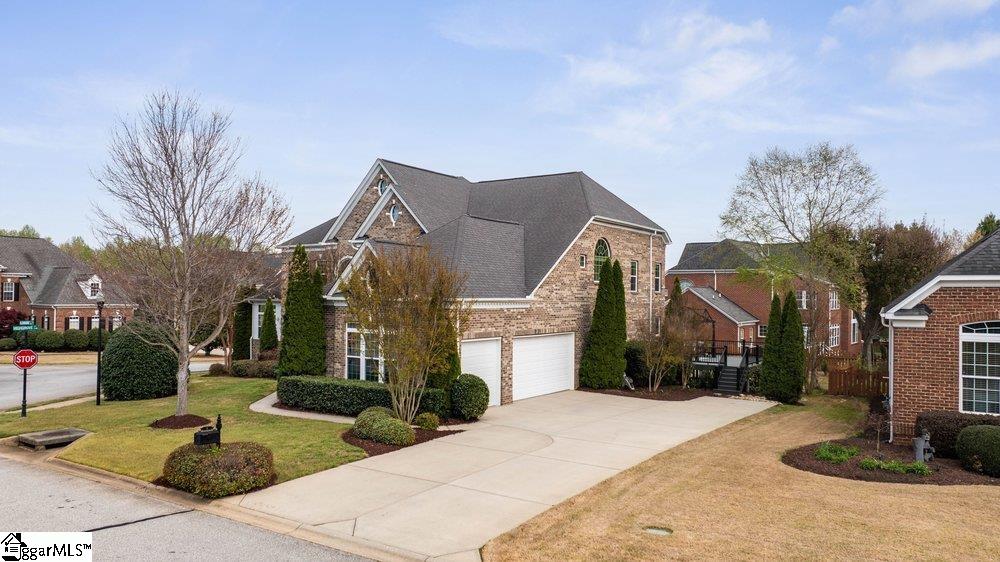 Welcome to a rare opportunity right in the heart of Five Forks—where timeless architecture, exceptional scale, and an unbeatable location come together seamlessly. Situated on a prominent corner lot in Highgrove Estates, this stately all-brick residence offers over 5,700 square feet of thoughtfully designed living space, featuring 4 bedrooms and 4 bathrooms, blending everyday comfort with refined elegance. From the moment you step inside, you’re greeted by soaring ceilings, rich hardwood floors, and a grand staircase that sets the tone for the home’s impressive presence. Expansive living areas are filled with natural light, anchored by a dramatic two-story great room with a fireplace and a wall of arched windows that create both warmth and architectural interest. The Sunroom/Conservatory is a perfect place to escape with a book or enjoy time friends. The kitchen is designed for both function and gathering—featuring ALL NEW APPLIANCES, generous counter space, an oversized EAT-UP island, and effortless flow into the large breakfast area and main living spaces. Formal dining and sitting rooms provide the perfect backdrop for hosting, while maintaining a sense of comfort and ease. The primary suite offers a true retreat, complete with a spacious layout, spa-like bath with soaking tub, and private access to the adjoining living spaces. Additional bedrooms and Bonus Room are generously sized, offering flexibility for guests, home offices, or multi-generational living. Step outside to a new beautifully designed TREX deck—an inviting extension of the home featuring a custom pergola and ambient lighting, ideal for year-round entertaining or quiet evenings at home. Located in one of the most sought-after areas of Five Forks, this home offers unmatched convenience to top-rated schools, dining, shopping, GSP International Airport and everything the Upstate has to offer. Offered at $1,150,000—this is a home that delivers on presence, lifestyle, and location.