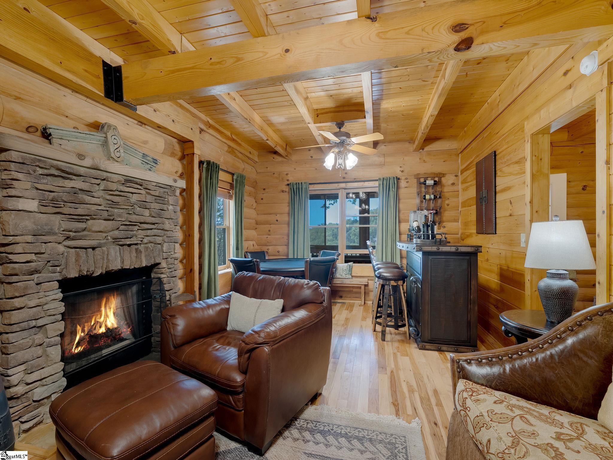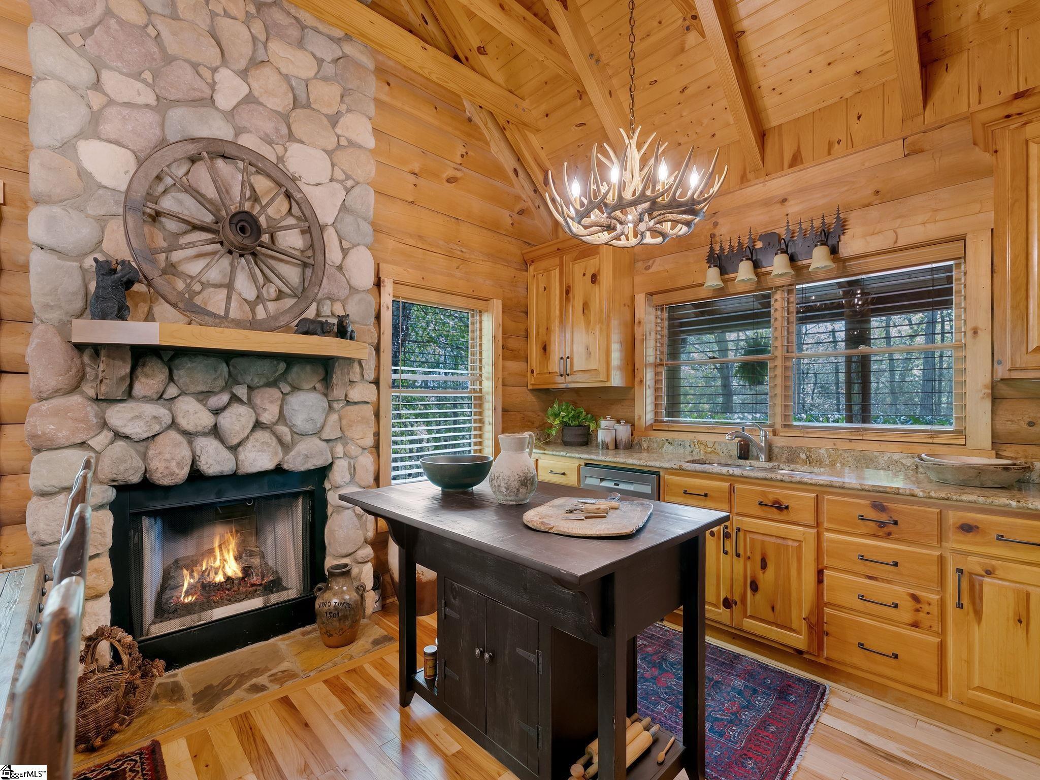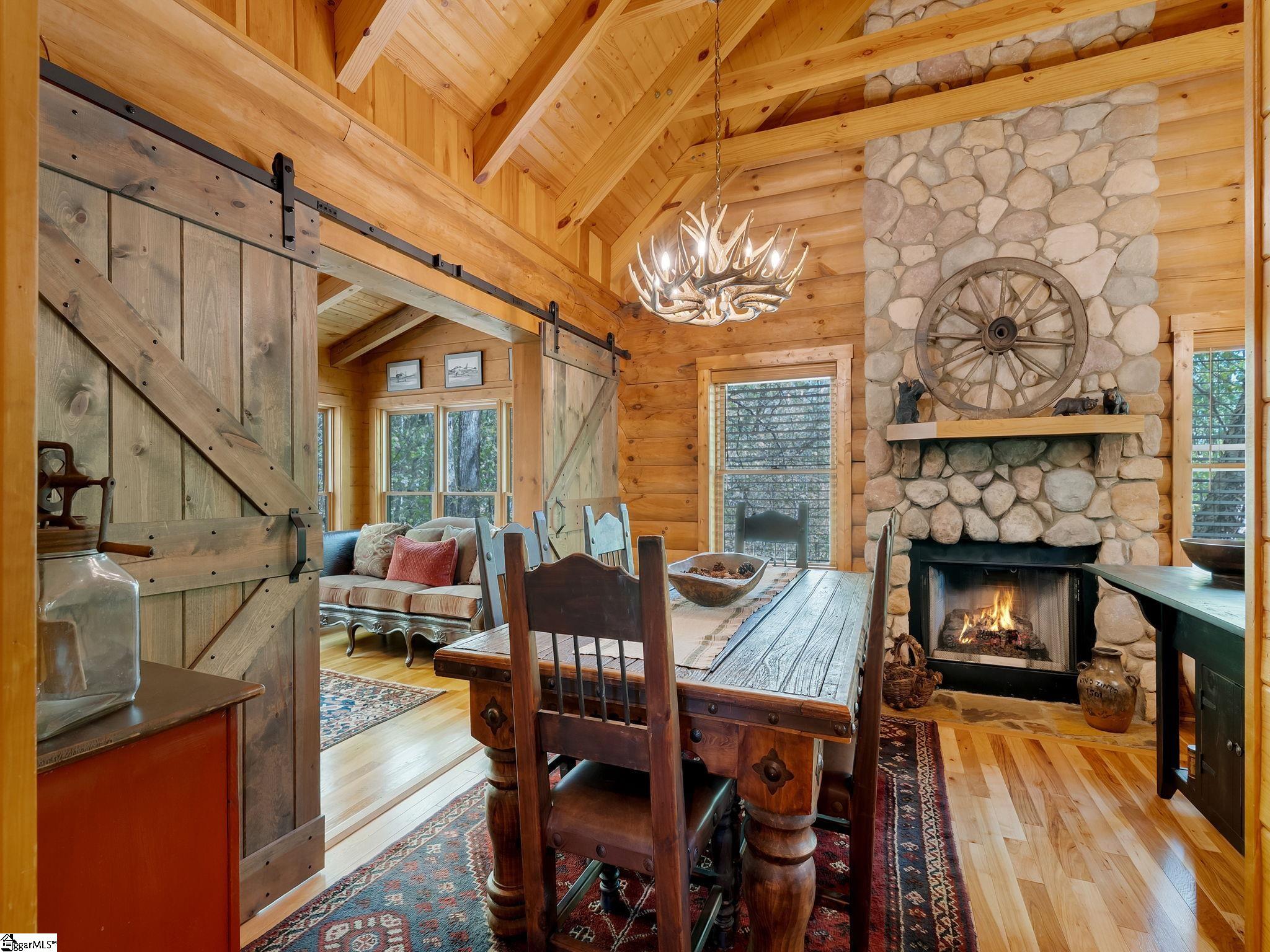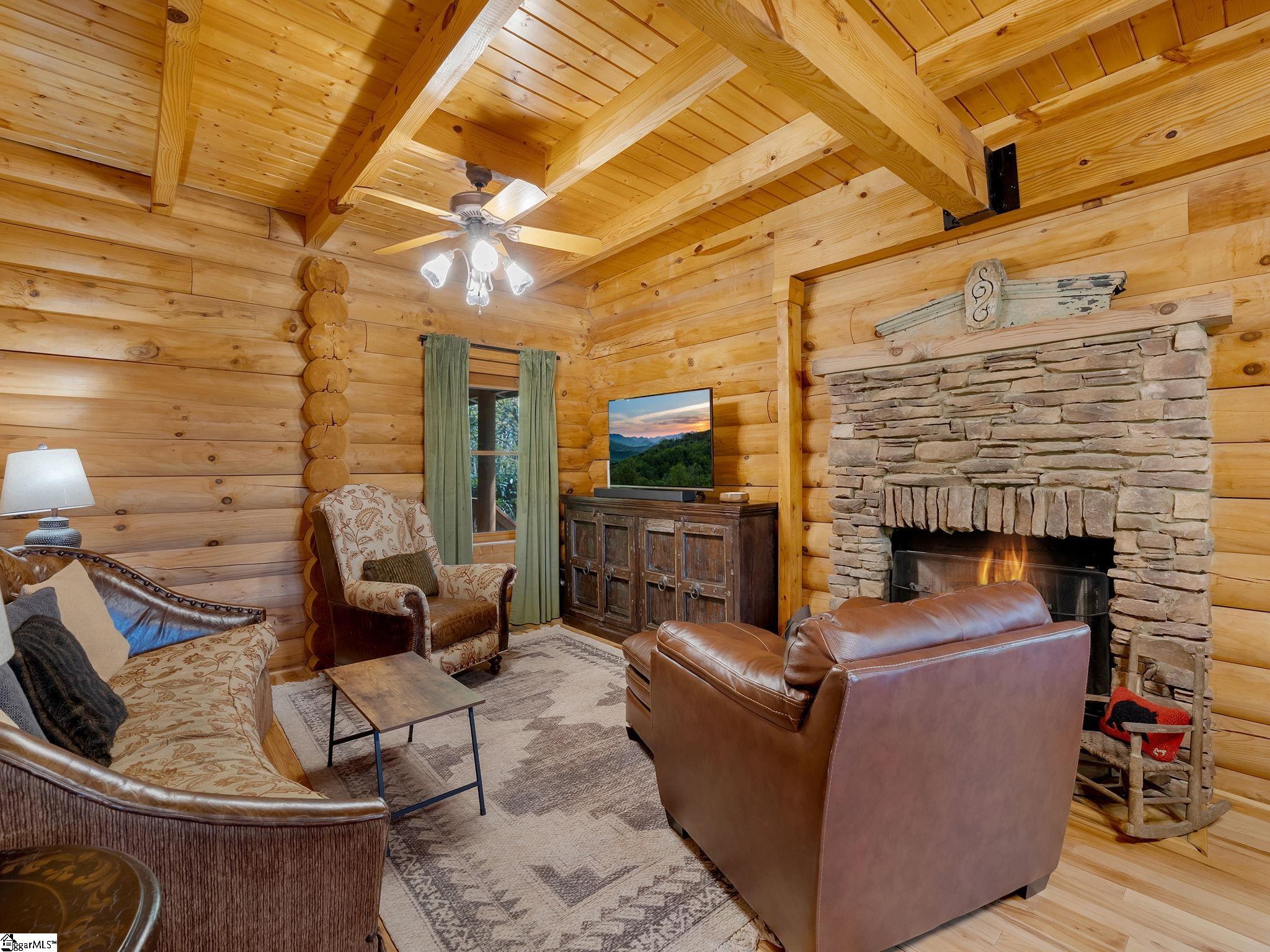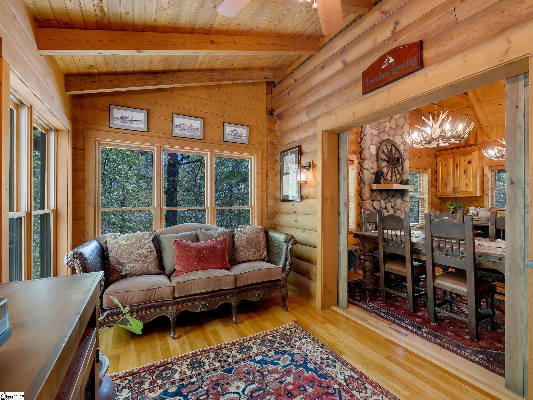 Welcome to 100 Eagle Rock Road, a charming log mountain retreat privately situated on 2.7 acres at approximately 1,650 feet of elevation. Tucked within a peaceful natural setting, this inviting residence offers the perfect blend of rustic character, modern comfort, and exceptional privacy. From the moment you arrive, you’ll appreciate the home’s curb appeal, enhanced by upgraded driveway edge stones, beautifully improved landscape lighting with smart app controls, and an easy, level driveway providing effortless access to the attached two-car garage. Sweeping south to southwest mountain views create a stunning backdrop, making this an ideal opportunity to downsize in style or enjoy as a weekend or seasonal escape. Inside, the foyer welcomes you with the warmth and beauty that only a true mountain home can offer. The kitchen serves as the heart of the residence, featuring stainless steel appliances, a Samsung refrigerator and microwave (2023), granite countertops, gas cooktop, added center island, and a soaring A-frame rustic ceiling. The breakfast nook gas fireplace adds a cozy ambiance, perfect for quiet mornings or intimate dinners. Adjacent to the kitchen, a versatile den—converted from a former sunroom—has been thoughtfully updated and offers exceptional flexibility as a bright home office, sitting room, recreation room, or separate dining area. Updated light fixtures throughout the home provide a fresh, refined touch while complementing the timeless log construction. Just down the hall, the spacious living room invites gatherings with family and friends around the impressive stone gas fireplace. Whether entertaining guests or enjoying a peaceful evening with a good book, this room offers comfort and classic mountain charm. The generous primary suite is designed as a private retreat, featuring ample walk-in closet space, a study nook, and a spacious bath with dual vanities and tub/shower combination. The remodeled half bath further enhances the home’s style and functionality and is accented by an artisan copper sink.Upstairs, two guest bedrooms and a full bath comfortably accommodate visitors. Both upper-level bedroom closets include convenient attic access for additional storage. Outdoor living is equally inviting, offering a seamless extension of the home’s warm interior spaces and the perfect setting to enjoy the surrounding mountain beauty year-round. The screened porch spans the entire rear of the home, offering a tranquil place to relax while taking in breathtaking sunset views. A newly added deck and stairs provide easy access to the backyard, where there is ample room for pets, recreation, or grandchildren to play. Soak in the inviting hot tub and enjoy a peaceful place to relax while taking in the serene mountain surroundings. The view corridor to the left of the home has ARB approval for tree removal, presenting an opportunity to further open and enhance the mountain vistas. Additional recent improvements include new HVAC systems (2021 and 2023) and a new water heater. Abundant storage space is found in the lower-level garage, along with an attached 360+ sq. ft. laundry and storage room. This home includes the adjacent lot (tax#: 0638140103500, providing added privacy and flexibility, and is subject to an additional POA assessment. A Club membership at The Cliffs is available with this property giving you access to all seven communities.