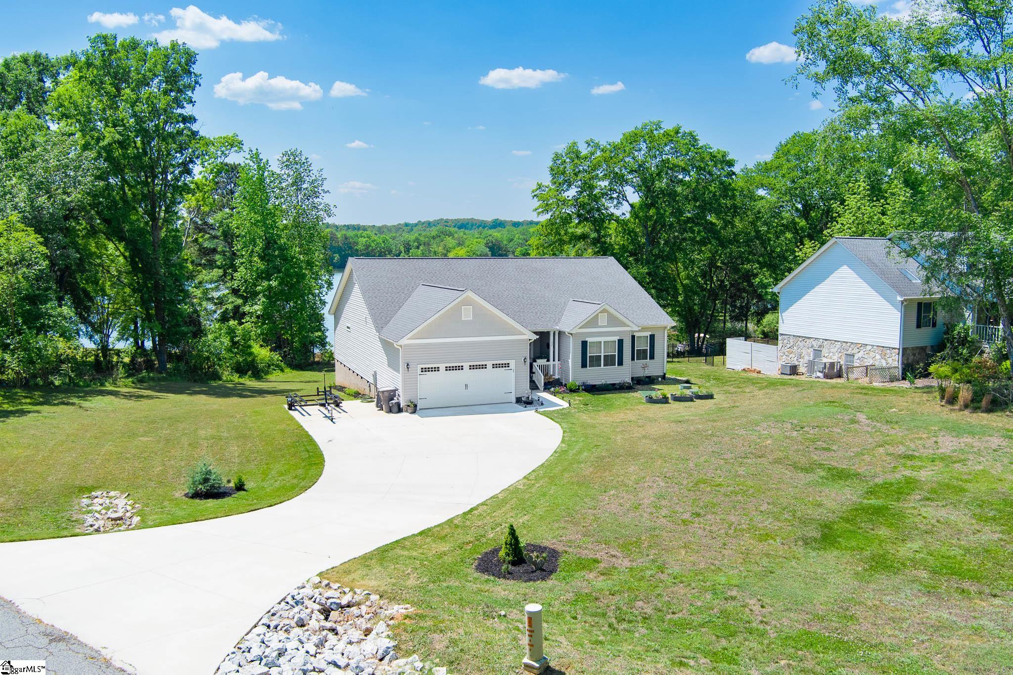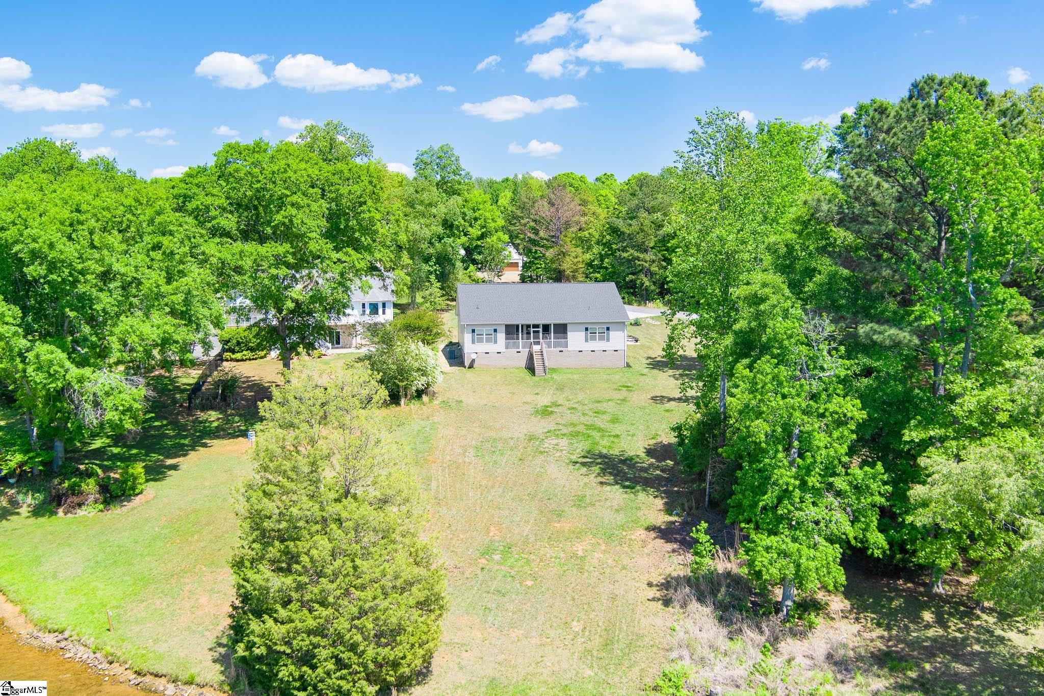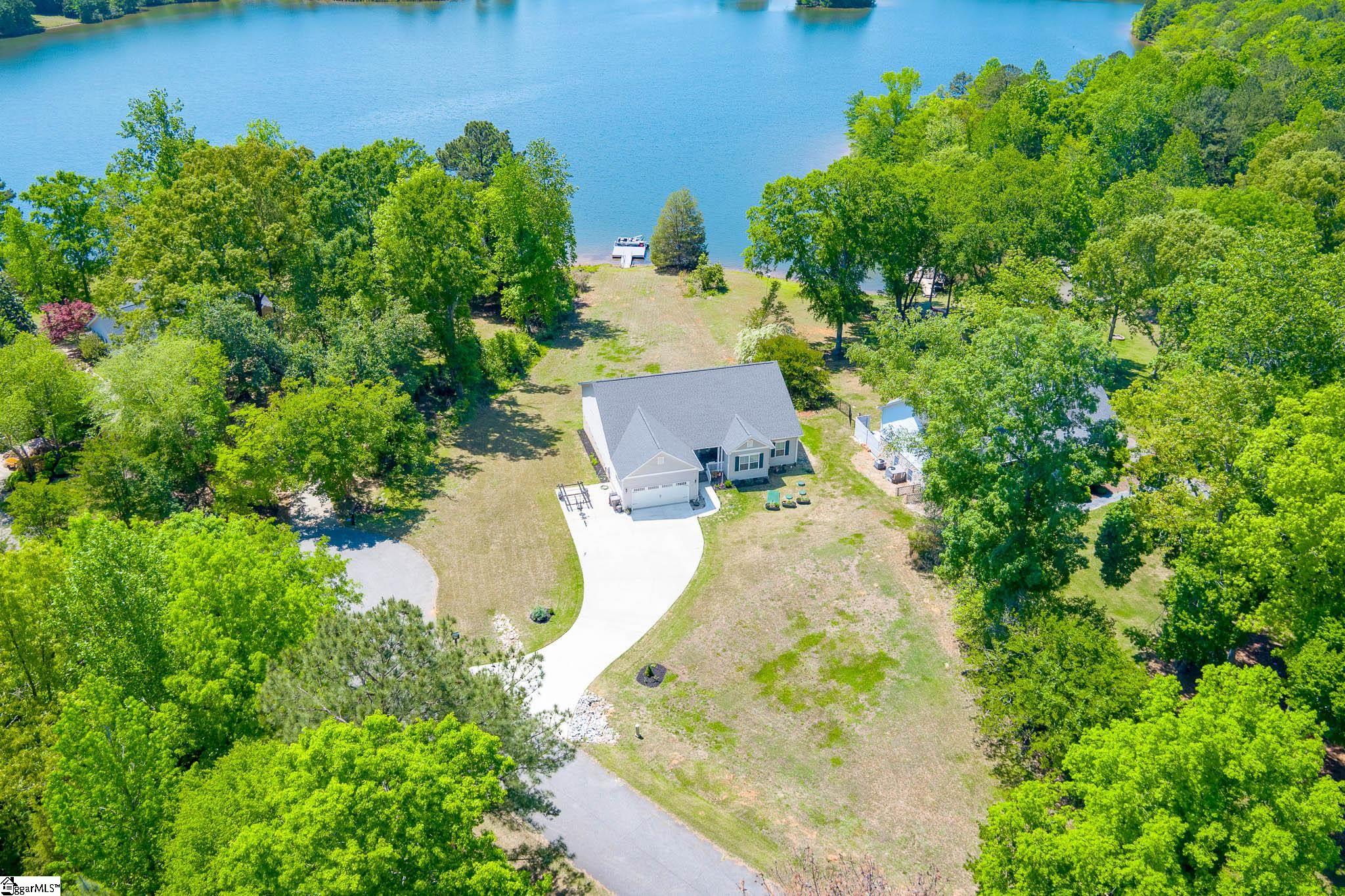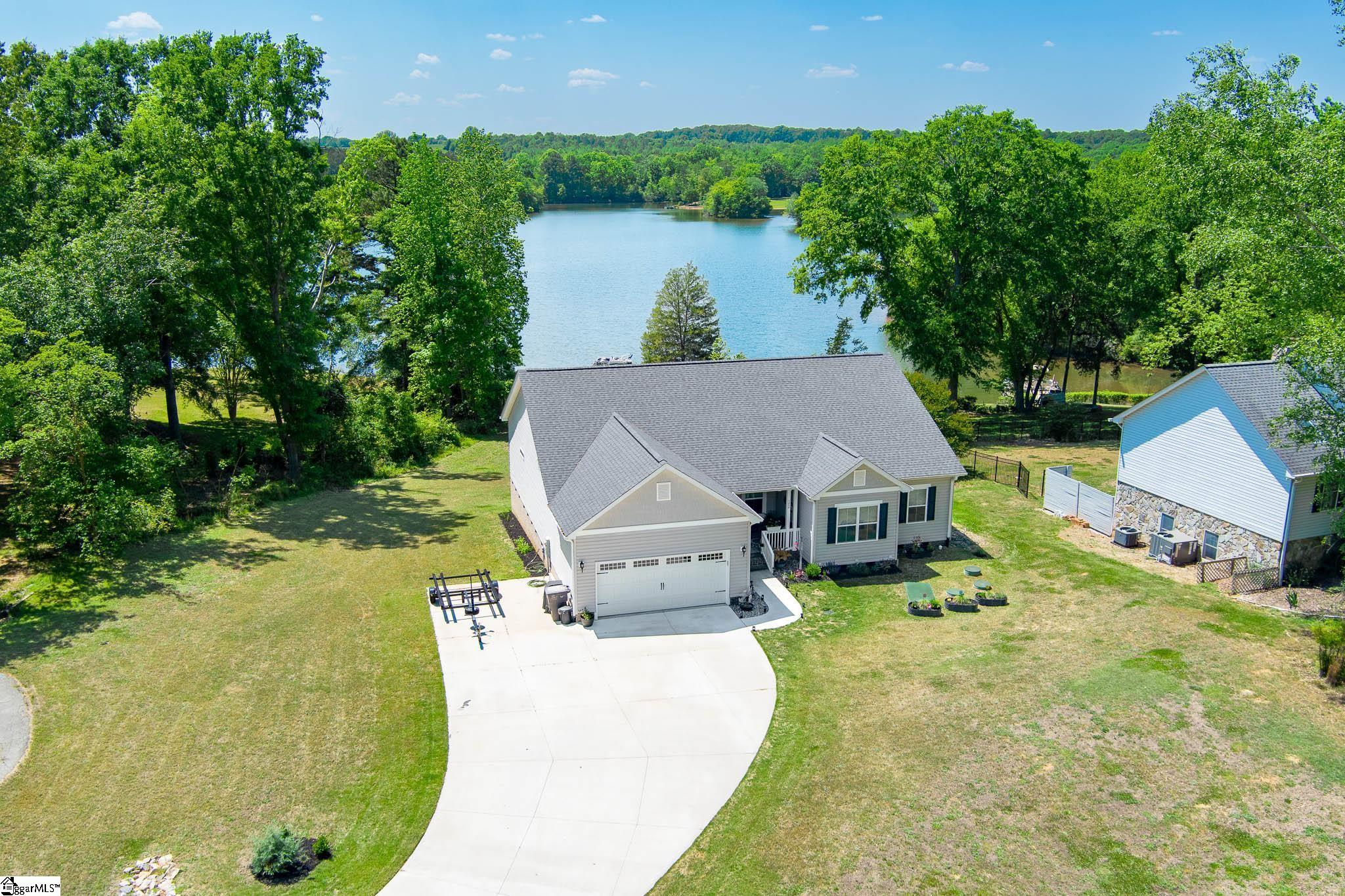 Welcome to lake living at its best. This 3 bedroom, 2 bath home built in 2022 sits on a private, shaded lot with incredible west facing views, giving you a front row seat to the sunset over the water every evening. Inside, natural light fills the home thanks to an abundance of windows, creating a bright and comfortable feel throughout. The kitchen is set up for gathering, with quartz countertops, an oversized island, and an easy flow into the main living space and out to the screened in back porch. The primary suite was designed with both comfort and function in mind. It features an ADA compliant layout, a large walk in closet, and a laundry room conveniently located right in the suite. Step outside and enjoy both a covered front porch and a screened back porch overlooking the lake. A brand new dock is already in place, and the Quest Pontoon boat conveys (16 ft, new motor replace 2025), so you can start enjoying the water right away! Additional features include a large crawl space for extra storage and an engineered septic system with active monitoring for peace of mind. This home is clean, modern, and move in ready with everything you need to enjoy lake life from day one.
