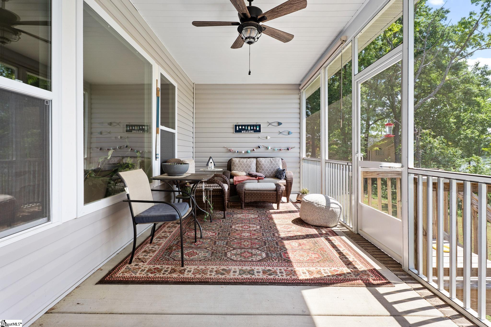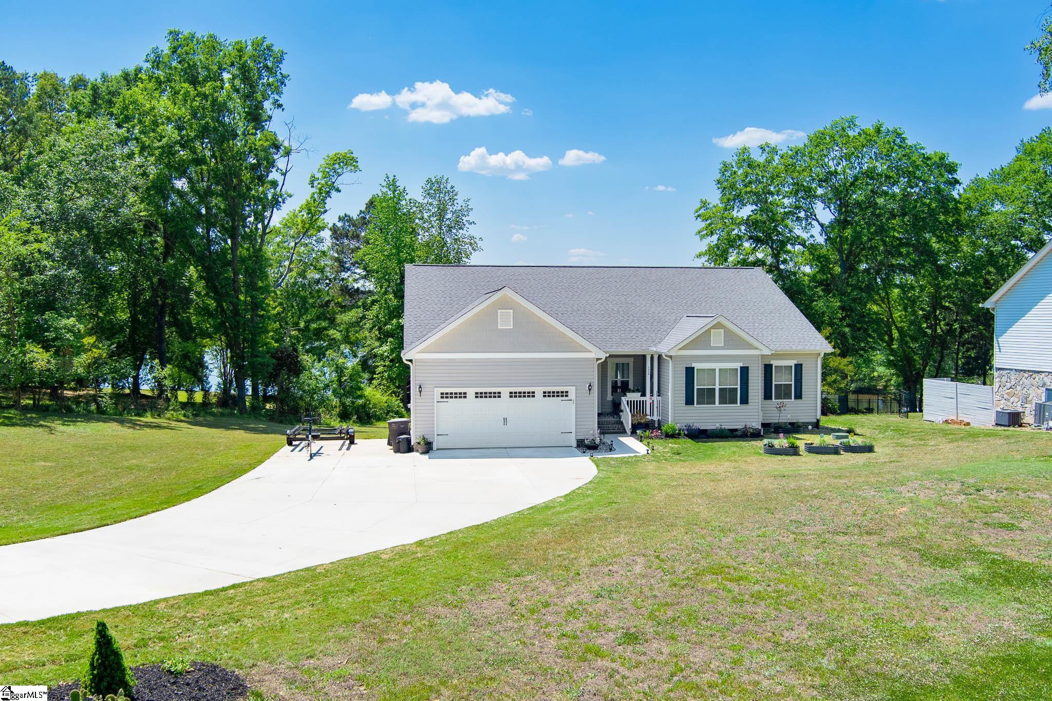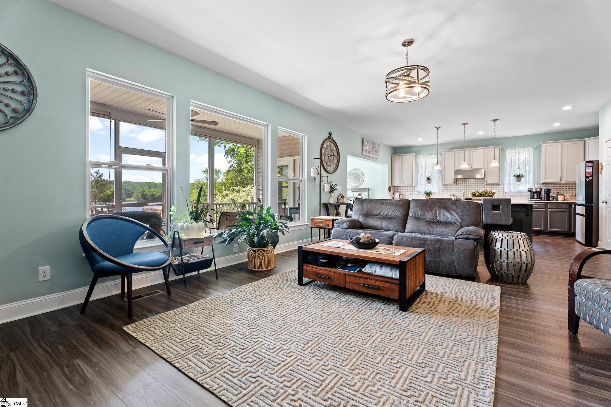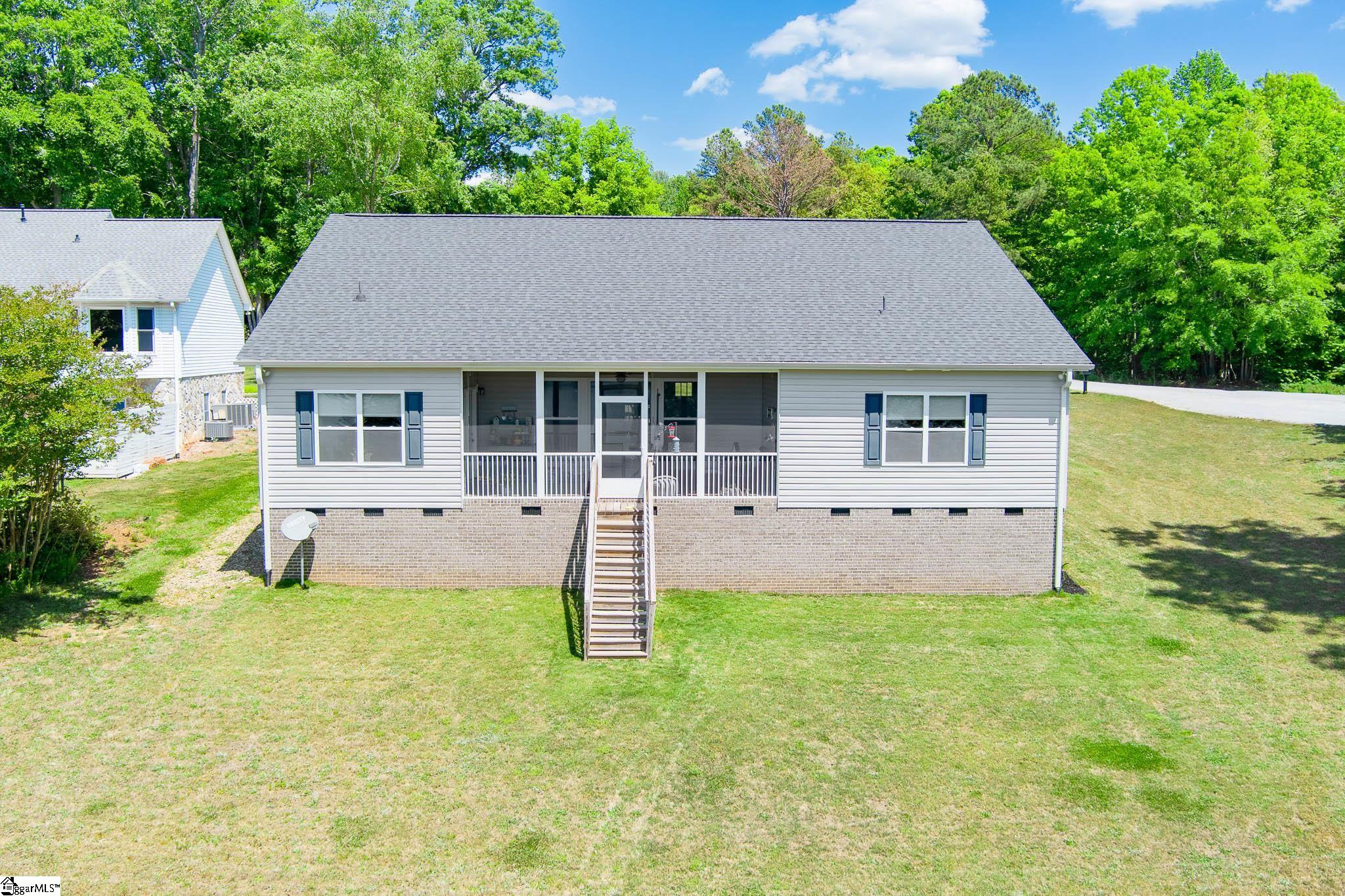 Welcome to lake living at its best. This 3 bedroom, 2 bath home built in 2022 sits on a private, shaded lot with incredible west facing views, giving you a front row seat to the sunset over the water every evening. Inside, natural light fills the home thanks to an abundance of windows, creating a bright and comfortable feel throughout. The kitchen is set up for gathering, with quartz countertops, an oversized island, and an easy flow into the main living space and out to the screened in back porch. The primary suite was designed with both comfort and function in mind. It features an ADA compliant layout, a large walk in closet, and a laundry room conveniently located right in the suite. Step outside and enjoy both a covered front porch and a screened back porch overlooking the lake. A brand new dock is already in place, and the Quest Pontoon boat conveys (16 ft, new motor replace 2025), so you can start enjoying the water right away! Additional features include a large crawl space for extra storage and an engineered septic system with active monitoring for peace of mind. This home is clean, modern, and move in ready with everything you need to enjoy lake life from day one.