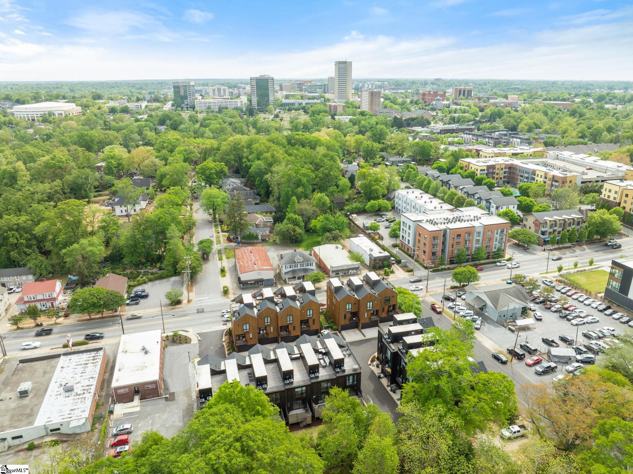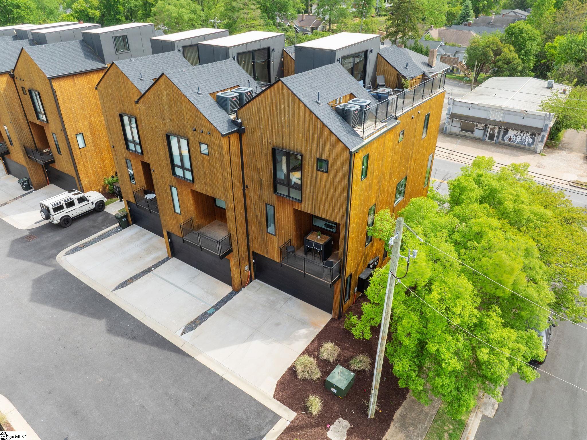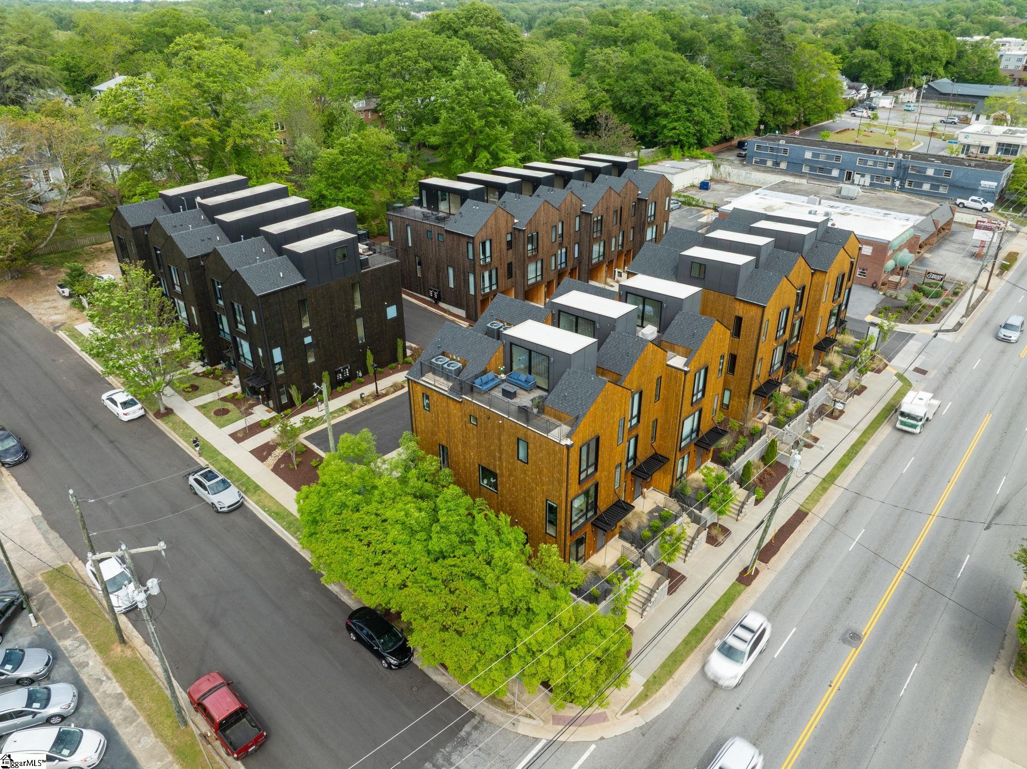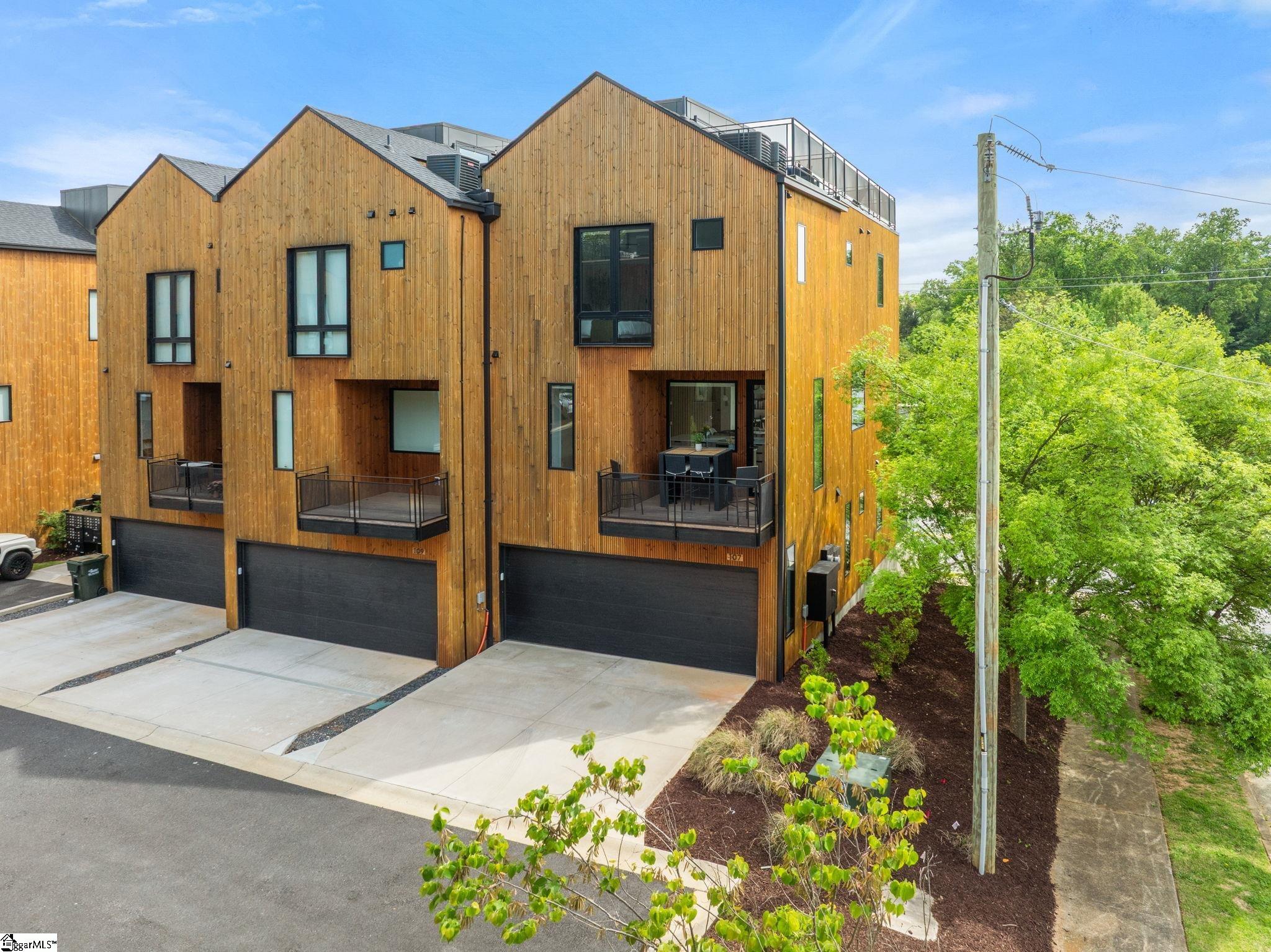 Elevated Scandinavian-inspired urban living meets a calm, modern retreat in this end-unit Downtown Greenville townhome, offered fully furnished and move-in ready. As a second residence, this home is basically a brand new construction. This 3 bedroom, 3.5 bath, 2,081 sqft home features a private elevator, bespoke cabinetry, and high-end thermally broken aluminum windows that fill the home with natural light. You can feel the intention in the curated interior design of the home, designed from the furniture to the dinnerware. The layout offers flexible living, a two-car garage, and HOA-maintained exterior for low-maintenance ownership. A rooftop terrace showcases stunning sunset views over downtown—perfect for entertaining or unwinding above the city. Ideally located between Earle Street and Main Street, this property is well-suited as a primary residence, lock and leave second home or investment opportunity. Coffee shops, restaurants, grocery store and even boutique shopping all walkable from this home. Morning walks on Earle and downtown walks for dinner, what could be better?