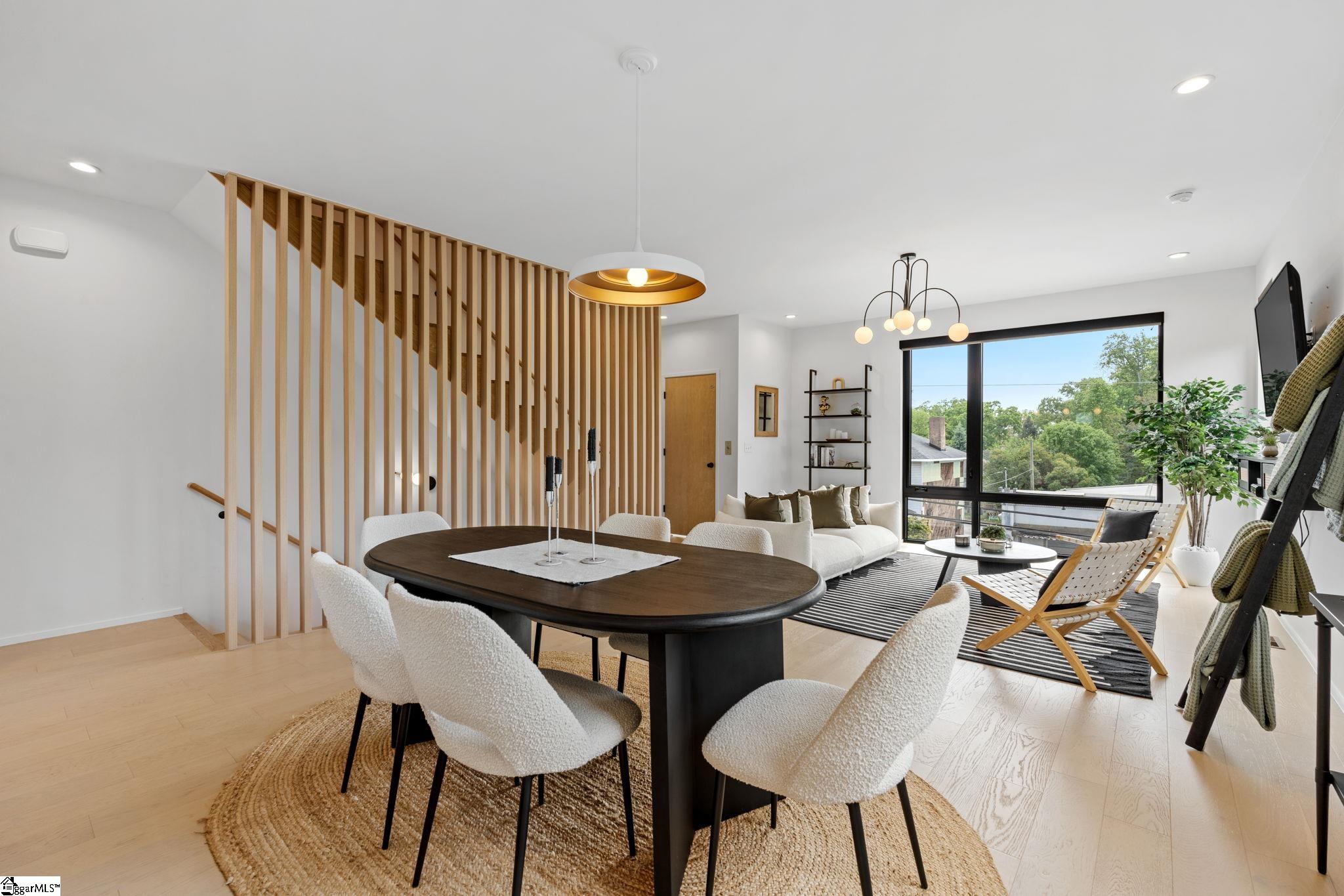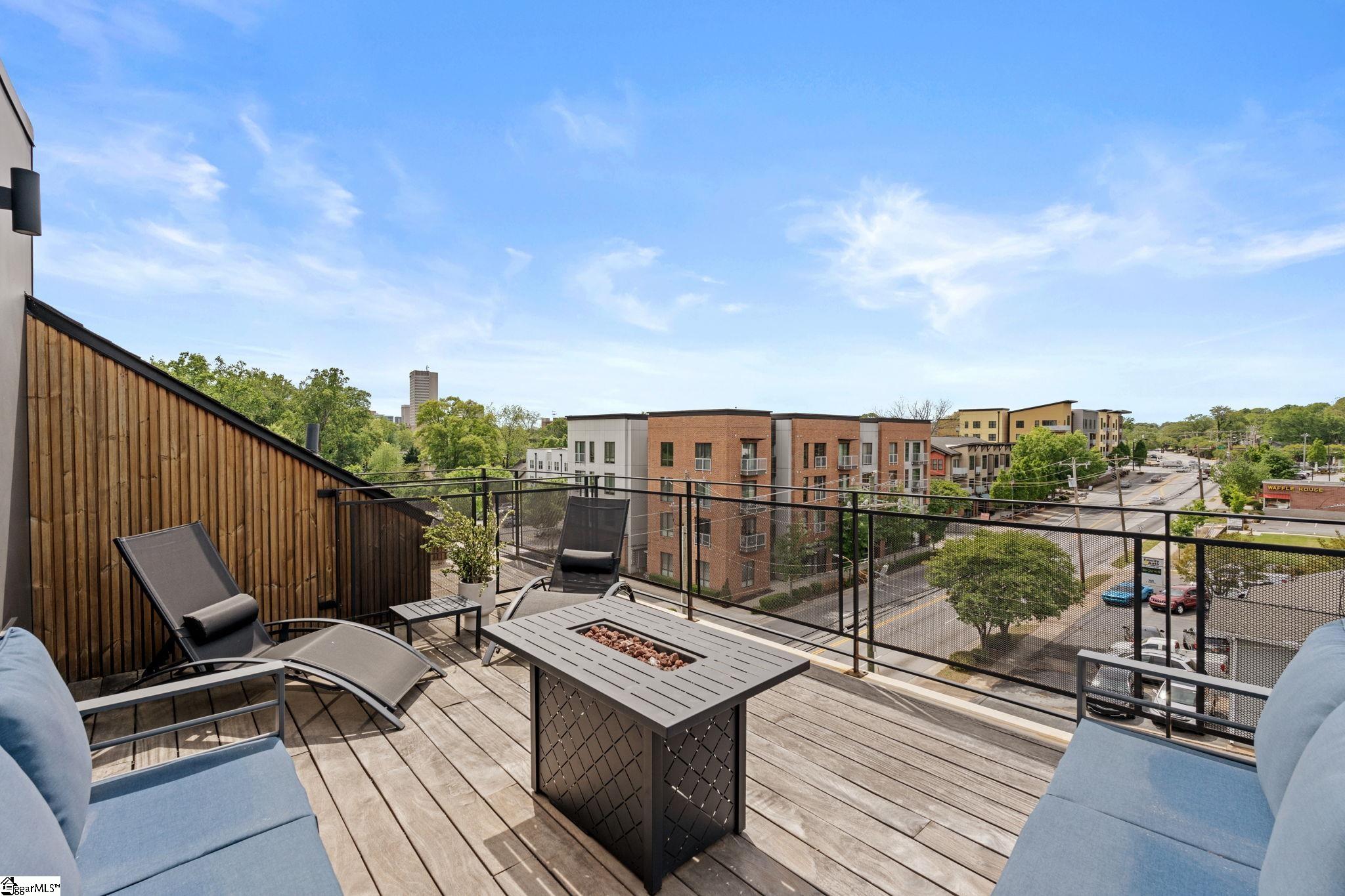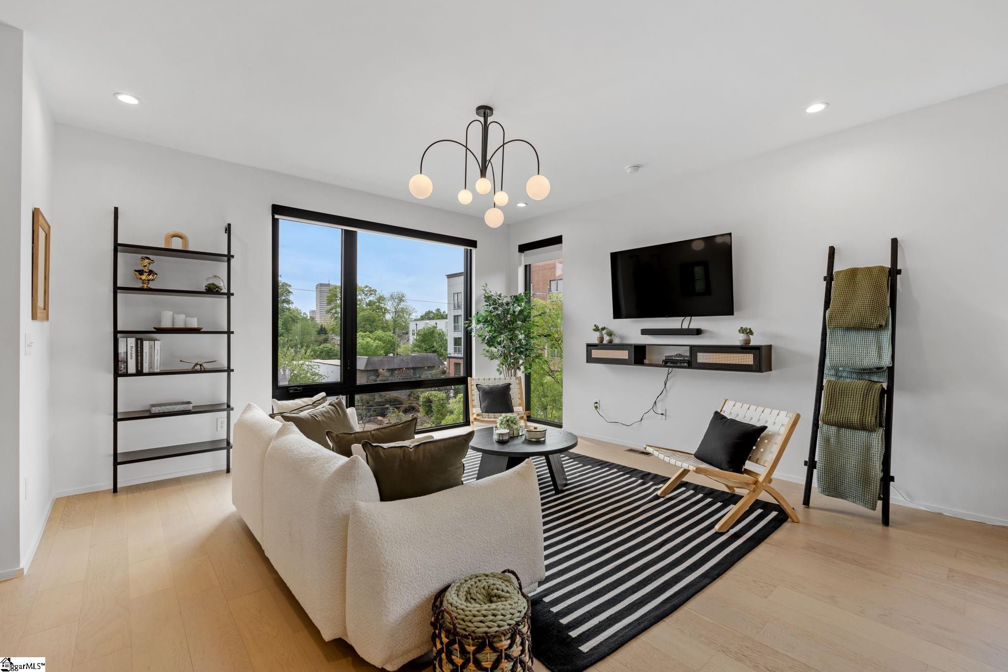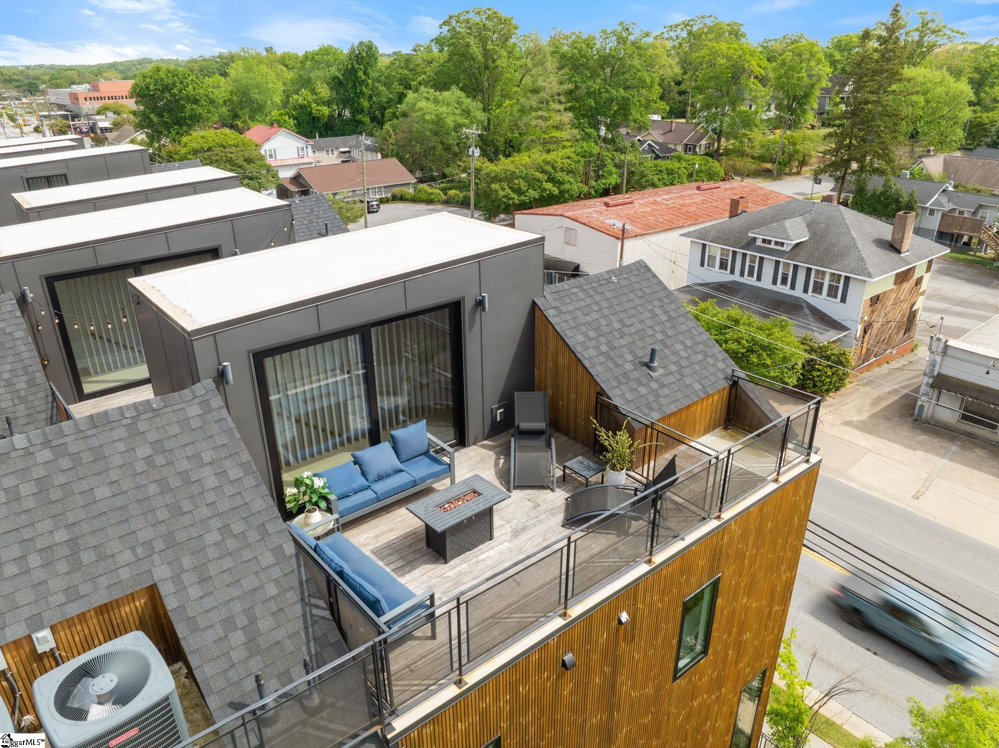Elevated Scandinavian-inspired urban living meets a calm, modern retreat in this end-unit Downtown Greenville townhome, offered fully furnished and move-in ready. As a second residence, this home is basically a brand new construction. This 3 bedroom, 3.5 bath, 2,081 sqft home features a private elevator, bespoke cabinetry, and high-end thermally broken aluminum windows that fill the home with natural light. You can feel the intention in the curated interior design of the home, designed from the furniture to the dinnerware. The layout offers flexible living, a two-car garage, and HOA-maintained exterior for low-maintenance ownership. A rooftop terrace showcases stunning sunset views over downtown—perfect for entertaining or unwinding above the city. Ideally located between Earle Street and Main Street, this property is well-suited as a primary residence, lock and leave second home or investment opportunity. Coffee shops, restaurants, grocery store and even boutique shopping all walkable from this home. Morning walks on Earle and downtown walks for dinner, what could be better?
