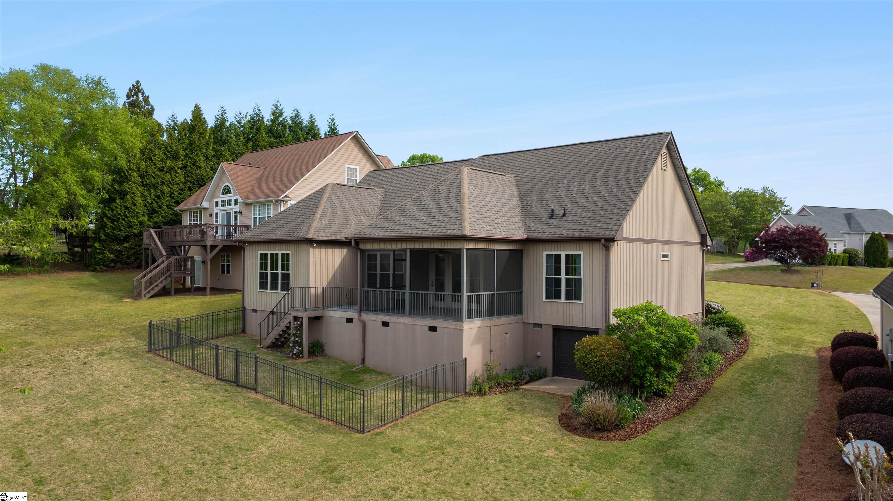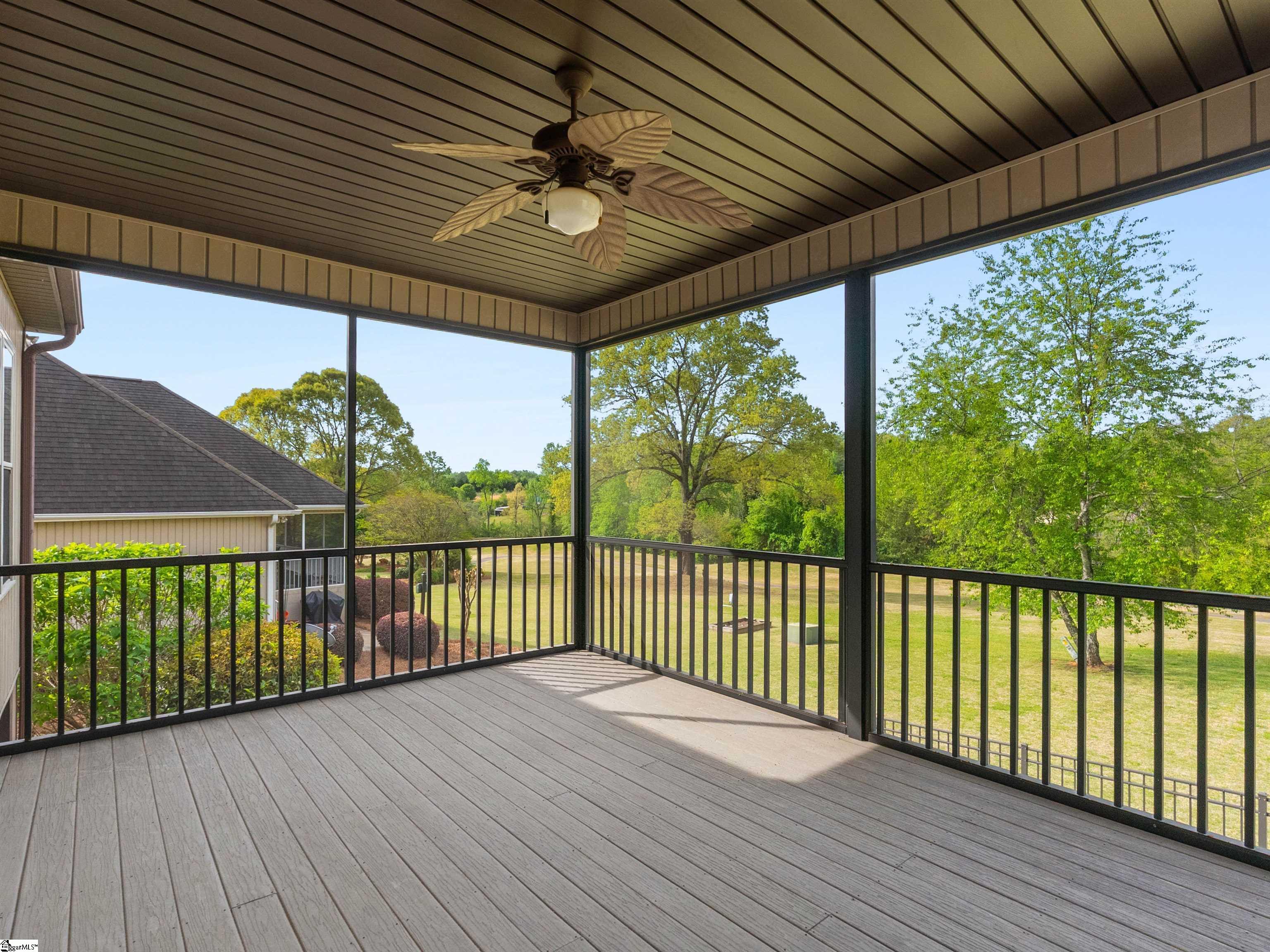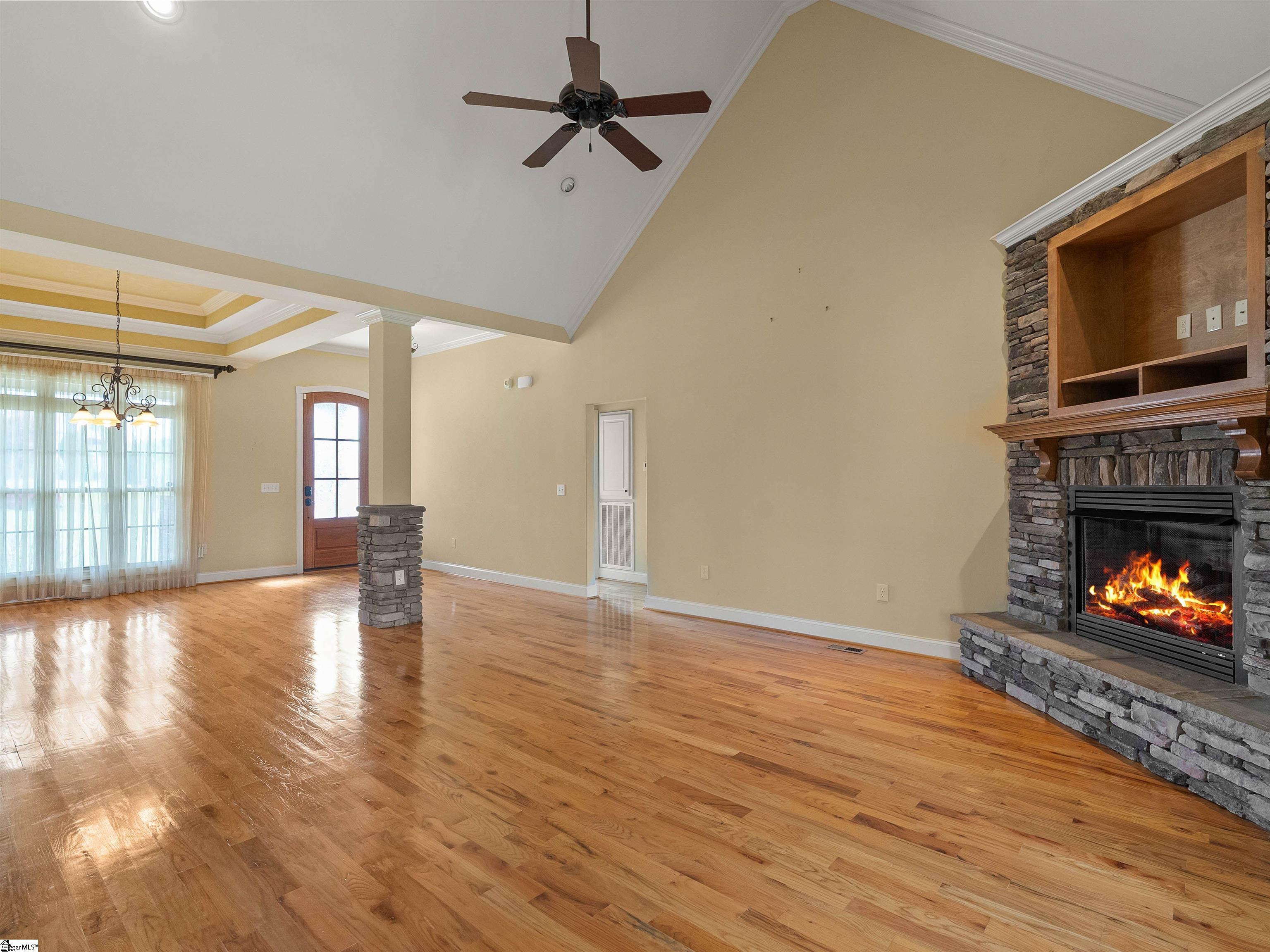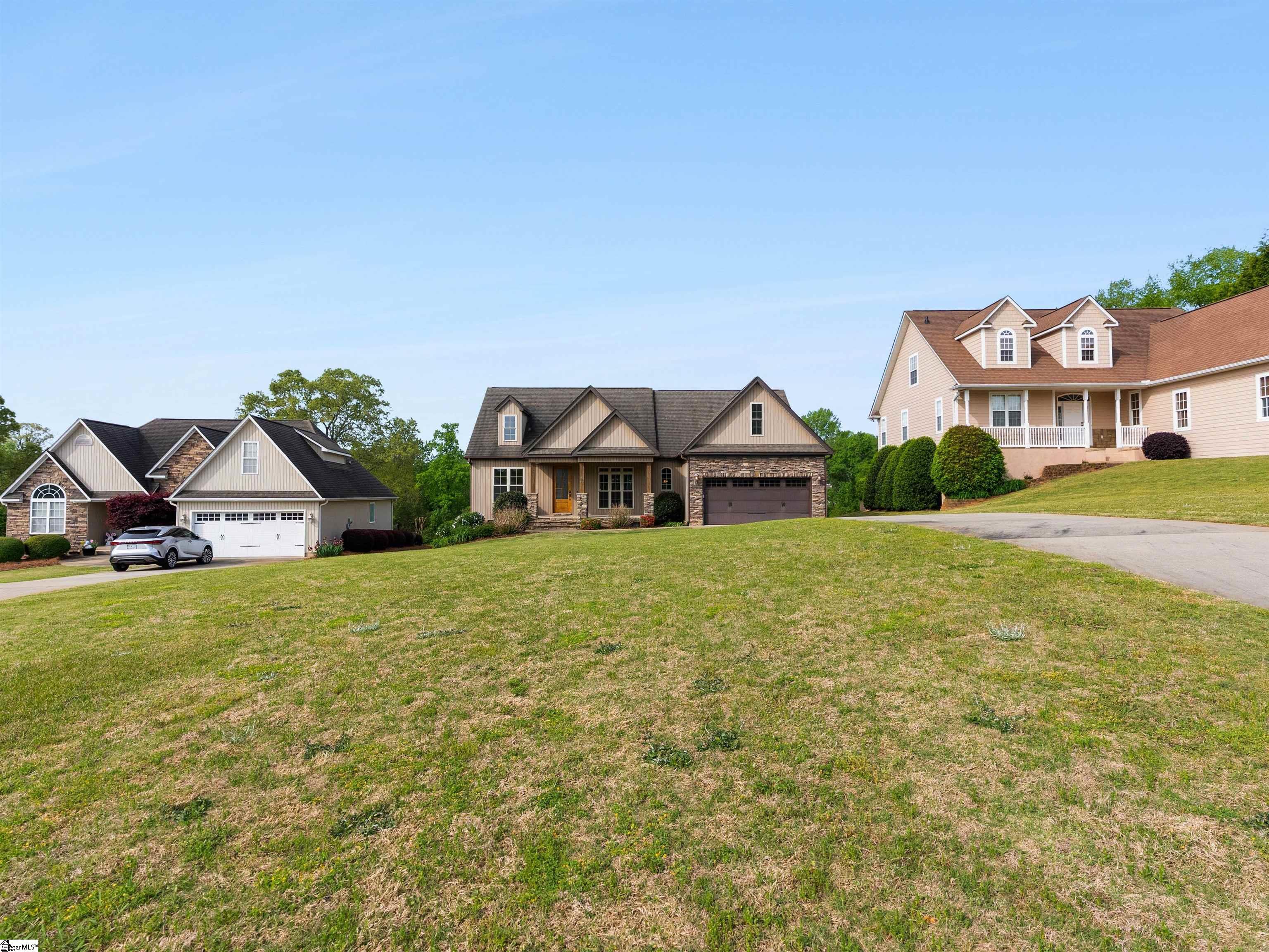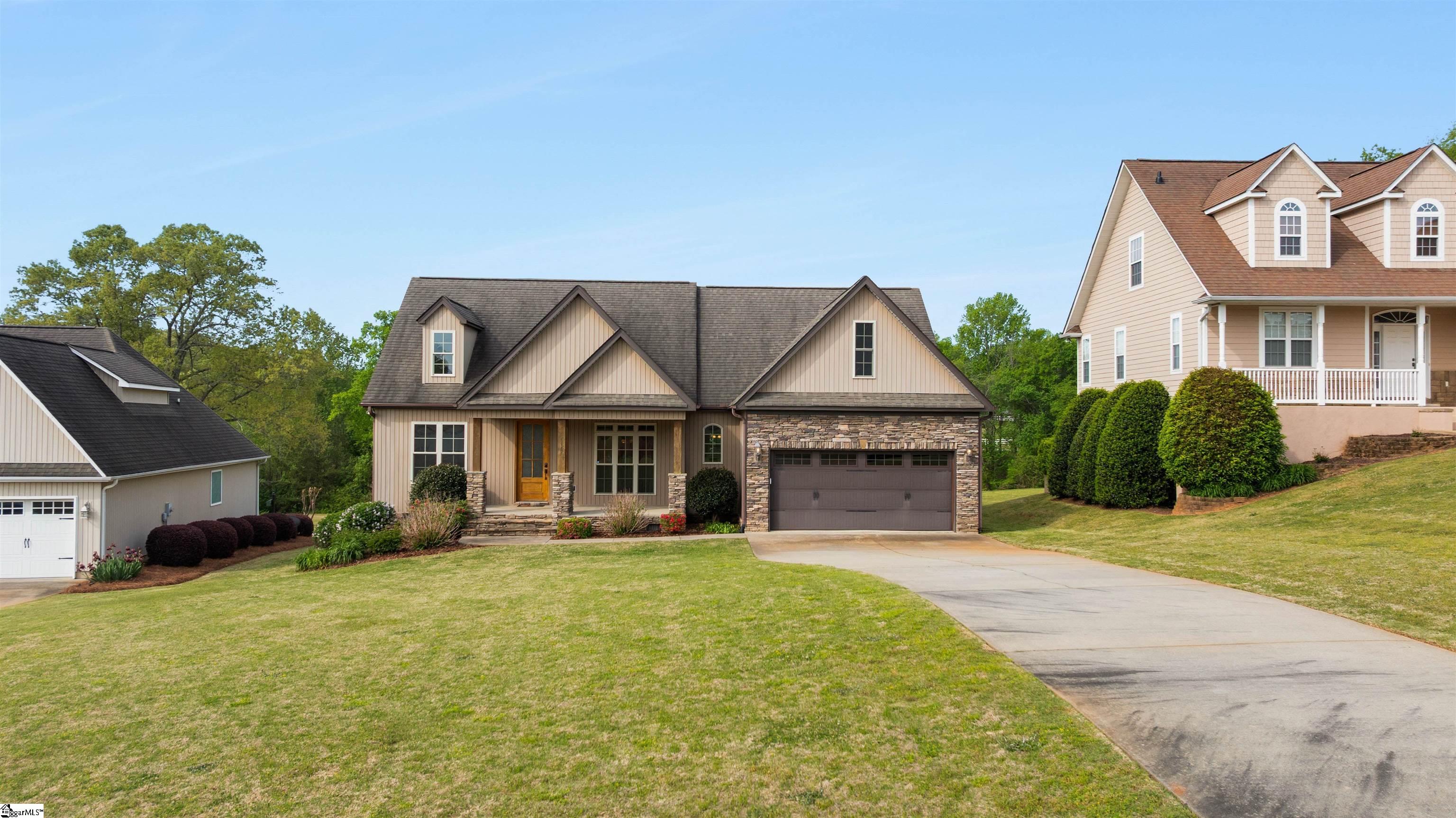 Experience refined living at 114 Royal Troon, beautifully positioned within the sought-after Links O’ Tryon Golf Course community. Surrounded by the natural beauty of the Upstate and framed by views of Hogback Mountain, this custom home offers a blend of elegance, comfort, and thoughtful design. From the moment you arrive, the home makes a lasting impression. An expansive front porch with stacked stone columns sets the tone, complemented by matching stone accents and a long, inviting driveway. Lush landscaping with seasonal blooms enhances the sense of arrival and creates a welcoming first impression. Step inside to a space that immediately feels both elevated and inviting. Rich hardwood floors, detailed crown molding, and a striking stacked stone fireplace anchor the main living area, where vaulted ceilings add volume and light. The formal dining room features a double tray ceiling, creating a perfect setting for gatherings both large and intimate. The kitchen is designed to bring people together, offering upgraded cabinetry, granite countertops throughout, tile backsplash, and a spacious breakfast bar. A bright breakfast room overlooks the course, while a full suite of GE Profile appliances, including the refrigerator, provides both style and function. Just off the living area, a large screened porch with composite decking offers a peaceful place to unwind, along with an adjoining open deck ideal for grilling and entertaining. A small fenced area provides a perfect space for pets, and a golf cart or lawn equipment garage is conveniently located within the tall crawl space. The main level features a well-appointed primary suite with a double tray ceiling, a walk-in closet with custom shelving, and a spa-inspired bath complete with a freestanding tub, double vanity, and an expansive tiled shower. Two additional bedrooms on the main level offer flexibility for guests or family. Upstairs, a generous bonus room, an additional bedroom, and a full bath create even more living space, ideal for a private guest suite or multi-purpose use. Additional features include tinted windows, beadboard panel doors, central vacuum, custom pantry shelving, and rounded drywall corners that add subtle architectural detail throughout. Located within the Landrum school district and just minutes from Campobello, Landrum, and Greer, this home offers both convenience and a peaceful setting in one of the area’s most desirable golf course communities. Originally constructed by respected local builder Randy Camp, this home reflects quality craftsmanship and attention to detail throughout.