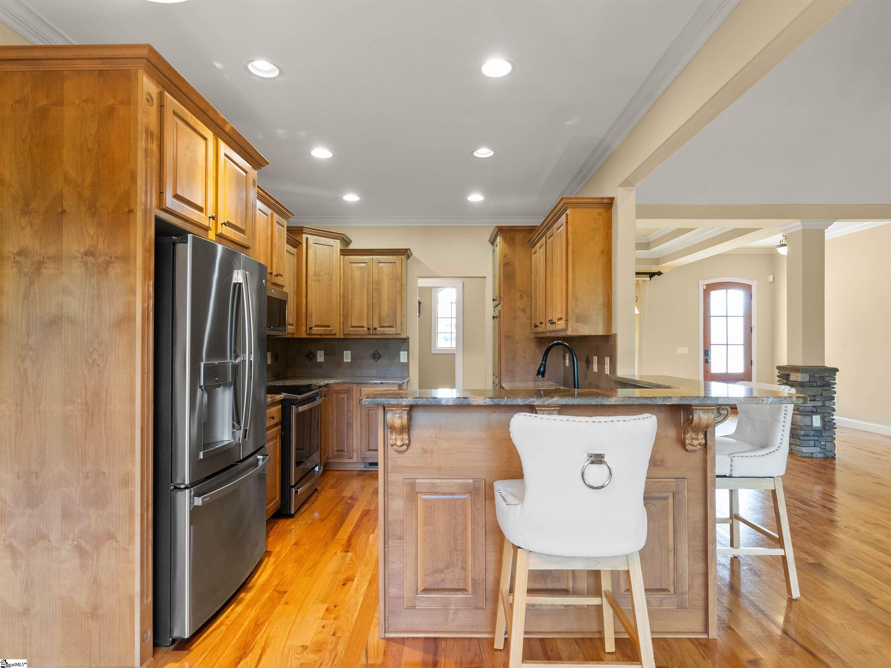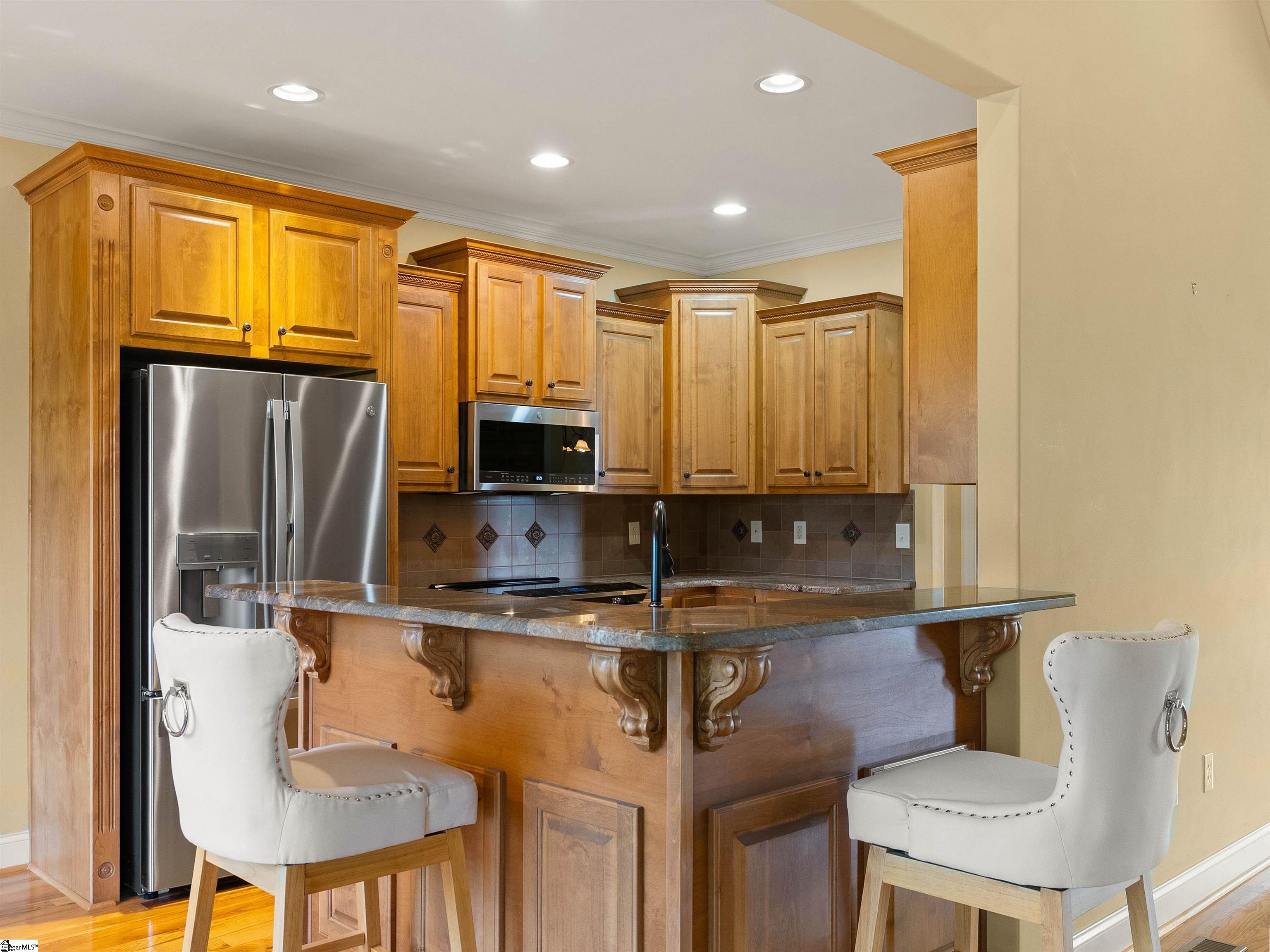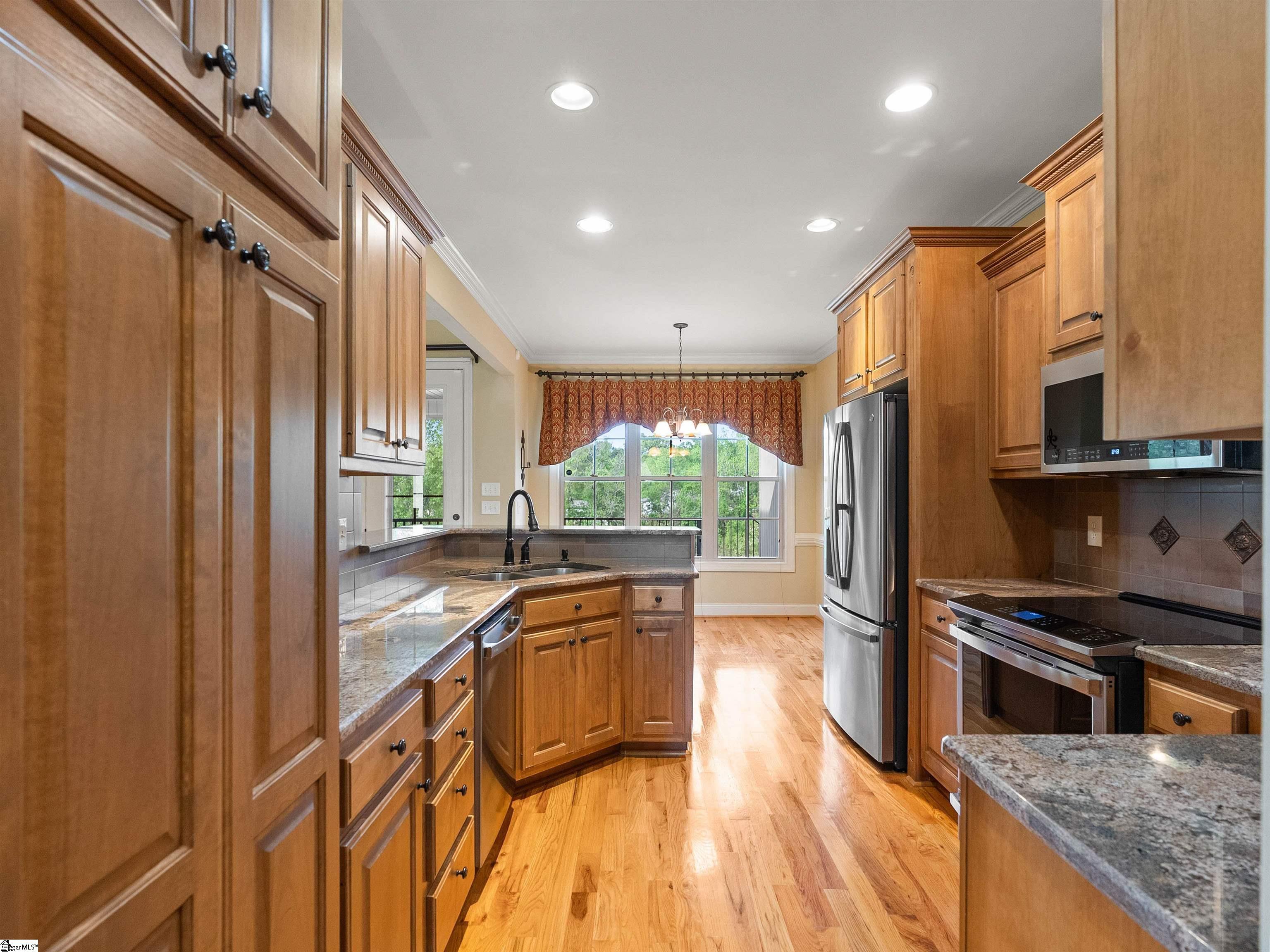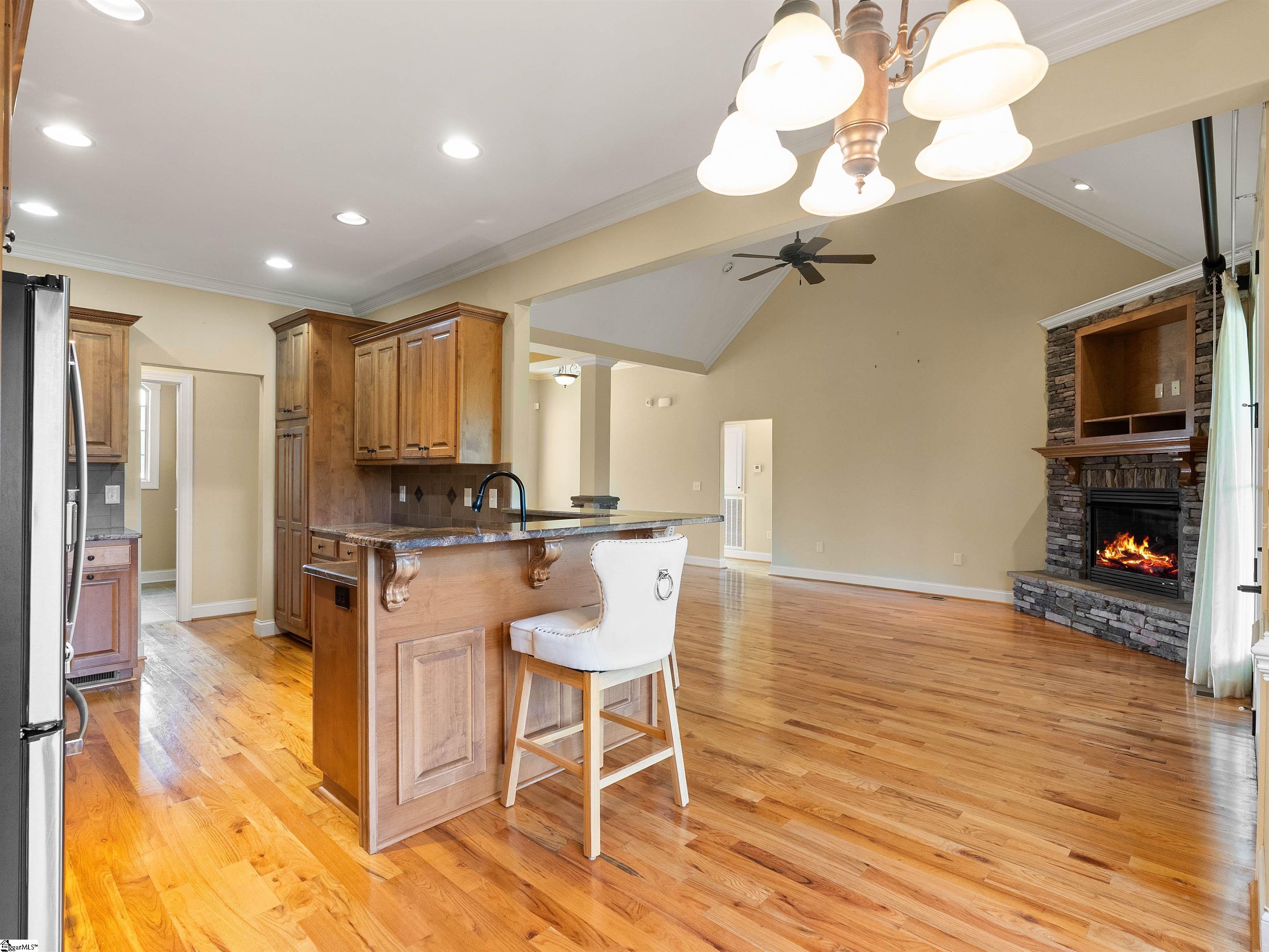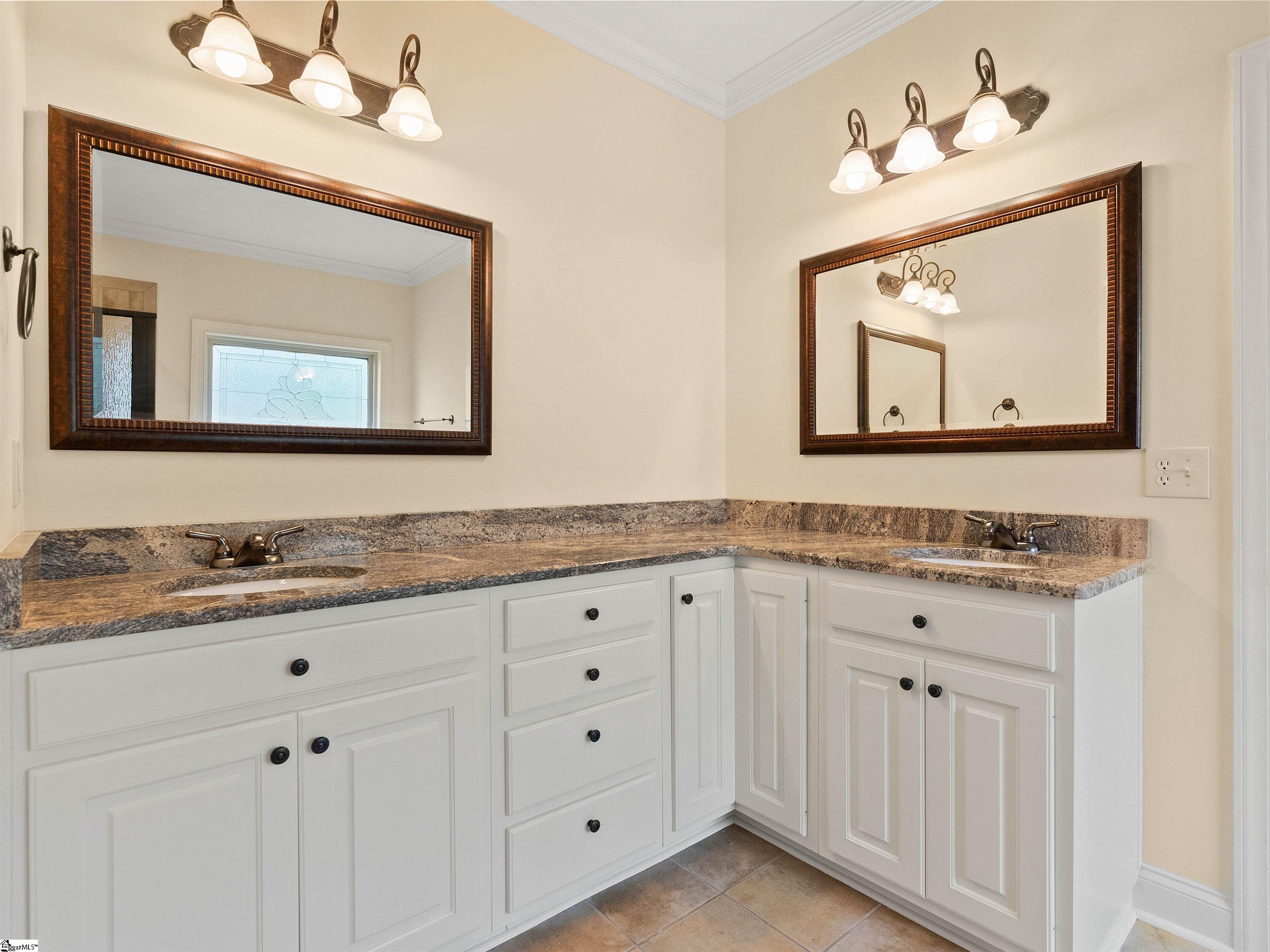 Experience refined living at 114 Royal Troon, beautifully positioned within the sought-after Links O’ Tryon Golf Course community. Surrounded by the natural beauty of the Upstate and framed by views of Hogback Mountain, this custom home offers a blend of elegance, comfort, and thoughtful design. From the moment you arrive, the home makes a lasting impression. An expansive front porch with stacked stone columns sets the tone, complemented by matching stone accents and a long, inviting driveway. Lush landscaping with seasonal blooms enhances the sense of arrival and creates a welcoming first impression. Step inside to a space that immediately feels both elevated and inviting. Rich hardwood floors, detailed crown molding, and a striking stacked stone fireplace anchor the main living area, where vaulted ceilings add volume and light. The formal dining room features a double tray ceiling, creating a perfect setting for gatherings both large and intimate. The kitchen is designed to bring people together, offering upgraded cabinetry, granite countertops throughout, tile backsplash, and a spacious breakfast bar. A bright breakfast room overlooks the course, while a full suite of GE Profile appliances, including the refrigerator, provides both style and function. Just off the living area, a large screened porch with composite decking offers a peaceful place to unwind, along with an adjoining open deck ideal for grilling and entertaining. A small fenced area provides a perfect space for pets, and a golf cart or lawn equipment garage is conveniently located within the tall crawl space. The main level features a well-appointed primary suite with a double tray ceiling, a walk-in closet with custom shelving, and a spa-inspired bath complete with a freestanding tub, double vanity, and an expansive tiled shower. Two additional bedrooms on the main level offer flexibility for guests or family. Upstairs, a generous bonus room, an additional bedroom, and a full bath create even more living space, ideal for a private guest suite or multi-purpose use. Additional features include tinted windows, beadboard panel doors, central vacuum, custom pantry shelving, and rounded drywall corners that add subtle architectural detail throughout. Located within the Landrum school district and just minutes from Campobello, Landrum, and Greer, this home offers both convenience and a peaceful setting in one of the area’s most desirable golf course communities. Originally constructed by respected local builder Randy Camp, this home reflects quality craftsmanship and attention to detail throughout.