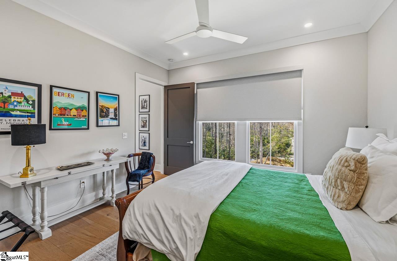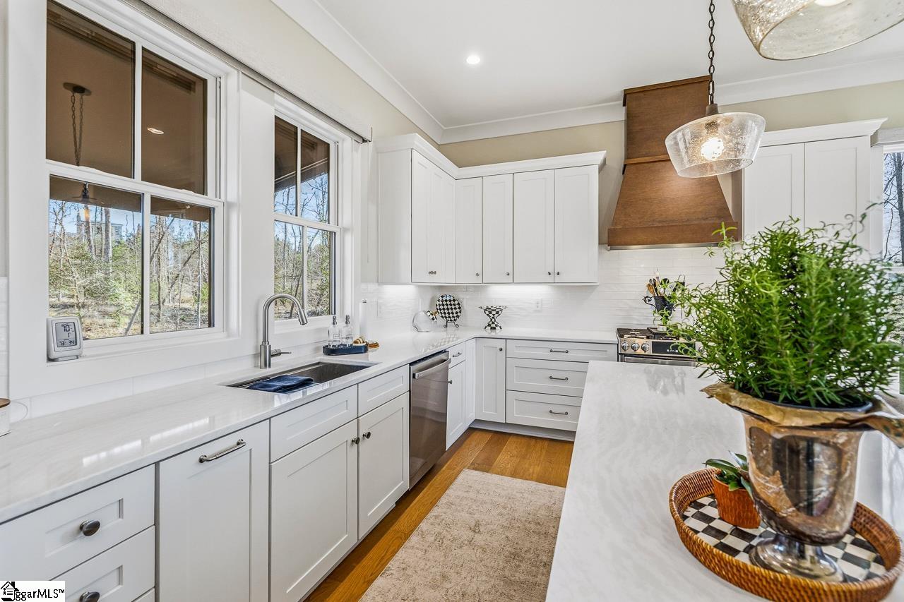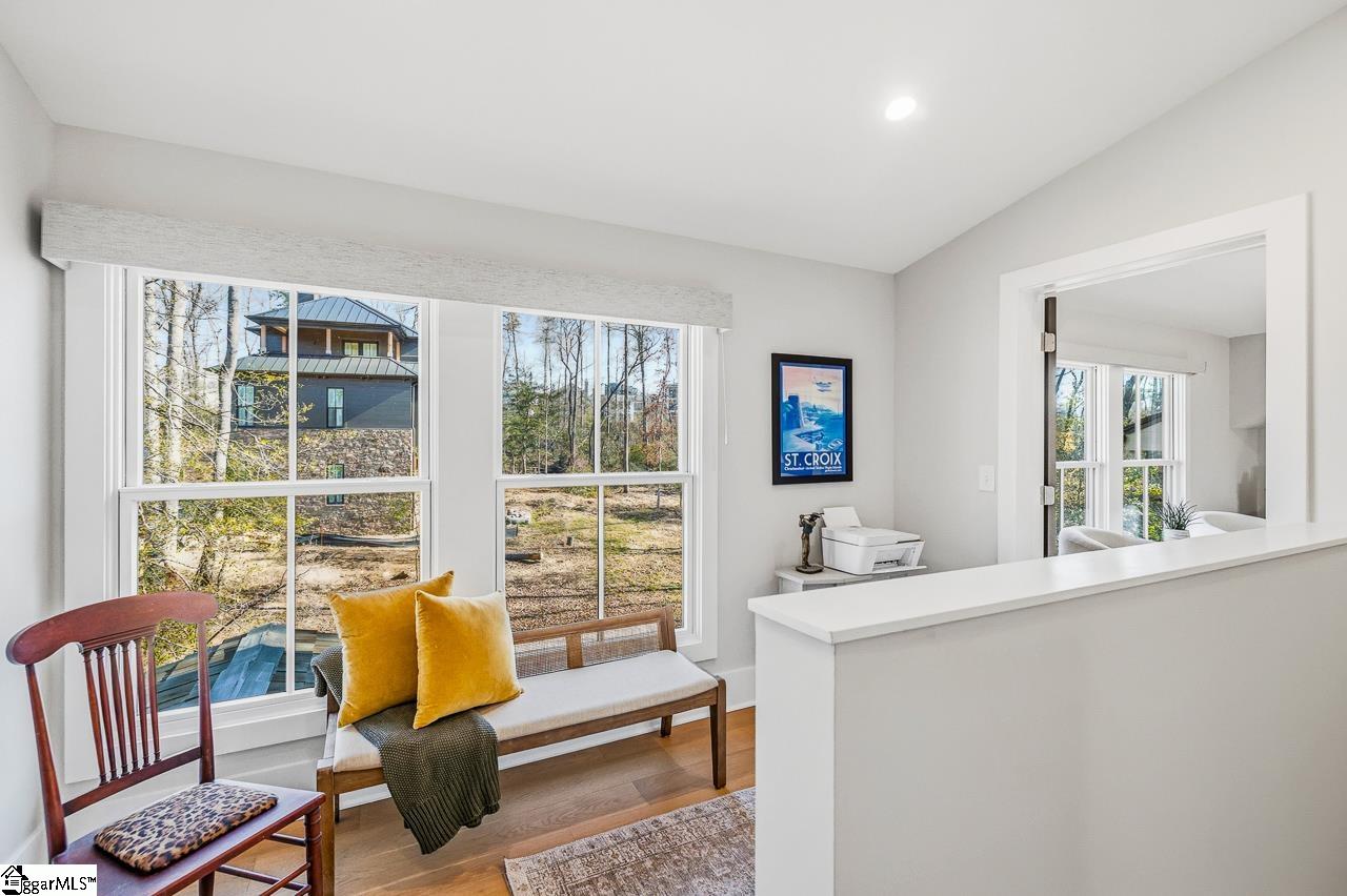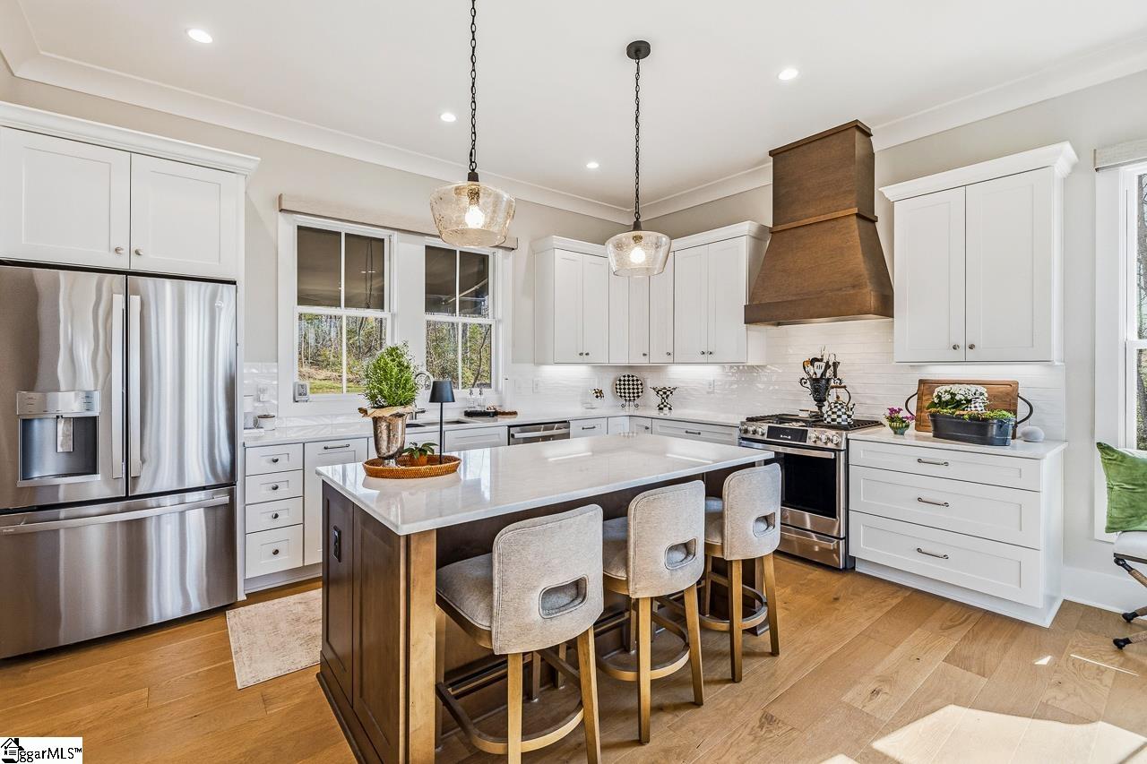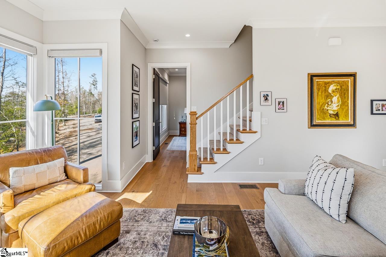 Tucked within the private Woodland Retreat enclave of Hartness, this distinctive 3-story home offers a rare blend of modern design and natural surroundings. Set among nearly seven acres of preserved woodlands filled with mature American holly and beech trees, the setting provides a peaceful escape while still being part of one of the area’s most sought-after communities. The exterior showcases a striking combination of brick and fiber cement siding, complemented by a cedar shake roof that enhances both durability and architectural appeal. Inside, the home is thoughtfully designed across three levels to maximize both comfort and functionality. The ground level features a private bedroom with a full en-suite bath, ideal for guests, along with a convenient one-car carport. The main living level is bright and open, centered around a spacious living area with a direct vent fireplace and slate hearth. The kitchen is designed for both everyday living and entertaining, featuring a large island with built-in microwave, custom cabinetry, a wood hood with Broan insert, and a GE Profile stainless steel appliance package. A dining area, powder room, and additional bedroom with en-suite bath complete this level, along with access to a generous deck overlooking the natural surroundings. The top level is dedicated to the primary suite, offering a true retreat with a large walk-in closet, dual vanities, a garden tub, and a separate shower. A private terrace off the suite provides the perfect place to unwind and take in the serene wooded views. With its unique setting, thoughtful layout, and high-end finishes, this home offers a one-of-a-kind opportunity to enjoy modern living immersed in nature.