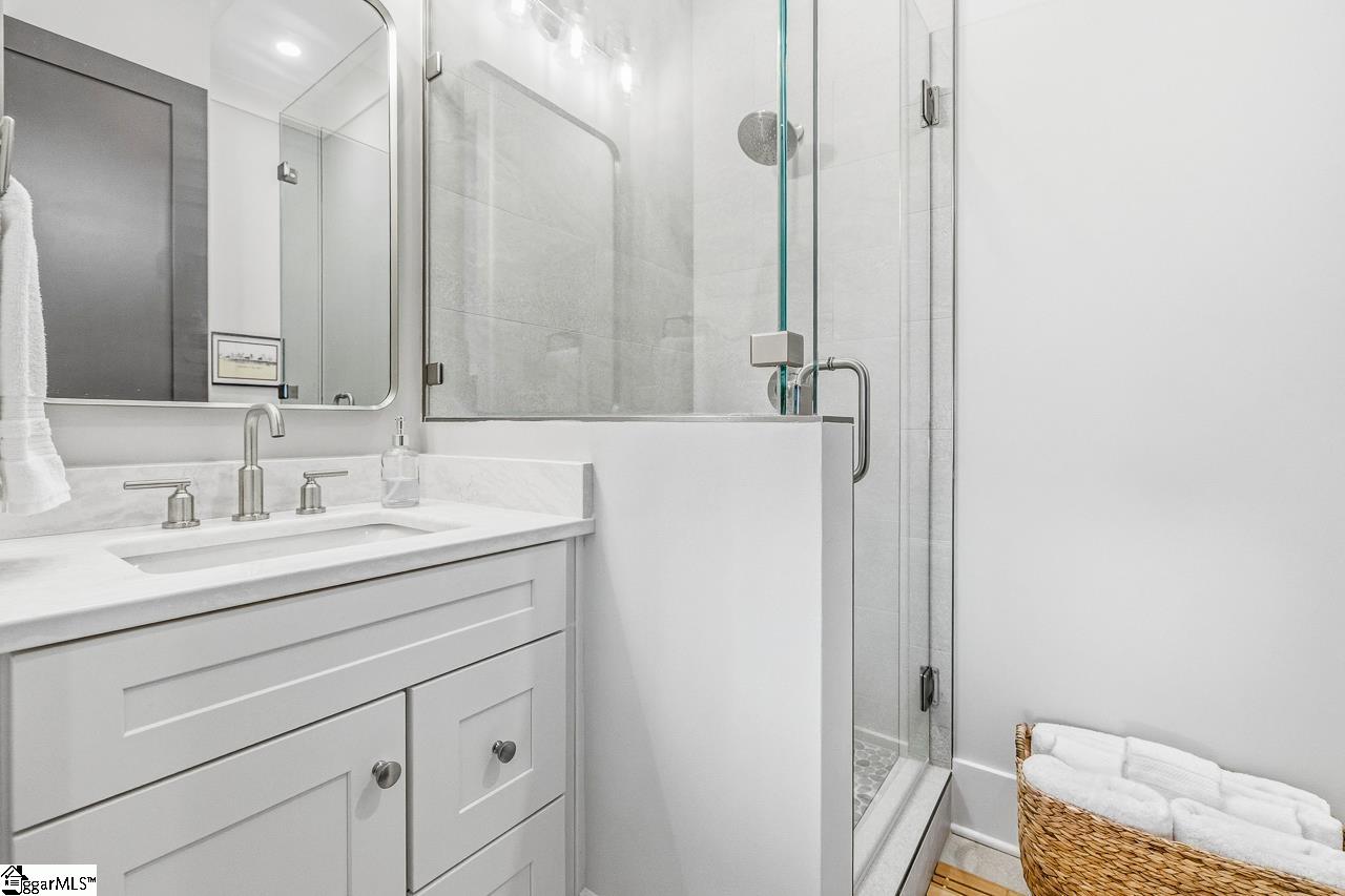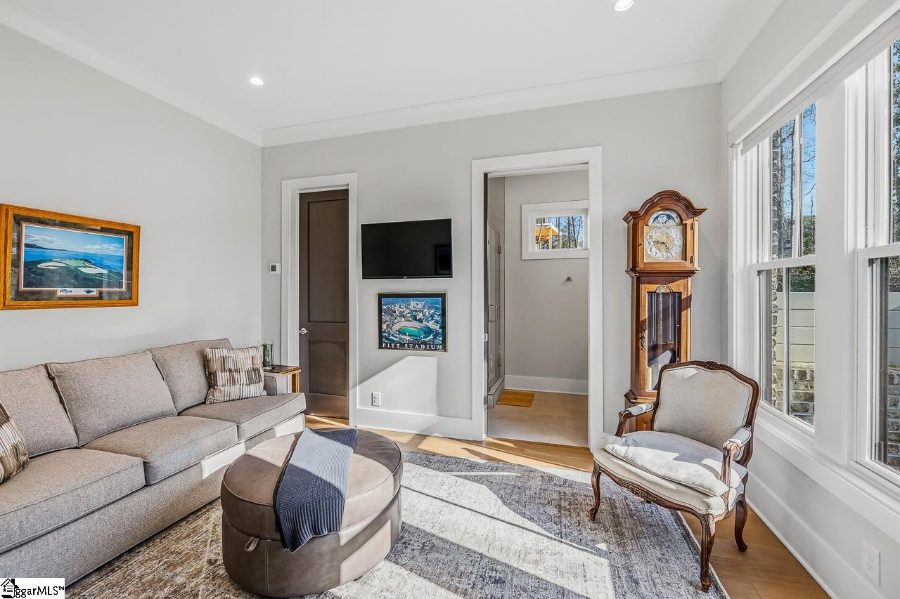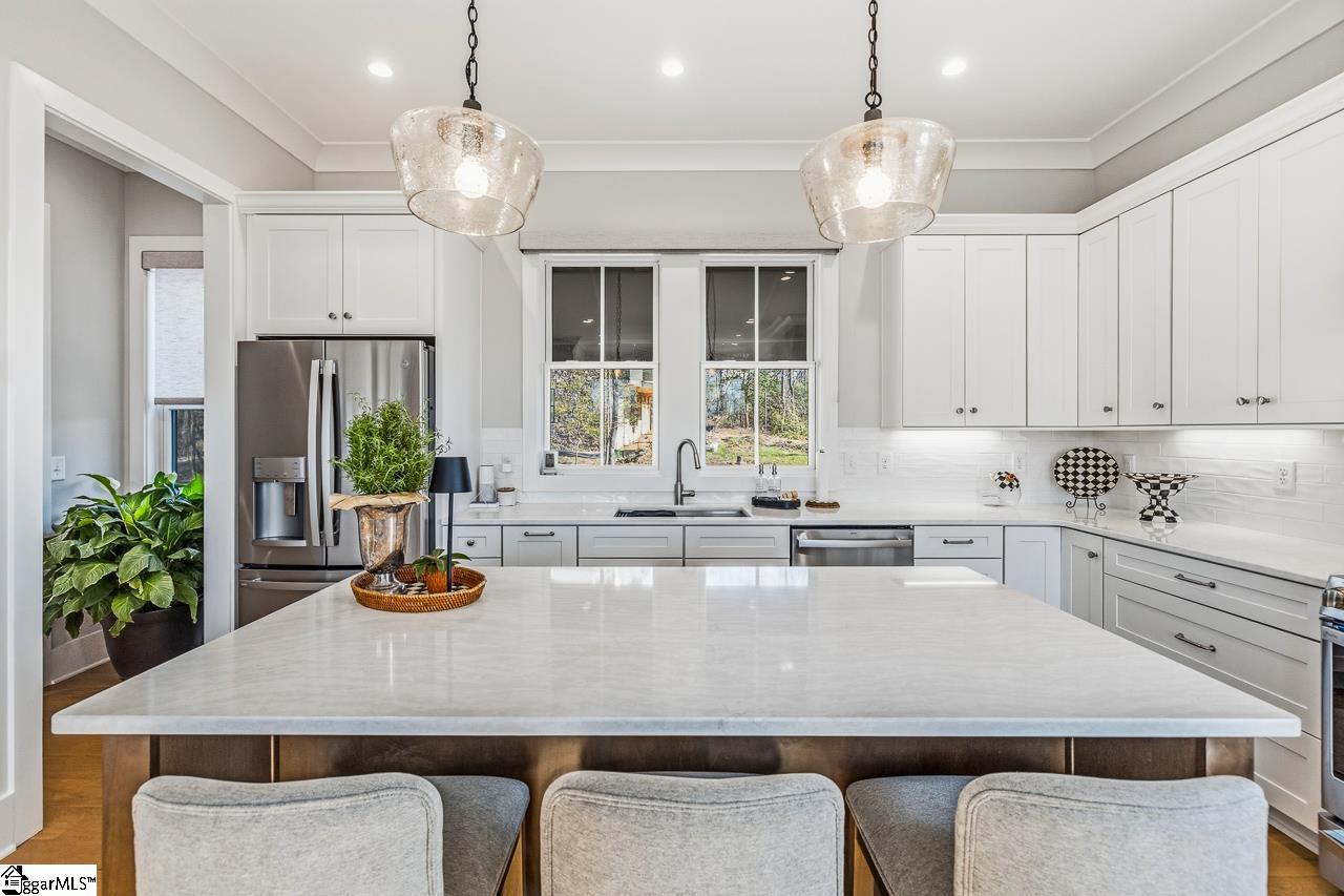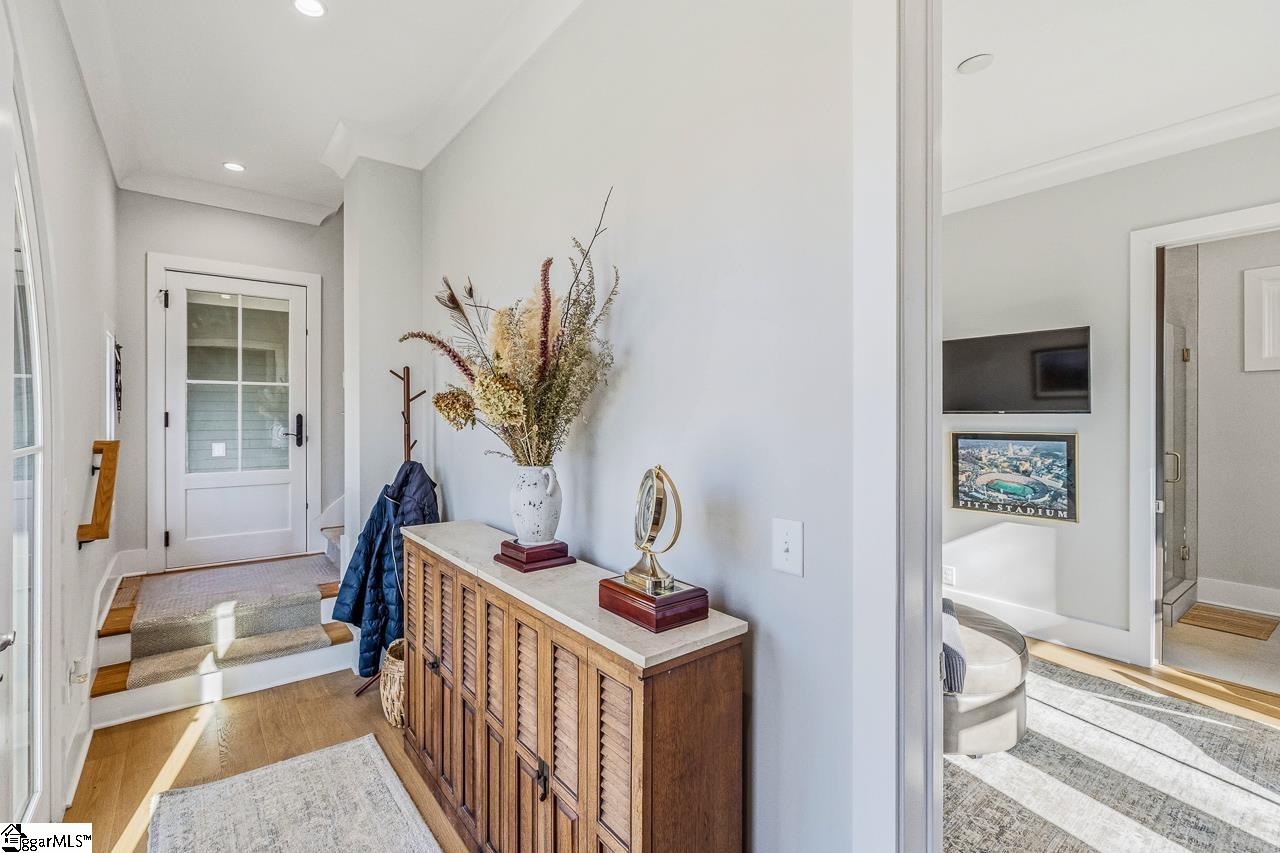 Tucked within the private Woodland Retreat enclave of Hartness, this distinctive 3-story home offers a rare blend of modern design and natural surroundings. Set among nearly seven acres of preserved woodlands filled with mature American holly and beech trees, the setting provides a peaceful escape while still being part of one of the area’s most sought-after communities. The exterior showcases a striking combination of brick and fiber cement siding, complemented by a cedar shake roof that enhances both durability and architectural appeal. Inside, the home is thoughtfully designed across three levels to maximize both comfort and functionality. The ground level features a private bedroom with a full en-suite bath, ideal for guests, along with a convenient one-car carport. The main living level is bright and open, centered around a spacious living area with a direct vent fireplace and slate hearth. The kitchen is designed for both everyday living and entertaining, featuring a large island with built-in microwave, custom cabinetry, a wood hood with Broan insert, and a GE Profile stainless steel appliance package. A dining area, powder room, and additional bedroom with en-suite bath complete this level, along with access to a generous deck overlooking the natural surroundings. The top level is dedicated to the primary suite, offering a true retreat with a large walk-in closet, dual vanities, a garden tub, and a separate shower. A private terrace off the suite provides the perfect place to unwind and take in the serene wooded views. With its unique setting, thoughtful layout, and high-end finishes, this home offers a one-of-a-kind opportunity to enjoy modern living immersed in nature.