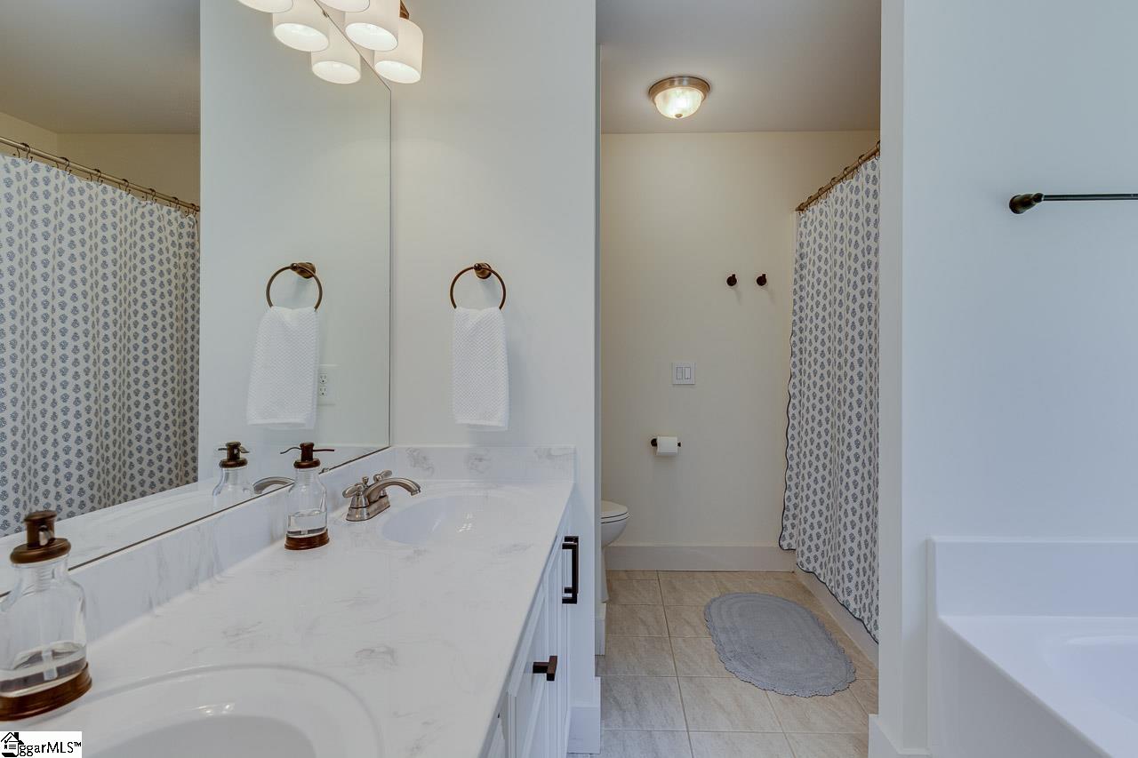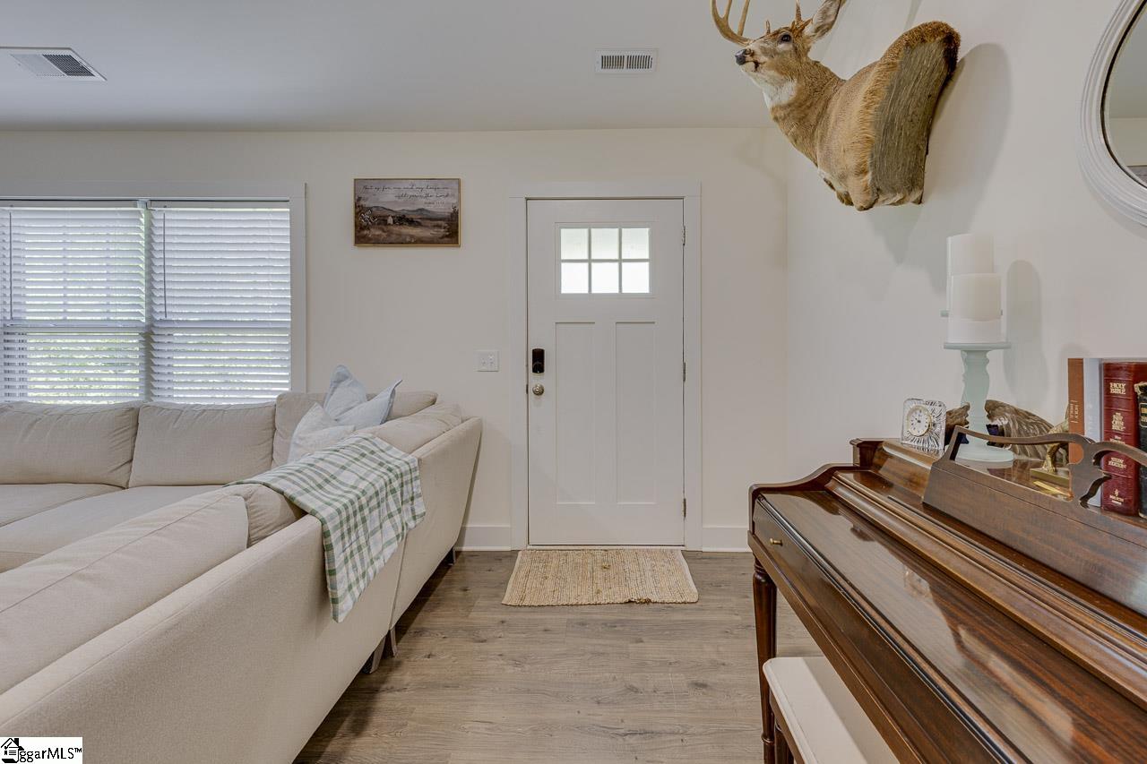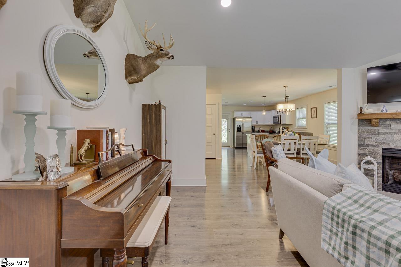 Welcome to this beautifully maintained Craftsman-style farmhouse in the desirable Liberty Ridge community! Situated on a level corner lot that is slightly under one-third acre, this home offers added privacy with mature trees along the rear and side. The open-concept layout features durable LVP flooring throughout the main living areas and a seamless flow between the kitchen, dining, and living spaces. The kitchen is a standout with granite countertops, white cabinetry, stainless steel appliances, and a bar-top that opens perfectly into the dining area—ideal for entertaining or everyday living. The spacious living room boasts a cathedral ceiling and a stacked stone fireplace with gas logs, creating a warm and inviting focal point. The split-bedroom floor plan provides privacy, with the primary suite tucked just off the kitchen. This oversized retreat features a tray ceiling, a walk-in closet, and a well-appointed en-suite bath complete with a garden tub, a separate shower, and a granite dual-sink vanity. On the opposite side of the home, you’ll find two additional bedrooms, a full bath, and a convenient hallway leading to the laundry room and attached two-car garage. Step outside to enjoy the covered back patio and backyard firepit—perfect for relaxing or entertaining—while taking advantage of the added space and privacy that comes with a corner lot.