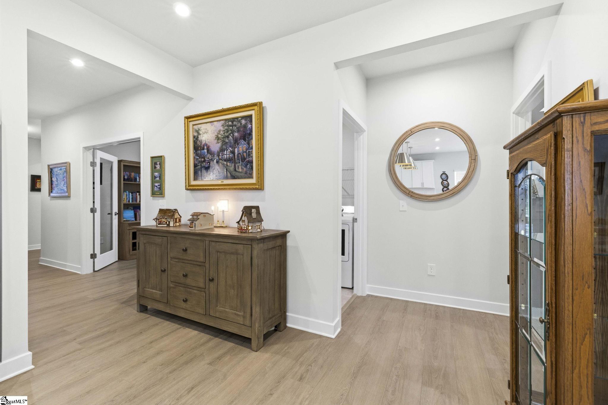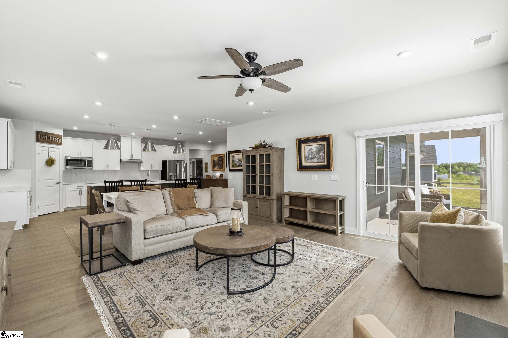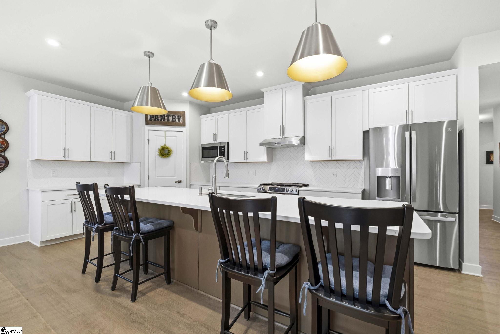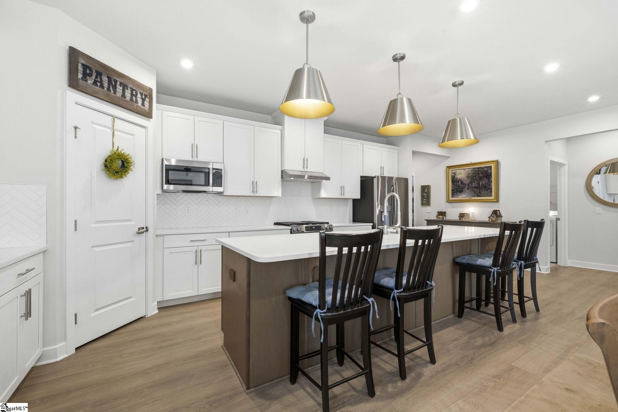 Why wait for new construction when this stunning, nearly new home is ready and waiting for you? Located in the sought-after Canterbrook Homes community, this immaulate residence truly looks like it was lifted from the pages of a magazine. The lush green lawn and established landscaping creates a warm welcome, while inside, you’ll find a beautifully curated interior featuring durable LVP flooring, plush carpeting, serene designer colors, and thoughtful attention to detail throughout. A spacious office behind French doors offers flexibility for a private office, playroom, or guest retreat. The open concept main level is designed for both effortless entertaining and everyday living, anchored by a showstopping kitchen with a massive center island, quartz countertops, custom herringbone backsplash, full stainless appliance package including a gas range, walk-in pantry, and soft-close two-tone cabinetry. The adjoining dining area easily accommodates gatherings of eight or more, while the sunny living room overlooks the backyard for a light-filled, inviting feel. Function meets style with a main-level walk-in laundry room and a thoughtfully designed drop zone featuring built-in seating and storage—perfect for keeping daily life organized. The main floor primary suite offers a true retreat with a trey ceiling, spacious walk-in closet, and spa-like bath complete with dual sinks, quartz countertops, and a large tile shower with built-in seating. A rare main-level guest bedroom with access to a full bath adds even more versatility. Upstairs, a generous loft and additional bedroom with a third full bath create the ideal setup for a private guest suite, in-law space, teen retreat, or fitness area—endless possibilities to suit your lifestyle. Outdoor living shines with a screened porch and grilling patio, perfect for summer evenings, weekend barbecues, and year-round enjoyment. And, as an added bonus, a transferable builder’s warranty provides peace of mind. Residents of Canterbrook enjoy a strong amenity package including lawn maintenance, sidewalks, streetlights, playground, resort-style pool with splash pad, walking trails, pond, and pickleball courts. Ideally located just minutes from the Swamp Rabbit Trail trailhead, major roadways, BridgeWay Station, and the charm of downtown Fountain Inn—this home offers the perfect blend of luxury, convenience, and lifestyle.