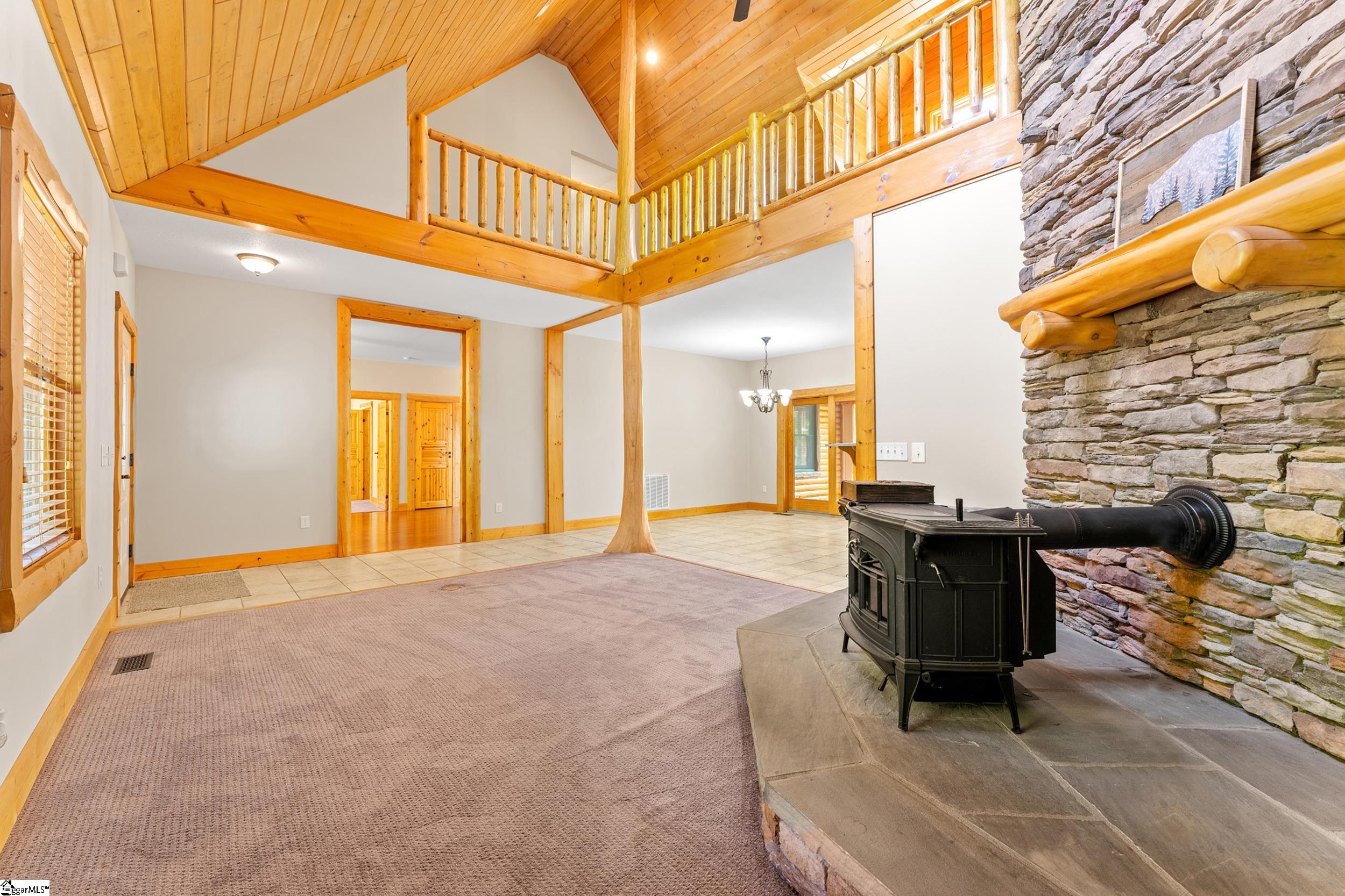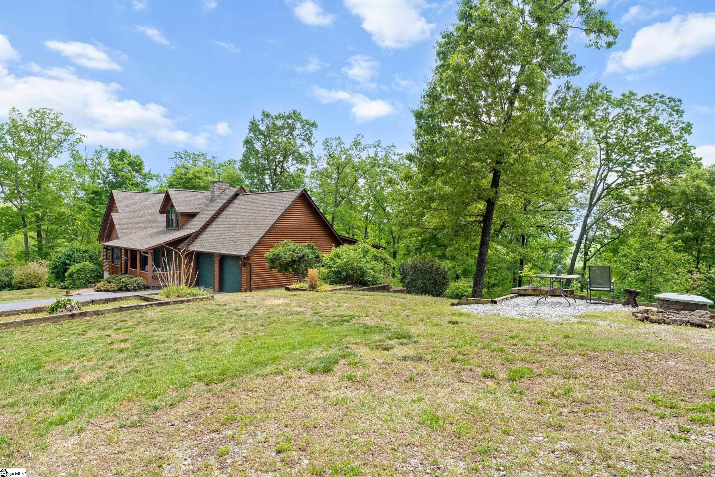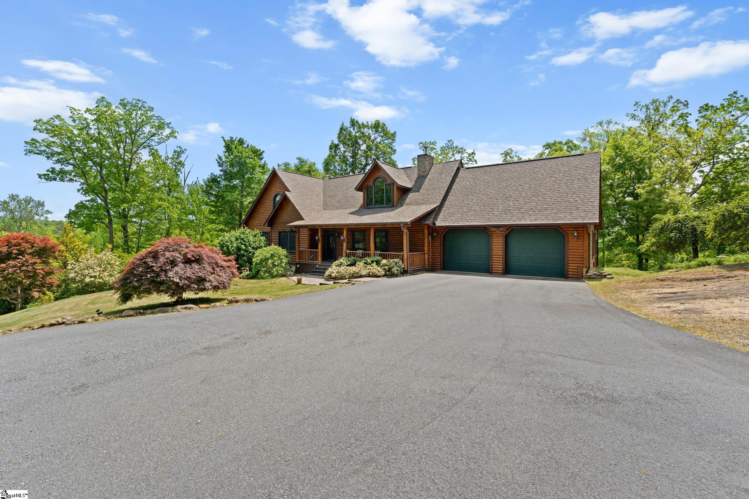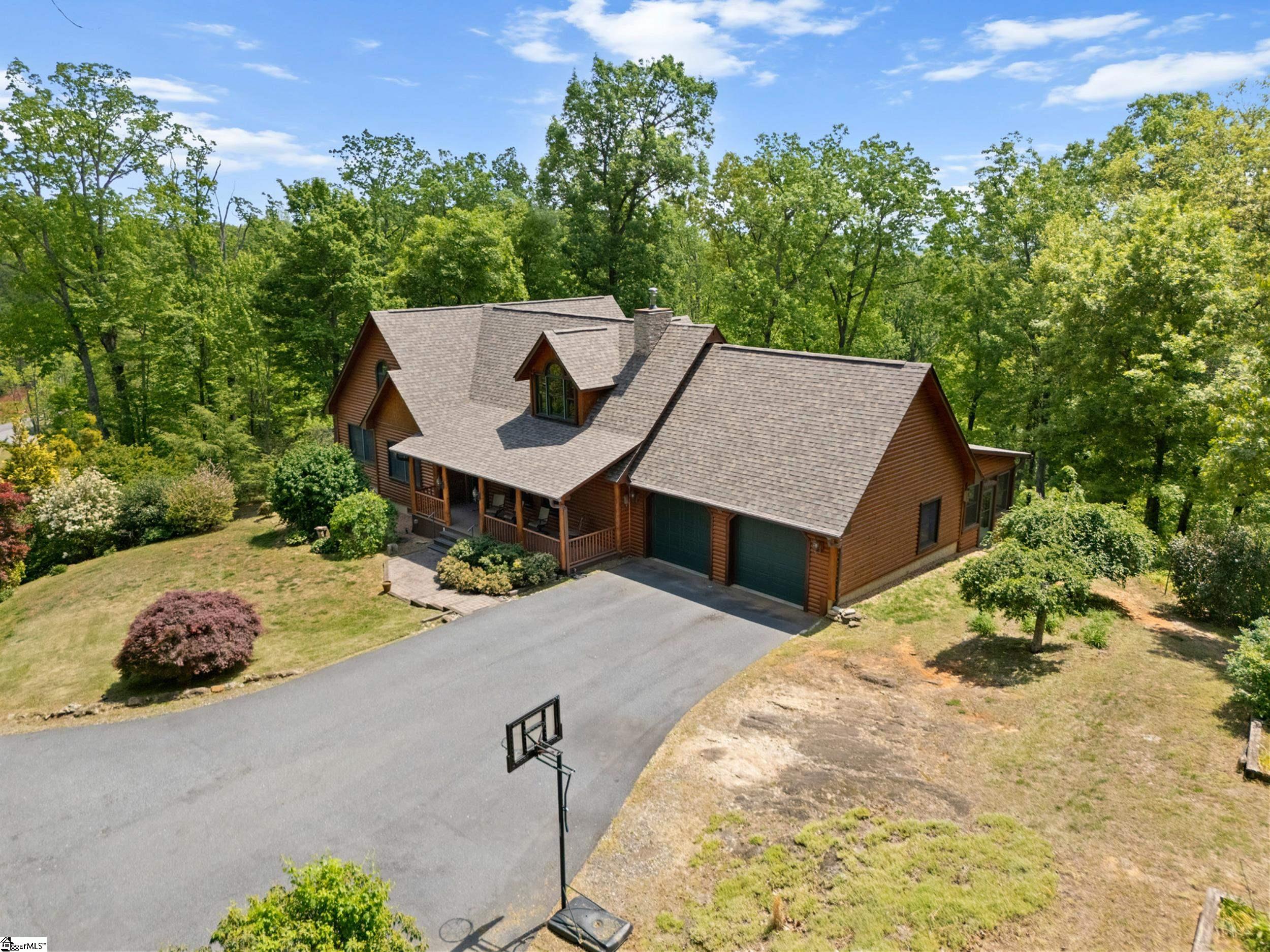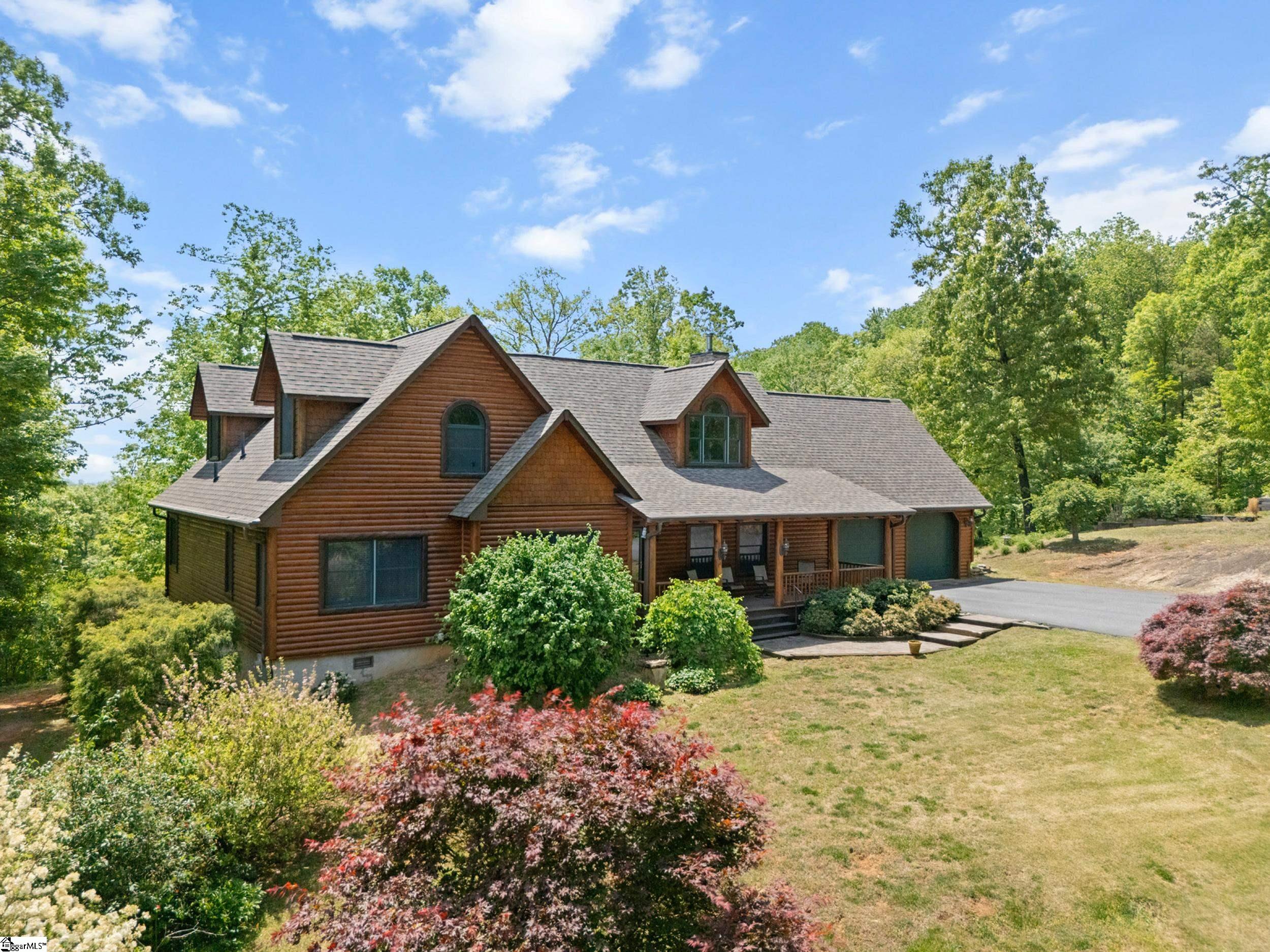 Escape to your own private sanctuary—where serenity, seclusion, and natural beauty converge on 8.5 breathtaking acres. Tucked away along a private drive and nestled mountainside among mature trees and abundant wildlife, this exceptional log cabin-style retreat offers the feeling of a peaceful escape while delivering the comfort of modern living. A welcoming rocking chair front porch sets the tone, inviting you to slow down and take in the surroundings. Inside, the open concept floor plan is flooded with natural light, highlighted by a dramatic two-story great room featuring a stunning stacked stone chimney and woodstove—creating a warm, inviting centerpiece. The space flows seamlessly into the dining area and well-appointed kitchen, complete with granite countertops, a full appliance package, and a center island perfect for casual meals. Just off the kitchen, you’ll find a convenient half bath for guests and direct access to the attached two-car garage. One of the home’s most captivating features is the series of four-season porches that truly make you feel as though you’re living in a treehouse—offering panoramic views of the mountains, native trees, and ever-changing landscape. A versatile flex room off the main living area provides endless possibilities as a secondary living space, home office, or formal dining room. The main level also includes a guest bedroom and full bath, along with a walk-in laundry room for everyday ease. The primary suite serves as a tranquil retreat, featuring a double trey ceiling, spacious walk-in closet, and a spa-inspired bath with dual sinks, a jetted tub, and a separate shower. Upstairs, a loft opens to sweeping views from every window and offers the perfect reading nook tucked beneath the natural light. A large storage area off the loft doubles as a dream space for a playroom or imaginative hideaway. Two additional bedrooms—one with a walk-in closet—share a full bath, providing ample room for family or guests. Throughout the home, thoughtful details shine, including recessed lighting, wide moldings, and beautifully carved columns that elevate the rustic elegance. Outdoors, the possibilities are endless—from gathering around the built-in firepit under the stars to enjoying the detached building with electricity, ideal for a workshop, hobby space, or additional storage with covered areas on either side. Recent updates—including the roof, HVAC, well pump, and tanks—offer peace of mind, while the paved drive and ample parking ensure convenience for you and your guests. While you’ll feel blissfully secluded, this private retreat is ideally located just minutes from the Saluda River, Poinsett Bridge, Eagle Mountain Winery, Chestnut Ridge Hunting Preserve, and a variety of the Upstate’s most beloved hiking and biking trails. Greenville is just 35 minutes away, downtown Travelers Rest 15 minutes, and both Spartanburg and Asheville are within an hour’s drive. A rare offering where lifestyle, layout, and location come together—this is more than a home; it’s an experience.