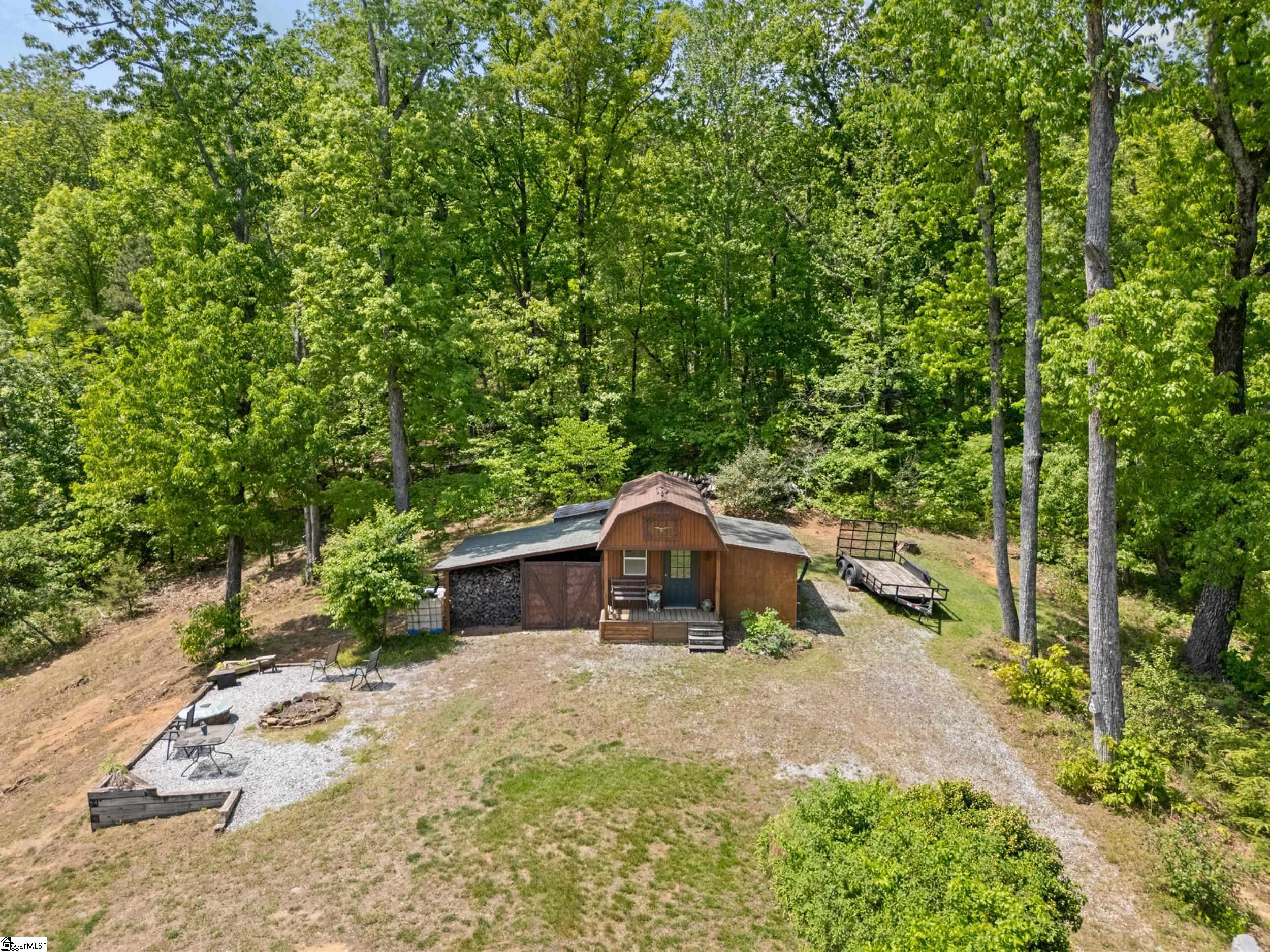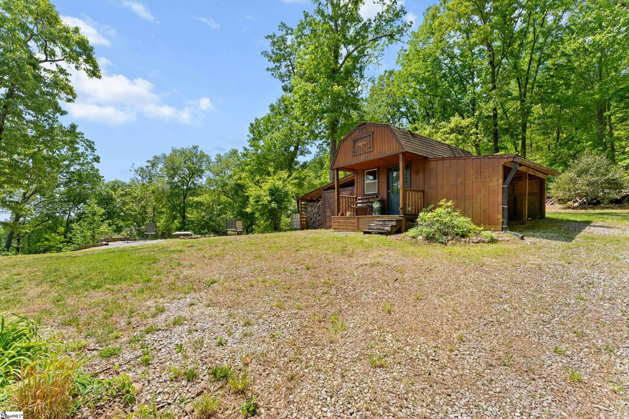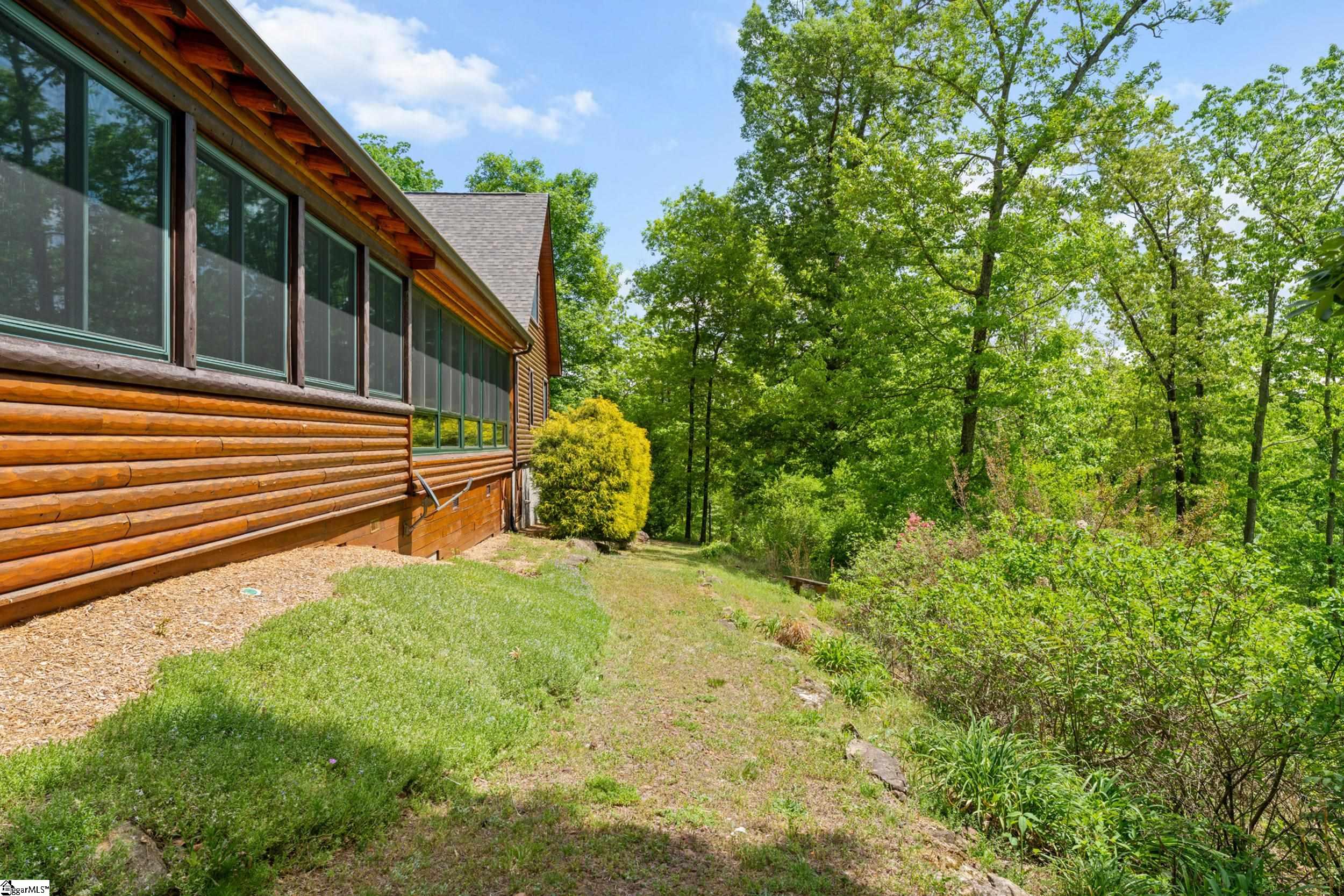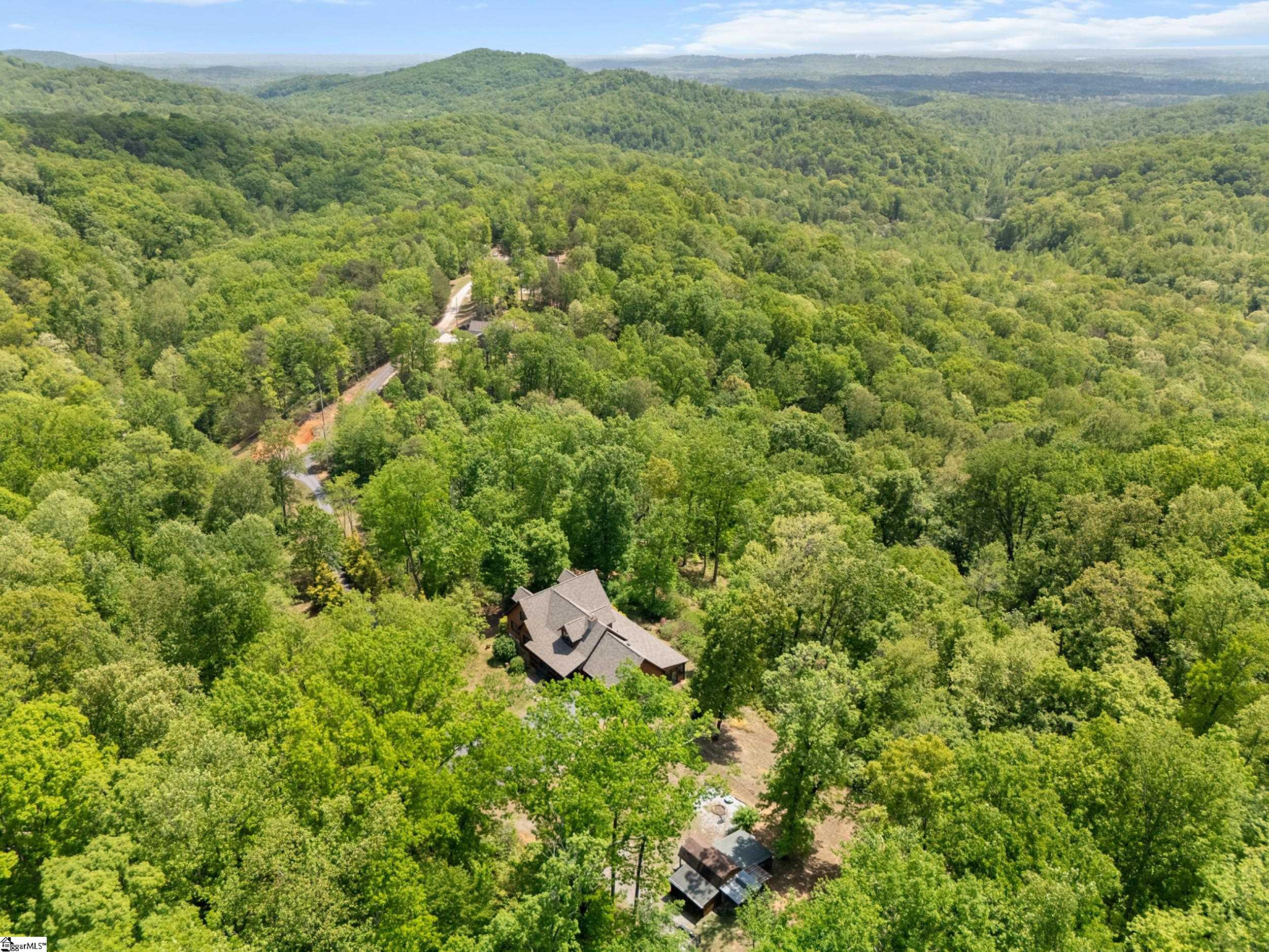 Escape to your own private sanctuary—where serenity, seclusion, and natural beauty converge on 8.5 breathtaking acres. Tucked away along a private drive and nestled mountainside among mature trees and abundant wildlife, this exceptional log cabin-style retreat offers the feeling of a peaceful escape while delivering the comfort of modern living. A welcoming rocking chair front porch sets the tone, inviting you to slow down and take in the surroundings. Inside, the open concept floor plan is flooded with natural light, highlighted by a dramatic two-story great room featuring a stunning stacked stone chimney and woodstove—creating a warm, inviting centerpiece. The space flows seamlessly into the dining area and well-appointed kitchen, complete with granite countertops, a full appliance package, and a center island perfect for casual meals. Just off the kitchen, you’ll find a convenient half bath for guests and direct access to the attached two-car garage. One of the home’s most captivating features is the series of four-season porches that truly make you feel as though you’re living in a treehouse—offering panoramic views of the mountains, native trees, and ever-changing landscape. A versatile flex room off the main living area provides endless possibilities as a secondary living space, home office, or formal dining room. The main level also includes a guest bedroom and full bath, along with a walk-in laundry room for everyday ease. The primary suite serves as a tranquil retreat, featuring a double trey ceiling, spacious walk-in closet, and a spa-inspired bath with dual sinks, a jetted tub, and a separate shower. Upstairs, a loft opens to sweeping views from every window and offers the perfect reading nook tucked beneath the natural light. A large storage area off the loft doubles as a dream space for a playroom or imaginative hideaway. Two additional bedrooms—one with a walk-in closet—share a full bath, providing ample room for family or guests. Throughout the home, thoughtful details shine, including recessed lighting, wide moldings, and beautifully carved columns that elevate the rustic elegance. Outdoors, the possibilities are endless—from gathering around the built-in firepit under the stars to enjoying the detached building with electricity, ideal for a workshop, hobby space, or additional storage with covered areas on either side. Recent updates—including the roof, HVAC, well pump, and tanks—offer peace of mind, while the paved drive and ample parking ensure convenience for you and your guests. While you’ll feel blissfully secluded, this private retreat is ideally located just minutes from the Saluda River, Poinsett Bridge, Eagle Mountain Winery, Chestnut Ridge Hunting Preserve, and a variety of the Upstate’s most beloved hiking and biking trails. Greenville is just 35 minutes away, downtown Travelers Rest 15 minutes, and both Spartanburg and Asheville are within an hour’s drive. A rare offering where lifestyle, layout, and location come together—this is more than a home; it’s an experience.