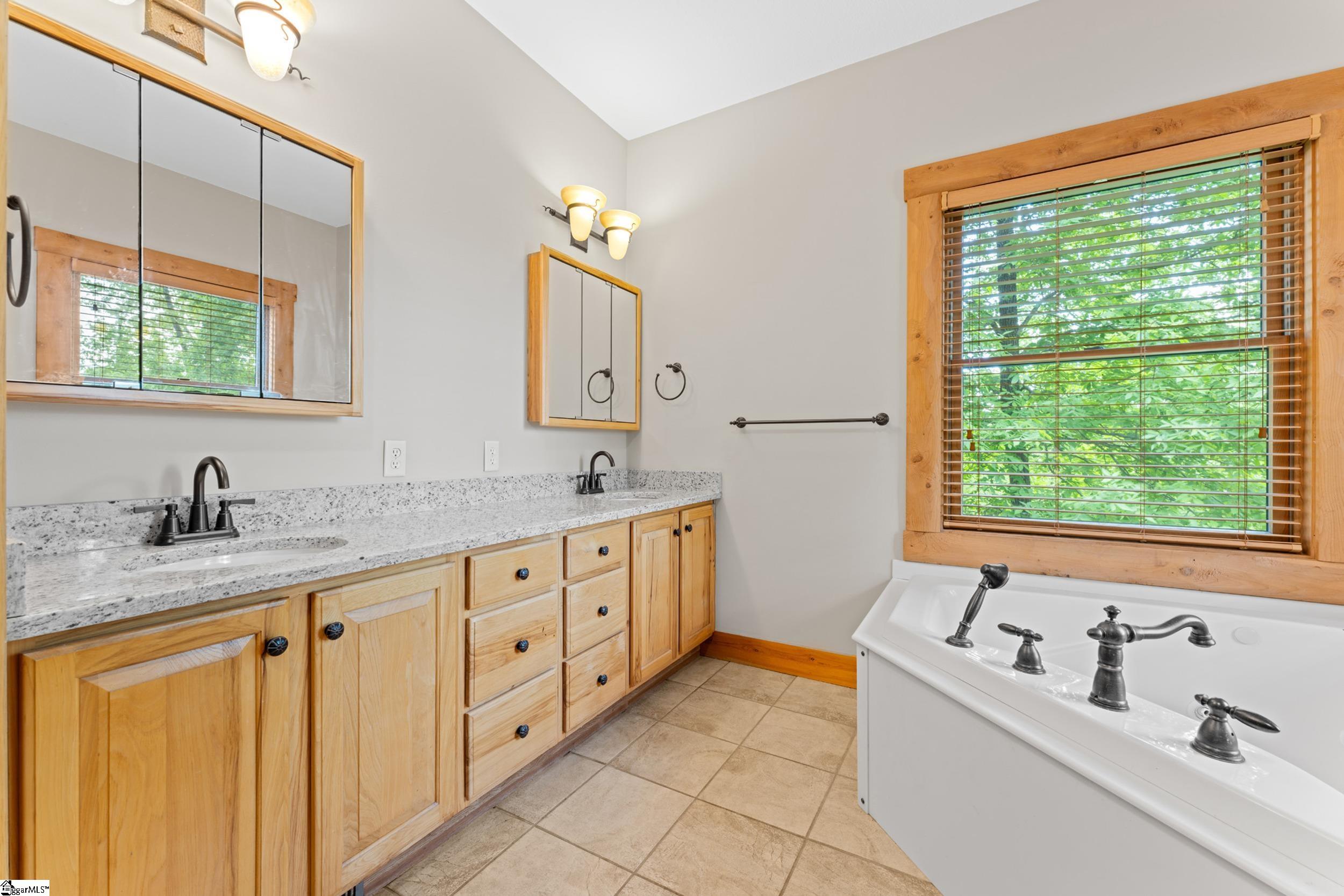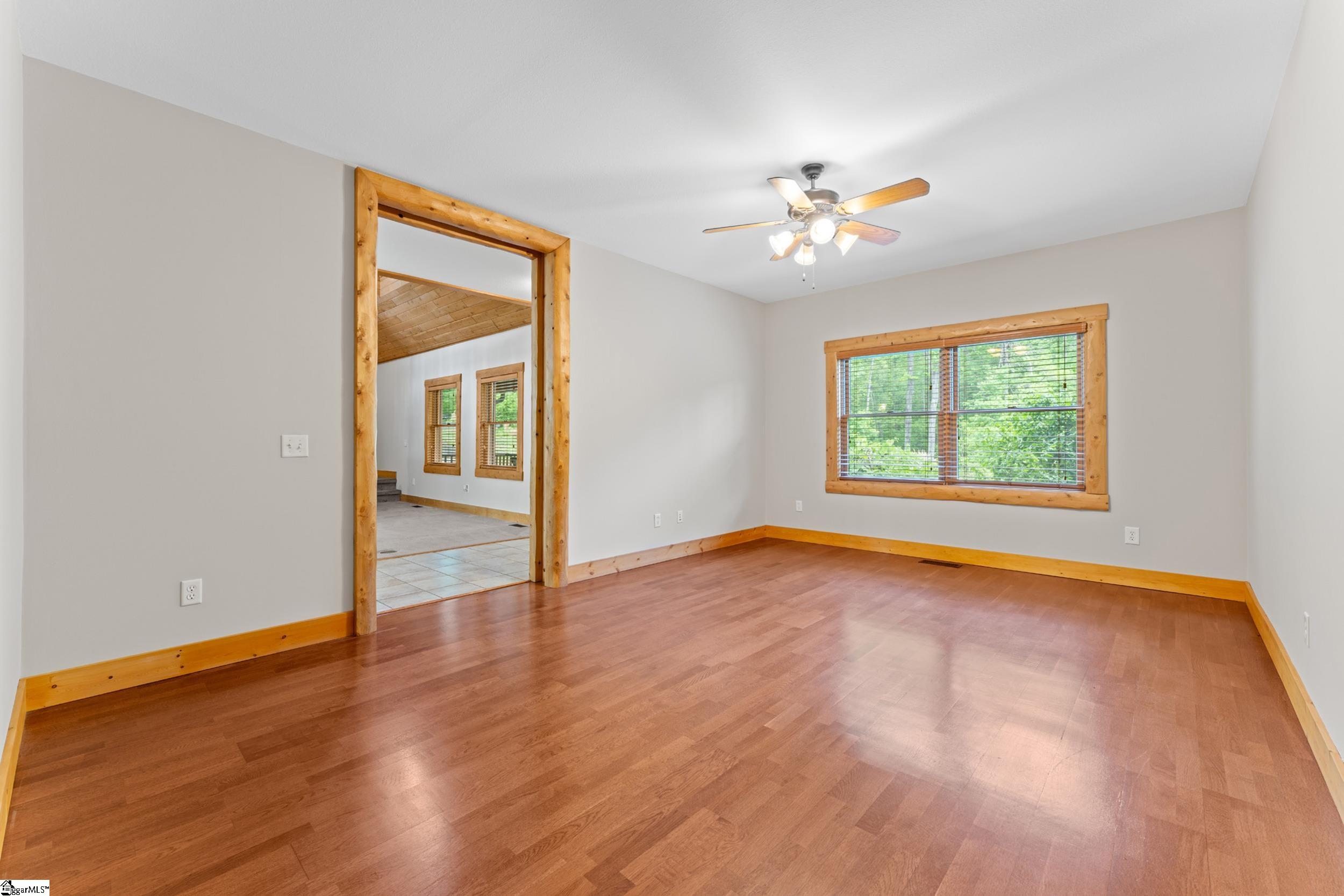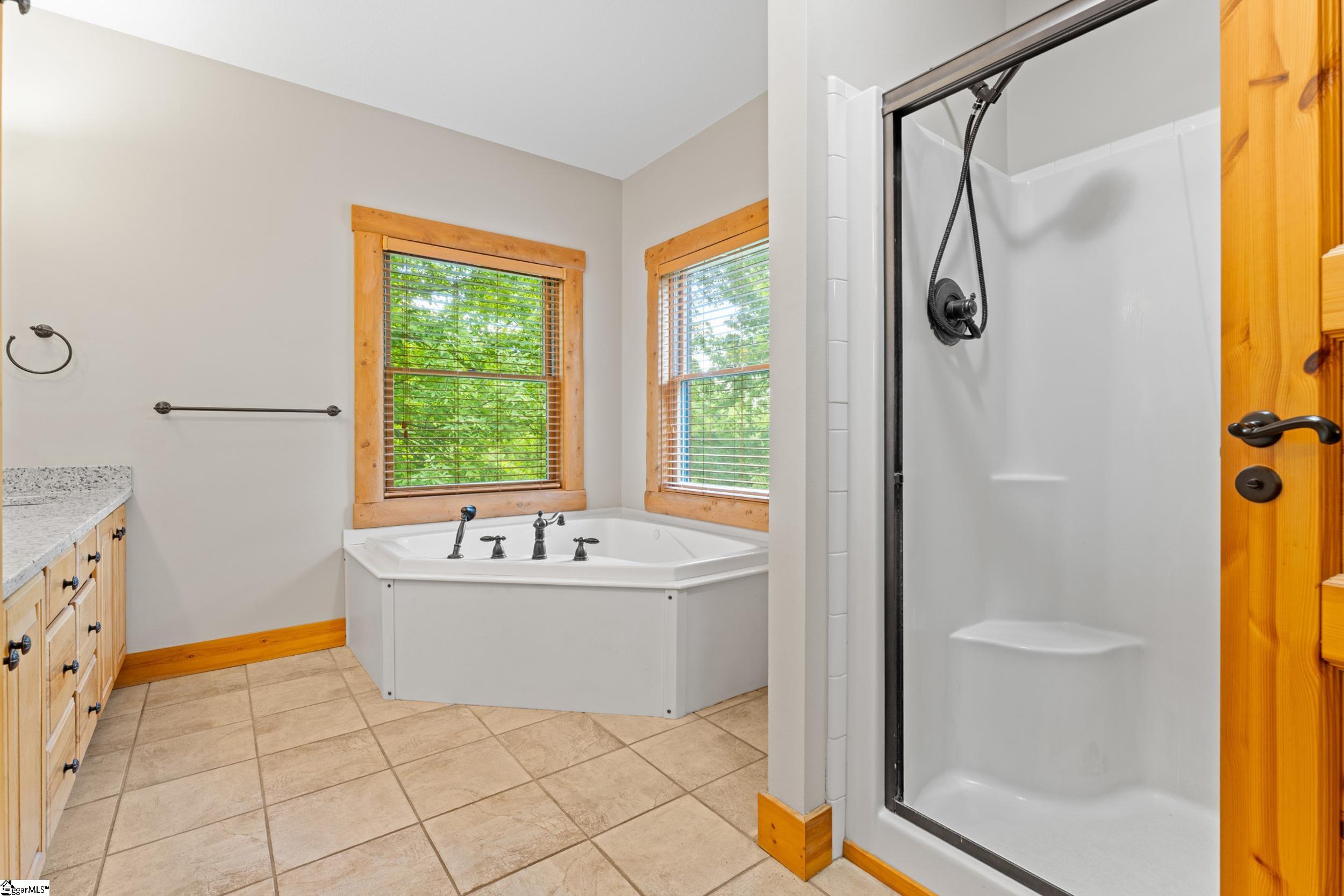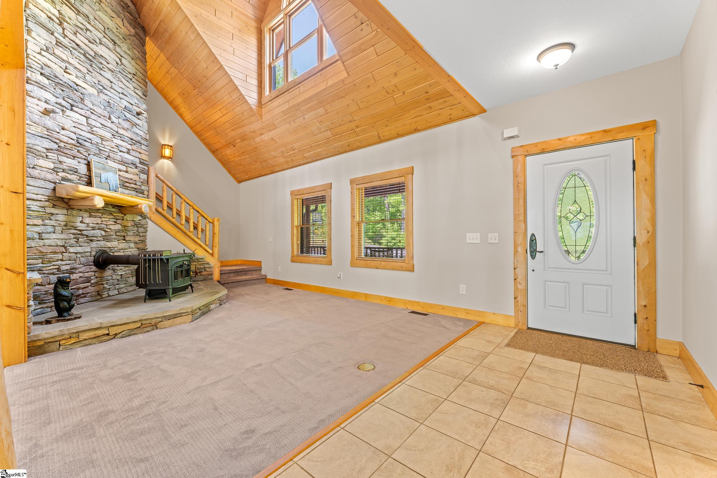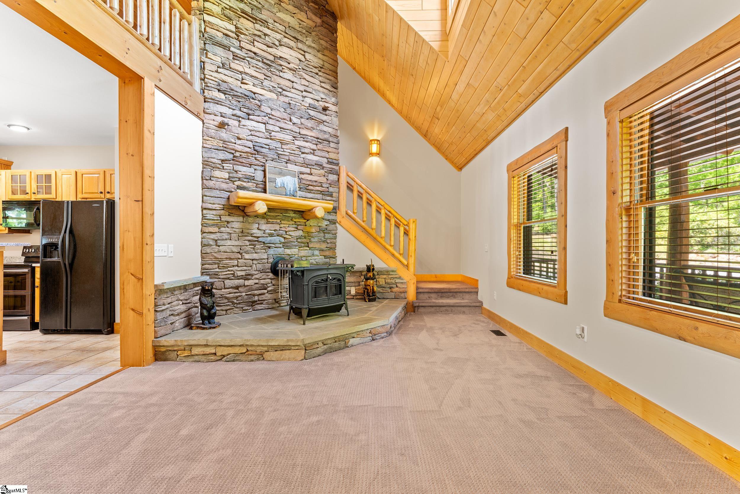 Escape to your own private sanctuary—where serenity, seclusion, and natural beauty converge on 8.5 breathtaking acres. Tucked away along a private drive and nestled mountainside among mature trees and abundant wildlife, this exceptional log cabin-style retreat offers the feeling of a peaceful escape while delivering the comfort of modern living. A welcoming rocking chair front porch sets the tone, inviting you to slow down and take in the surroundings. Inside, the open concept floor plan is flooded with natural light, highlighted by a dramatic two-story great room featuring a stunning stacked stone chimney and woodstove—creating a warm, inviting centerpiece. The space flows seamlessly into the dining area and well-appointed kitchen, complete with granite countertops, a full appliance package, and a center island perfect for casual meals. Just off the kitchen, you’ll find a convenient half bath for guests and direct access to the attached two-car garage. One of the home’s most captivating features is the series of four-season porches that truly make you feel as though you’re living in a treehouse—offering panoramic views of the mountains, native trees, and ever-changing landscape. A versatile flex room off the main living area provides endless possibilities as a secondary living space, home office, or formal dining room. The main level also includes a guest bedroom and full bath, along with a walk-in laundry room for everyday ease. The primary suite serves as a tranquil retreat, featuring a double trey ceiling, spacious walk-in closet, and a spa-inspired bath with dual sinks, a jetted tub, and a separate shower. Upstairs, a loft opens to sweeping views from every window and offers the perfect reading nook tucked beneath the natural light. A large storage area off the loft doubles as a dream space for a playroom or imaginative hideaway. Two additional bedrooms—one with a walk-in closet—share a full bath, providing ample room for family or guests. Throughout the home, thoughtful details shine, including recessed lighting, wide moldings, and beautifully carved columns that elevate the rustic elegance. Outdoors, the possibilities are endless—from gathering around the built-in firepit under the stars to enjoying the detached building with electricity, ideal for a workshop, hobby space, or additional storage with covered areas on either side. Recent updates—including the roof, HVAC, well pump, and tanks—offer peace of mind, while the paved drive and ample parking ensure convenience for you and your guests. While you’ll feel blissfully secluded, this private retreat is ideally located just minutes from the Saluda River, Poinsett Bridge, Eagle Mountain Winery, Chestnut Ridge Hunting Preserve, and a variety of the Upstate’s most beloved hiking and biking trails. Greenville is just 35 minutes away, downtown Travelers Rest 15 minutes, and both Spartanburg and Asheville are within an hour’s drive. A rare offering where lifestyle, layout, and location come together—this is more than a home; it’s an experience.