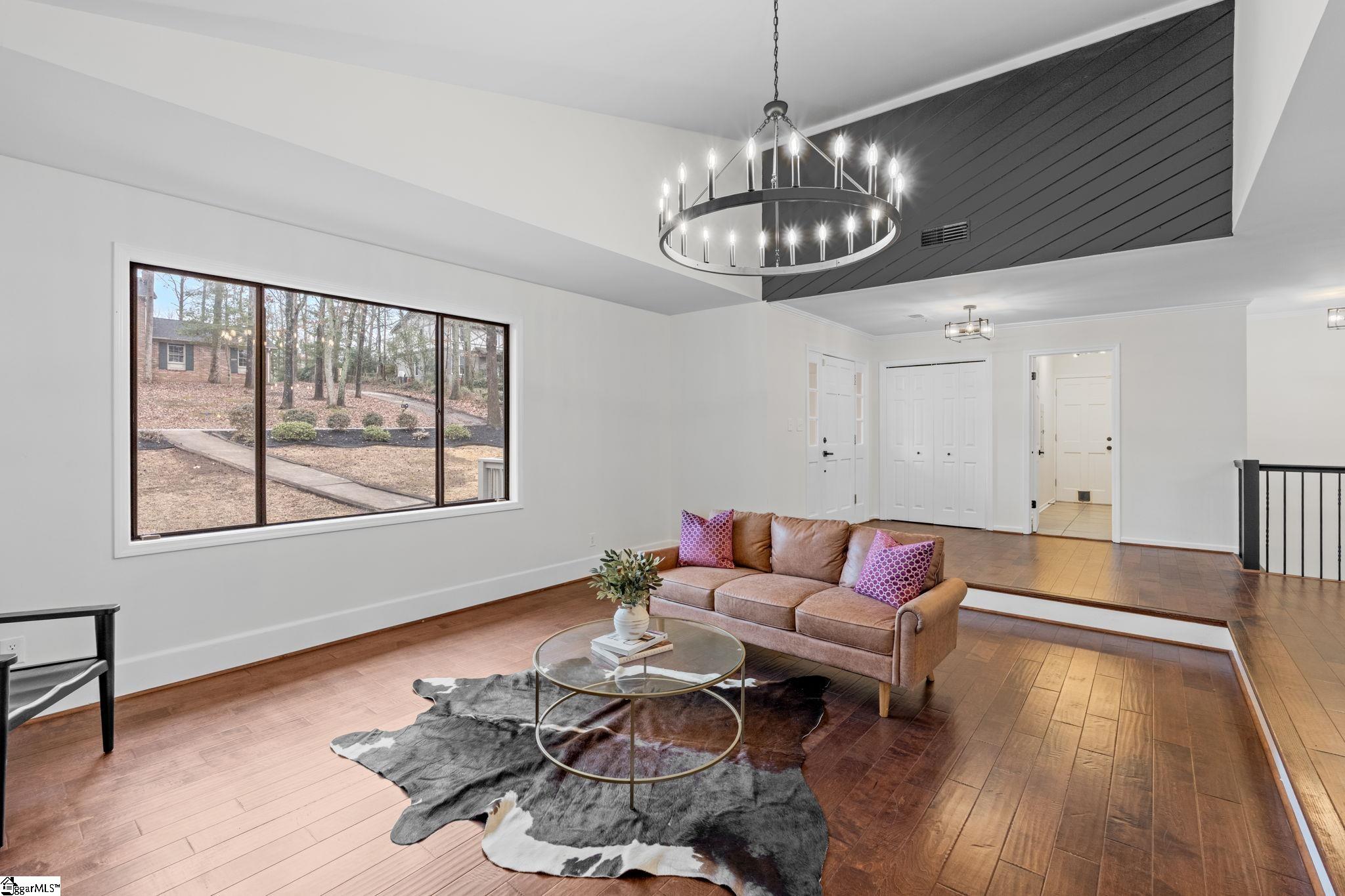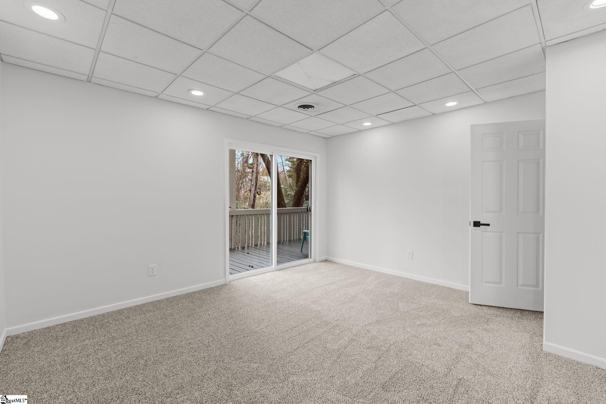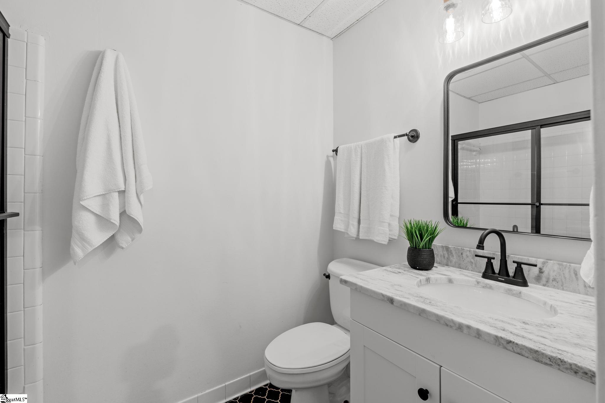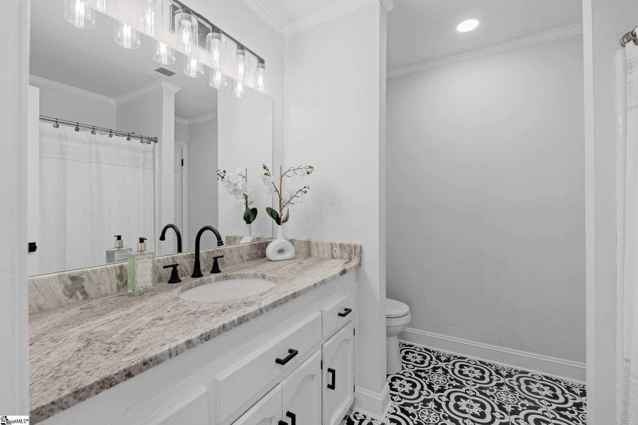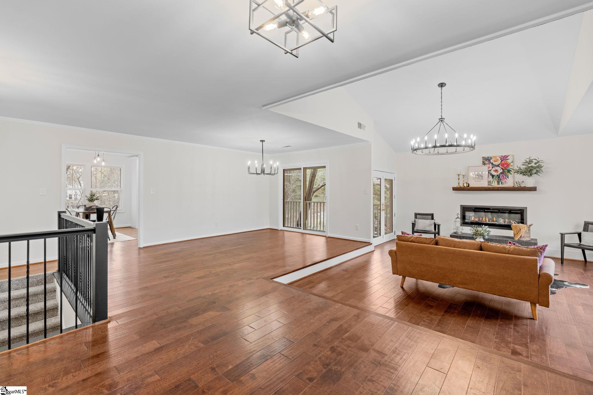 Welcome home to this four bedroom, three bathroom home in the sought after Pebble Creek community, offering a functional layout, updated finishes, and a convenient location. The main level features an open living room with vaulted ceilings, large windows that provide abundant natural light, hardwood flooring, and a modern fireplace. The living space flows seamlessly into the dining area with direct access to a screened porch. The fully remodeled kitchen includes granite countertops, new stainless steel appliances, updated cabinetry, and ample workspace with a clean, modern design. The primary suite is located on the main level and features a double sink vanity with granite countertops, a spacious linen closet, and a walk in tile shower. An additional bedroom and a full bathroom with modern tile and a tub shower combination complete the main floor. The walk out basement provides additional living space with two bedrooms, a full bathroom, and a bonus room with a built in bar. Sliding glass doors lead to the back deck and fenced backyard with a fire pit, mature trees, and a small creek located behind the property. Conveniently located approximately 15 minutes to downtown Greenville, downtown Greer, and downtown Travelers Rest, with easy access to shopping, dining, and everything the Upstate has to offer.