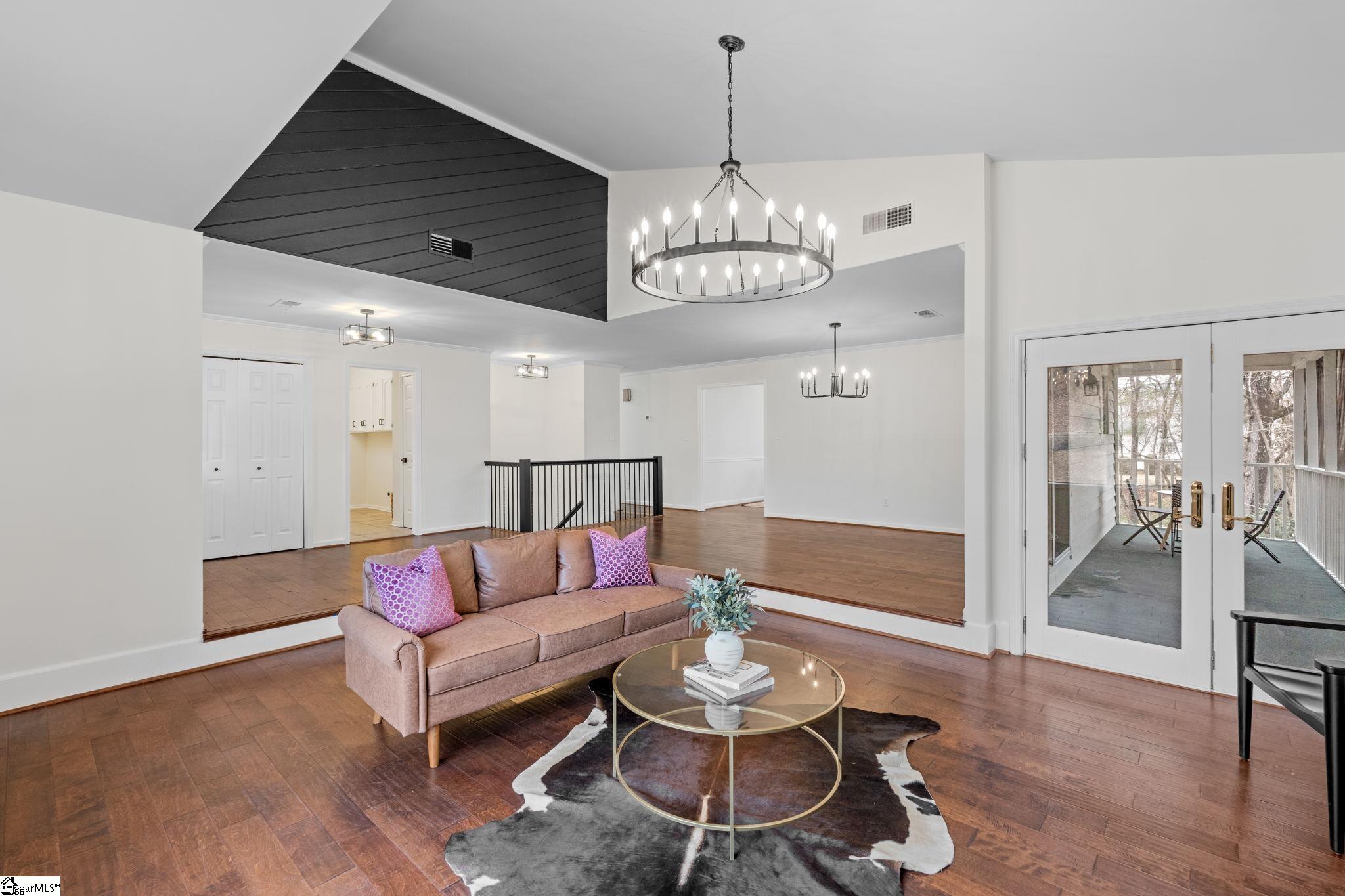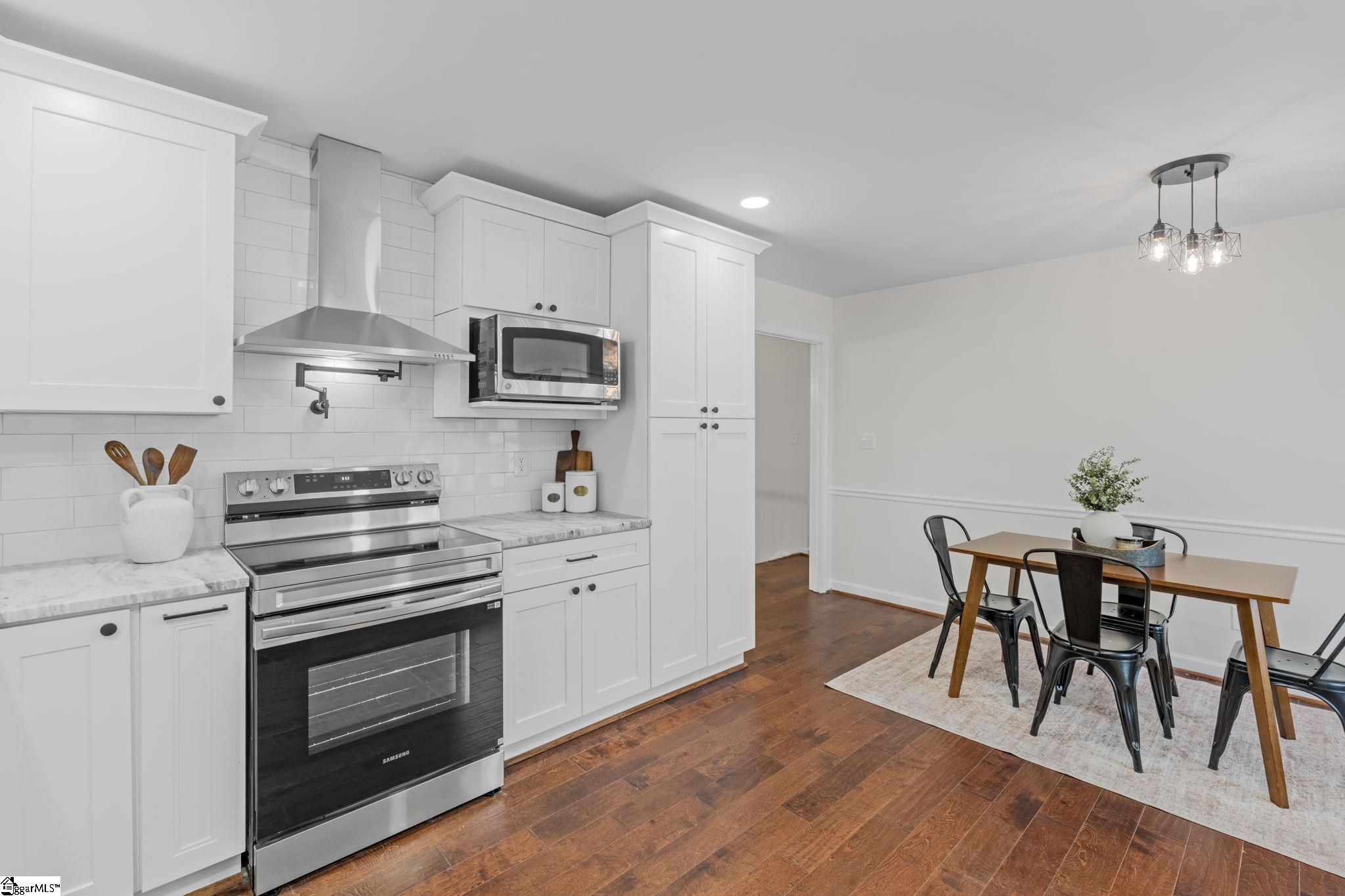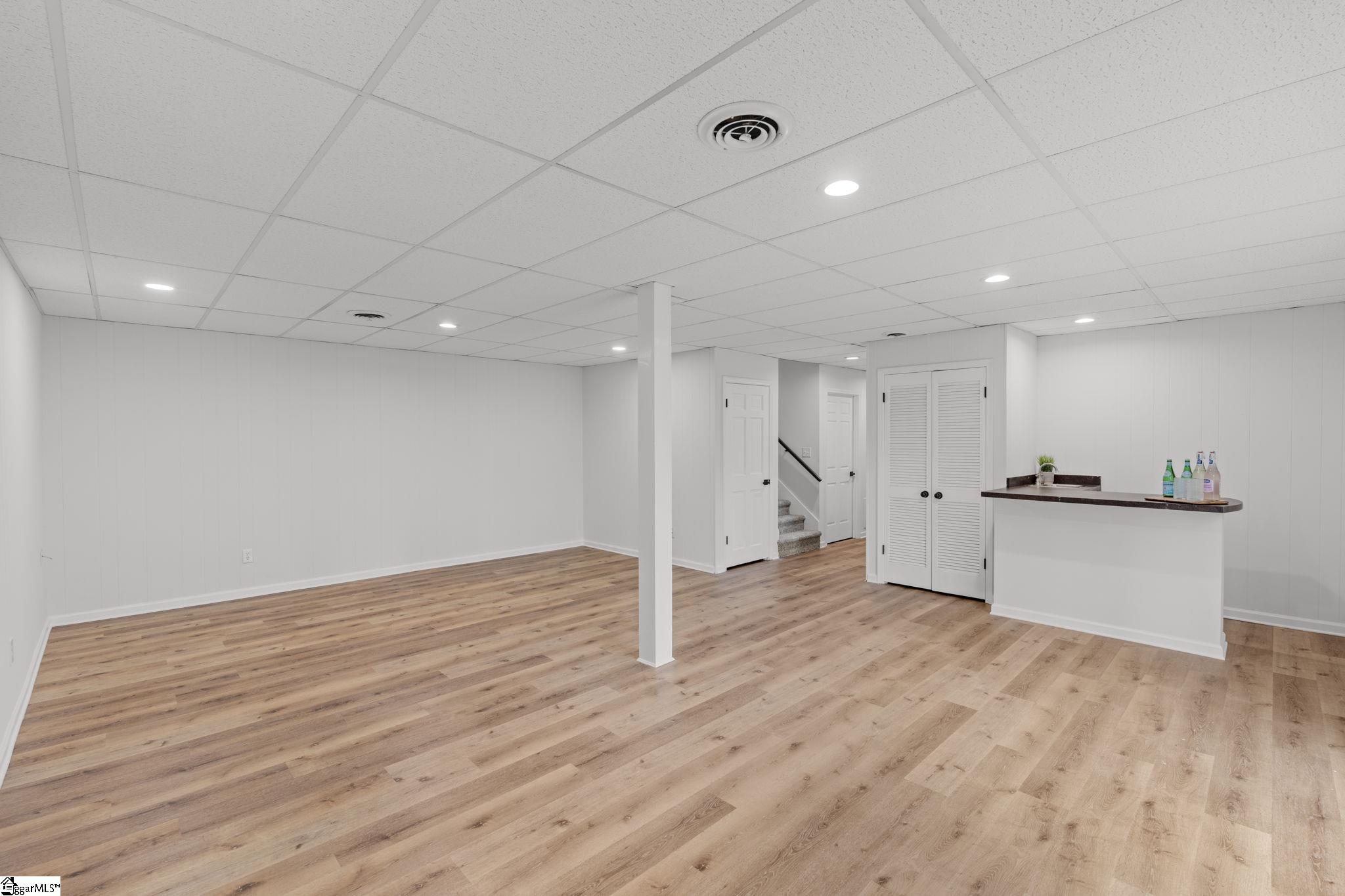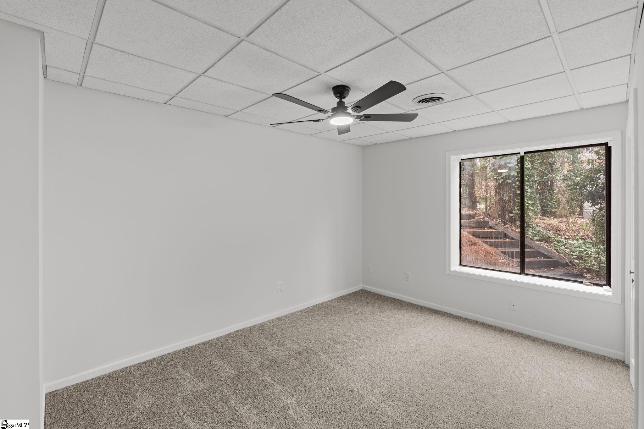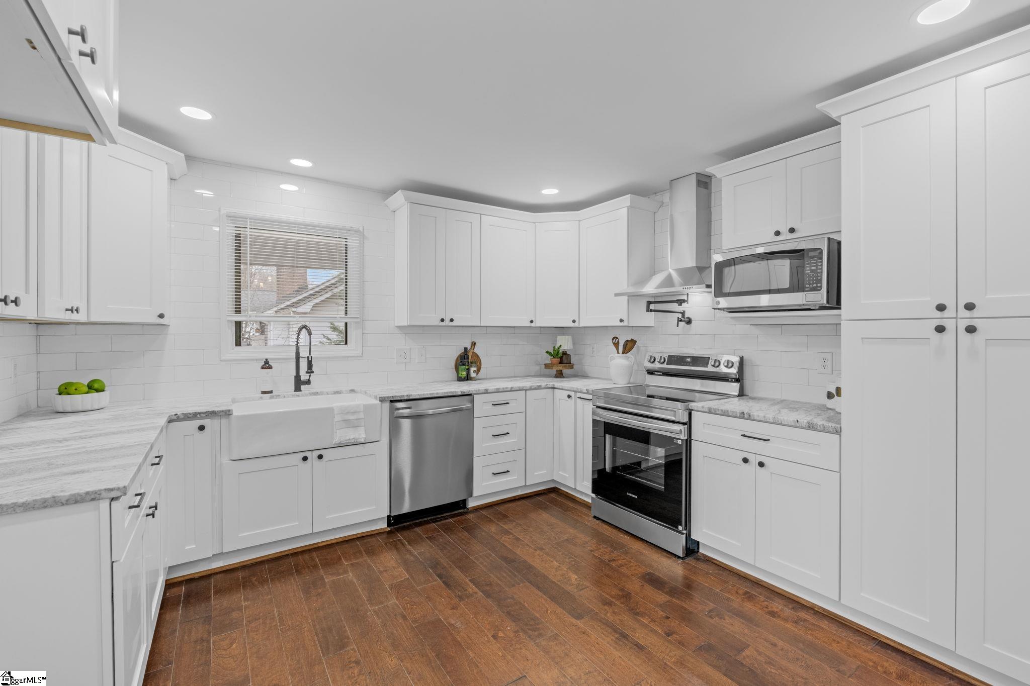 Welcome home to this four bedroom, three bathroom home in the sought after Pebble Creek community, offering a functional layout, updated finishes, and a convenient location. The main level features an open living room with vaulted ceilings, large windows that provide abundant natural light, hardwood flooring, and a modern fireplace. The living space flows seamlessly into the dining area with direct access to a screened porch. The fully remodeled kitchen includes granite countertops, new stainless steel appliances, updated cabinetry, and ample workspace with a clean, modern design. The primary suite is located on the main level and features a double sink vanity with granite countertops, a spacious linen closet, and a walk in tile shower. An additional bedroom and a full bathroom with modern tile and a tub shower combination complete the main floor. The walk out basement provides additional living space with two bedrooms, a full bathroom, and a bonus room with a built in bar. Sliding glass doors lead to the back deck and fenced backyard with a fire pit, mature trees, and a small creek located behind the property. Conveniently located approximately 15 minutes to downtown Greenville, downtown Greer, and downtown Travelers Rest, with easy access to shopping, dining, and everything the Upstate has to offer.