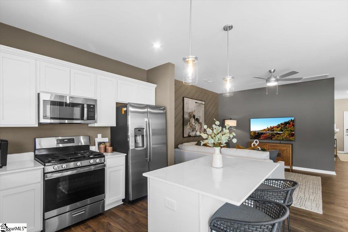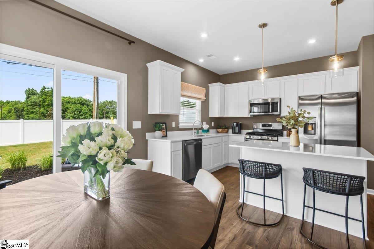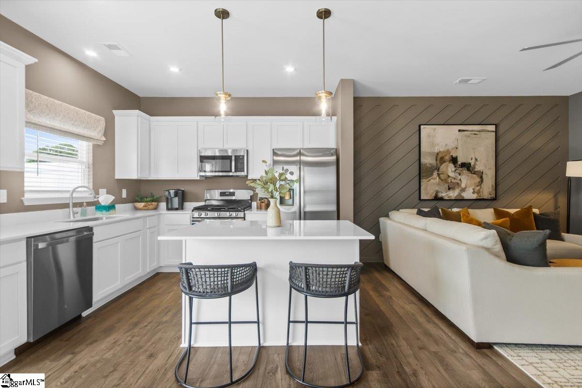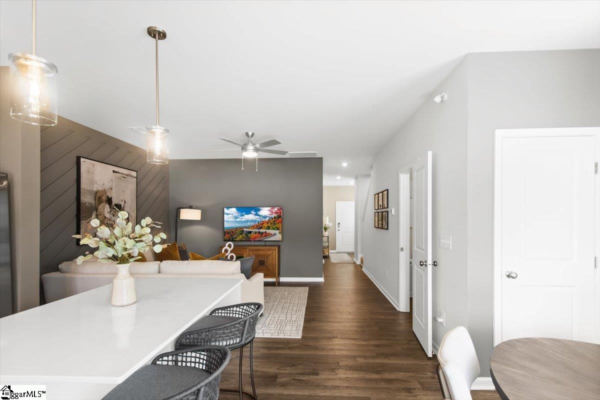 Welcome home to the Amara floor plan at Gardner Heights! This beautiful end unit townhome is ready for you to make it your own. From the moment you arrive, you’ll notice the charming neighborhood setting, thoughtfully designed landscaping, and an inviting feel throughout the community. This spacious 3-bedroom, 2.5-bath home offers an open-concept layout that fills the kitchen, dining area, and living room with natural light. As you enter through the front foyer, guests are greeted by a welcoming entryway complete with a coat closet and a conveniently located half bath. The kitchen features stunning quartz countertops, soft-close cabinetry, and stylish pendant lighting, complemented by beautifully finished flooring. You’ll also appreciate the generous pantry and ample cabinet space for easy, organized storage. The main floor also boasts a dedicated dining area and spacious living room, creating a seamless set up for entertaining or for easy everyday living. Upstairs, the large primary suite offers a serene retreat with a beautifully appointed ensuite featuring a walk-in shower with glass doors and a double-sink vanity. Two additional bedrooms at the front of the home enjoy great natural light. A full hall bath with a tub and a nearby linen closet adds comfort for family or guests, while the upstairs laundry area offers easy access for added convenience. The bathrooms and laundry room also include durable ceramic tile flooring for added refinement. This home is MOVE-IN READY, complete with cordless blinds and a full suite of GE stainless steel appliances—including a dishwasher, gas range with a flat-top griddle, a side-by-side refrigerator, and a washer and dryer. Step outside to your private backyard with a large paved patio, perfect for grilling and relaxing. The community amenities at Gardner Heights area a true highlight, offering a covered pavilion with picnic tables and benches, two fire pits surrounded by Adirondack chairs, a swing set, a dog park, and sidewalks throughout the neighborhood. Conveniently located minutes from I-85, GSP Airport, BMW, Michelin, the BMW Battery Plant, FiveForks, and Downtown Woodruff, Reidville, and Greer, this location provides the perfect combination of serenity and convenience. Situated in Spartanburg County, you’ll enjoy lower taxes and proximity to local favorites like the Spartanburgers baseball team. The HOA covers lawn maintenance and landscaping, giving you more time to enjoy your evenings and weekends. This Stanley Martin community is USDA eligible. Stop by the model home to learn more and to see firsthand just how beautiful Gardner Heights truly is. We can’t wait to welcome you—come visit, explore the neighborhood, and stay a while!