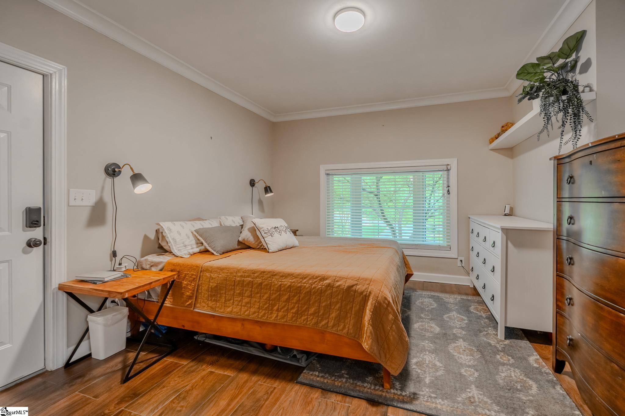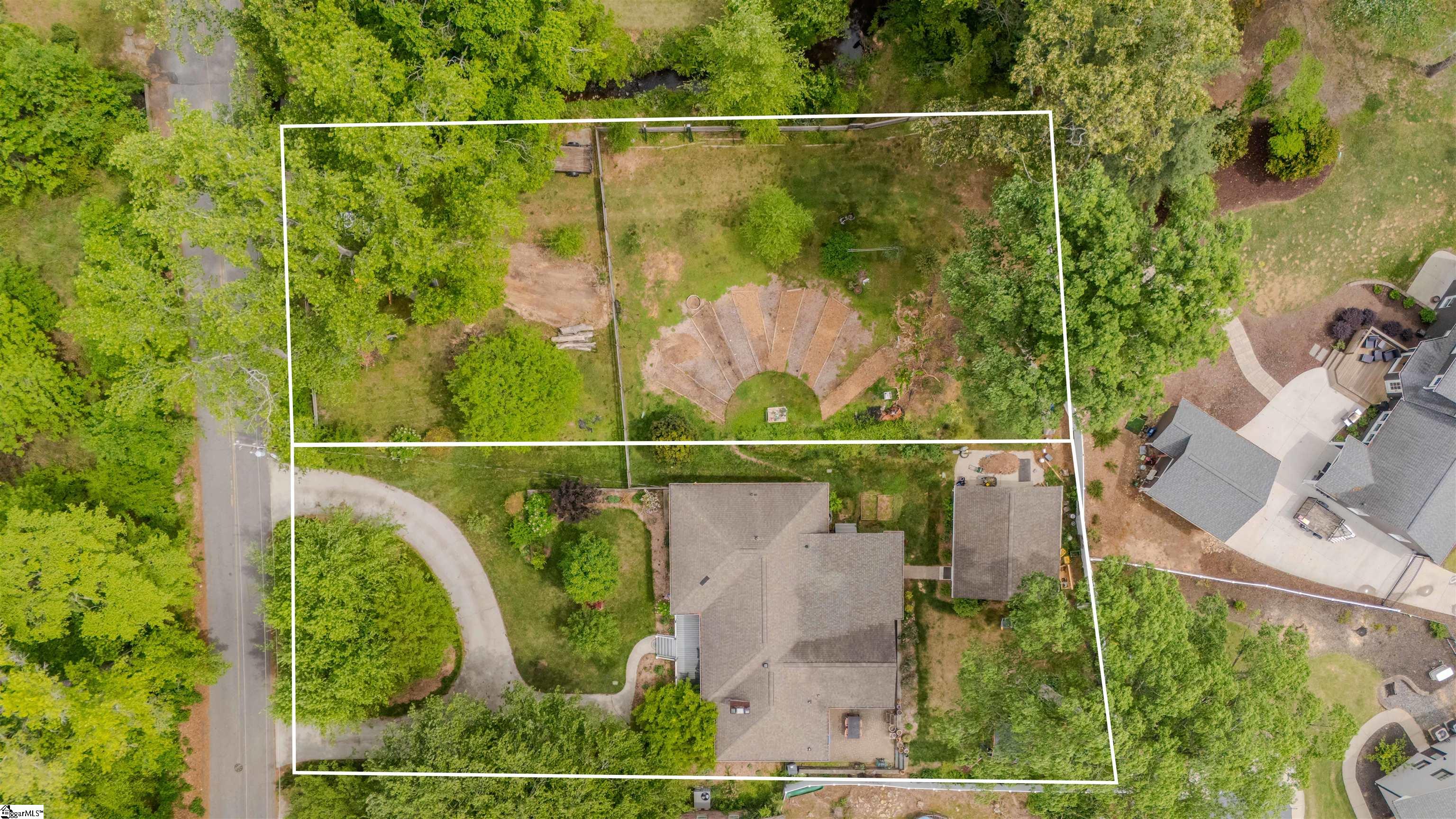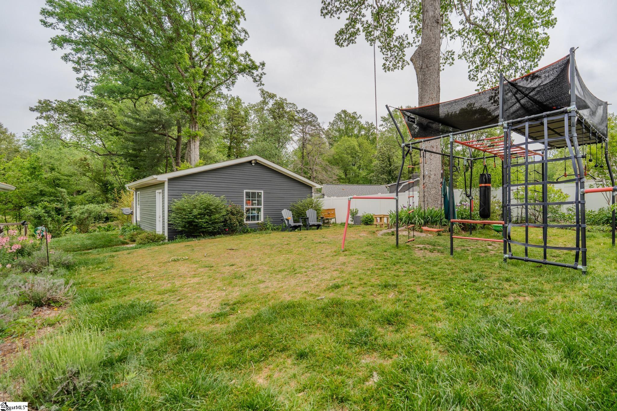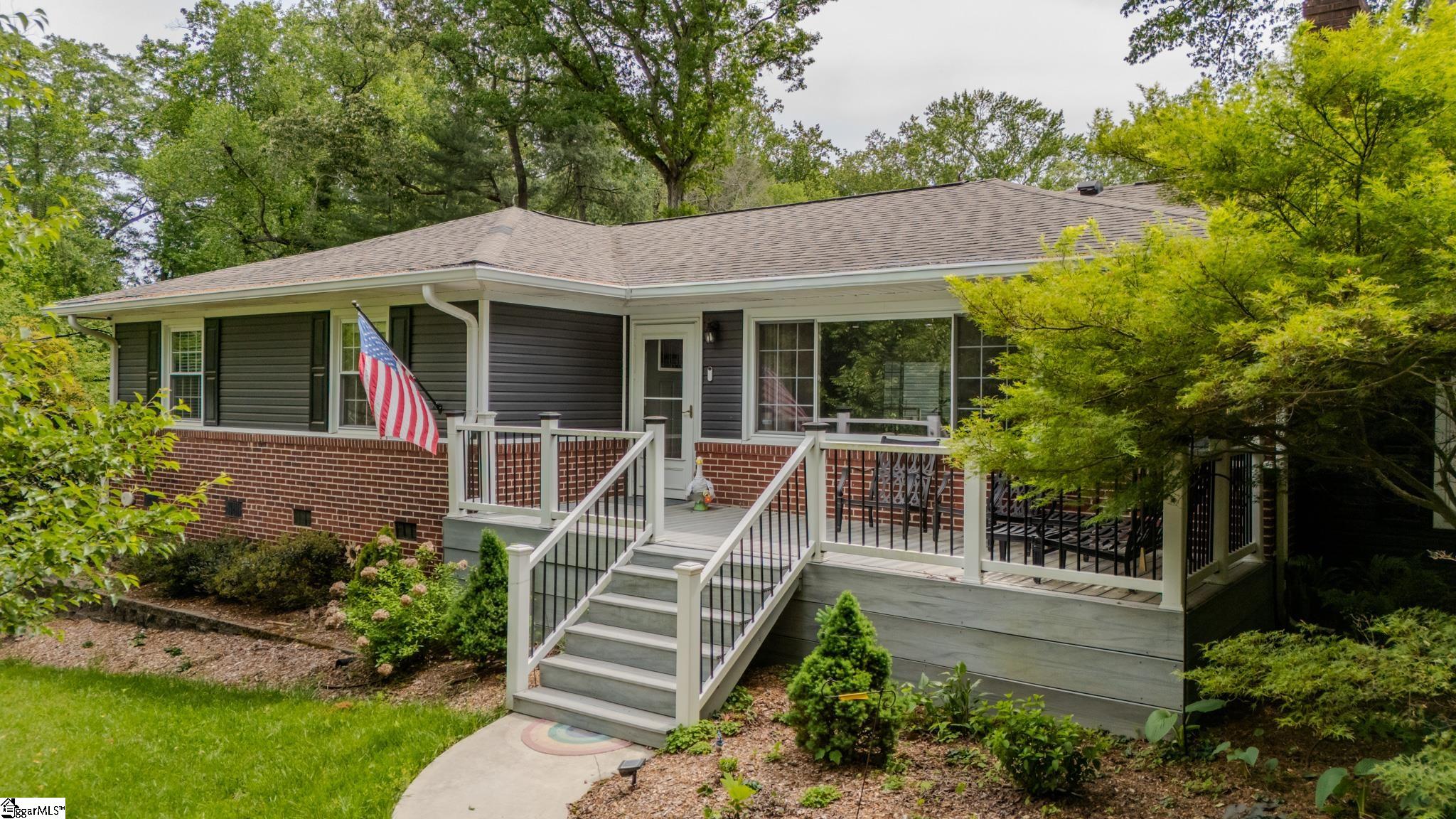 Welcome to your own private retreat just minutes from downtown Greenville. Tucked among mature trees and surrounded by established perennial gardens, this home offers a peaceful setting without giving up convenience. Inside, you’ll find hardwood floors throughout much of the home, adding warmth and character to the main living spaces. The flexible floor plan includes a dual primary suite, with exterior access, perfect for weekend guests, office space, or extra studio space you’ve been dreaming of! The kitchen has been nicely updated with solid surface countertops, stainless steel appliances, and a clean, modern tile backsplash. Just off the kitchen, the vaulted living area is filled with natural light and feels open, airy, and inviting easily one of the favorite spots in the home. Step outside and enjoy multiple outdoor living areas designed for relaxing and entertaining. There’s a spacious covered patio, a large paver patio that’s perfect for grilling or gathering around a fire pit, and even a welcoming front patio to round it all out. You’ll also appreciate the detached garage with extra storage space. One of the most unique features is the additional .33 acre parcel next door owned by Greenville County but maintained by the sellers giving you extra room to enjoy, plus a scenic creek that adds to the privacy and charm. If you’re looking for a home that blends comfort, flexibility, and a great location close to everything Greenville has to offer, this one is definitely worth a look.