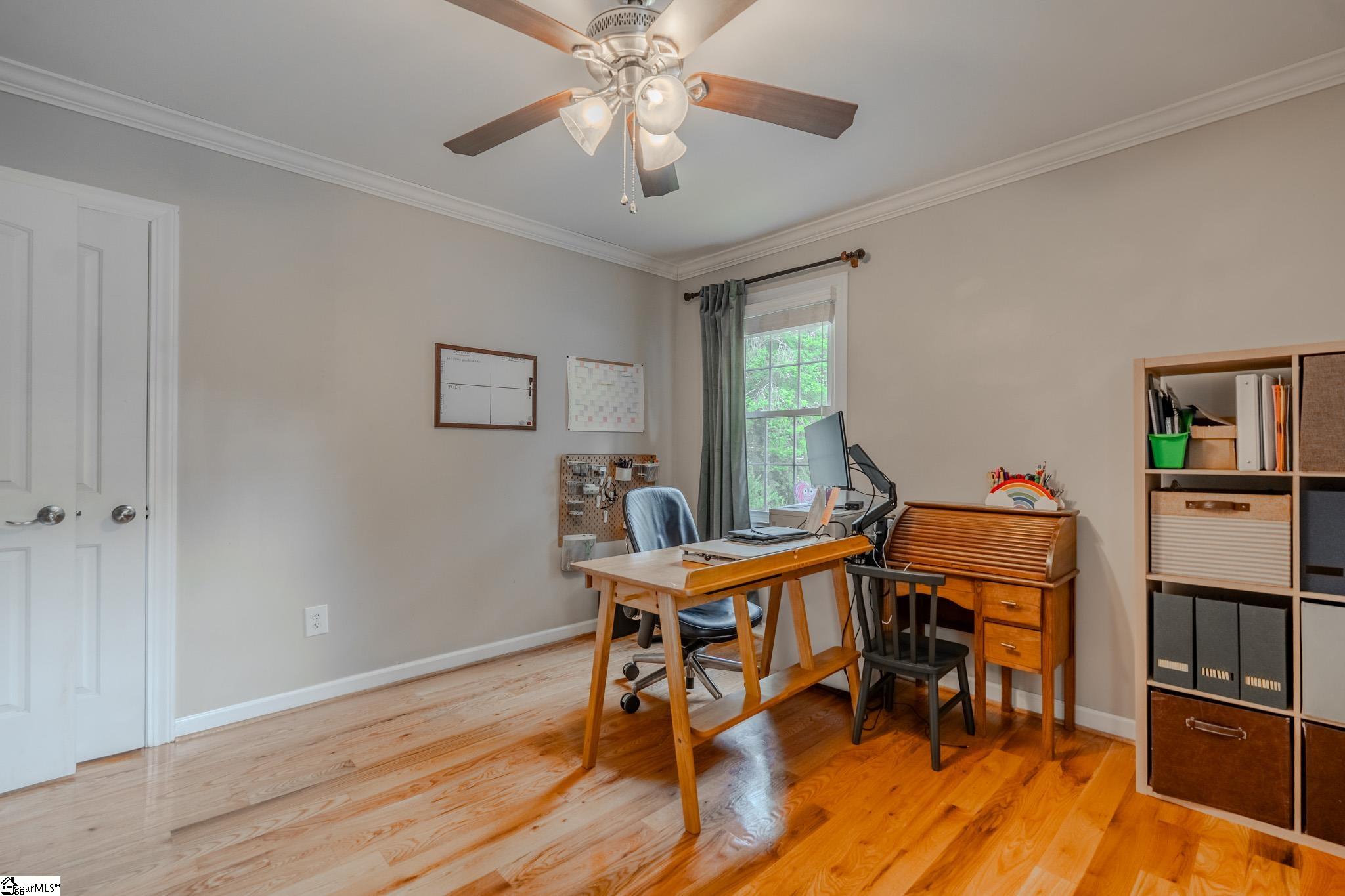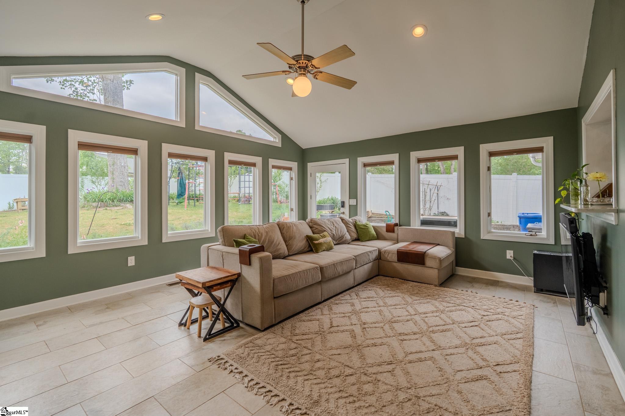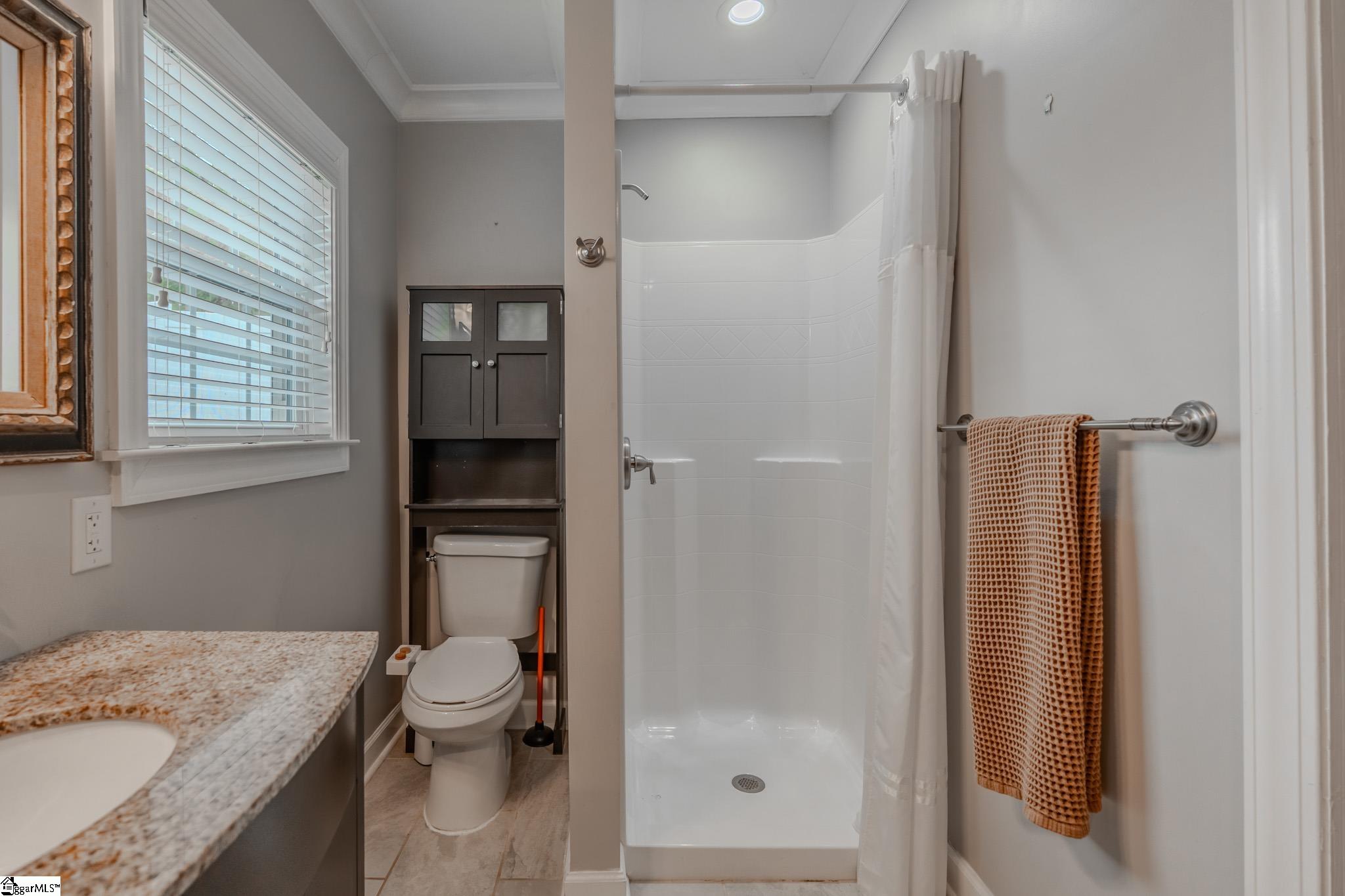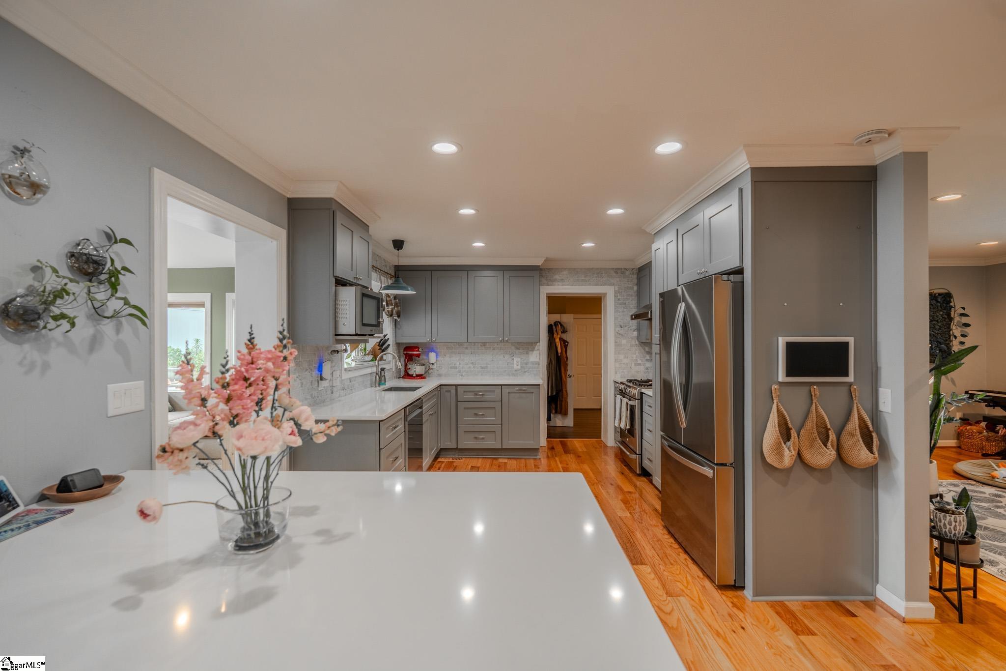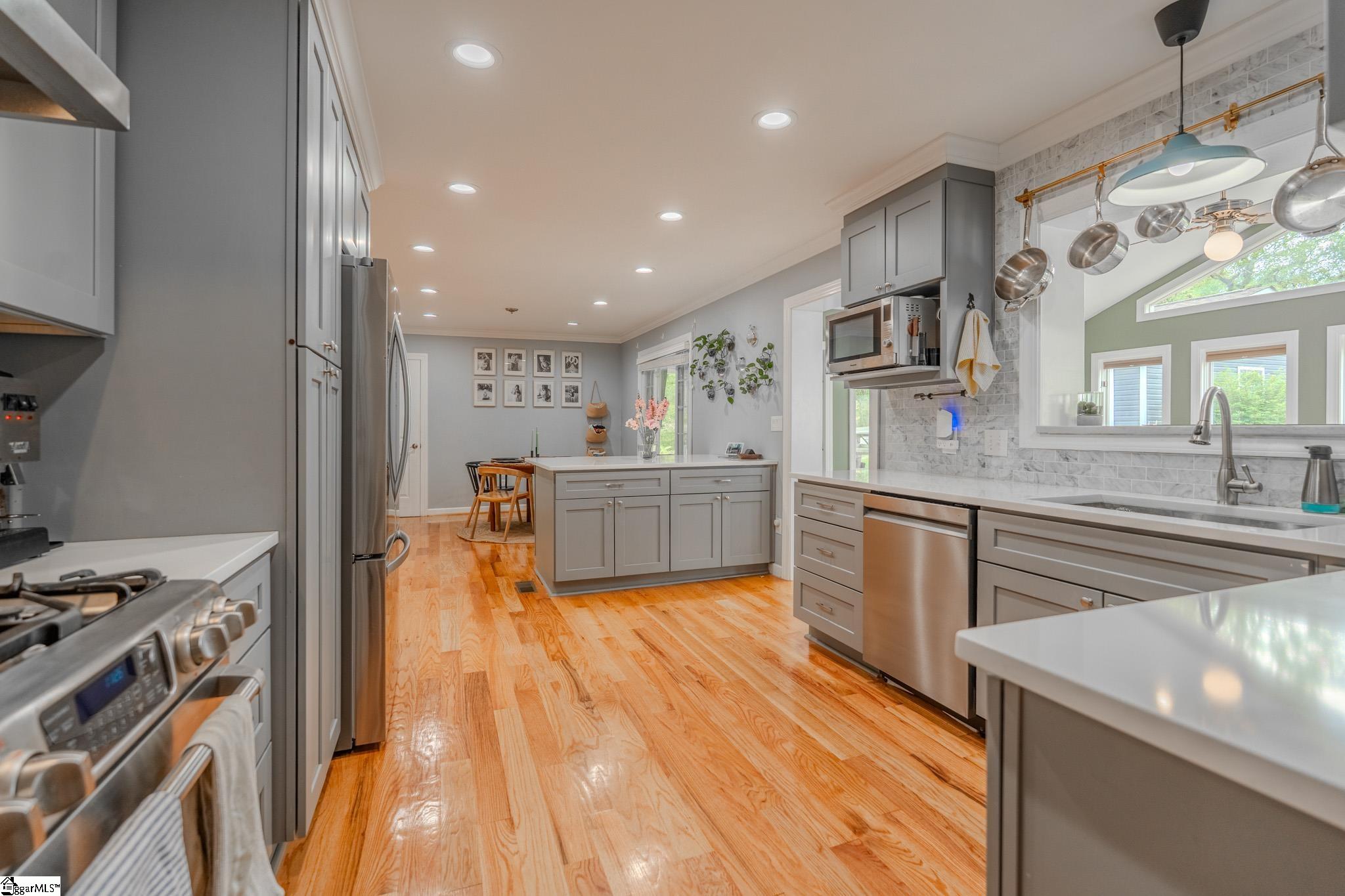 Welcome to your own private retreat just minutes from downtown Greenville. Tucked among mature trees and surrounded by established perennial gardens, this home offers a peaceful setting without giving up convenience. Inside, you’ll find hardwood floors throughout much of the home, adding warmth and character to the main living spaces. The flexible floor plan includes a dual primary suite, with exterior access, perfect for weekend guests, office space, or extra studio space you’ve been dreaming of! The kitchen has been nicely updated with solid surface countertops, stainless steel appliances, and a clean, modern tile backsplash. Just off the kitchen, the vaulted living area is filled with natural light and feels open, airy, and inviting easily one of the favorite spots in the home. Step outside and enjoy multiple outdoor living areas designed for relaxing and entertaining. There’s a spacious covered patio, a large paver patio that’s perfect for grilling or gathering around a fire pit, and even a welcoming front patio to round it all out. You’ll also appreciate the detached garage with extra storage space. One of the most unique features is the additional .33 acre parcel next door owned by Greenville County but maintained by the sellers giving you extra room to enjoy, plus a scenic creek that adds to the privacy and charm. If you’re looking for a home that blends comfort, flexibility, and a great location close to everything Greenville has to offer, this one is definitely worth a look.