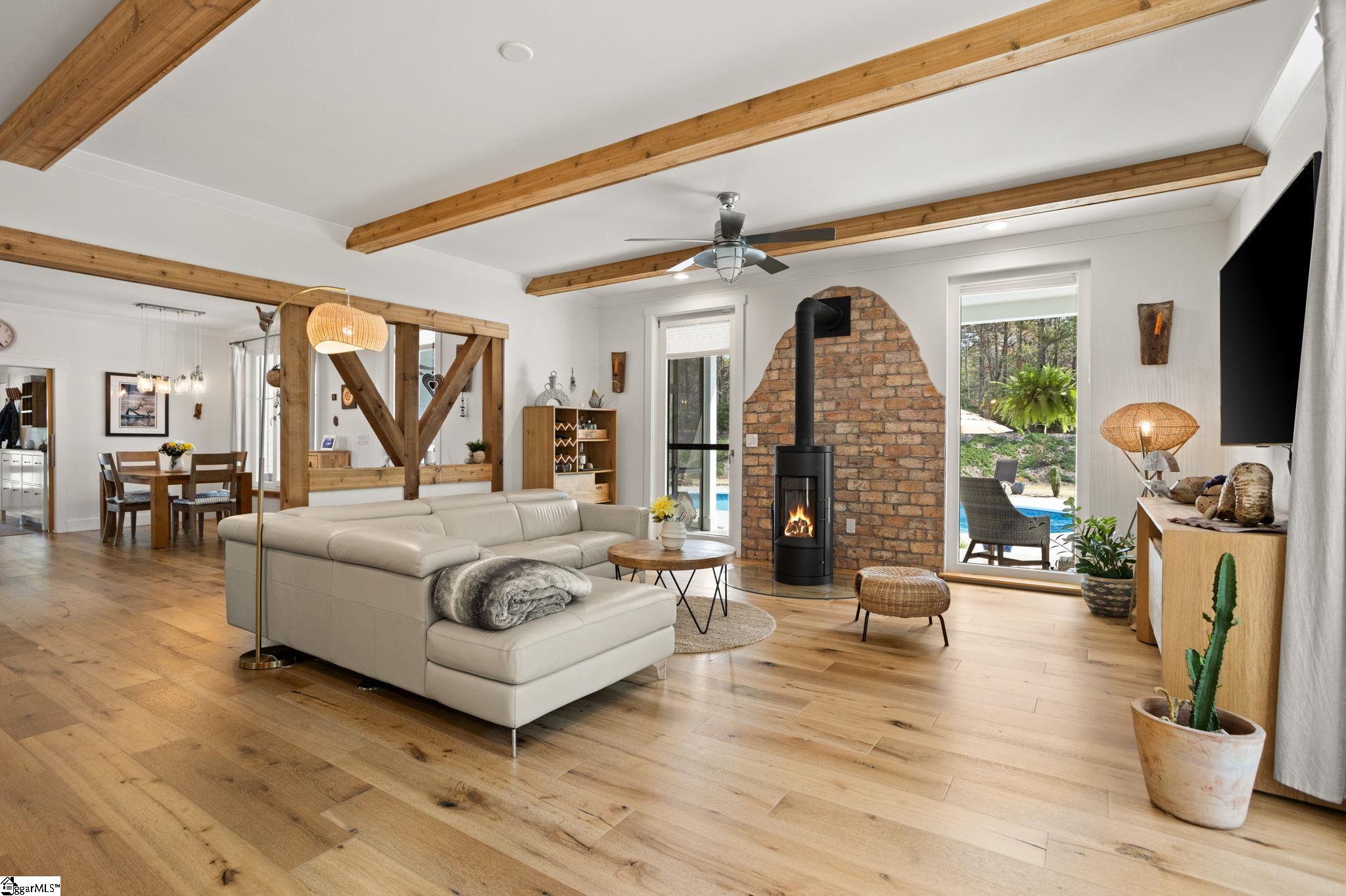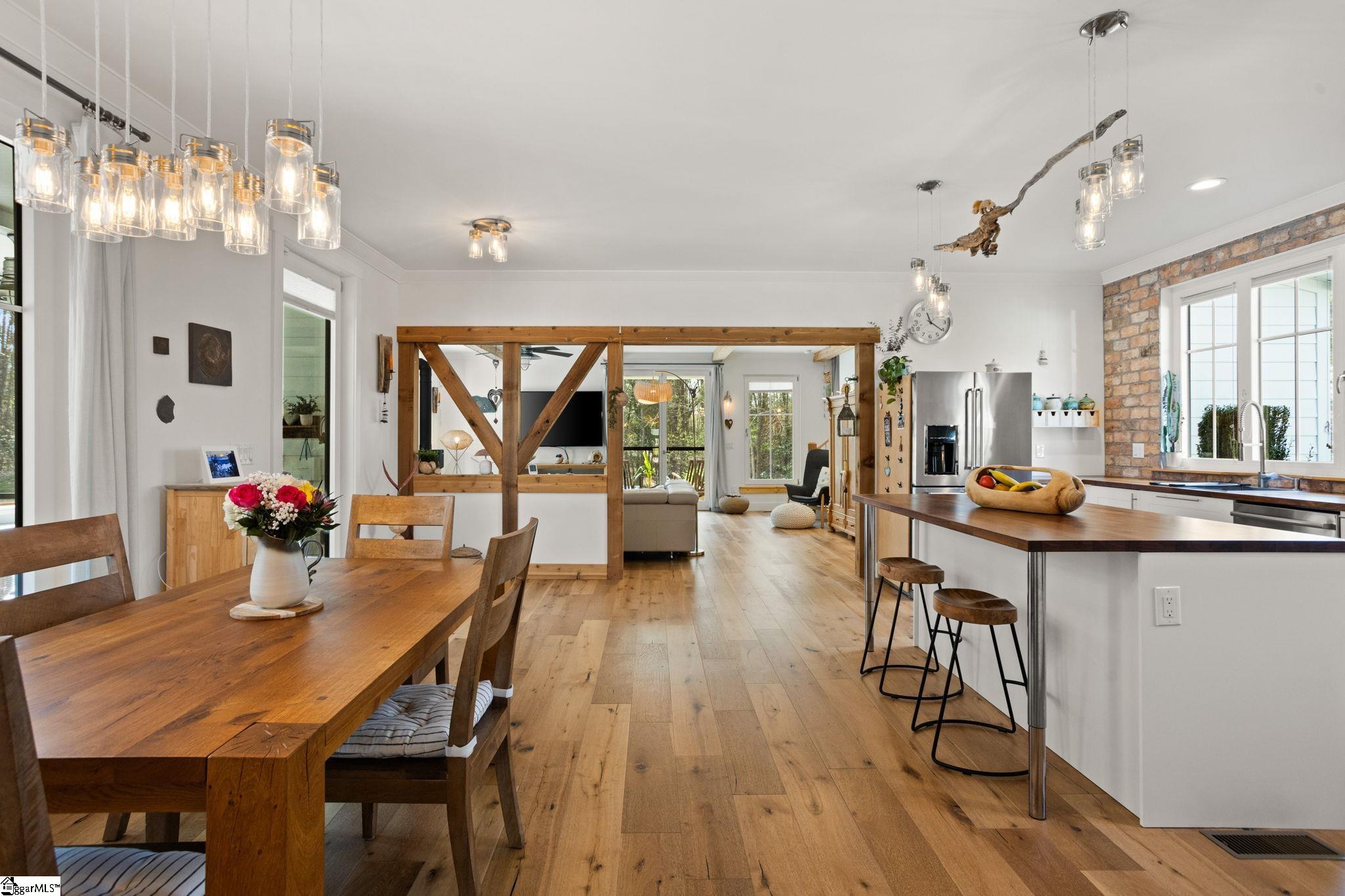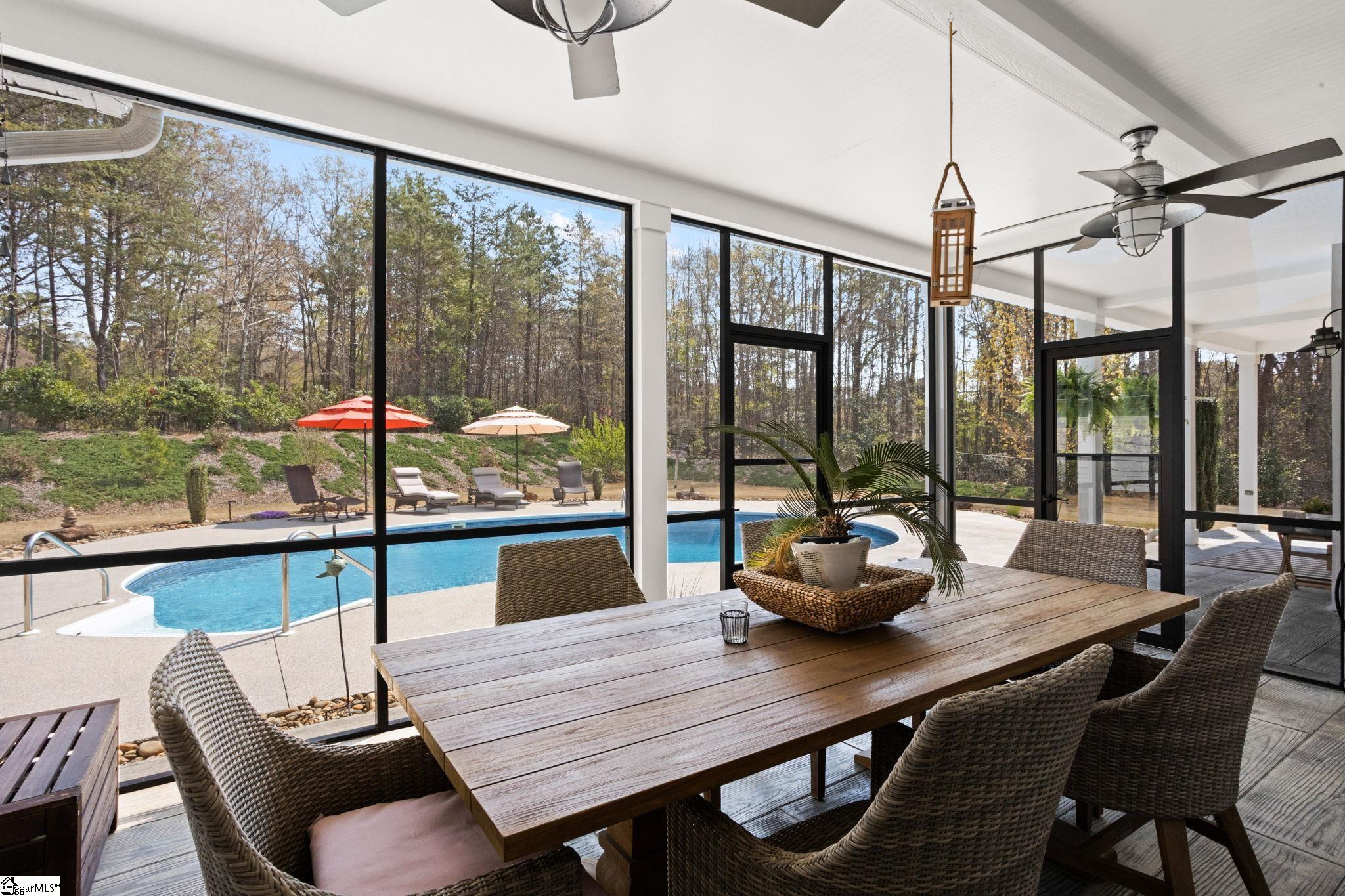 Custom-built in 2019, this home sits on approximately 3 private acres with no HOA or restrictions, offering a layout designed for primary living on the main level. The main level flows seamlessly from an open kitchen and dining, to bright living spaces, and access to outdoor areas. The primary suite is located on the main floor, with additional bedrooms and flexible space upstairs. The outdoor setting is a key feature, with a saltwater pool, patio, screened porch, and a covered wraparound porch. The property is set back from the road and bordered by woods, making it easy to enjoy your quiet, relaxing retreat! In addition to the main home, there is a fully conditioned detached structure with a garage, flex space, bathroom, and finished upper-level loft, offering clear ADU potential. A separate four-car garage provides additional storage and utility for vehicles, equipment, or workshop use. The home was built with a focus on efficiency and performance, including owned solar, high-quality windows and doors, and premium insulation. The result is a property that prioritizes function, privacy, and long-term usability. Conveniently located under 30 minutes to downtown Greenville, approximately 10 minutes to Main Street Spartanburg, and less than 20 minutes to GSP Airport. Home pre-inspected and repairs made at sellers expense! All this home needs is YOU!!!