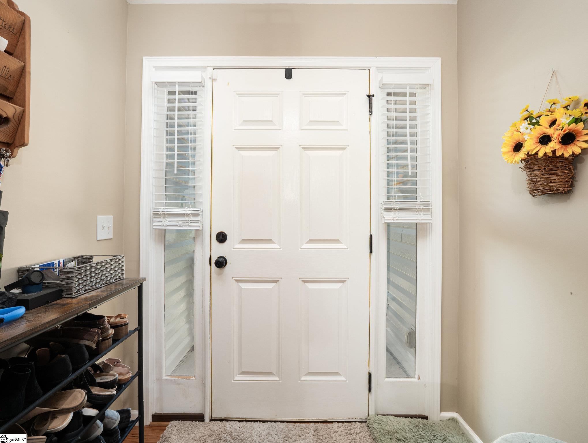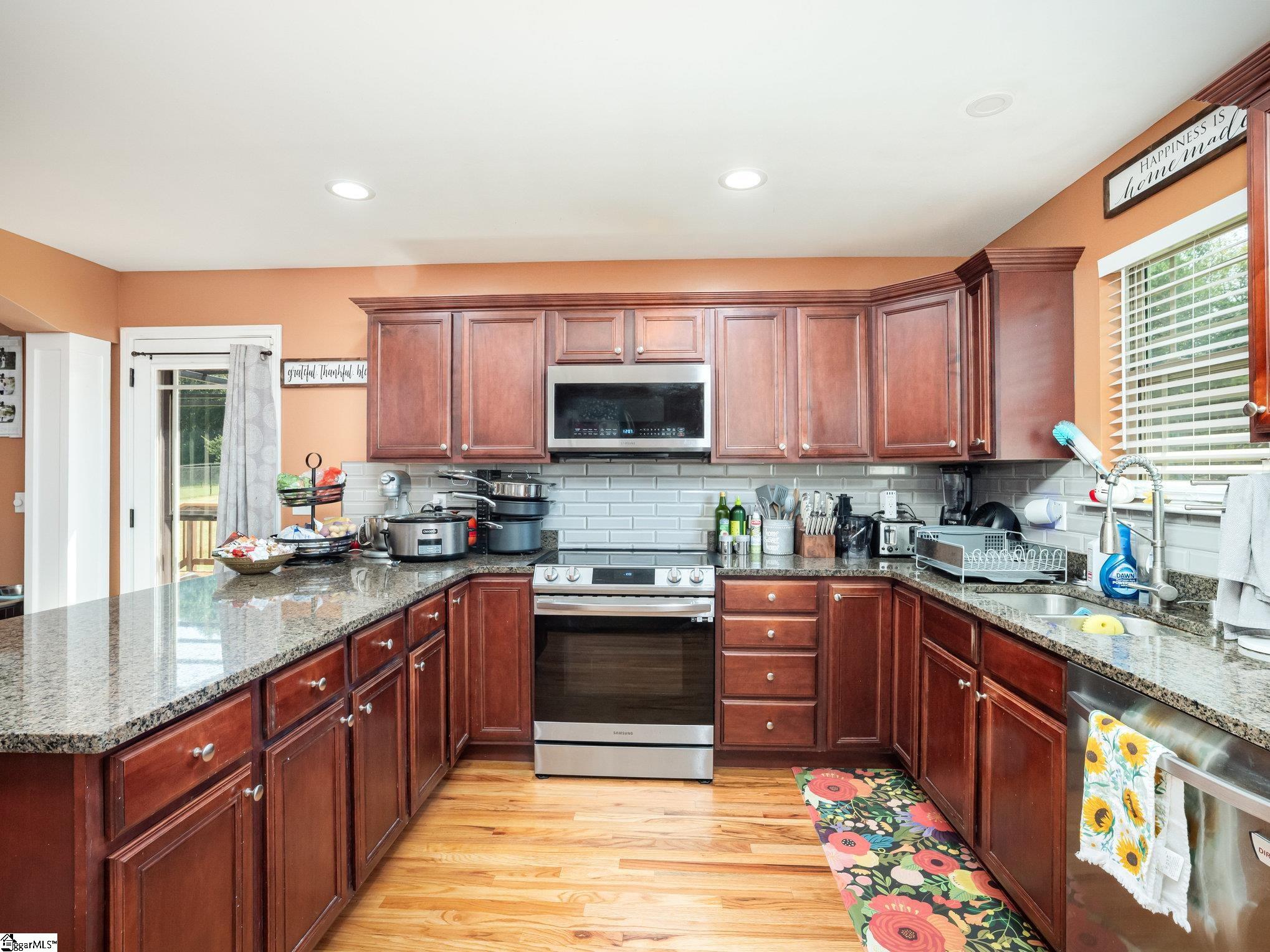 Beautifully maintained home in like-new condition featuring an open concept and split-bedroom floor plan. 2022 roof, 2022 HVAC, 2022 water heater and a whole home water filter system! The spacious family room boasts hardwood floors, a gas log fireplace, and built-in shelving. The kitchen offers granite countertops, tile backsplash, stainless steel appliances, pantry, and hardwood floors, with a formal dining room open to both the kitchen and family room. The primary suite includes double closets, a jetted tub, and a separate shower, while each guest bedroom comes with its own walk-in closet. Outside, enjoy a fenced backyard, large storage shed, and a lot that backs up to Lake Blalock Park with water access, fishing, and trails.