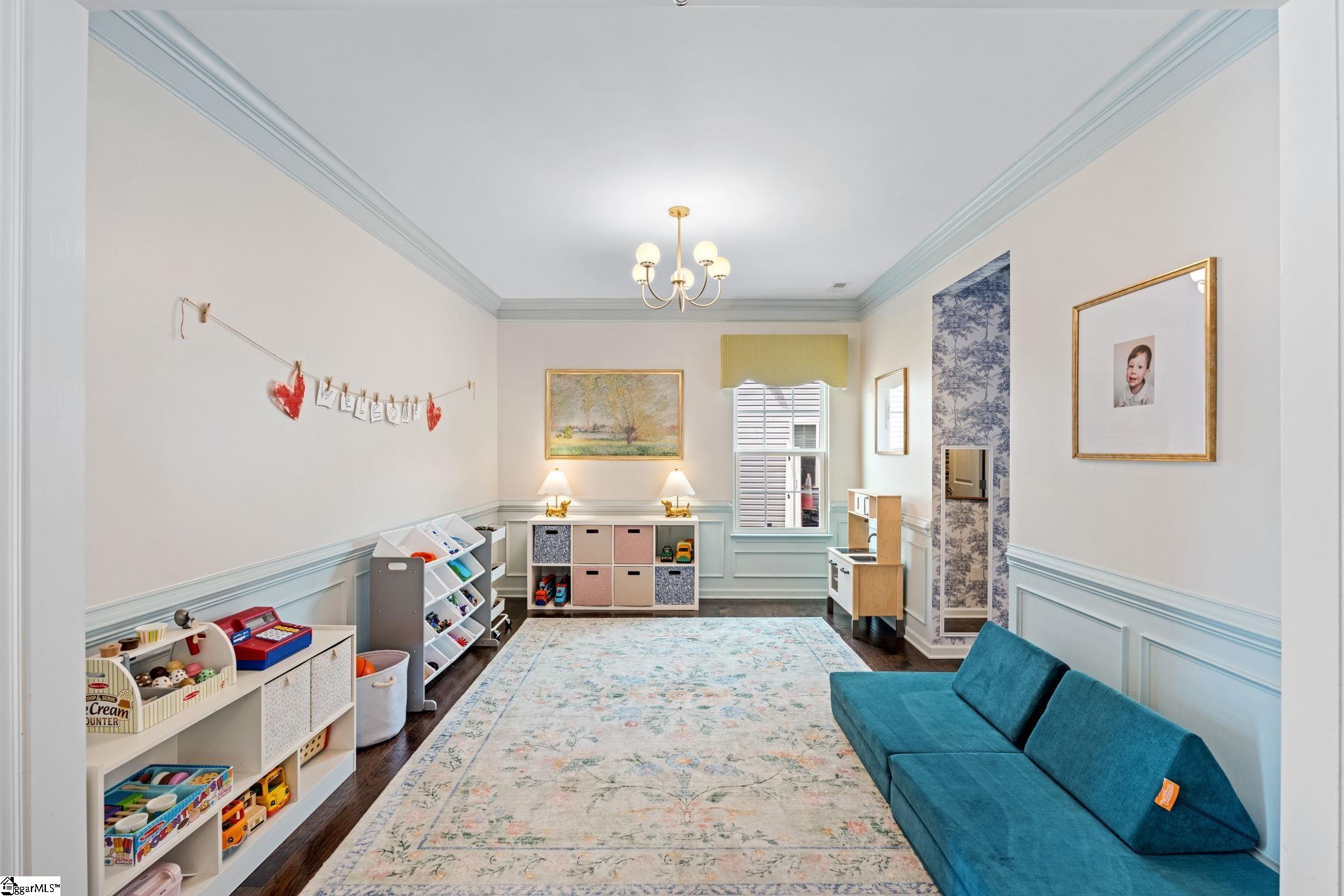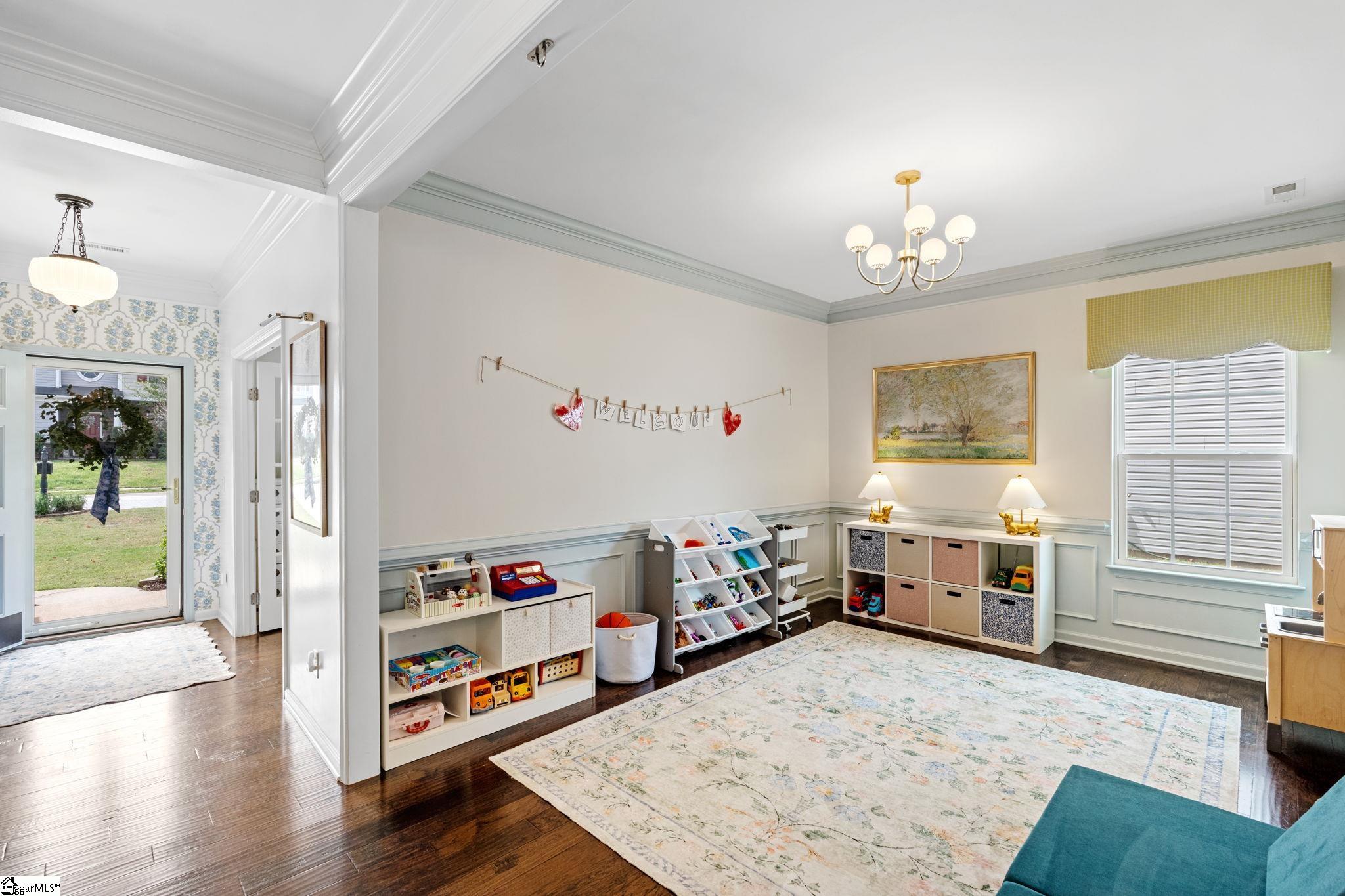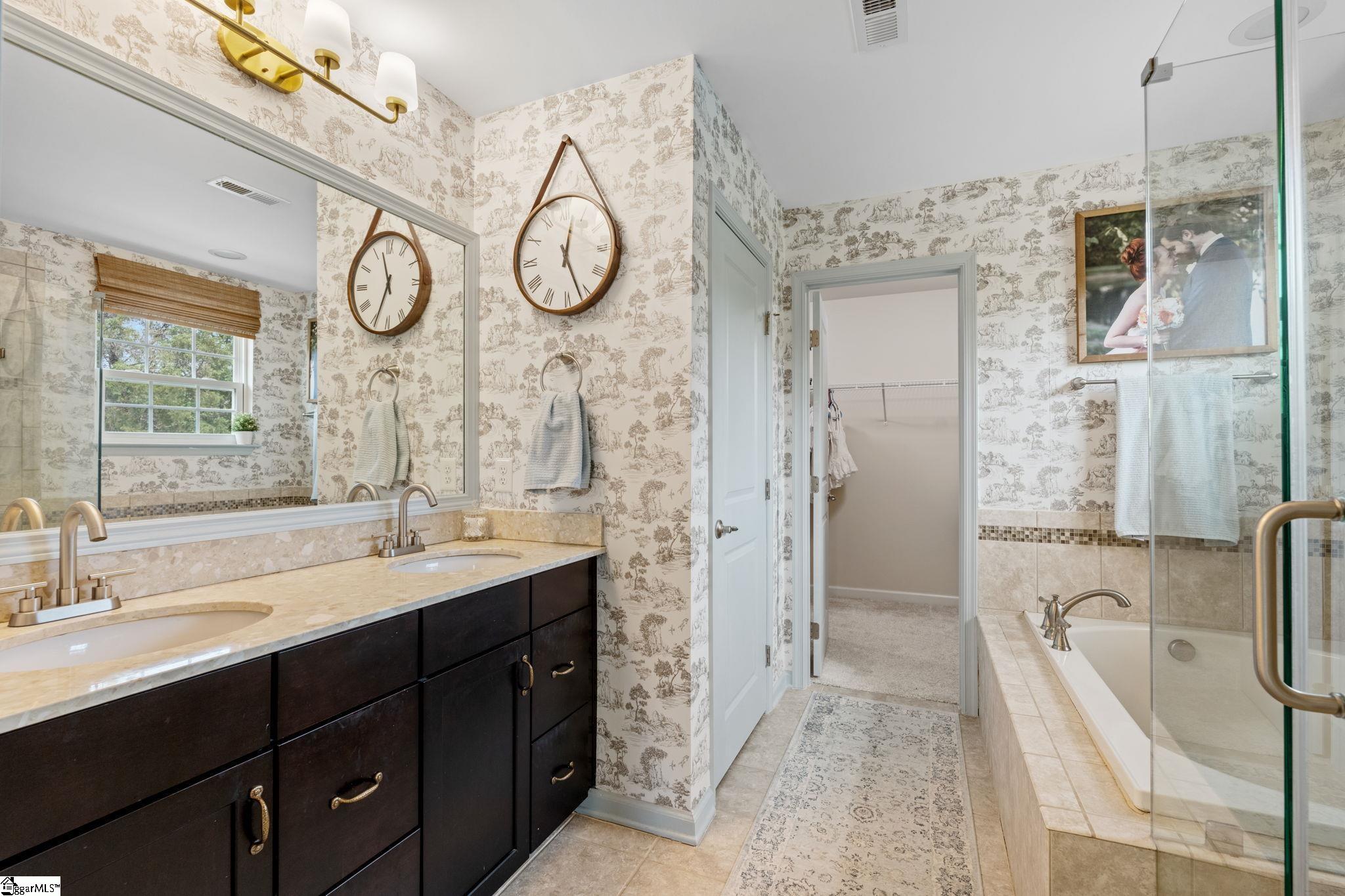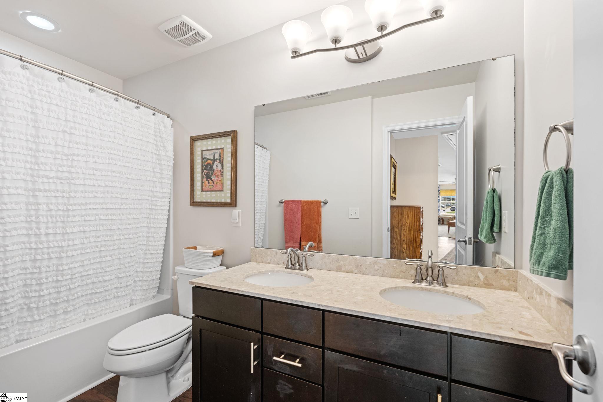Tucked away in the gated River Shoals subdivision in Simpsonville, this 4 BR 3.5 BA home boasts 3136 square feet and is positioned on a quiet street with a fully fenced yard. The curb appeal immediately greets you upon arrival, with updates and custom accents throughout this well-maintained home. The current owners have updated many of the spaces with LVP flooring that matches nicely with the engineered hardwoods that run throughout the first floor. Upon entering, glass French doors offer privacy for a perfect home office or formal living room. Hardwood floors and crown molding flow through to a spacious formal dining room, currently used as a first-floor playroom. A walk-in pantry and convenient half bath lead you into your gourmet kitchen, highlighted with a tile backsplash, gas cooktop, double ovens, under cabinet lighting and a huge island that overlooks your breakfast room, flooded on all sides with natural light. The open floor plan allows for great connectivity with family and makes entertaining a breeze. Off of the great room, you will find a flex room that is currently being used as a bedroom. The two-car garage has a two-foot extension, a utility sink, and a man door to the side yard. Retreat to your second level where you will be greeted by a large 15 x 14 loft area, also finished with new LVP flooring. The oversized primary bedroom features his and hers closets, an en-suite bathroom with double vanity, soaking tub, and frameless glass step-in shower. The upstairs is rounded out with two generously sized secondary bedrooms with a shared hall bath, a walk-in laundry room, and a fourth bedroom with its own devoted en-suite bath, perfect for overnight guests. Current owner uses this space as a home office. River Shoals is a wonderful established community, rich with amenities: community pool, neighborhood lake, playground, and clubhouse. Schedule your showing today!