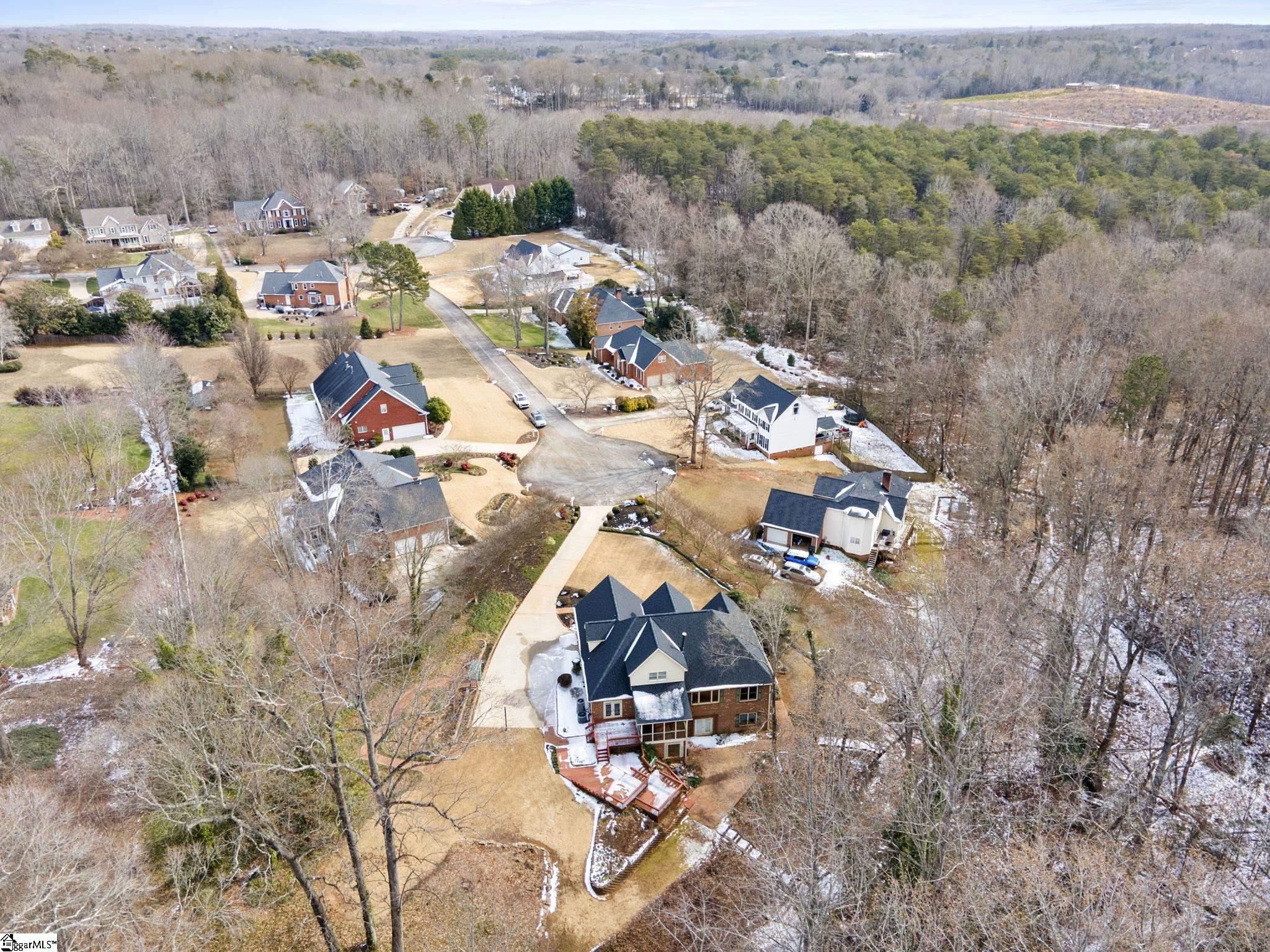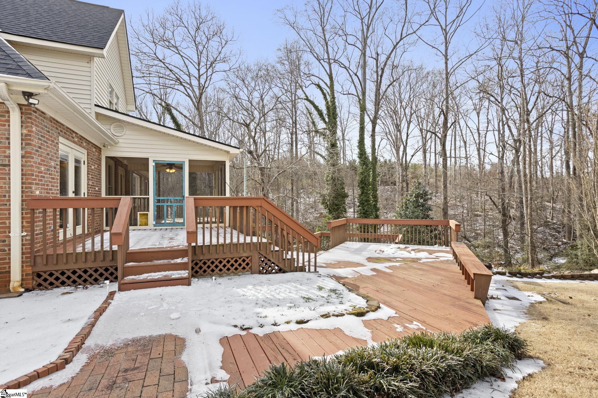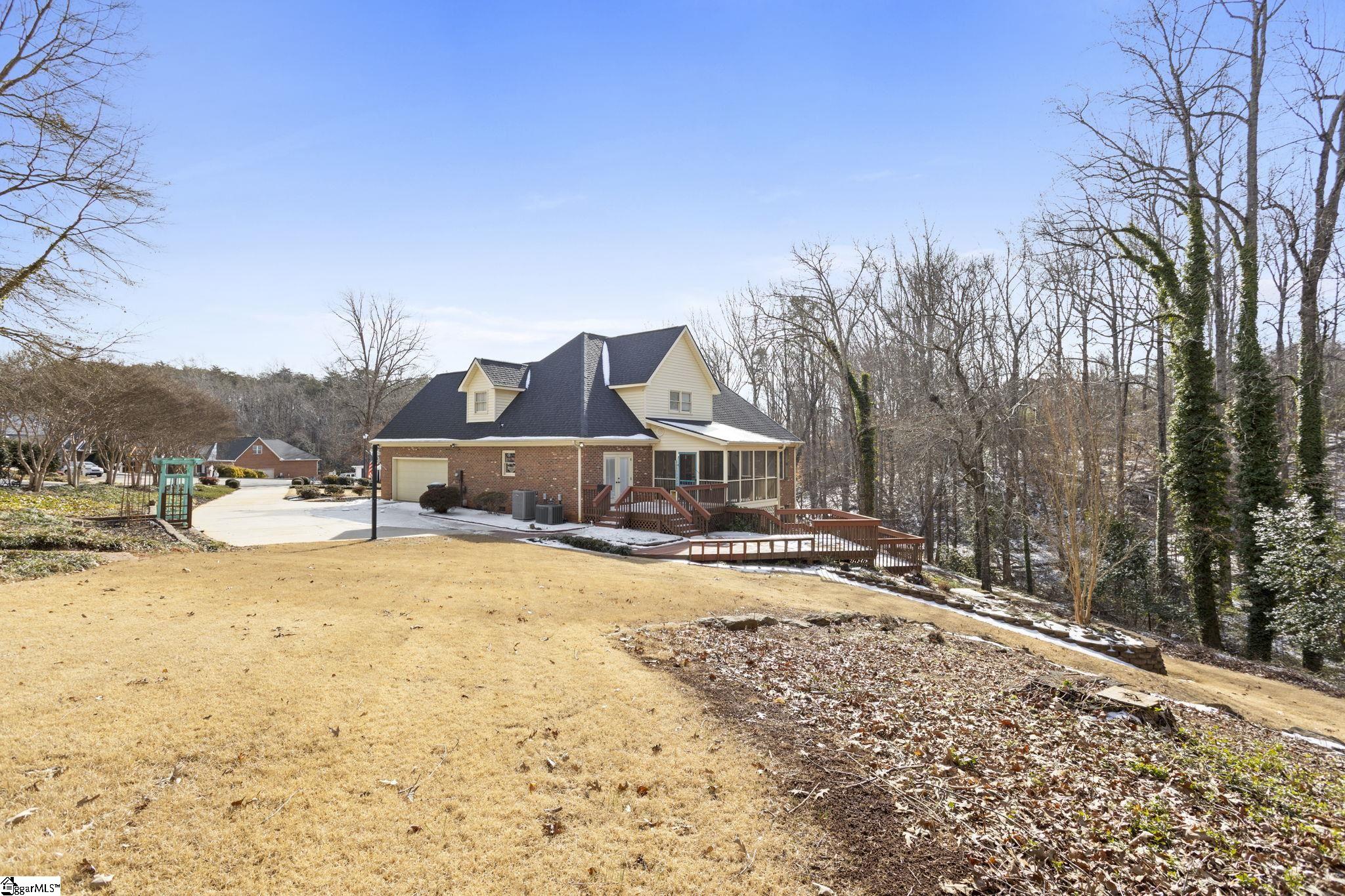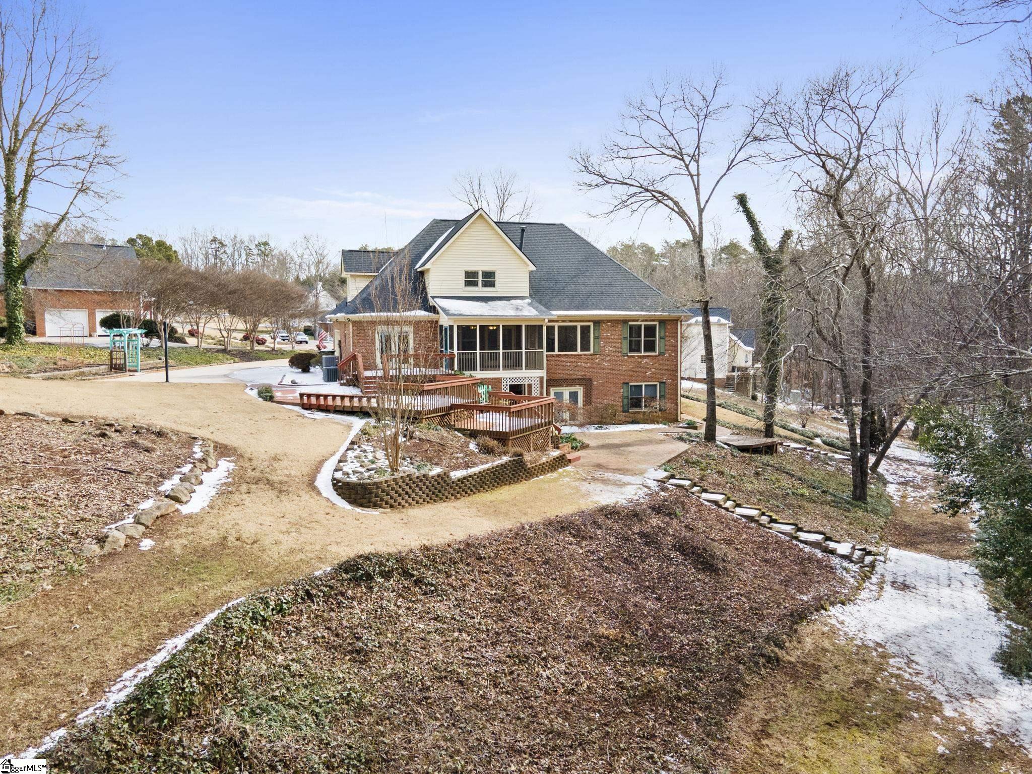 All-brick home tucked away at the end of a quiet cul-de-sac on a rare 1-acre lot in the Glen Laurel community. This well-maintained property offers privacy, mature landscaping, and multiple outdoor living spaces including a screened porch and multi-level decks. Inside, the main level features hardwood floors, fresh interior paint in select areas, and an open kitchen with granite countertops, center island with prep sink, and ample cabinet space. The kitchen flows into a comfortable keeping room with a double-sided fireplace shared with the formal living area, ideal for everyday living and entertaining. A formal dining room with butler’s pantry adds classic function and charm. The primary bedroom is on the main level with a spacious en-suite bath offering a jetted tub, separate shower, and large walk-in closet. Additional bedrooms are generously sized, most with walk-in closets. The fully finished basement expands the living space significantly and includes a kitchenette, full bathroom, den, media room, and a flexible bedroom space (closet can be added if desired). Ideal for guests, multigenerational living, or recreation. Located just minutes from Easley, shopping, dining, Ingles, and Calhoun Memorial Highway, with quick access to I-85 and an easy drive to Greenville. Glen Laurel offers neighborhood pool and tennis courts with low HOA fees. A solid home with space, privacy, and a layout that works.