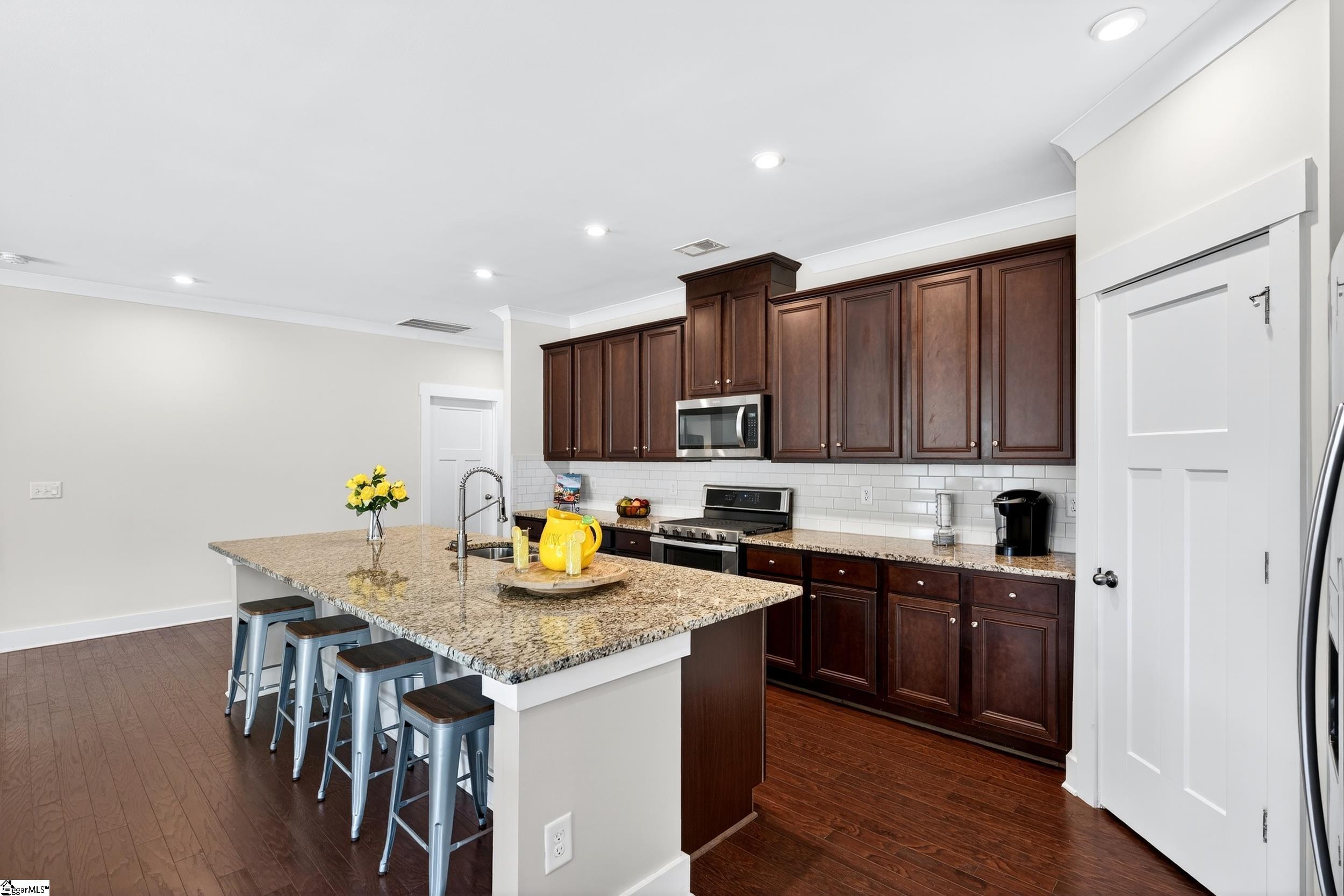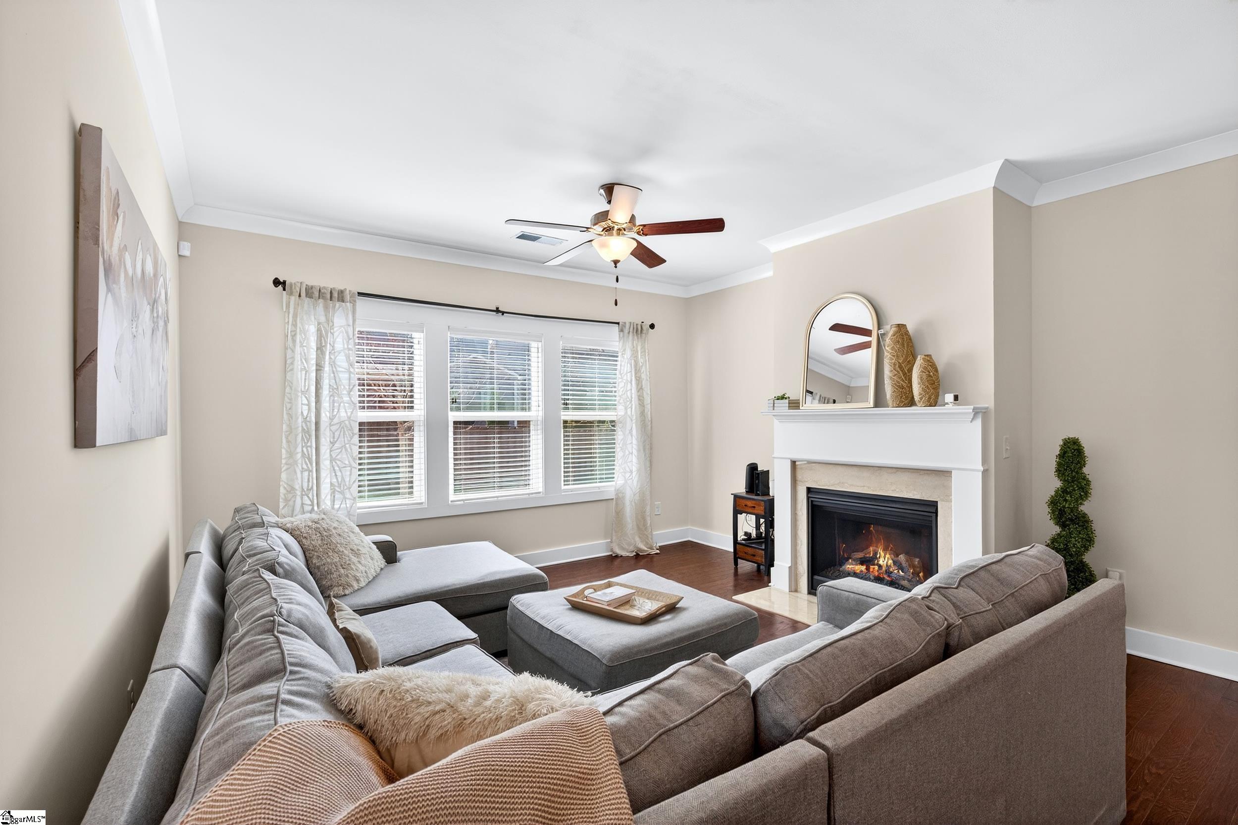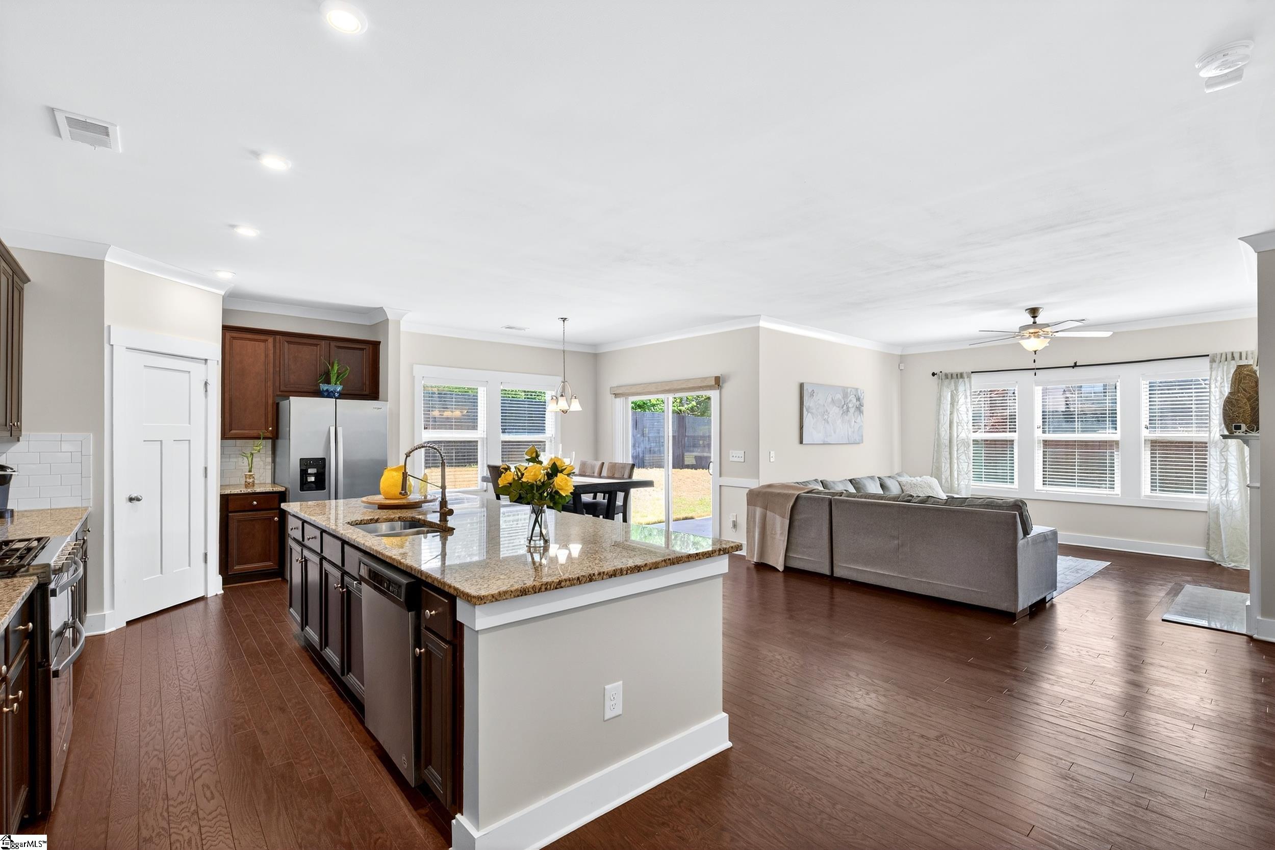 Welcome to 209 Bank Swallow Way in the sought-after Lost River subdivision! This energy-efficient ranch home with foam insulation offers an open-concept floorplan featuring wood flooring, crown molding, 9-ft ceilings, abundant natural light, and a cozy fireplace. The split-bedroom layout provides privacy, with a spacious primary suite showcasing a trey ceiling, large walk-in closet, and ensuite with dual vanities, garden tub, and separate tiled shower. The kitchen includes stainless steel appliances, recessed lighting, a walk-in pantry, and a large granite island, with an eat-in area leading to a covered patio and private, tree-lined backyard. Additional highlights include a spacious laundry room and inviting rocking chair front porch. Enjoy resort-style community amenities including a junior Olympic pool, tennis/pickleball courts, playground, pavilion, and walking trails, plus year-round neighborhood events.