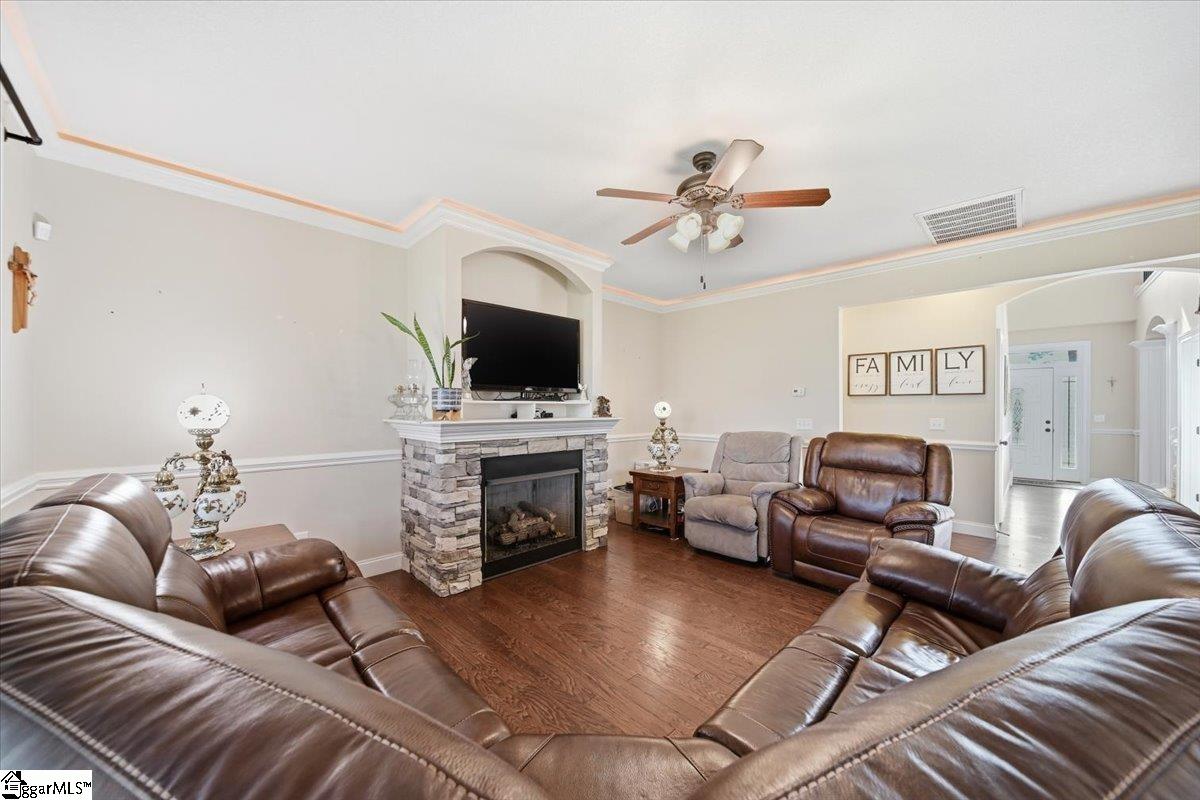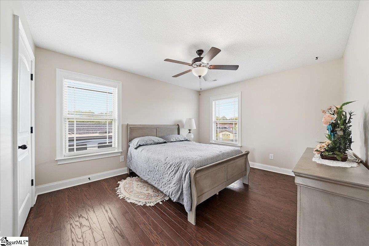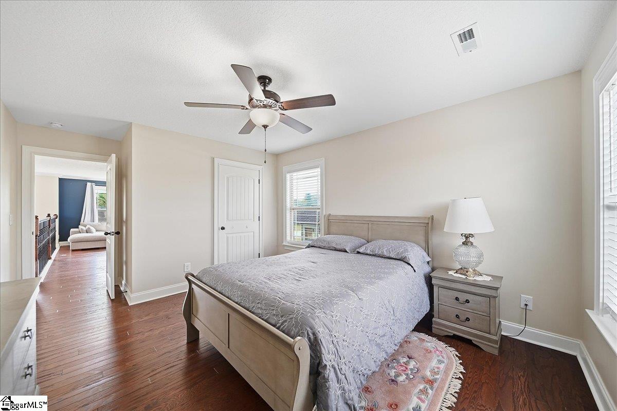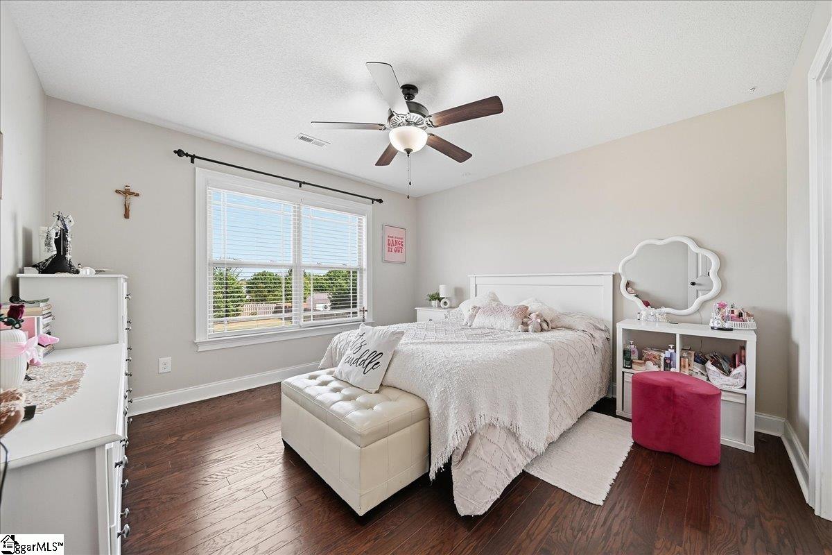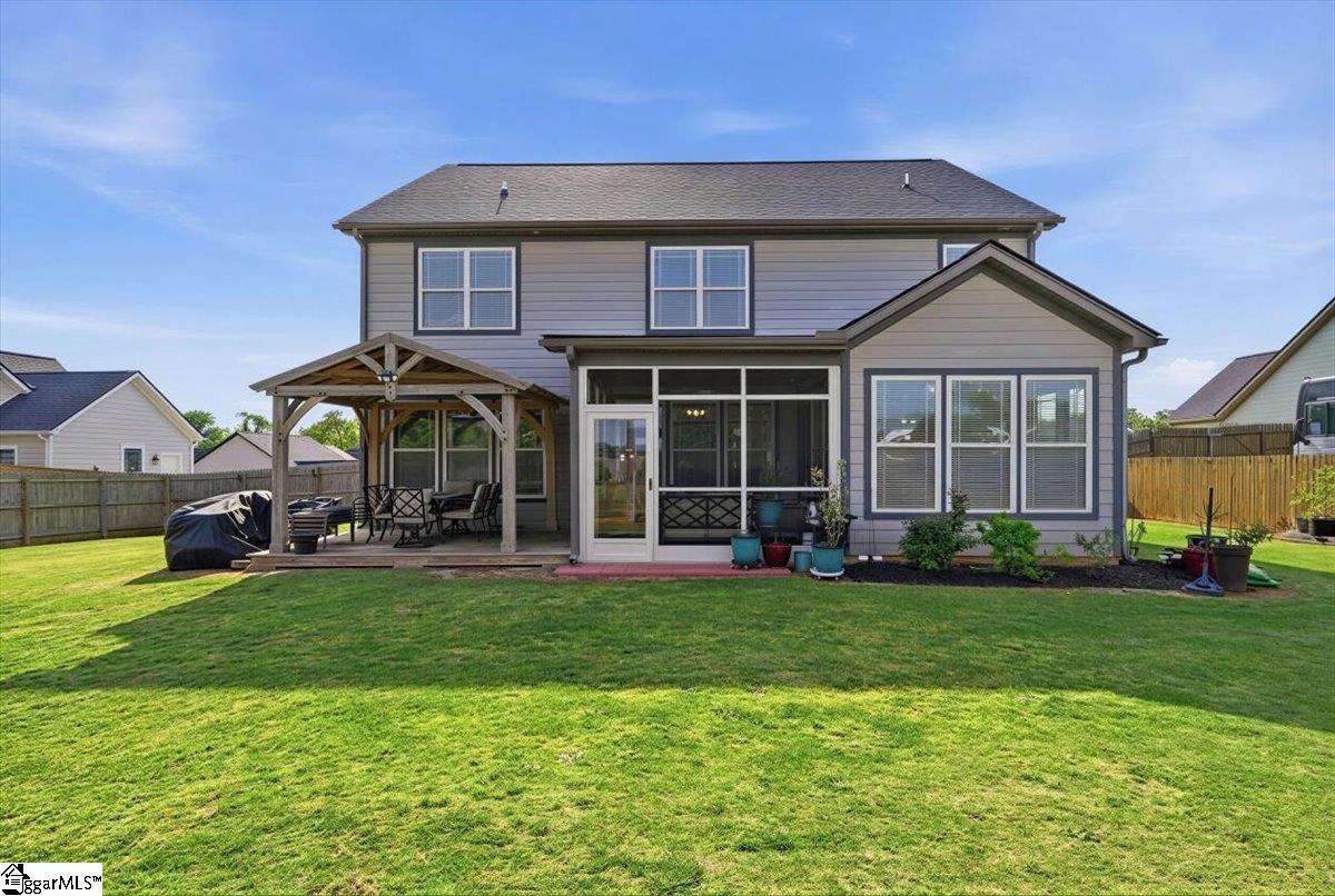 Welcome to this beautifully crafted 5-bedroom, 4.5-bath two-story home, built in 2019 and thoughtfully designed for both everyday living and entertaining. Warm wood flooring flows throughout both levels, complemented by ceramic tile in the bathrooms for a polished finish. The main-level primary suite offers a private retreat, featuring a large walk-in shower with dual shower heads, a relaxing jetted tub, double sink vanity, and a generous walk-in closet. Upstairs, you’ll find four additional bedrooms, including two with attached baths, plus a hall bath to serve the remaining rooms. A versatile loft area provides the perfect space for a home office, hobby room, media area, or flexible-use space. The main level is designed for gathering, with an eat-in kitchen featuring granite countertops, a dedicated dining room, and a large living area anchored by a gas fireplace. Additional features include a convenient half bath, walk-in laundry room, and a sunroom that opens to a screened porch—creating seamless indoor-outdoor living. Step outside to enjoy the extended patio with attached gazebo, all overlooking a level .60-acre lot complete with landscape lighting and an in-ground sprinkler system all within a quiet, established community. This home offers a blend of space, comfort, and thoughtful details—ready to accommodate a variety of lifestyles.