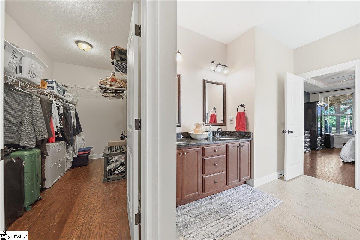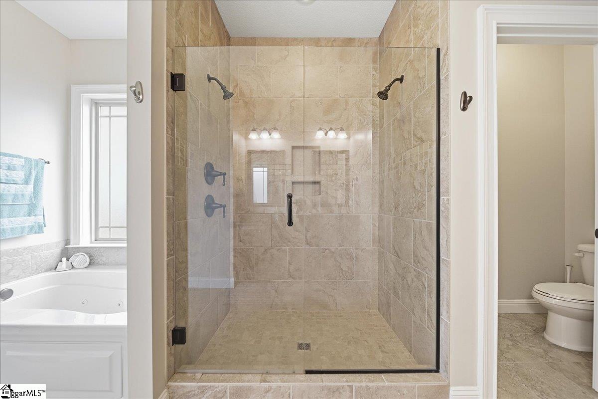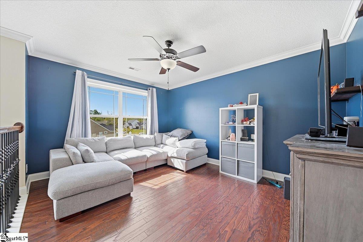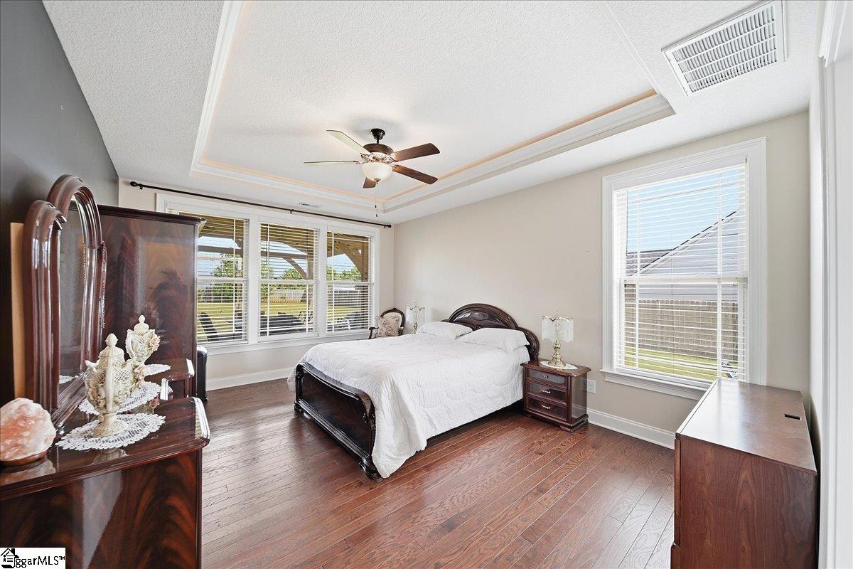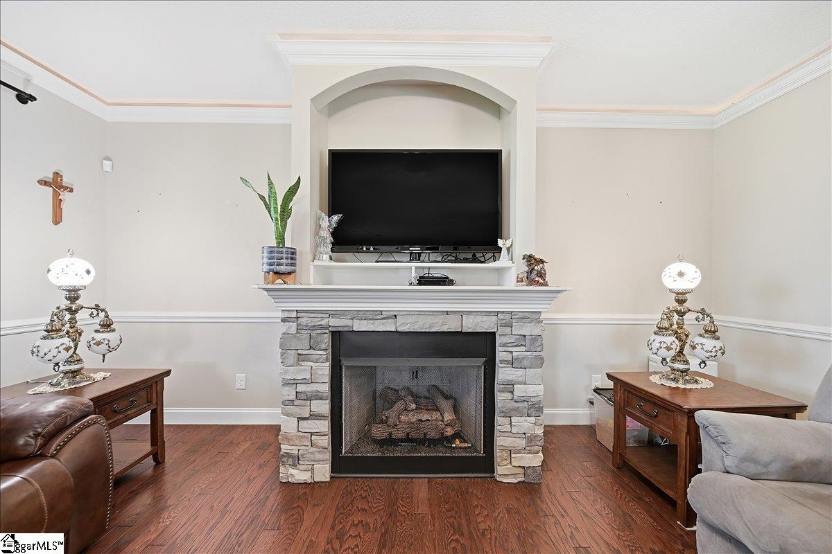 Welcome to this beautifully crafted 5-bedroom, 4.5-bath two-story home, built in 2019 and thoughtfully designed for both everyday living and entertaining. Warm wood flooring flows throughout both levels, complemented by ceramic tile in the bathrooms for a polished finish. The main-level primary suite offers a private retreat, featuring a large walk-in shower with dual shower heads, a relaxing jetted tub, double sink vanity, and a generous walk-in closet. Upstairs, you’ll find four additional bedrooms, including two with attached baths, plus a hall bath to serve the remaining rooms. A versatile loft area provides the perfect space for a home office, hobby room, media area, or flexible-use space. The main level is designed for gathering, with an eat-in kitchen featuring granite countertops, a dedicated dining room, and a large living area anchored by a gas fireplace. Additional features include a convenient half bath, walk-in laundry room, and a sunroom that opens to a screened porch—creating seamless indoor-outdoor living. Step outside to enjoy the extended patio with attached gazebo, all overlooking a level .60-acre lot complete with landscape lighting and an in-ground sprinkler system all within a quiet, established community. This home offers a blend of space, comfort, and thoughtful details—ready to accommodate a variety of lifestyles.