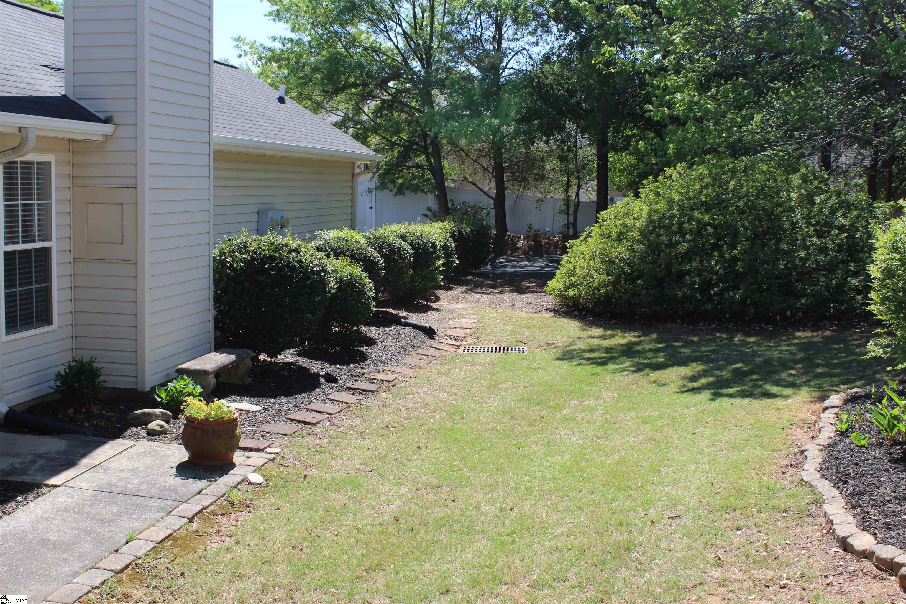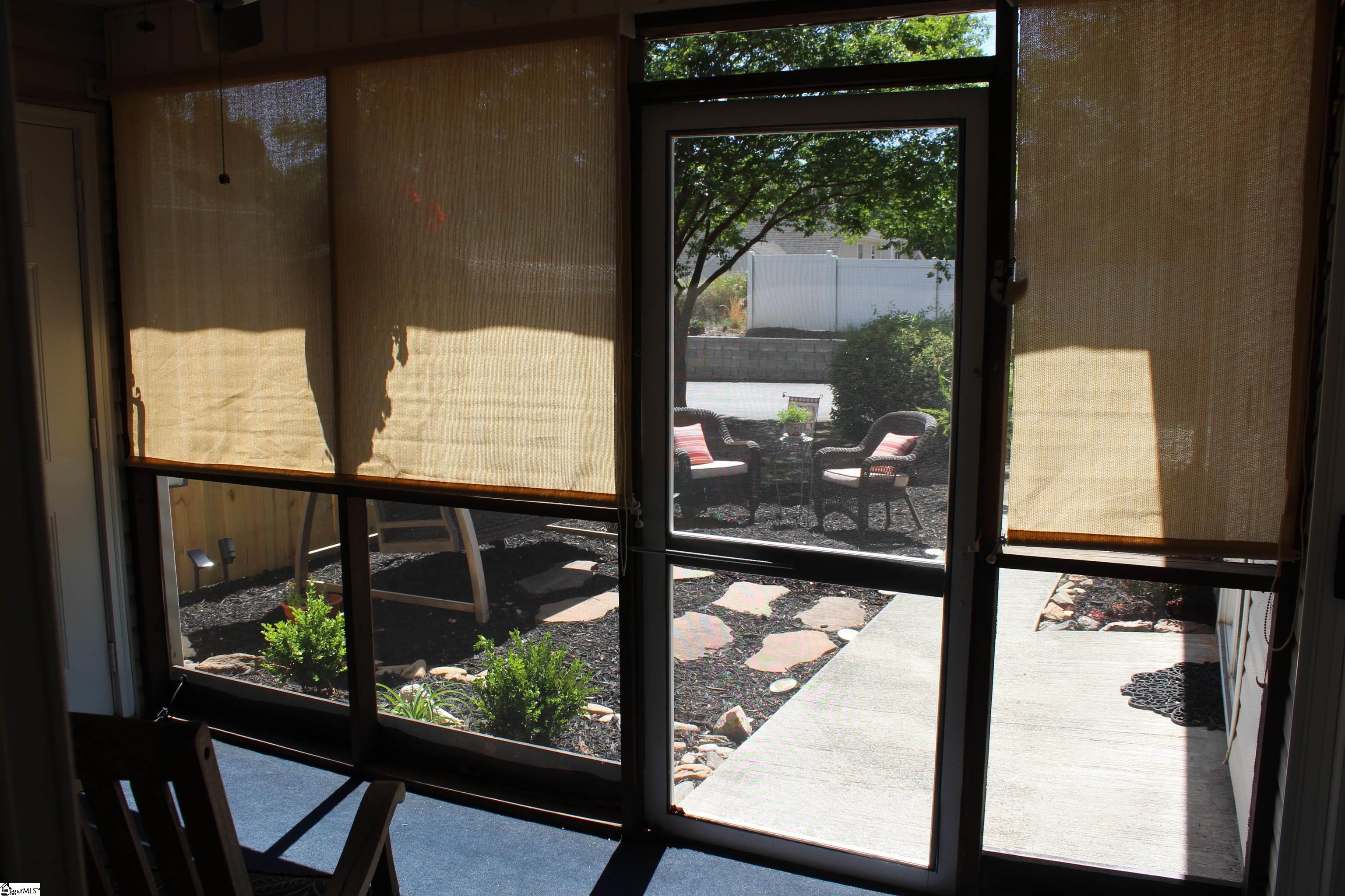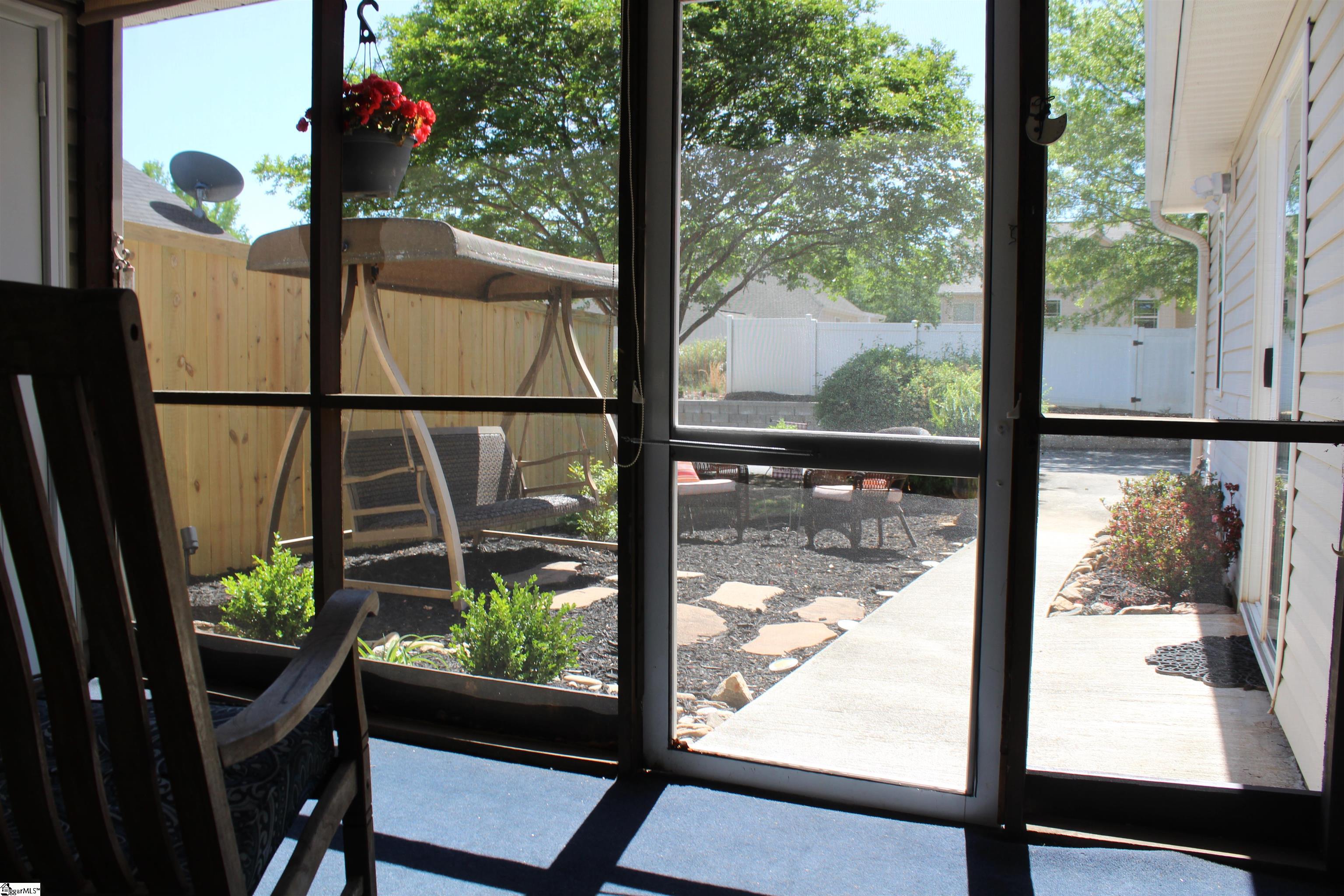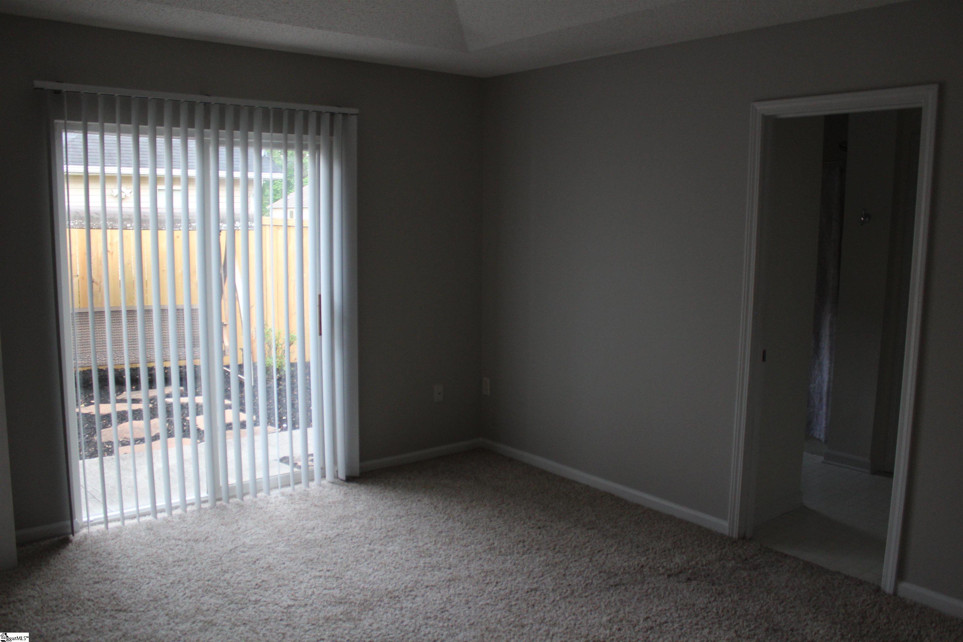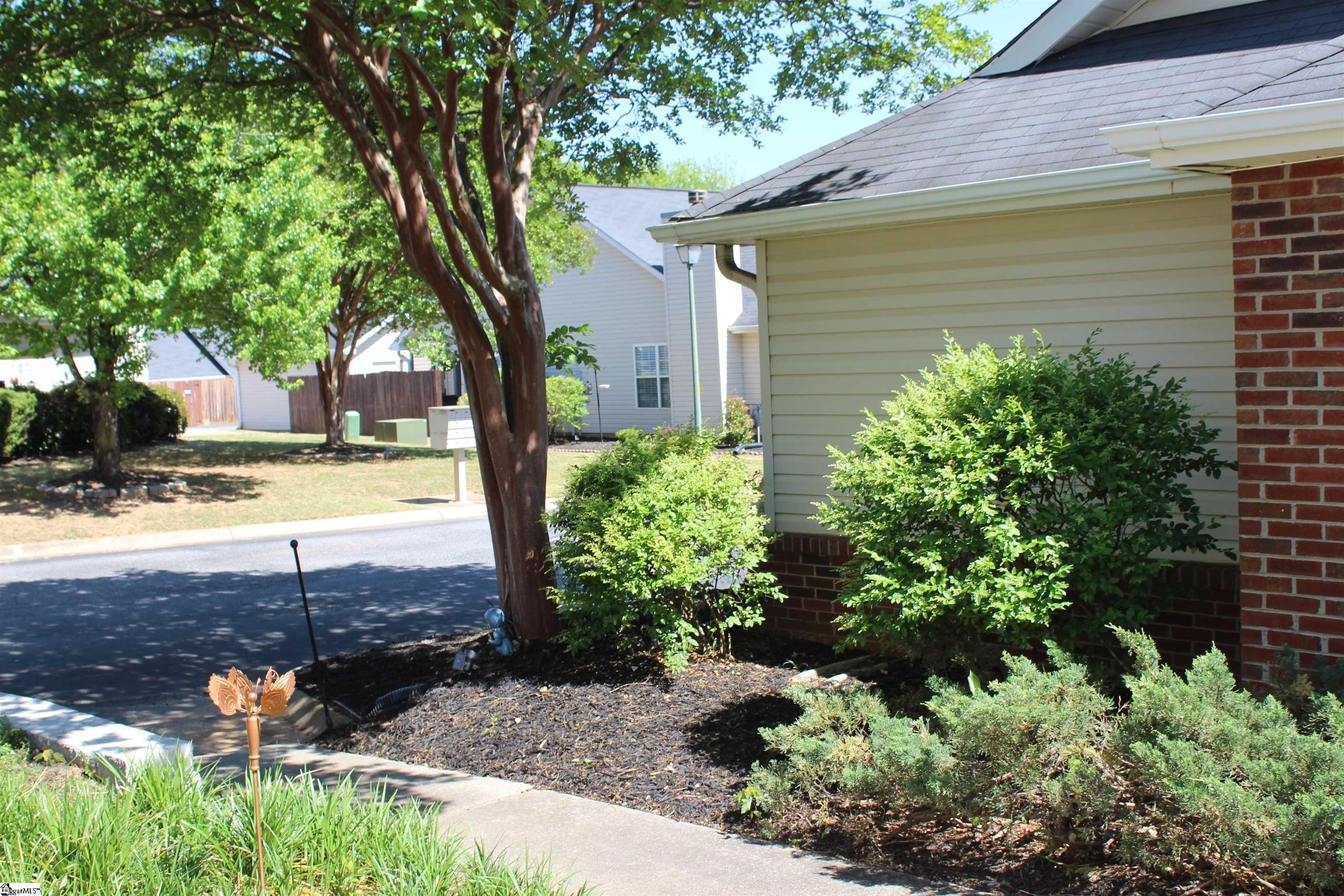 Rare one level townhome located in The Townes of Woodruff Park, located in the popular Five Forks area of Woodruff Road. This townhome is in superb condition with freshly painted walls and trim, granite counter tops, stainless appliances, updated fixtures. This home has ample space, boasting a split floor plan with 3 bedrooms, 2 full baths and open dining area adjacent to the family/living room. There are 2” blinds throughout as well as three sliding glass doors to allow lots of light to enhance the openness of the layout. Living area has a wood burning fireplace equipped with gas starter which can easily be connected to gas logs if desired. The screened in patio overlooks a perfect sized, private back yard sitting area with yard swing, shrubs and landscape lighting to enhance the beauty. One of the best lots in the community offering a large 2 car, private paved driveway at the rear of the home which backs up to a quiet street. In addition, there are two guest parking spots in front of unit which can be utilized. This is an end unit bordering a large common area giving you more privacy and space to roam. This townhome is easily accessible, all one level with no stairs inside or outside. Great location, quiet, well kept, gated community with mature trees and landscaping. Book your appointment today to view this unique townhome and make it your own!