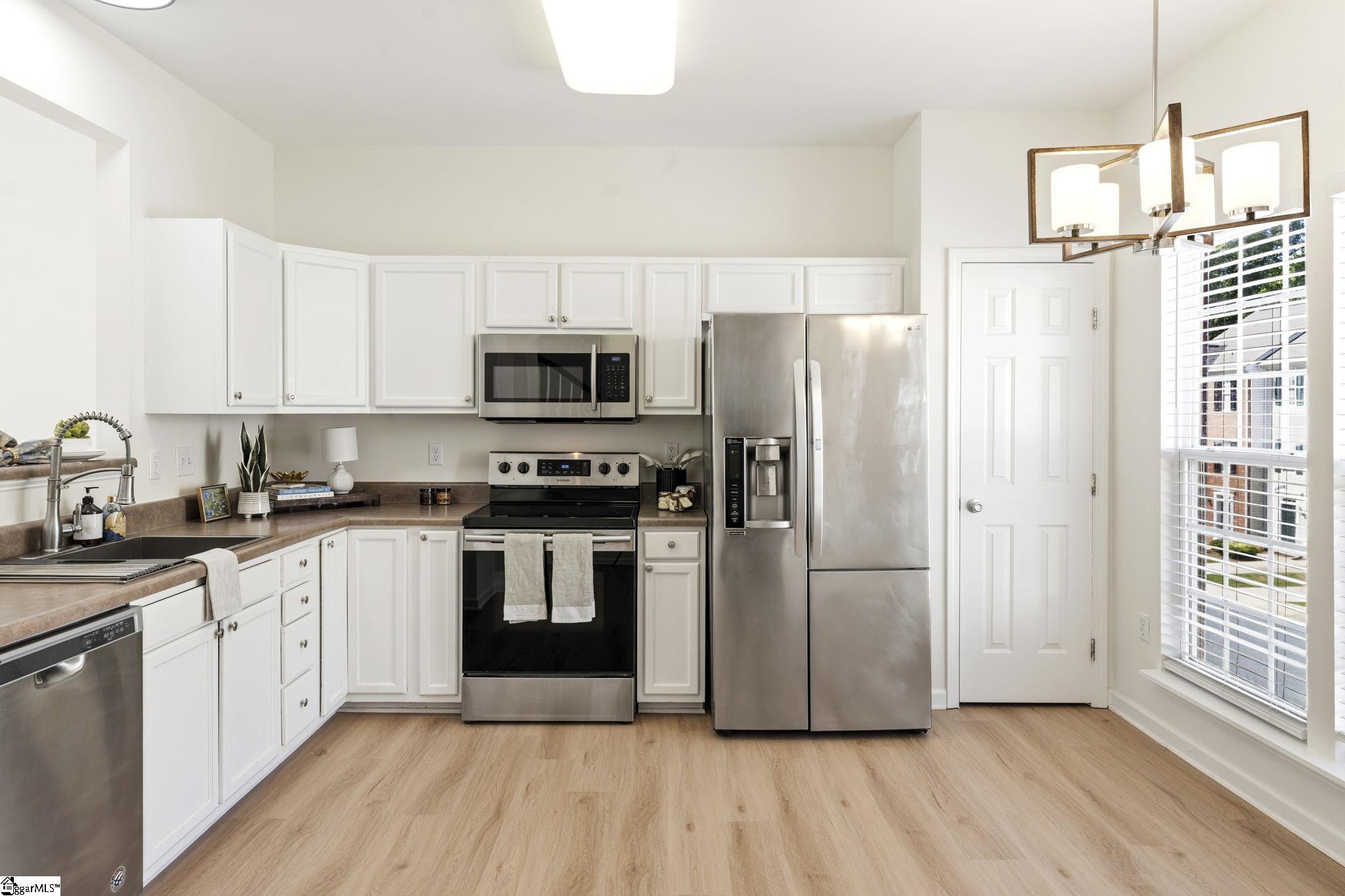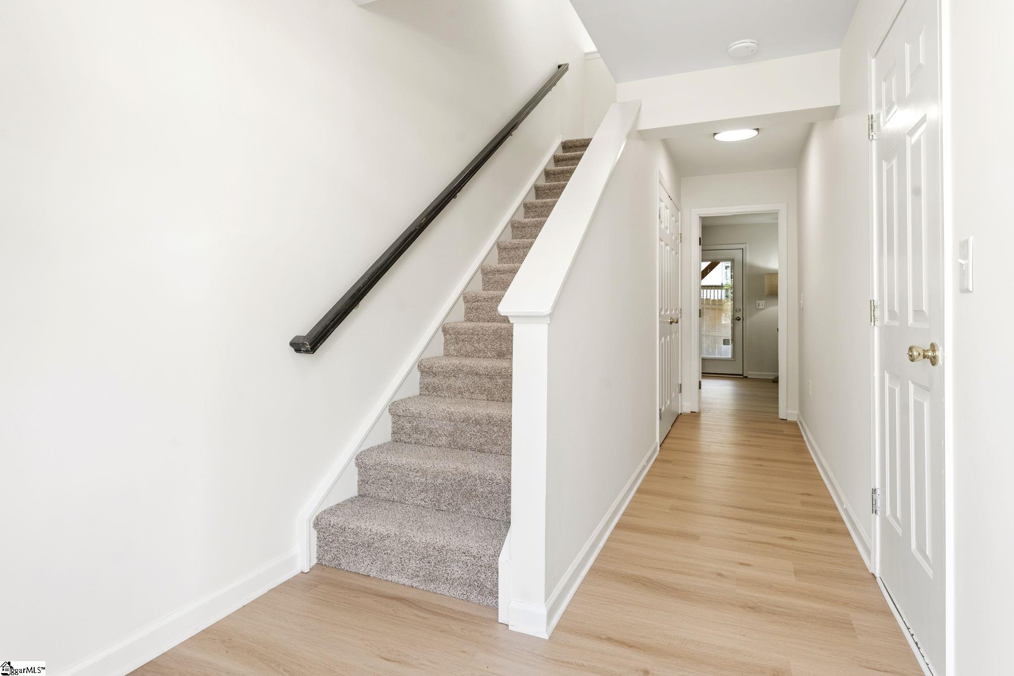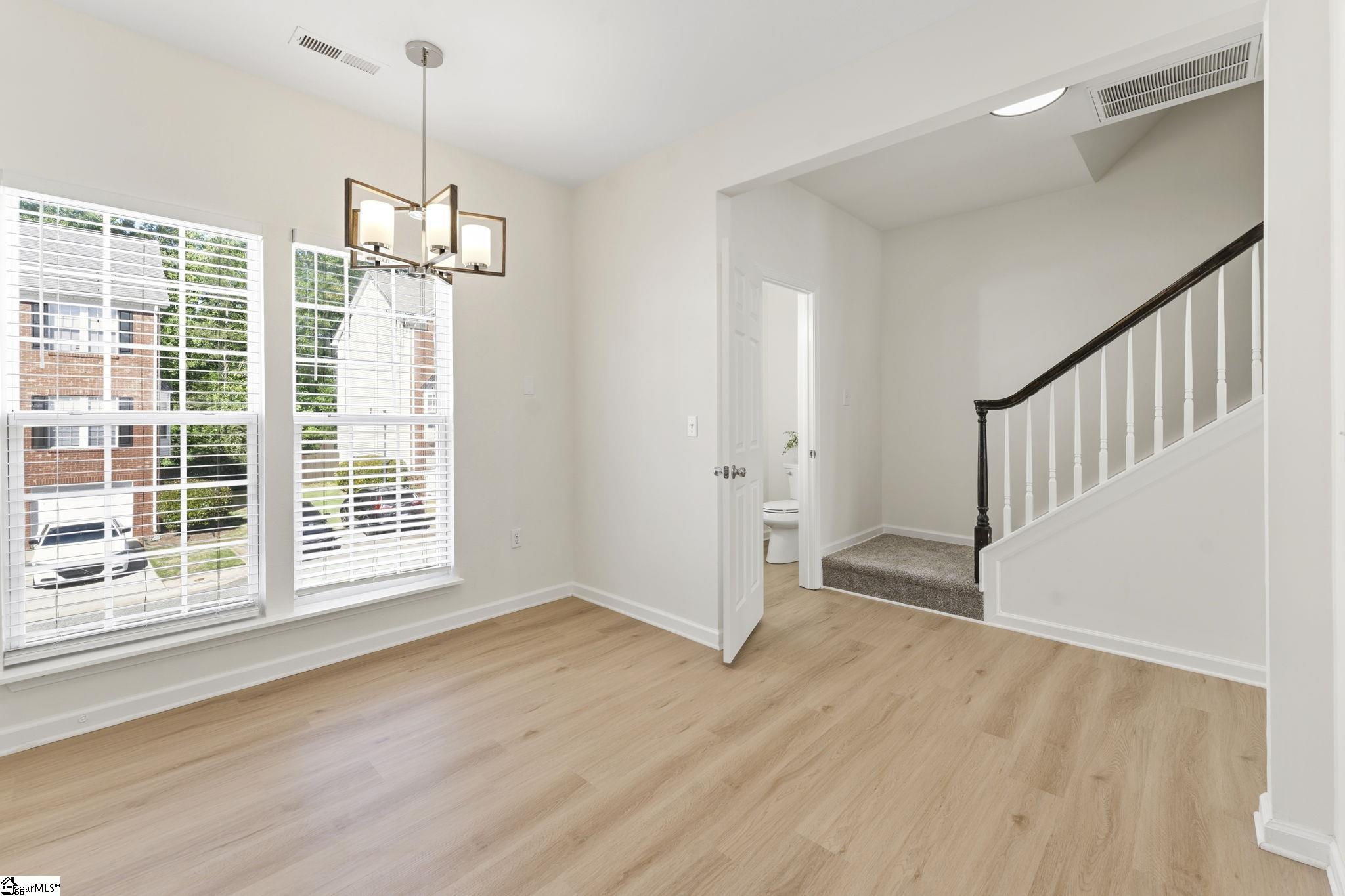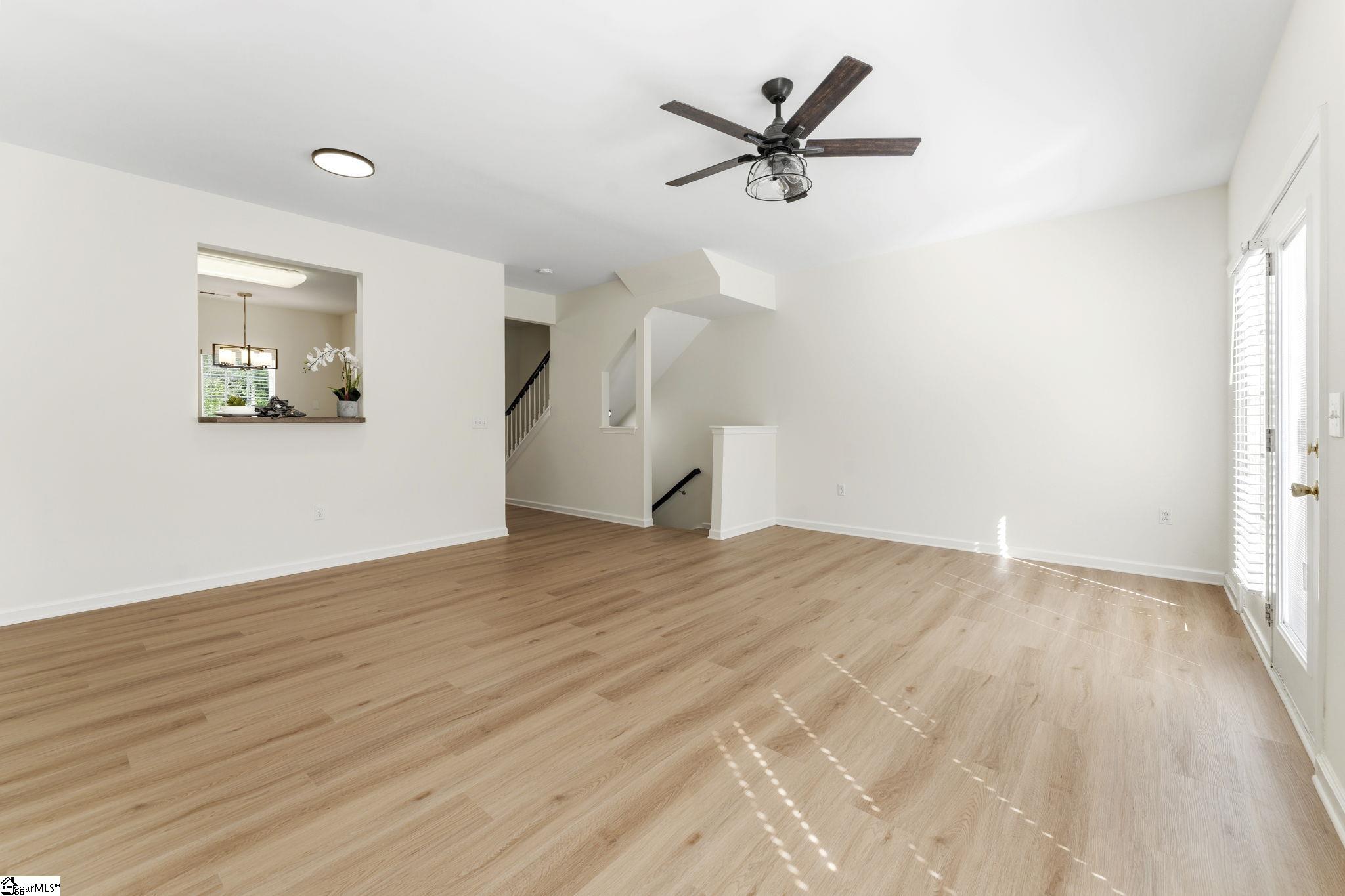 Welcome to this stunning, move-in ready townhome in a prime location near shopping, dining, Woodruff Road, I-385, I-85, and downtown Greenville. Offering both convenience and lifestyle, this spacious home features 3 bedrooms, 1.5 bathrooms, and a garage for added storage and functionality. Brand new, never-lived-on luxury vinyl plank flooring and carpet pair beautifully with fresh neutral paint throughout. The flexible lower level includes a bedroom and private patio, making it ideal for guests, teens, or multi-generational living. The bright eat-in kitchen features a large window, neutral cabinetry, and a welcoming feel. Adjacent to the kitchen, the spacious family room is perfect for entertaining and is enhanced by 9-foot ceilings that create an open, airy atmosphere. Step outside to the deck for a peaceful place to relax and unwind. Enjoy exceptional access to nearby lifestyle amenities, including BridgeWay Station for dining, entertainment, and events, as well as the growing amenities along North Main and Mauldin City Center, including coffee shops, Publix, restaurants, and everyday conveniences just minutes away. Zoned for sought-after Greenville County schools, this beautiful townhome offers the perfect blend of comfort, connectivity, and location.