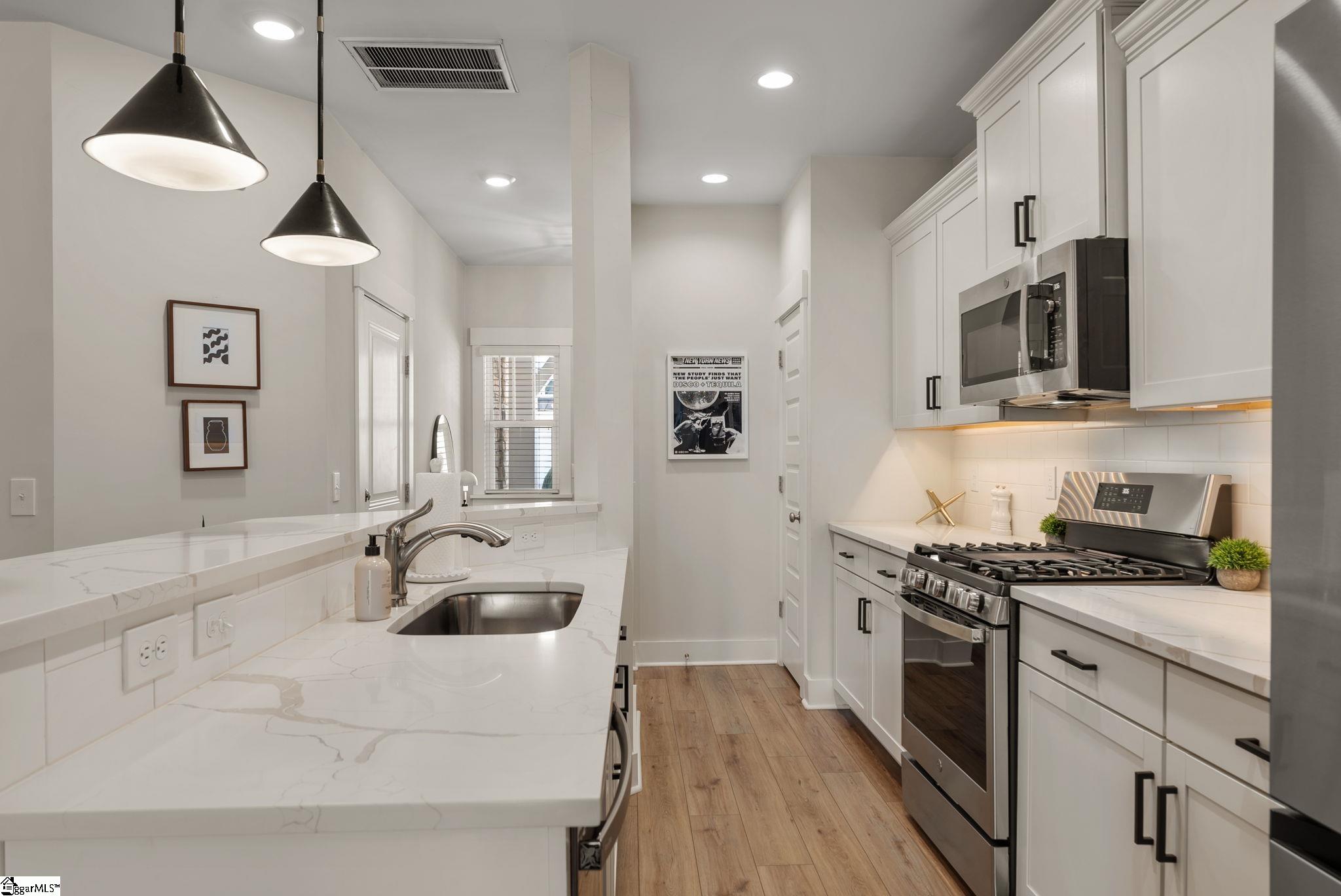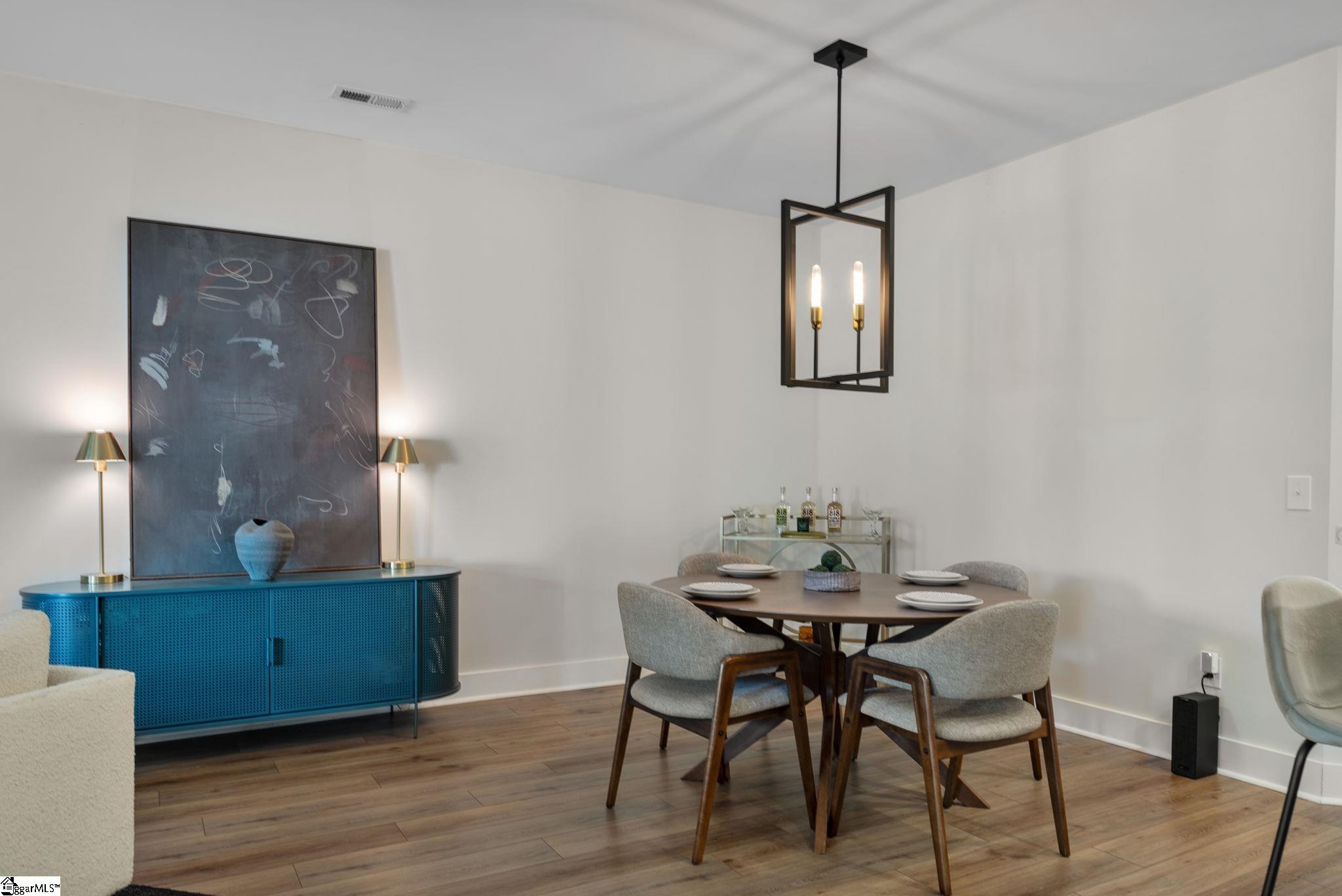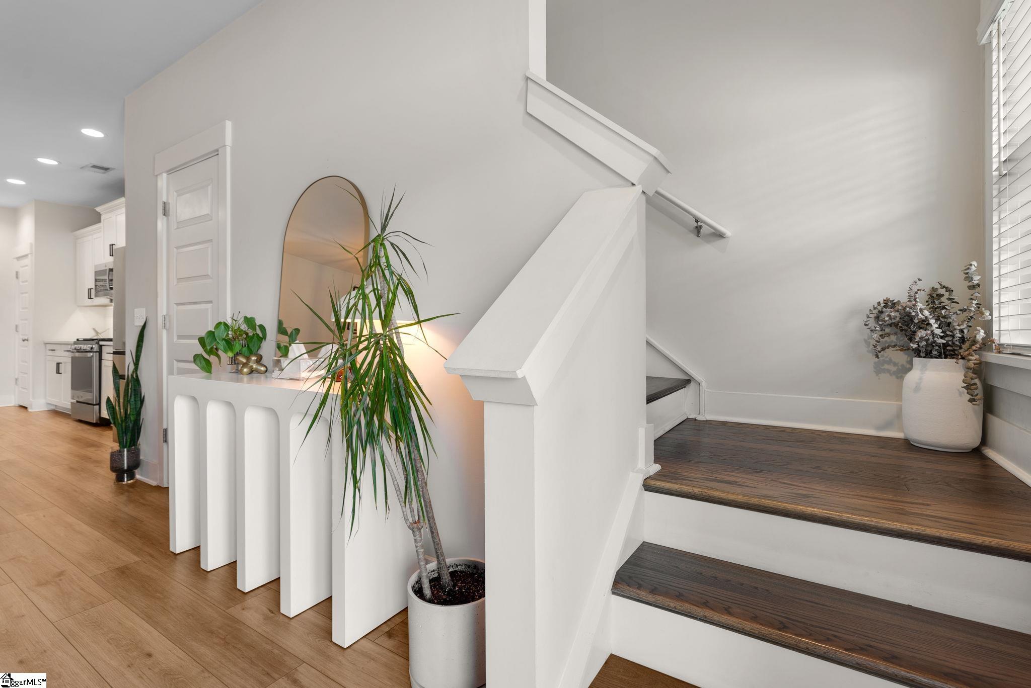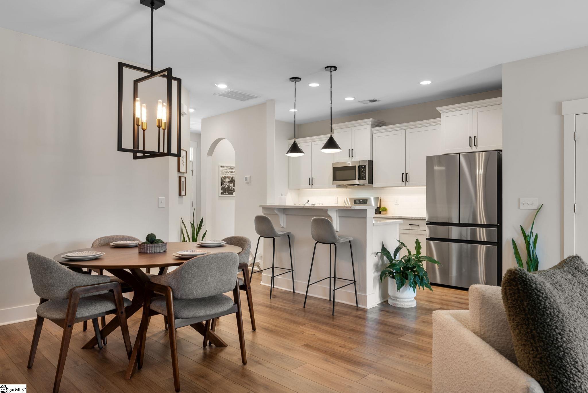 This immaculate town home combines elegance and low-maintenance living all into one. It is conveniently located within 5 minutes of Woodruff Road shops and restaurants as well as being minutes to all of the charm and lifestyle that downtown Greenville has to offer. This home features hardwood stairs, LVP flooring on main level and hallway on second level, upgraded craftsman style trim and designer lighting. Quartz kitchen countertops, under-cabinet lighting, stainless steel appliances and gas stove/oven complete this well-appointed kitchen. From the living room, walk out onto your covered 17 ft x 6 ft covered patio perfect for outdoor entertaining and with a 4 ft x 5 ft storage shed to the side. Retreat to the master suite and step out onto your 21 ft x 5 ft covered balcony which is perfect for relaxing or having morning coffee. The master bath has a large walk-in tile shower and tile flooring which leads to the spacious walk-in closet. Come see this beautifully staged well appointed home today and make it yours before it is gone!