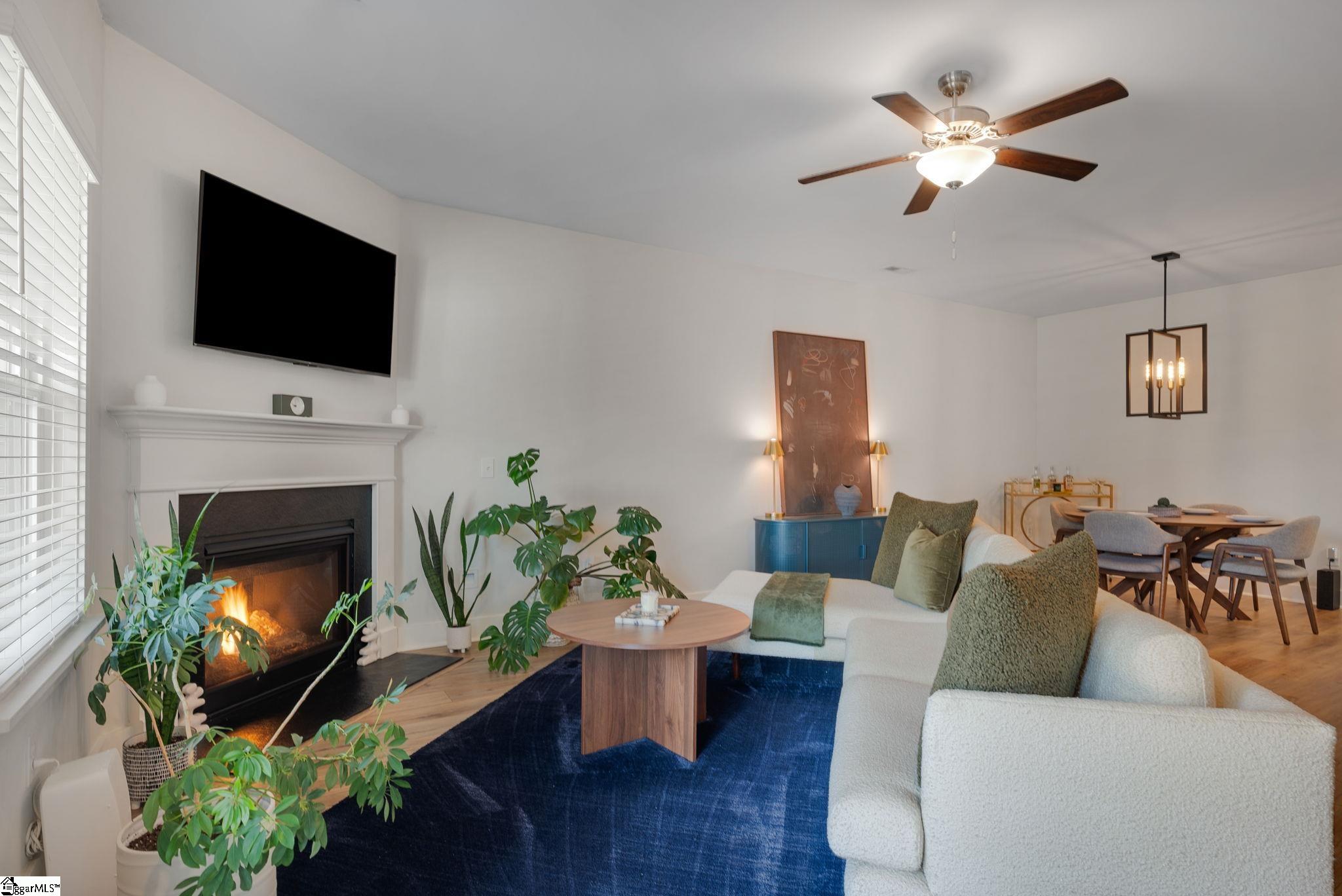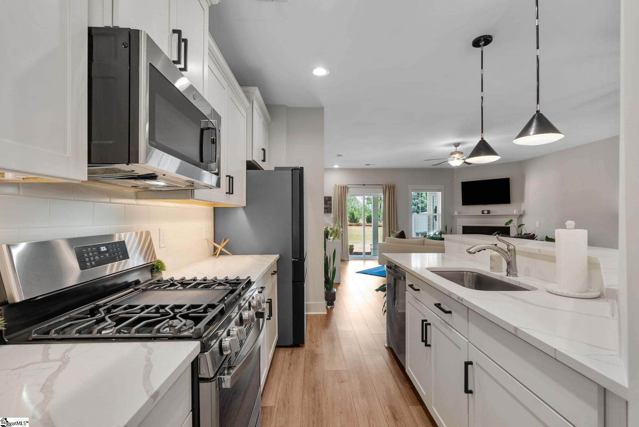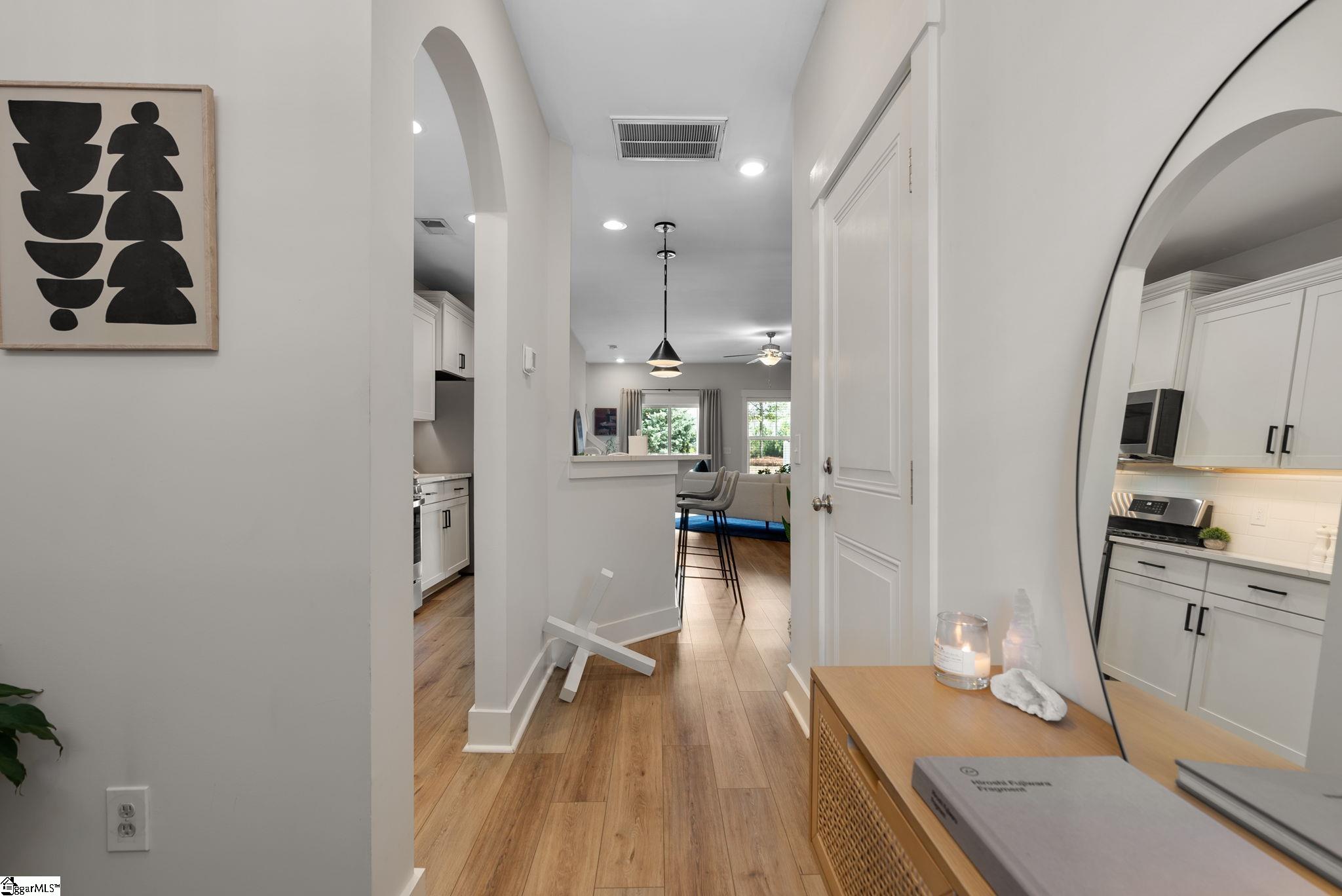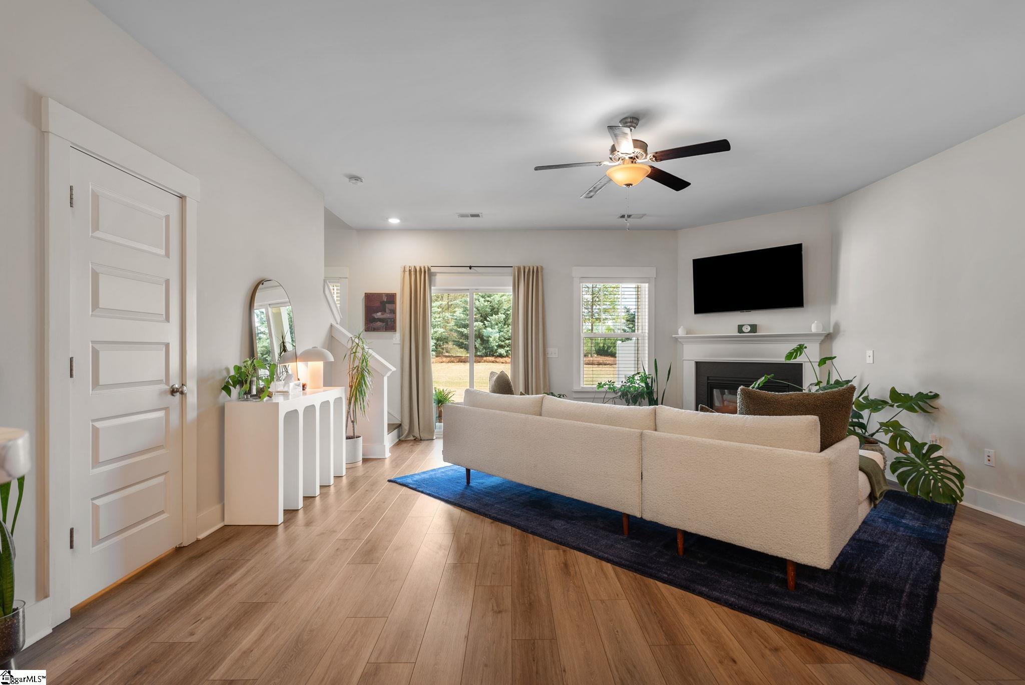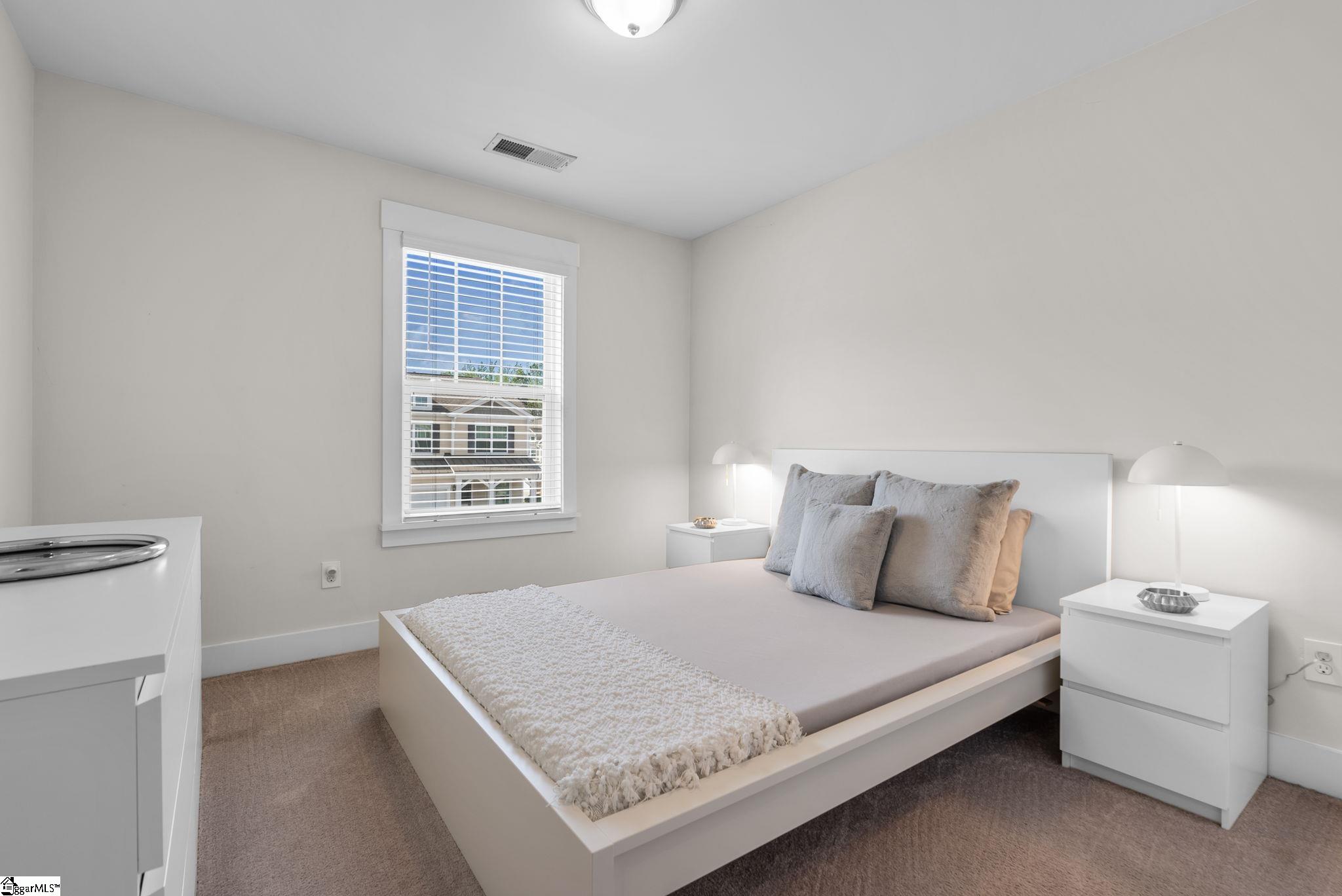 This immaculate town home combines elegance and low-maintenance living all into one. It is conveniently located within 5 minutes of Woodruff Road shops and restaurants as well as being minutes to all of the charm and lifestyle that downtown Greenville has to offer. This home features hardwood stairs, LVP flooring on main level and hallway on second level, upgraded craftsman style trim and designer lighting. Quartz kitchen countertops, under-cabinet lighting, stainless steel appliances and gas stove/oven complete this well-appointed kitchen. From the living room, walk out onto your covered 17 ft x 6 ft covered patio perfect for outdoor entertaining and with a 4 ft x 5 ft storage shed to the side. Retreat to the master suite and step out onto your 21 ft x 5 ft covered balcony which is perfect for relaxing or having morning coffee. The master bath has a large walk-in tile shower and tile flooring which leads to the spacious walk-in closet. Come see this beautifully staged well appointed home today and make it yours before it is gone!