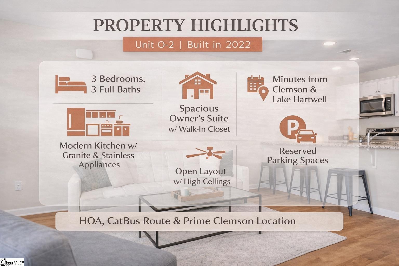 Welcome to 235 O-2 Pendleton Road, Clemson, SC—just 1 mile from Clemson University and minutes from Lake Hartwell. This modern townhome is an ideal fit for a primary residence, short-term rental, or student housing investment. Featuring 3 bedrooms, each with its own private full bath, this home is thoughtfully designed for both comfort and functionality. Every suite is spacious enough to accommodate a king or queen bed and desk, while the owner’s suite offers additional room for a sitting area and includes a walk-in closet. The kitchen features granite countertops and newer stainless steel appliances, opening to a bright, airy layout with high ceilings and updated finishes that elevate the home at this price point. One bedroom is conveniently located on the main level, with two additional private suites upstairs. The property includes assigned parking, and the flexible layout allows for easy leasing by the bedroom – making it ideal for students or professionals alike. Whether you’re looking to enjoy the Clemson lifestyle or add a strong investment to your portfolio, 235 Pendleton Road O2 is ready for you. The HOA includes grounds maintenance, trash service, roof and exterior insurance, parking lot lighting, and two reserved parking spaces. The community is also located on the CatBus route for easy access to campus. Zoned for 2 non-related occupants.