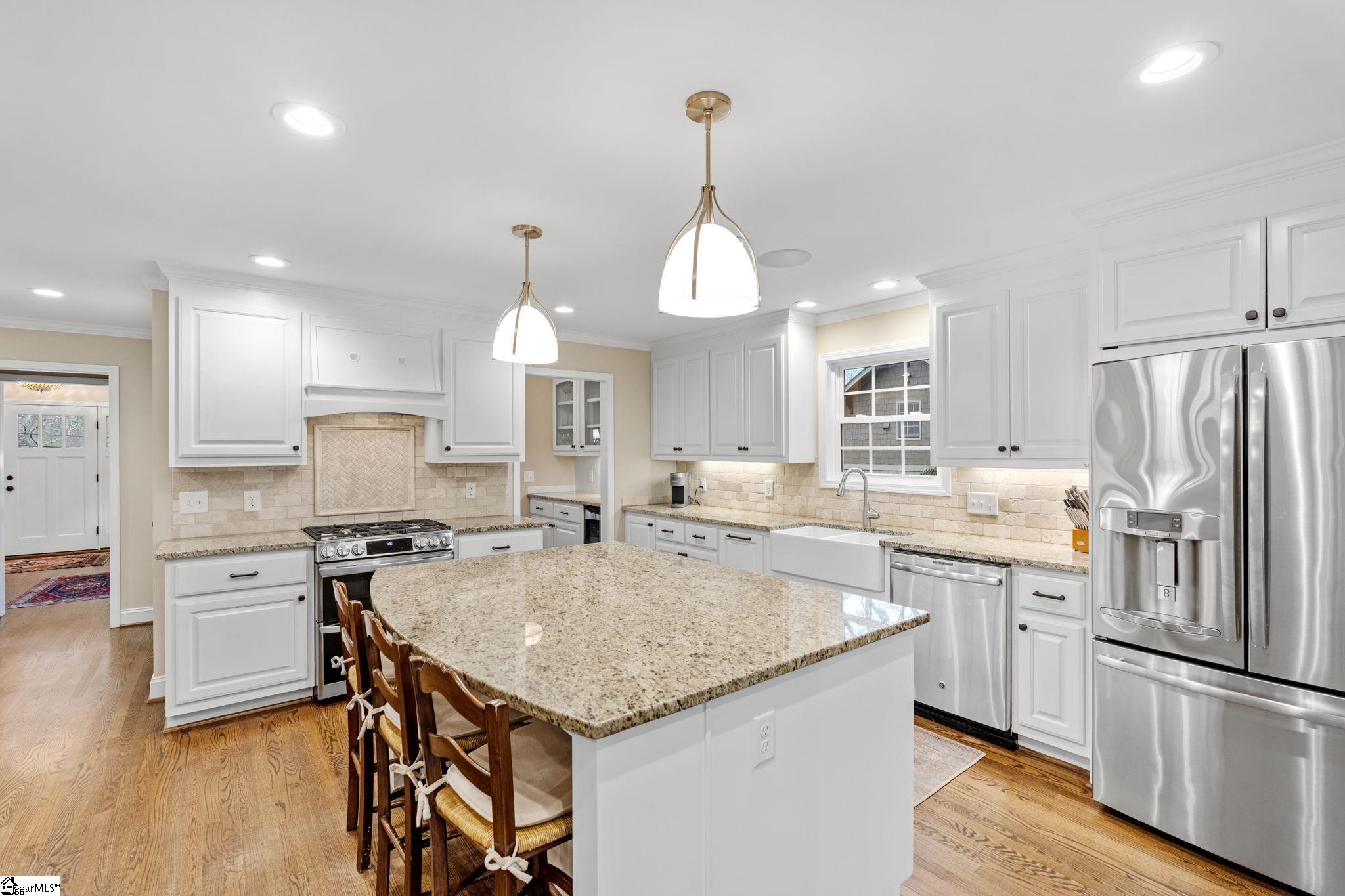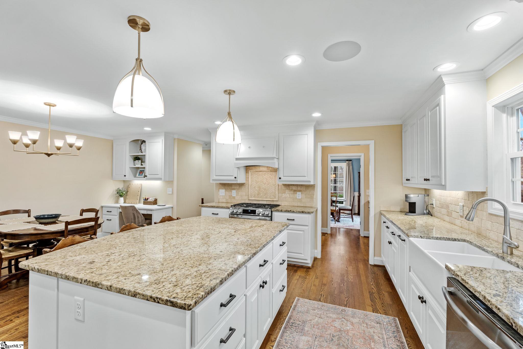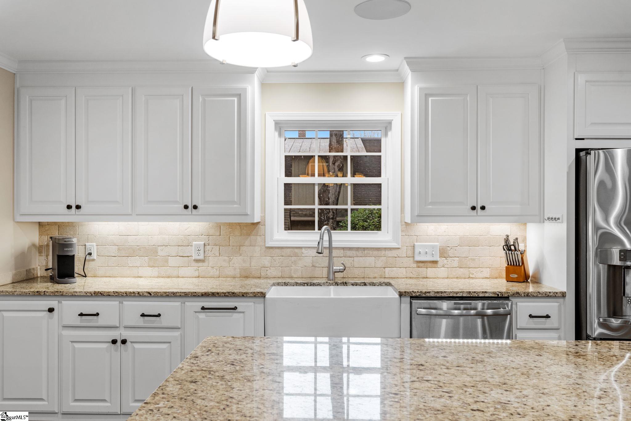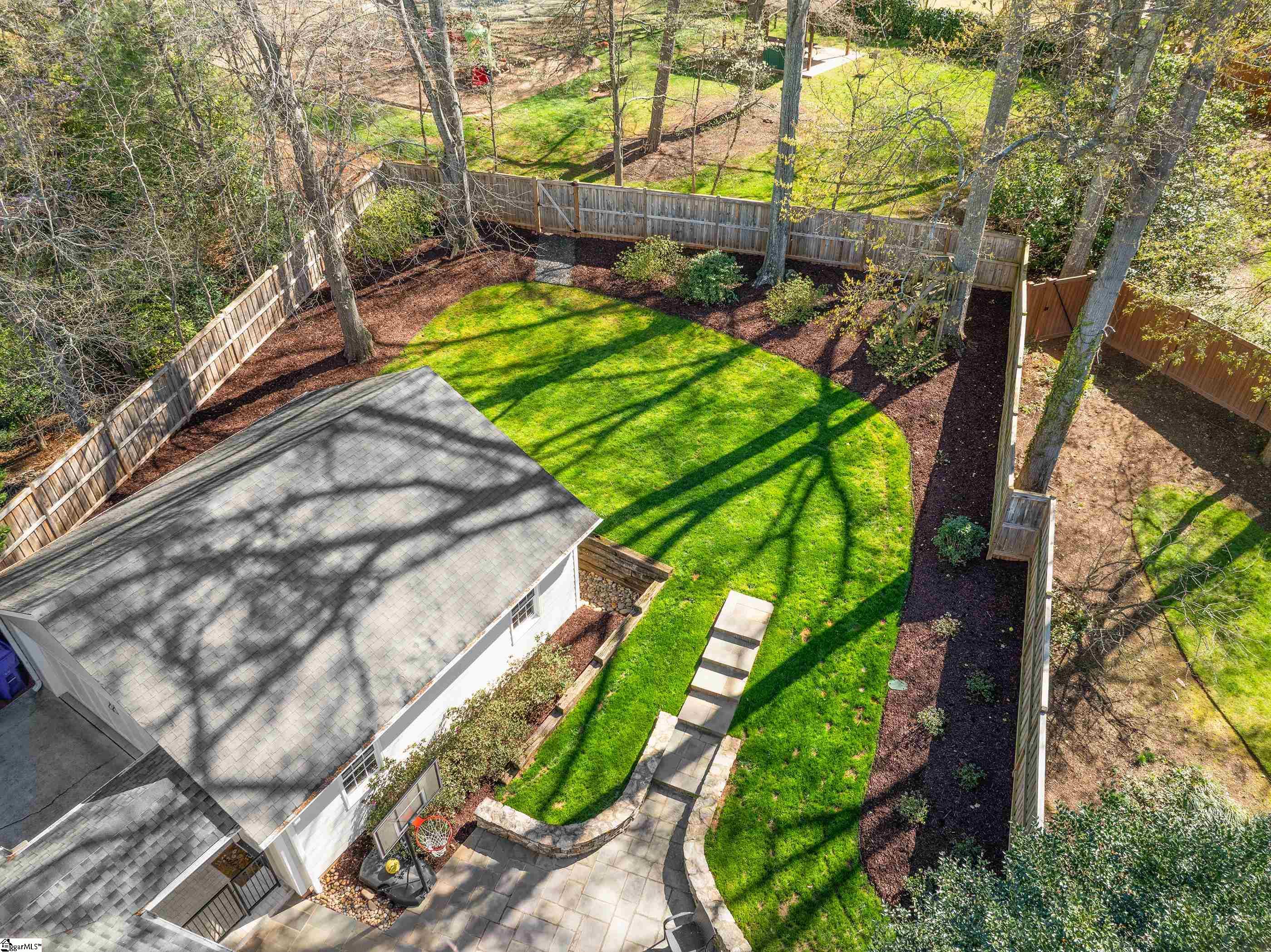 Welcome to 25 Frontus Street, a charming traditional home in the Augusta Road area with nearly 3,000 square feet, 5 bedrooms (or 4 bedrooms plus a flex room), and 3.5 bathrooms. Filled with natural light and ideal for both everyday living and hosting, this home features a spacious kitchen with granite countertops, a large center island, abundant storage, wine chiller in the pantry/bar area, and easy flow into the main living spaces. A mudroom with built-in storage adds everyday convenience- ideal for bookbags and other luggage and sports equipment. Front living room features a gorgeous, vaulted ceiling, fireplace and built in cabinetry. The main level primary suite includes a walk-in shower, jetted tub, and generous walk-in closet space, while upstairs provides four additional bedrooms or the flexibility of three bedrooms plus a flex room, office, or playroom. Outside, enjoy a beautifully landscaped, fenced backyard with large patio along with a detached two-car garage connected by a covered breezeway. This home backs up to the amazing neighborhood park, Rockwood Park, which provides a playground, basketball court and gathering spaces for many afternoons of play and enjoyment. This location cannot be beat! Zoned for award winning schools, this home pairs classic character and updates with a highly desirable Augusta Road area location. Convenient to Prisma’s Memorial Hospital, downtown Greenville, and all that the Augusta Road dining and shopping has to offer. Come see the beautiful, move-in ready home today!