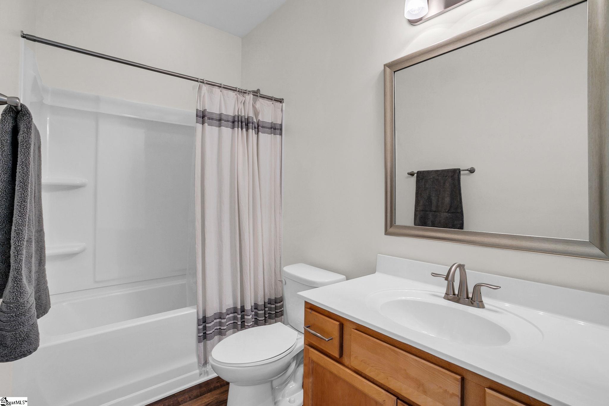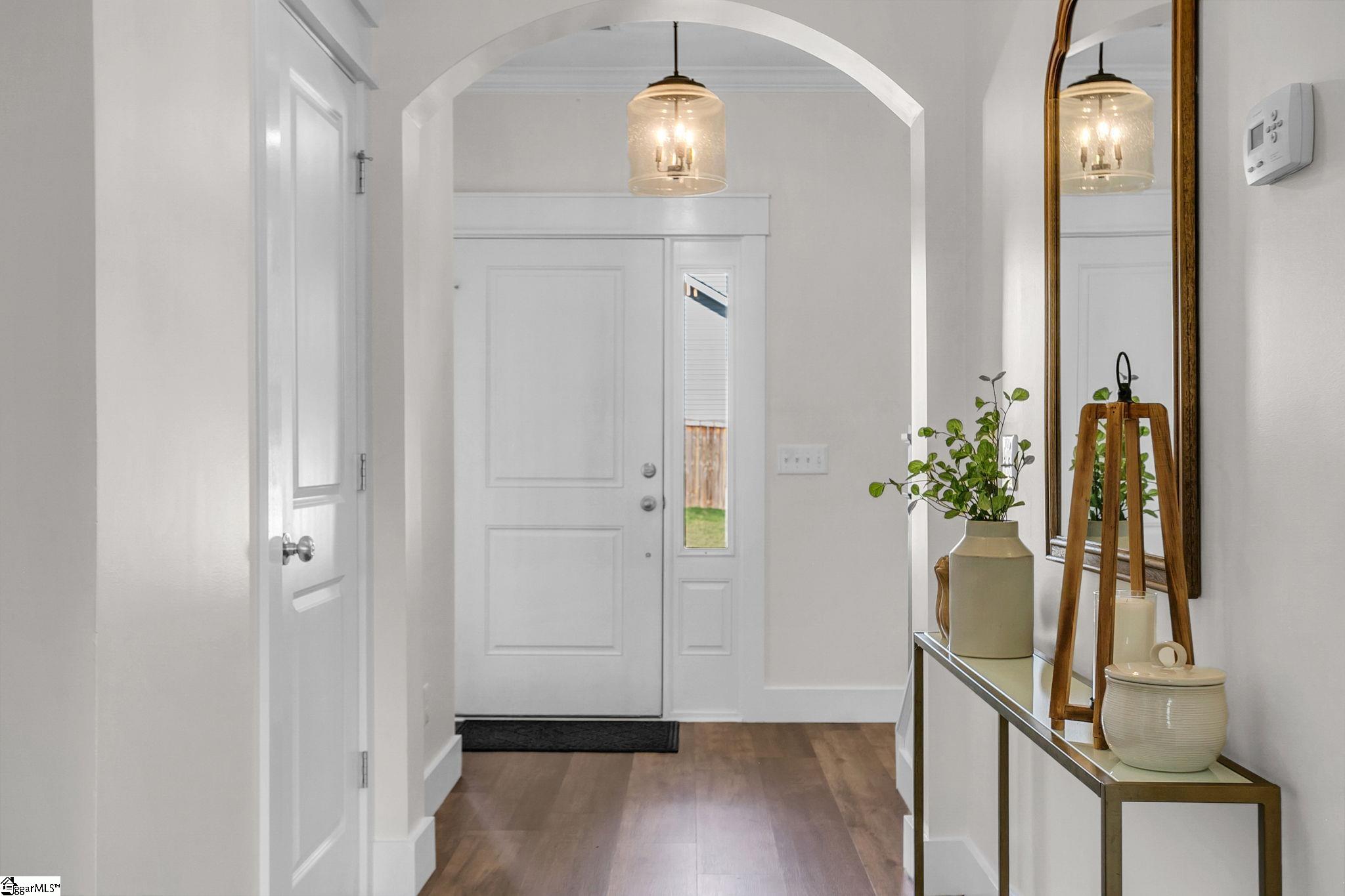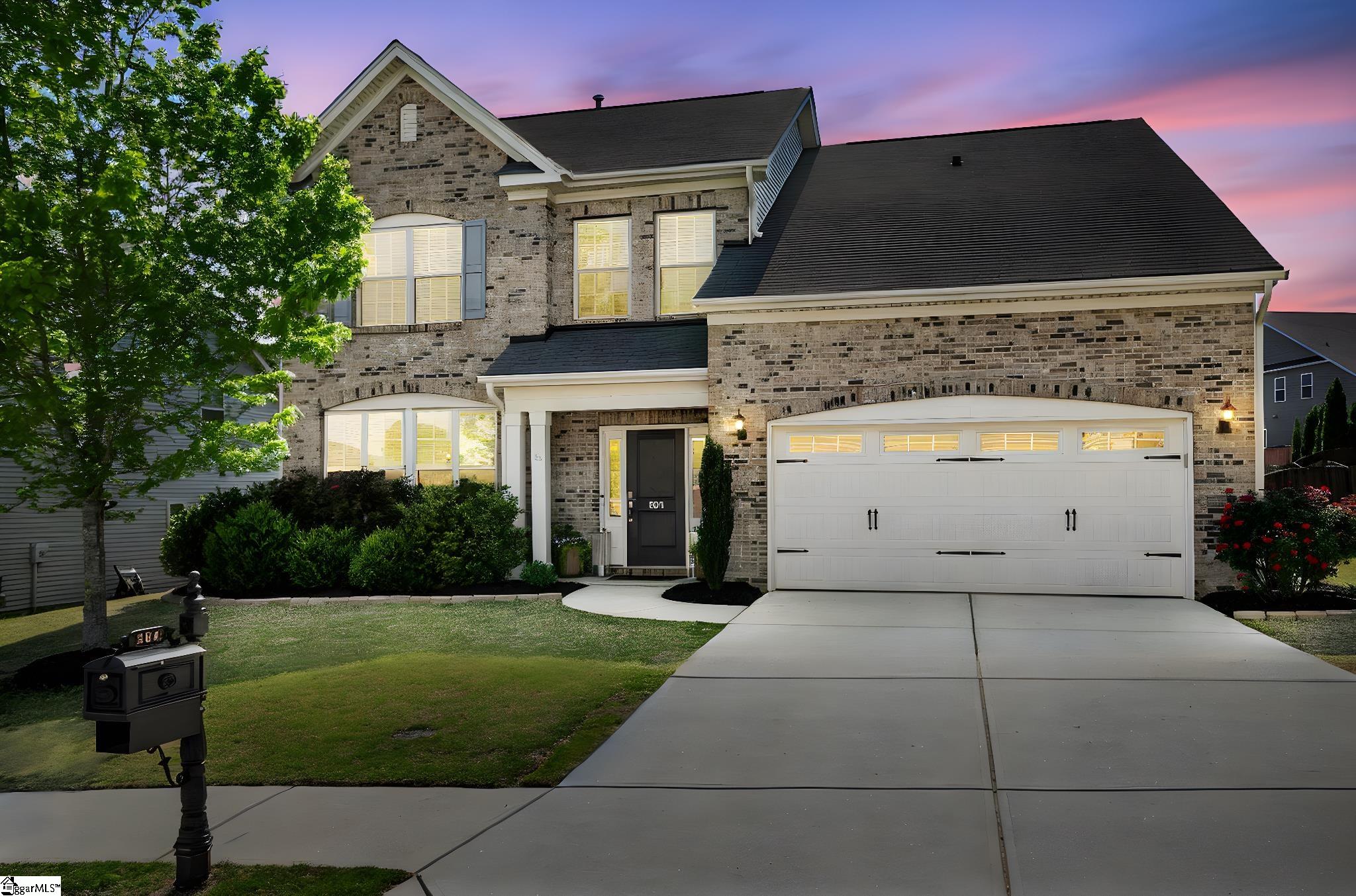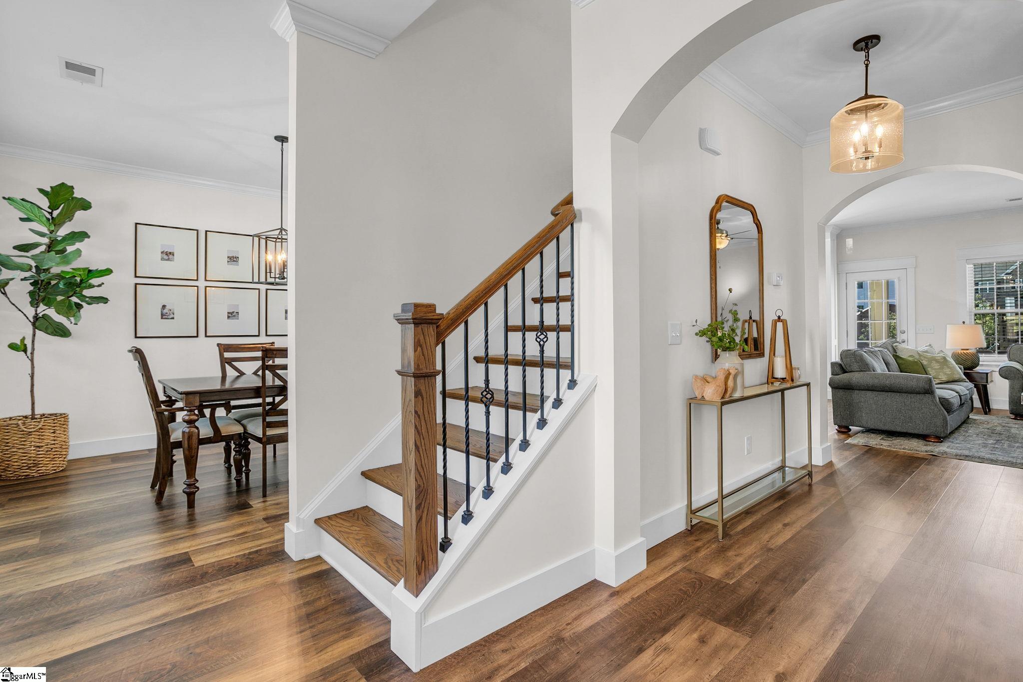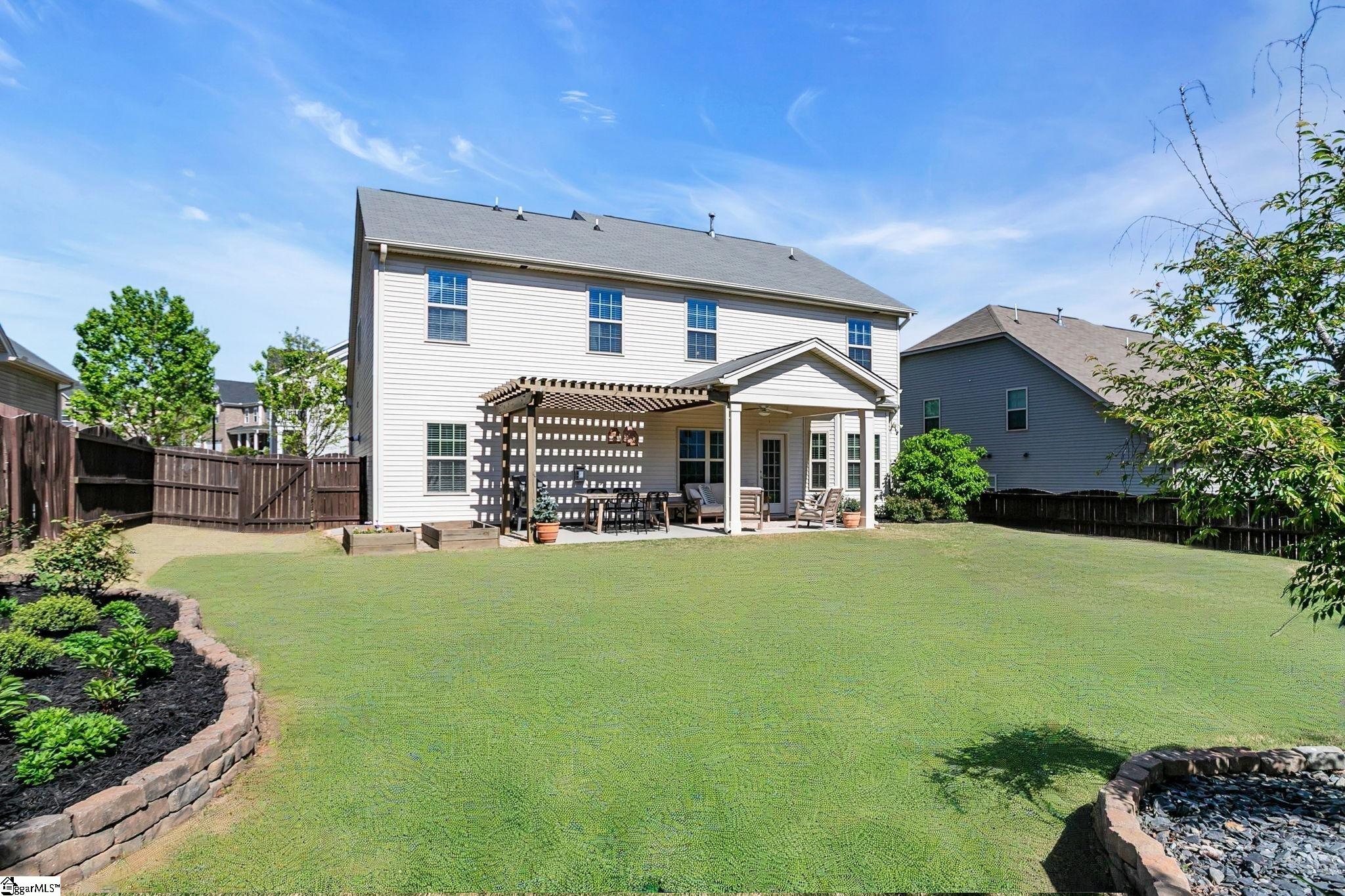 Welcome to this beautifully upgraded and thoughtfully designed home, where modern finishes, timeless craftsmanship, and functional living come together seamlessly. From the moment you enter, you’re greeted by elegant arched doorways, soaring 9’ smooth ceilings, and an abundance of natural light streaming through energy-efficient windows, creating a bright and inviting atmosphere. The main level features a desirable open-concept layout, effortlessly connecting the kitchen, breakfast area, and great room—perfect for both everyday living and entertaining. High-tier Coretec flooring flows throughout the main level, complemented by custom craftsman trim, crown molding, and a stunning upgraded wood staircase accented by Newel railings. The kitchen is a true standout with an abundance of professionally refinished white cabinetry accented by a tile backsplash, quartz countertops, and stainless appliances. The breakfast area adjoins the kitchen with windows overlooking the backyard and don’t overlook the pantry! A convenient ensuite on the main level provides the perfect space for guests or anyone who prefers to avoid stairs. Upstairs, the thoughtfully designed layout continues with the primary suite, three generously sized secondary bedrooms, a full hall bath, a spacious laundry room, and a versatile flex room. A charming hallway nook offers the perfect spot for a centralized study or computer area while the flex room provides endless possibilities—ideal as a playroom, home office, media room, or fitness space. The oversized primary suite is a true retreat, featuring a trey ceiling and a luxurious ensuite bath complete with a quartz dual-sink vanity, garden tub, separate shower, and a spacious walk-in closet. For your outdoor enjoyment, step outside to enjoy an extended covered back patio overlooking a lush, professionally landscaped backyard. Designed for both beauty and ease, the outdoor space includes a custom pergola, garden boxes, and a rose arbor, along with a variety of hydrangeas, roses, and camellias all with low maintenance in mind. The fully fenced yard and playground add to the home’s versatility and appeal. Additional highlights include wood blinds throughout, a half bath, side attic storage off the primary suite, hanging shelving in garage, and a whole-home air purifier for enhanced comfort and air quality. All of this located in the lively Copper Creek community where residents enjoy sidewalks, street lights, a community clubhouse and pool along with an extensive playground. Minutes from thriving downtown Simpsonville, Heritage Park, I-385, Woodruff Road Shopping and so much more, this home truly offers the perfect blend of location, style, space, and thoughtful upgrades—making it a must-see for today’s discerning buyer.