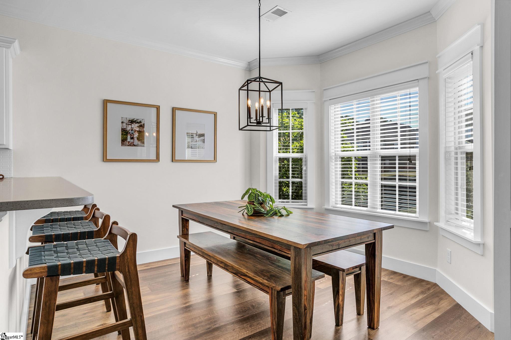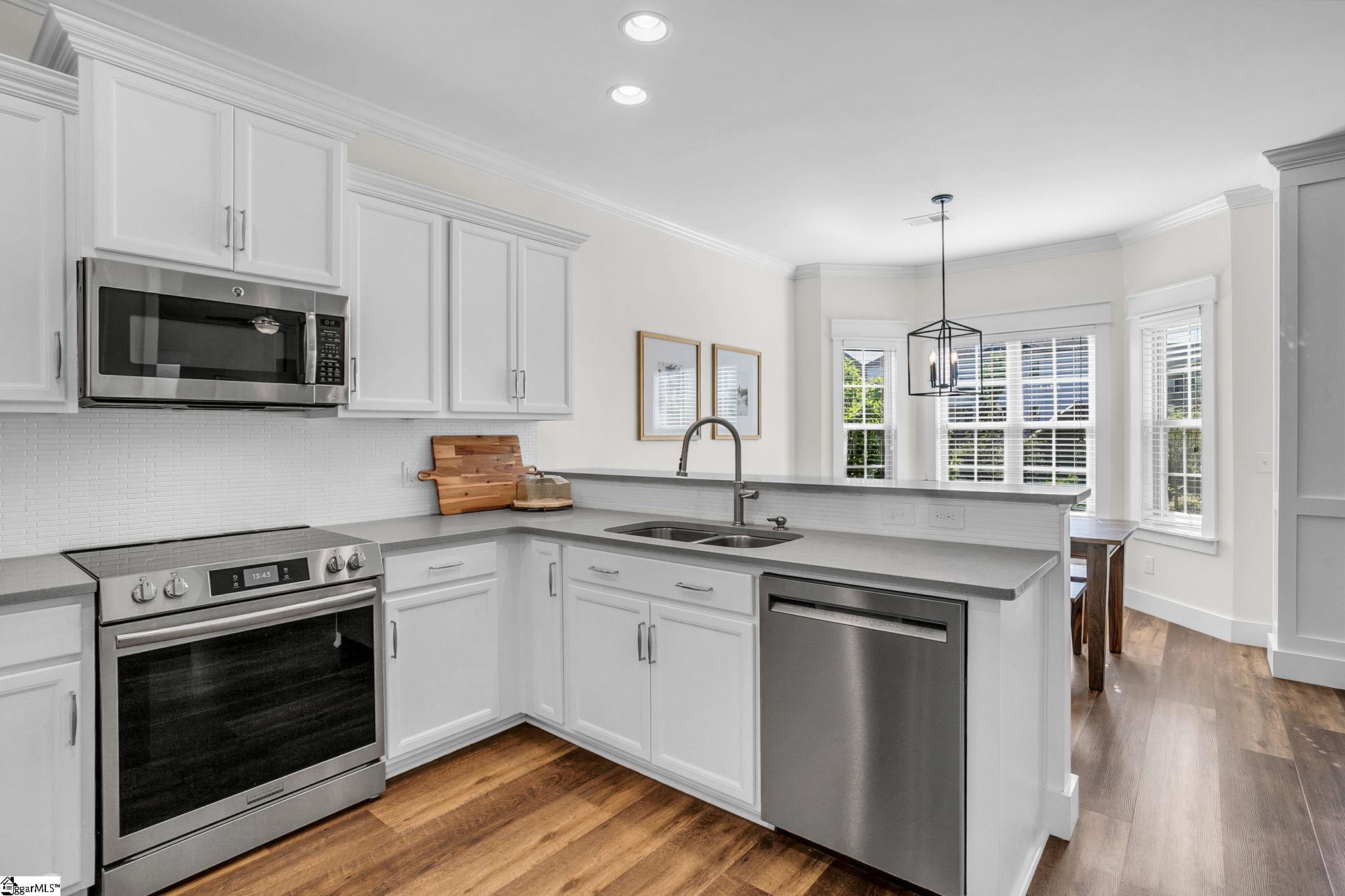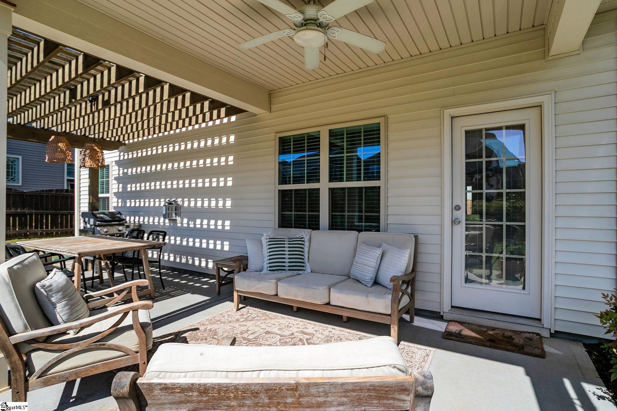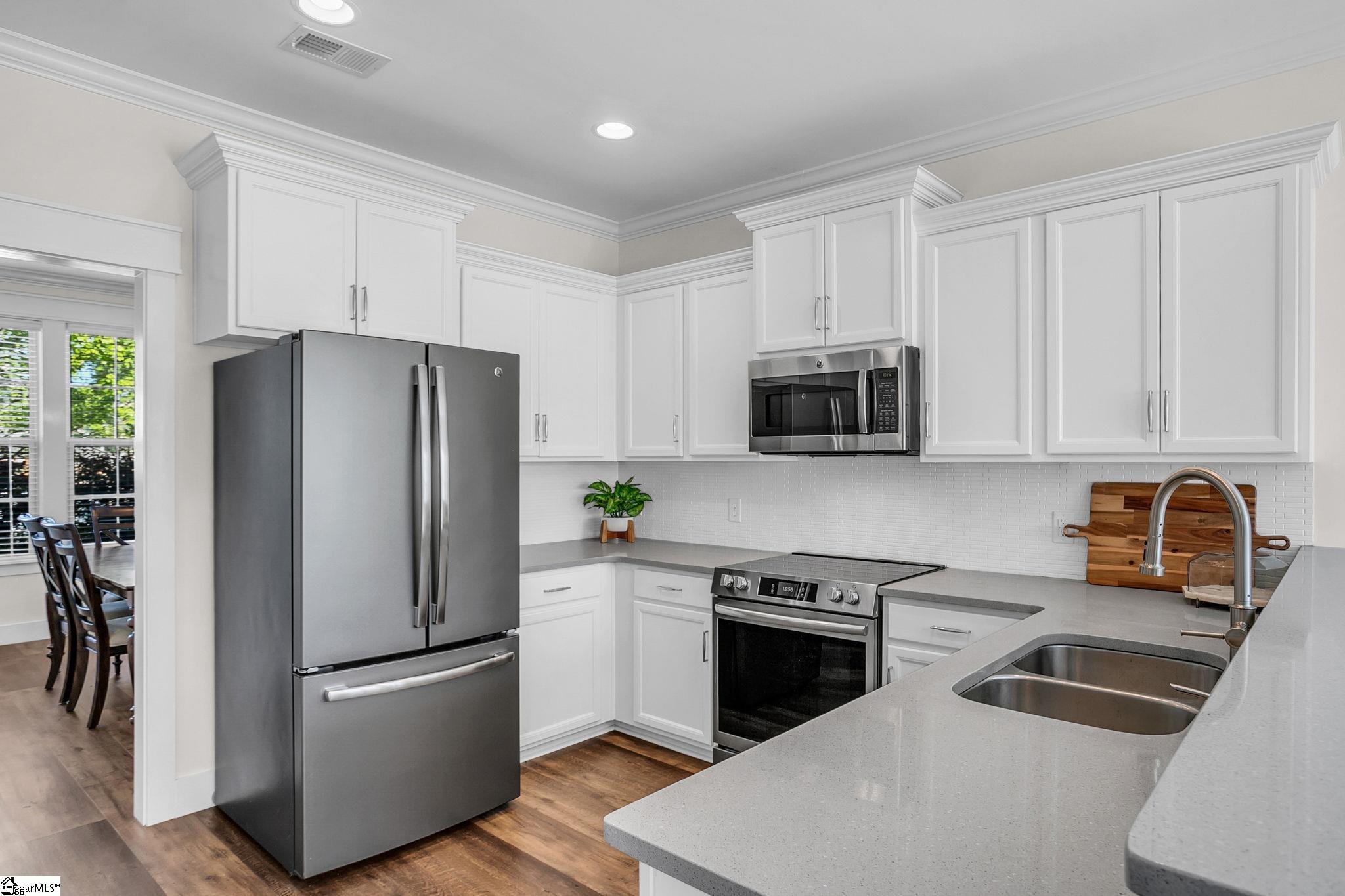 Welcome to this beautifully upgraded and thoughtfully designed home, where modern finishes, timeless craftsmanship, and functional living come together seamlessly. From the moment you enter, you’re greeted by elegant arched doorways, soaring 9’ smooth ceilings, and an abundance of natural light streaming through energy-efficient windows, creating a bright and inviting atmosphere. The main level features a desirable open-concept layout, effortlessly connecting the kitchen, breakfast area, and great room—perfect for both everyday living and entertaining. High-tier Coretec flooring flows throughout the main level, complemented by custom craftsman trim, crown molding, and a stunning upgraded wood staircase accented by Newel railings. The kitchen is a true standout with an abundance of professionally refinished white cabinetry accented by a tile backsplash, quartz countertops, and stainless appliances. The breakfast area adjoins the kitchen with windows overlooking the backyard and don’t overlook the pantry! A convenient ensuite on the main level provides the perfect space for guests or anyone who prefers to avoid stairs. Upstairs, the thoughtfully designed layout continues with the primary suite, three generously sized secondary bedrooms, a full hall bath, a spacious laundry room, and a versatile flex room. A charming hallway nook offers the perfect spot for a centralized study or computer area while the flex room provides endless possibilities—ideal as a playroom, home office, media room, or fitness space. The oversized primary suite is a true retreat, featuring a trey ceiling and a luxurious ensuite bath complete with a quartz dual-sink vanity, garden tub, separate shower, and a spacious walk-in closet. For your outdoor enjoyment, step outside to enjoy an extended covered back patio overlooking a lush, professionally landscaped backyard. Designed for both beauty and ease, the outdoor space includes a custom pergola, garden boxes, and a rose arbor, along with a variety of hydrangeas, roses, and camellias all with low maintenance in mind. The fully fenced yard and playground add to the home’s versatility and appeal. Additional highlights include wood blinds throughout, a half bath, side attic storage off the primary suite, hanging shelving in garage, and a whole-home air purifier for enhanced comfort and air quality. All of this located in the lively Copper Creek community where residents enjoy sidewalks, street lights, a community clubhouse and pool along with an extensive playground. Minutes from thriving downtown Simpsonville, Heritage Park, I-385, Woodruff Road Shopping and so much more, this home truly offers the perfect blend of location, style, space, and thoughtful upgrades—making it a must-see for today’s discerning buyer.