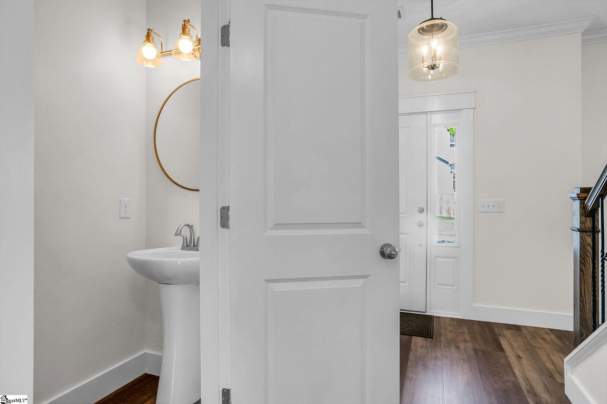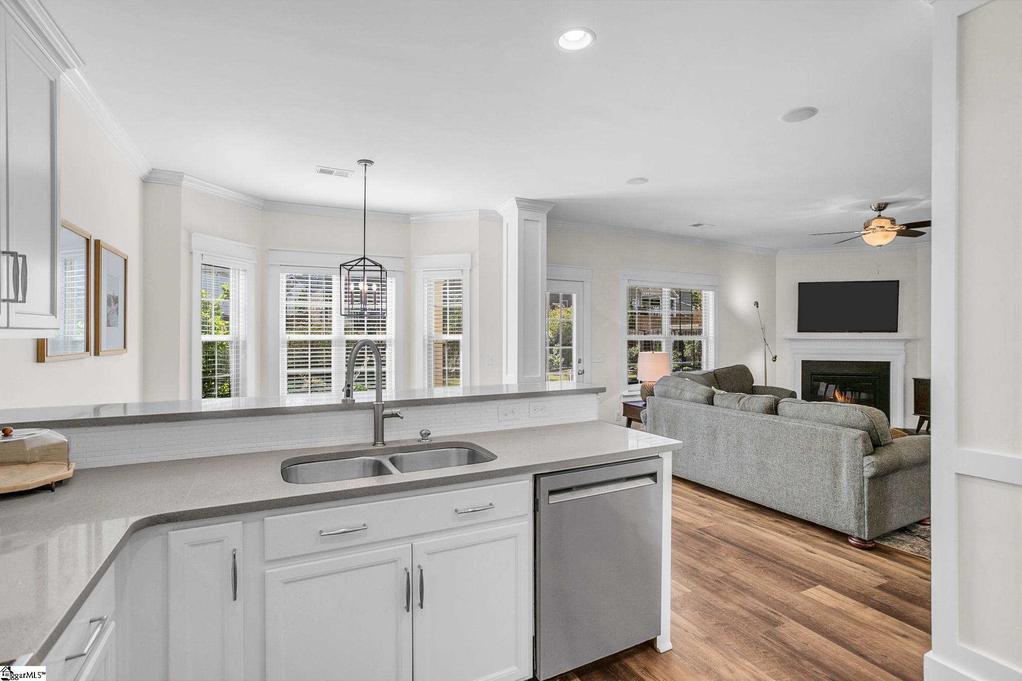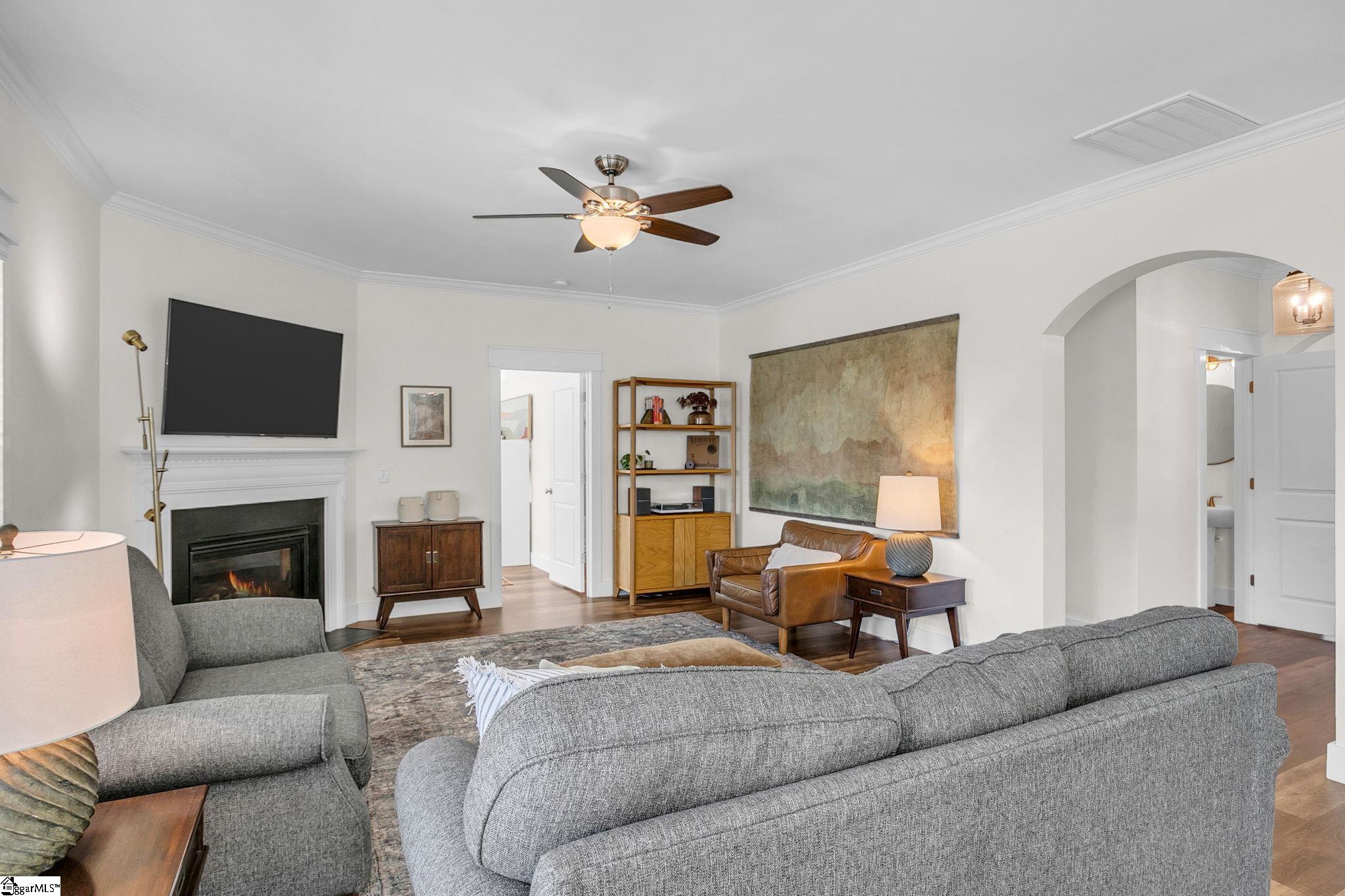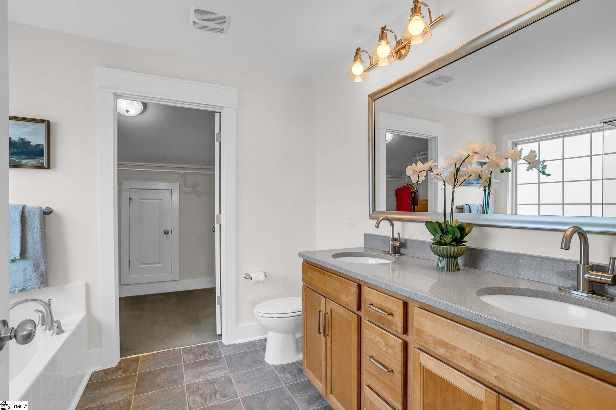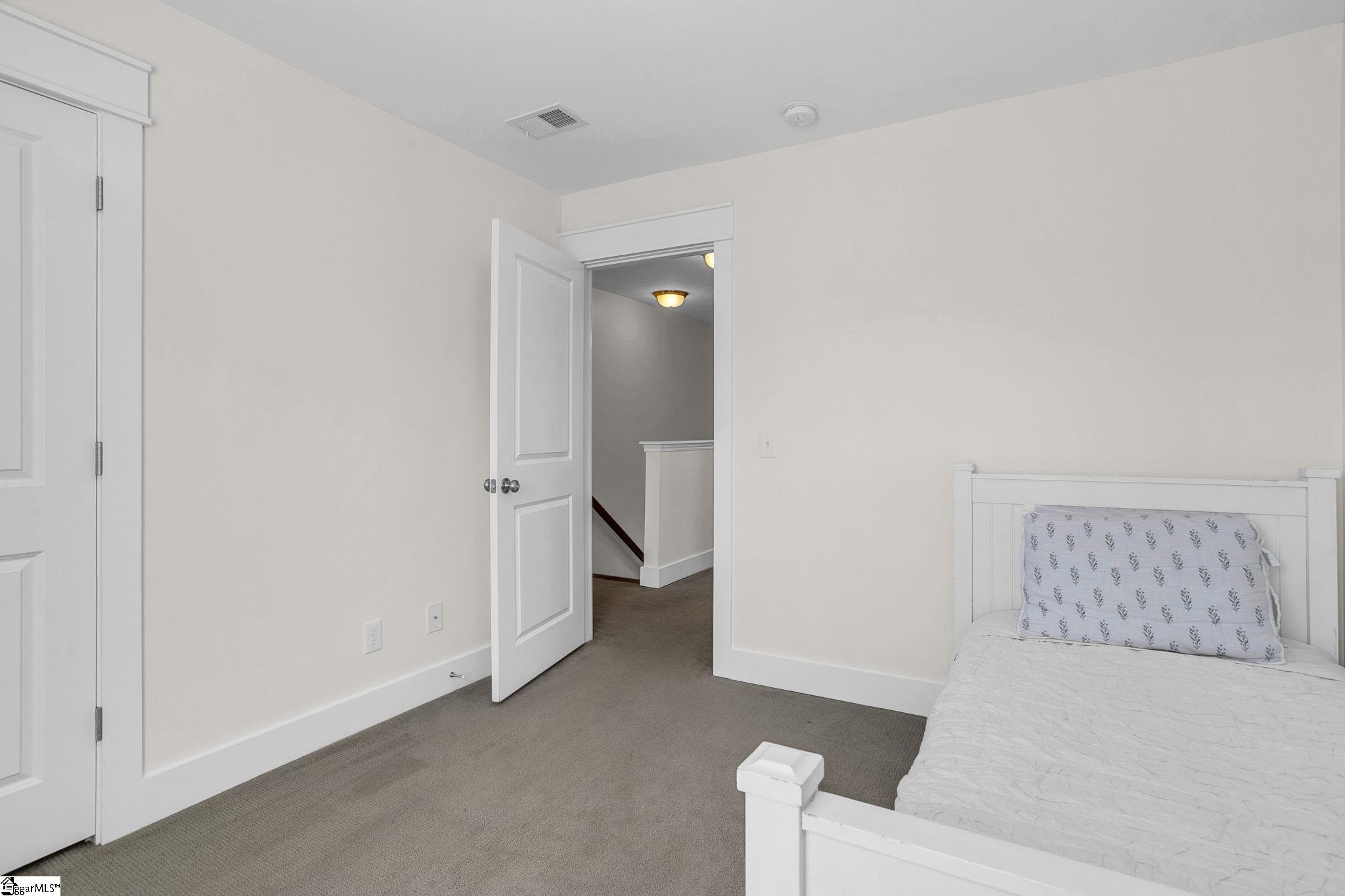 Welcome to this beautifully upgraded and thoughtfully designed home, where modern finishes, timeless craftsmanship, and functional living come together seamlessly. From the moment you enter, you’re greeted by elegant arched doorways, soaring 9’ smooth ceilings, and an abundance of natural light streaming through energy-efficient windows, creating a bright and inviting atmosphere. The main level features a desirable open-concept layout, effortlessly connecting the kitchen, breakfast area, and great room—perfect for both everyday living and entertaining. High-tier Coretec flooring flows throughout the main level, complemented by custom craftsman trim, crown molding, and a stunning upgraded wood staircase accented by Newel railings. The kitchen is a true standout with an abundance of professionally refinished white cabinetry accented by a tile backsplash, quartz countertops, and stainless appliances. The breakfast area adjoins the kitchen with windows overlooking the backyard and don’t overlook the pantry! A convenient ensuite on the main level provides the perfect space for guests or anyone who prefers to avoid stairs. Upstairs, the thoughtfully designed layout continues with the primary suite, three generously sized secondary bedrooms, a full hall bath, a spacious laundry room, and a versatile flex room. A charming hallway nook offers the perfect spot for a centralized study or computer area while the flex room provides endless possibilities—ideal as a playroom, home office, media room, or fitness space. The oversized primary suite is a true retreat, featuring a trey ceiling and a luxurious ensuite bath complete with a quartz dual-sink vanity, garden tub, separate shower, and a spacious walk-in closet. For your outdoor enjoyment, step outside to enjoy an extended covered back patio overlooking a lush, professionally landscaped backyard. Designed for both beauty and ease, the outdoor space includes a custom pergola, garden boxes, and a rose arbor, along with a variety of hydrangeas, roses, and camellias all with low maintenance in mind. The fully fenced yard and playground add to the home’s versatility and appeal. Additional highlights include wood blinds throughout, a half bath, side attic storage off the primary suite, hanging shelving in garage, and a whole-home air purifier for enhanced comfort and air quality. All of this located in the lively Copper Creek community where residents enjoy sidewalks, street lights, a community clubhouse and pool along with an extensive playground. Minutes from thriving downtown Simpsonville, Heritage Park, I-385, Woodruff Road Shopping and so much more, this home truly offers the perfect blend of location, style, space, and thoughtful upgrades—making it a must-see for today’s discerning buyer.