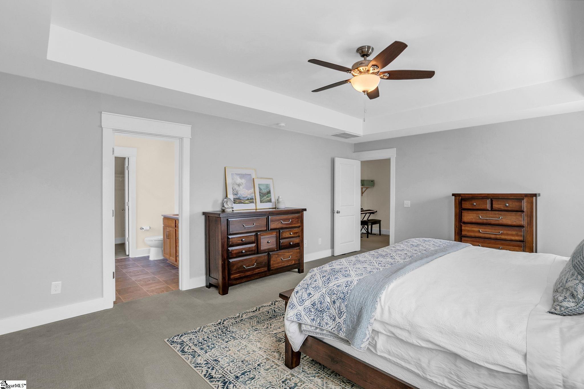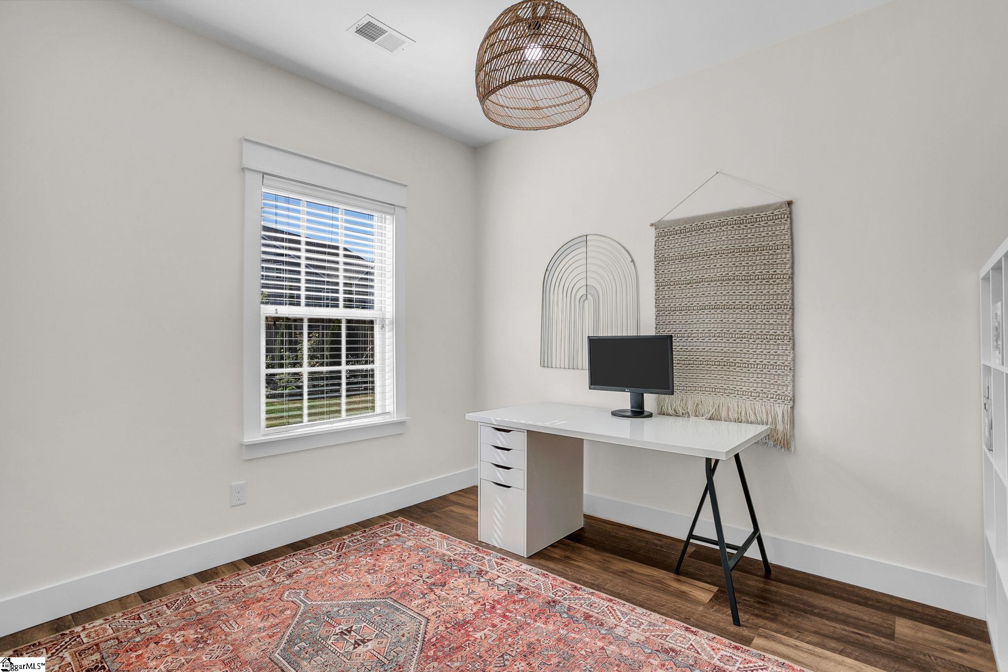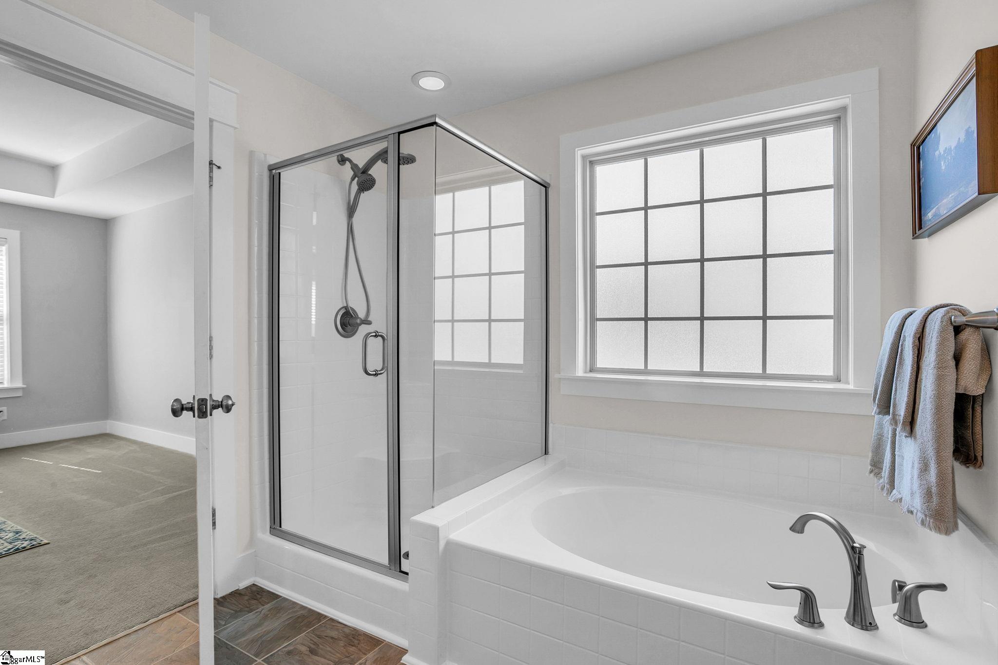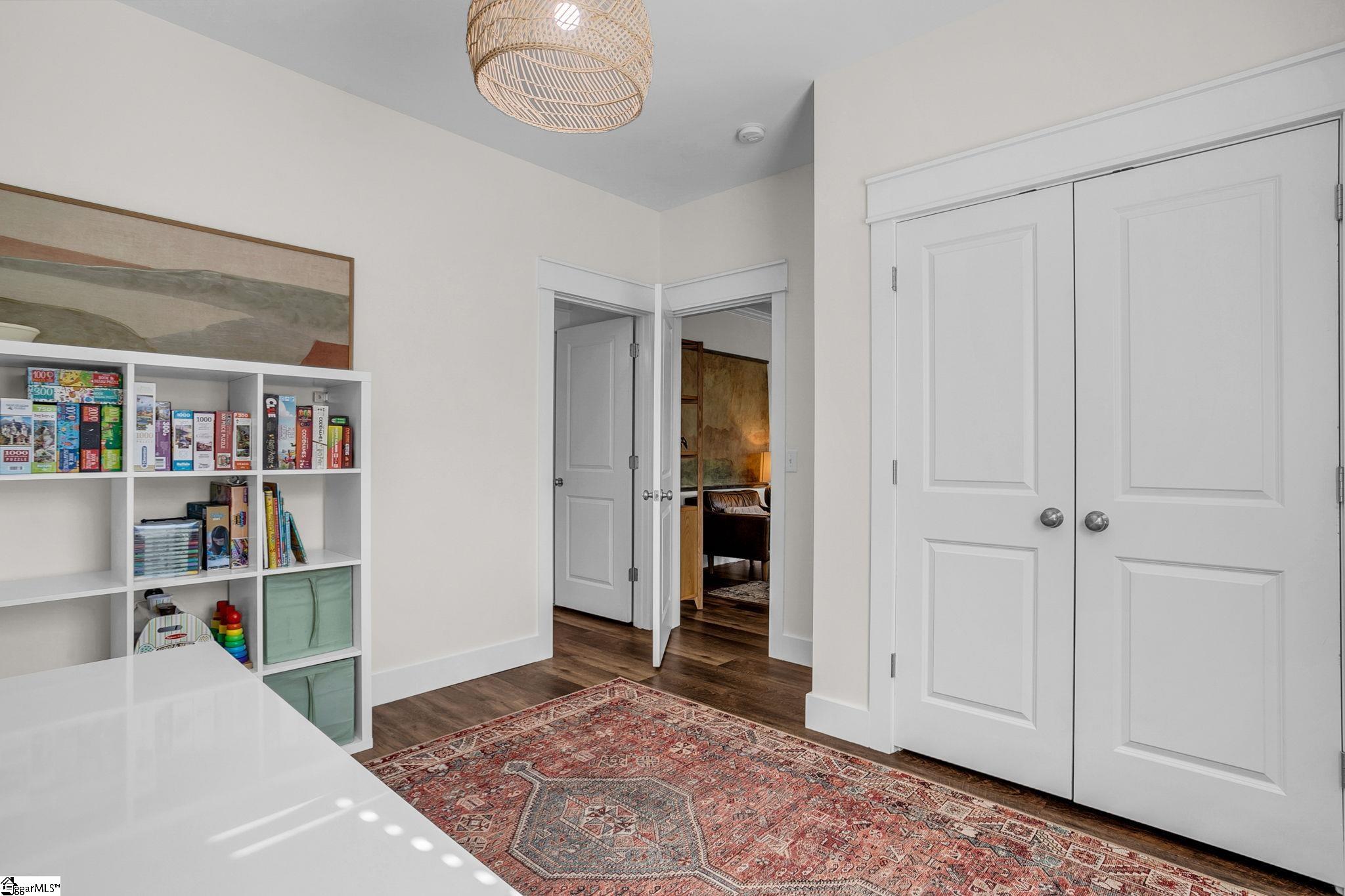 Welcome to this beautifully upgraded and thoughtfully designed home, where modern finishes, timeless craftsmanship, and functional living come together seamlessly. From the moment you enter, you’re greeted by elegant arched doorways, soaring 9’ smooth ceilings, and an abundance of natural light streaming through energy-efficient windows, creating a bright and inviting atmosphere. The main level features a desirable open-concept layout, effortlessly connecting the kitchen, breakfast area, and great room—perfect for both everyday living and entertaining. High-tier Coretec flooring flows throughout the main level, complemented by custom craftsman trim, crown molding, and a stunning upgraded wood staircase accented by Newel railings. The kitchen is a true standout with an abundance of professionally refinished white cabinetry accented by a tile backsplash, quartz countertops, and stainless appliances. The breakfast area adjoins the kitchen with windows overlooking the backyard and don’t overlook the pantry! A convenient ensuite on the main level provides the perfect space for guests or anyone who prefers to avoid stairs. Upstairs, the thoughtfully designed layout continues with the primary suite, three generously sized secondary bedrooms, a full hall bath, a spacious laundry room, and a versatile flex room. A charming hallway nook offers the perfect spot for a centralized study or computer area while the flex room provides endless possibilities—ideal as a playroom, home office, media room, or fitness space. The oversized primary suite is a true retreat, featuring a trey ceiling and a luxurious ensuite bath complete with a quartz dual-sink vanity, garden tub, separate shower, and a spacious walk-in closet. For your outdoor enjoyment, step outside to enjoy an extended covered back patio overlooking a lush, professionally landscaped backyard. Designed for both beauty and ease, the outdoor space includes a custom pergola, garden boxes, and a rose arbor, along with a variety of hydrangeas, roses, and camellias all with low maintenance in mind. The fully fenced yard and playground add to the home’s versatility and appeal. Additional highlights include wood blinds throughout, a half bath, side attic storage off the primary suite, hanging shelving in garage, and a whole-home air purifier for enhanced comfort and air quality. All of this located in the lively Copper Creek community where residents enjoy sidewalks, street lights, a community clubhouse and pool along with an extensive playground. Minutes from thriving downtown Simpsonville, Heritage Park, I-385, Woodruff Road Shopping and so much more, this home truly offers the perfect blend of location, style, space, and thoughtful upgrades—making it a must-see for today’s discerning buyer.