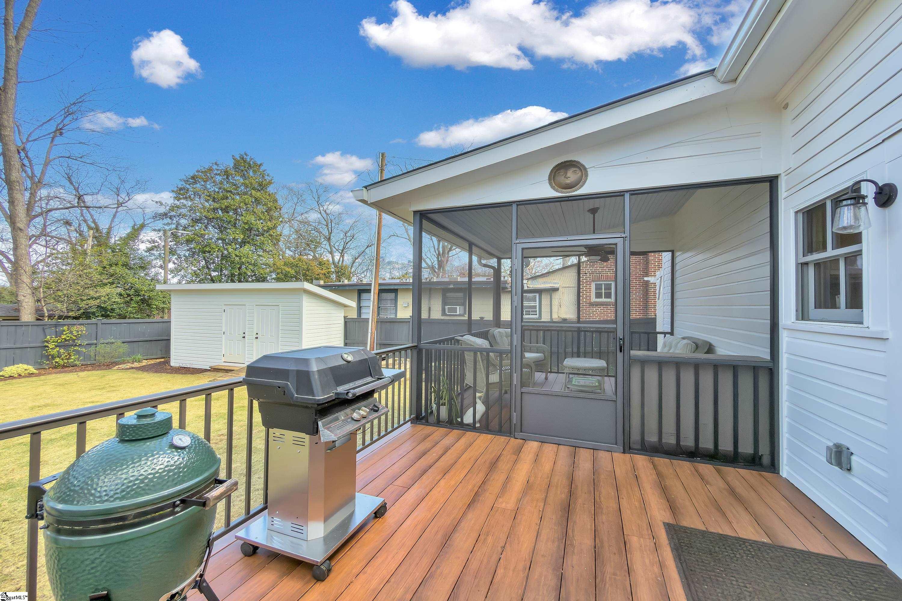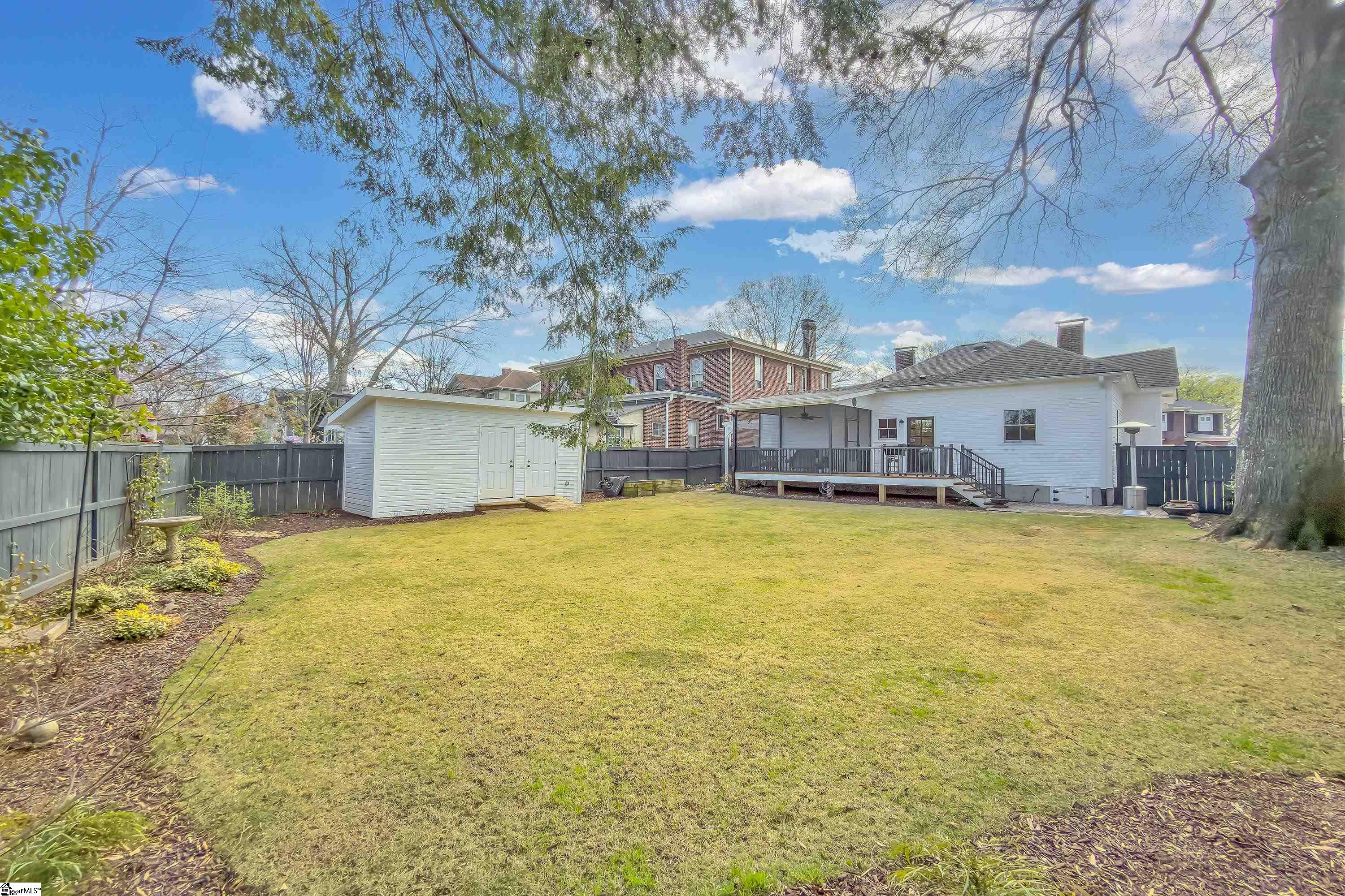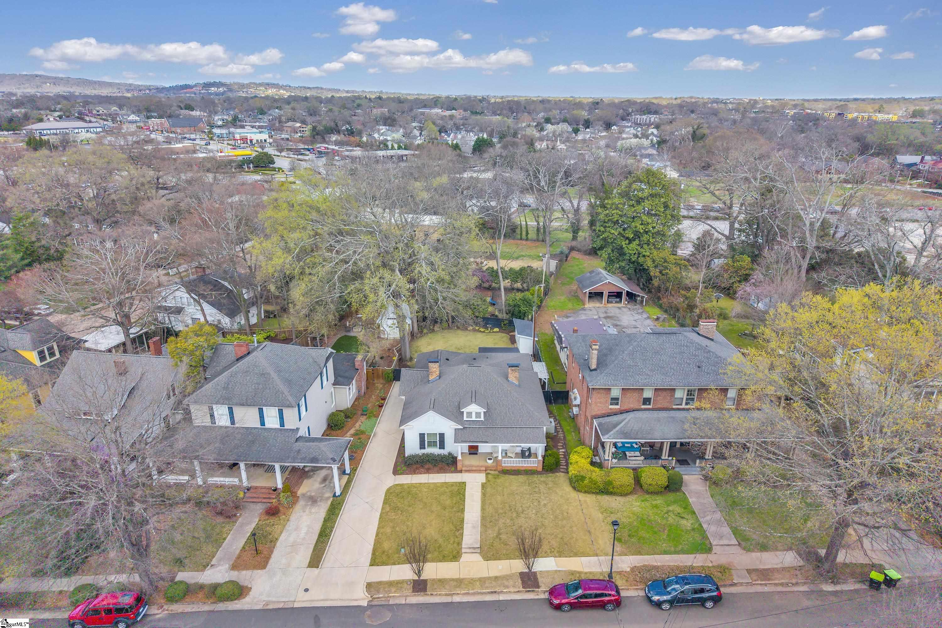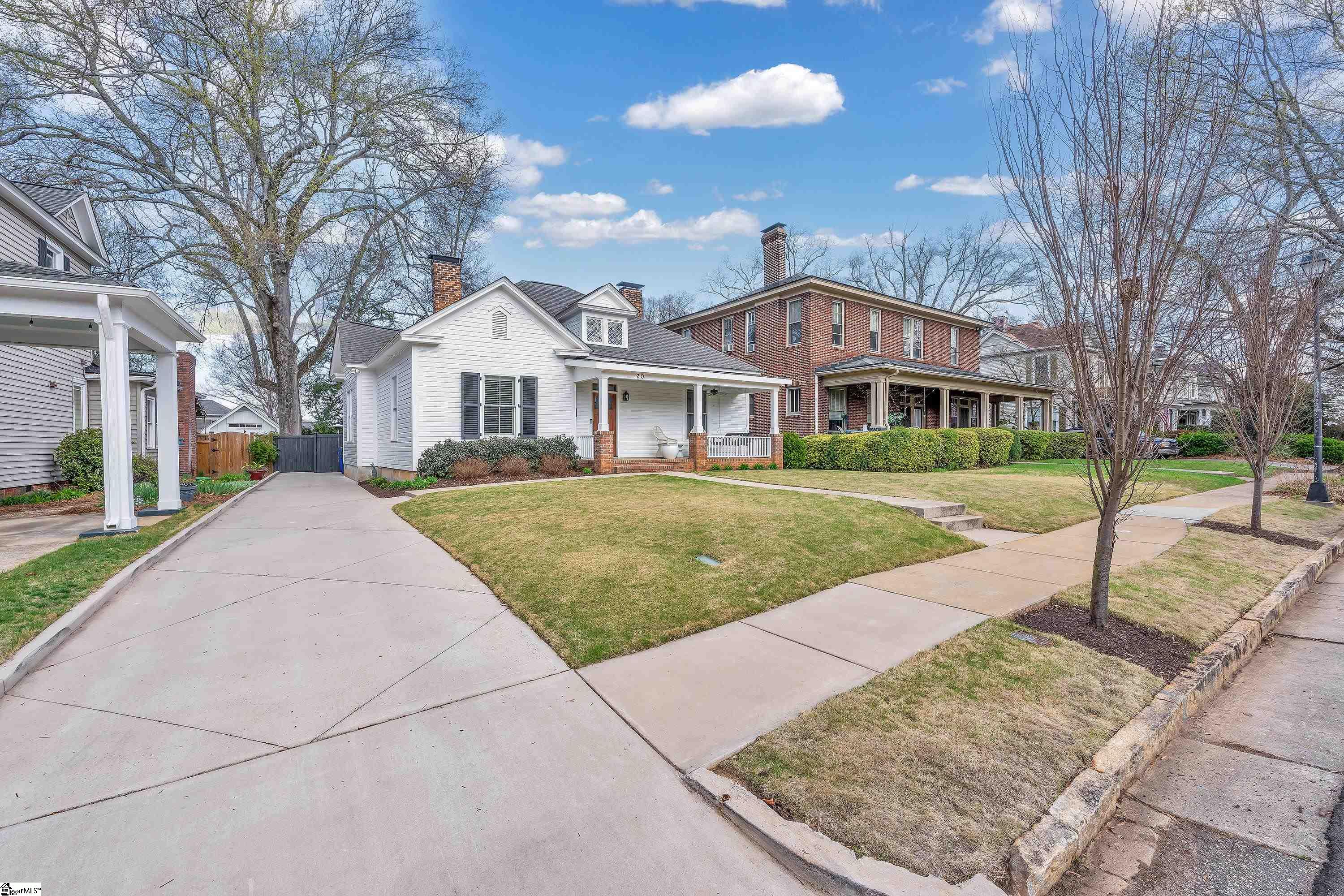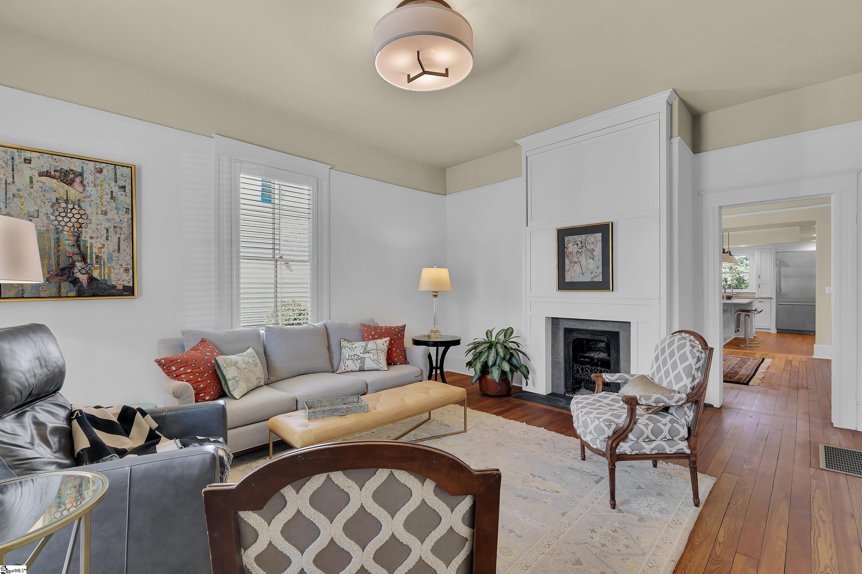 Welcome to 30 Pinckney Street, located in the historic Hampton-Pinckney neighborhood—Greenville’s National Register Historic District—where this beautifully restored 1905 home blends timeless character with modern living. Just a 10-minute walk to Main Street and only minutes to Unity Park, this property provides walkable access to Greenville’s award-winning restaurants, shops, parks, and the Swamp Rabbit Trail. Fully and thoughtfully renovated, this move-in-ready home preserves its historic charm while featuring stylish updates throughout. The beautifully designed kitchen is the heart of the home with custom white cabinetry, Thermador appliances, artesian-stone tile backsplash, oversized island with a prep sink, a built-in speed oven microwave, and a generous wine chiller—perfect for entertaining and everyday living. Original heart-pine floors run throughout the home, complemented by tile in the bathrooms and laundry room. A traditional center hallway floorplan creates a natural flow from room to room, while large, oversized windows fill the home with natural light. Four original fireplaces add character in the living room, dining room, and both bedrooms. The primary suite offers a relaxing retreat with two closets, large vanity with an oversized sink, soaking tub, and a walk-in shower with built-in seat and multiple shower heads. A laundry room with sink and cabinetry adds everyday convenience. Outdoor living is just as inviting, with a welcoming front porch, and an additional screened porch, deck, and patio overlooking the private fenced backyard—ideal for relaxing evenings or entertaining guests. The property also includes a storage shed with electricity and an extra-long paved driveway, providing ample parking. Renovated historic homes in downtown Greenville with this level of character, outdoor living, and walkability rarely come available, making this an incredible opportunity to enjoy modern comfort and timeless character in one of the city’s most sought-after neighborhoods.