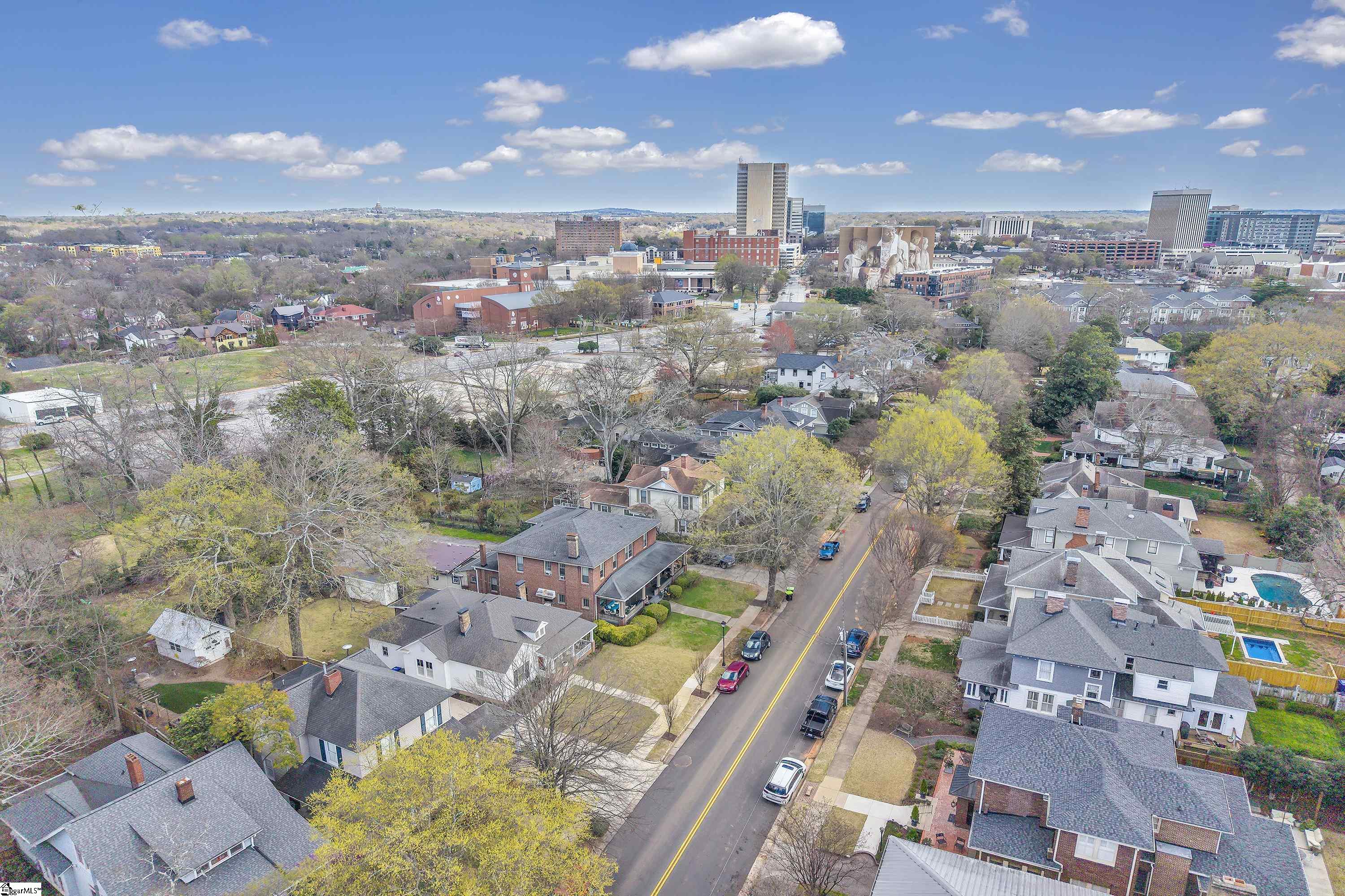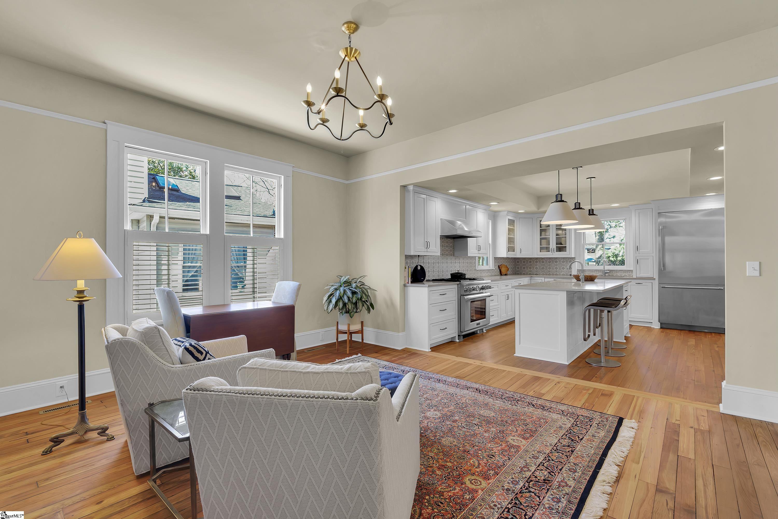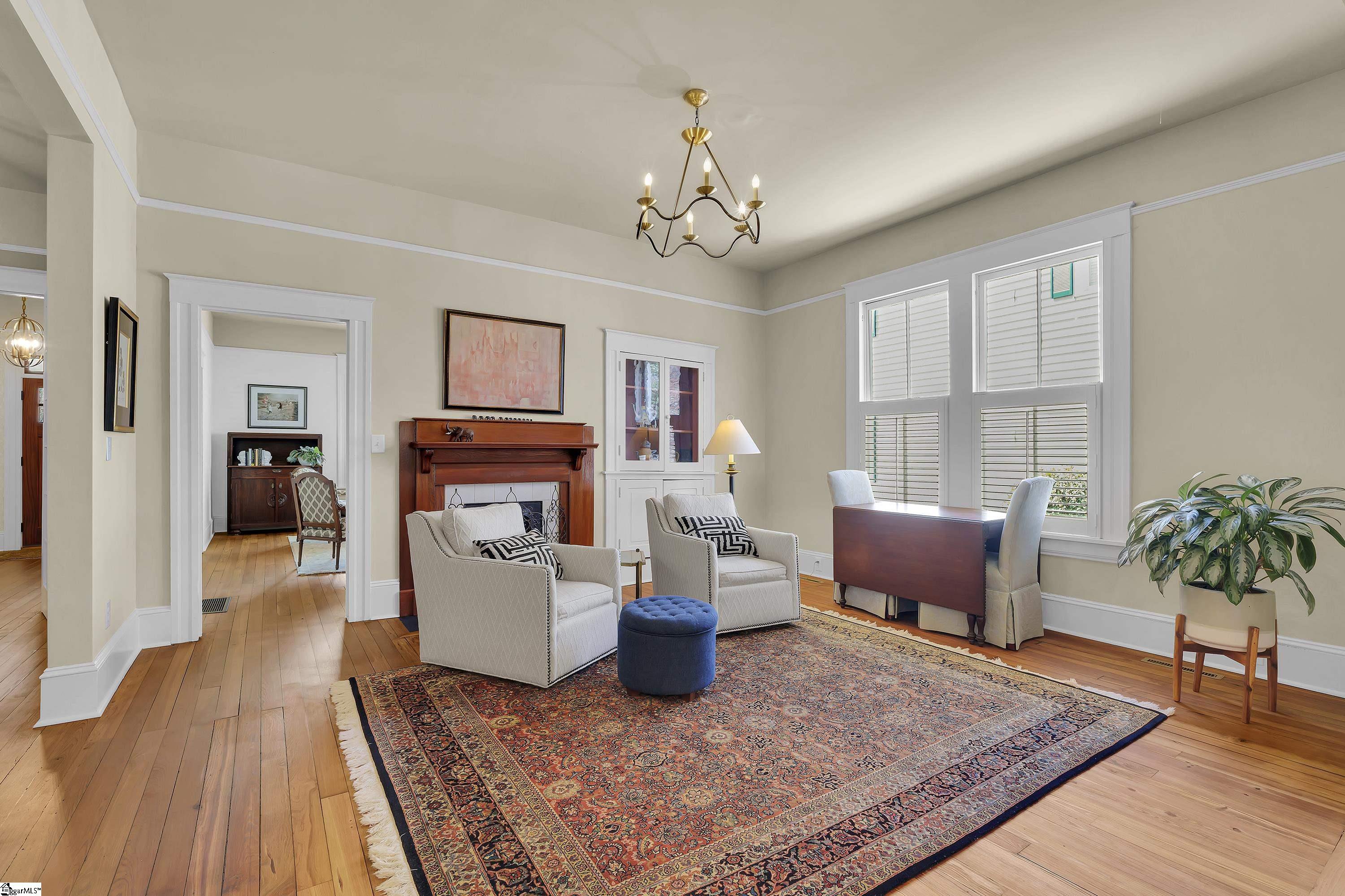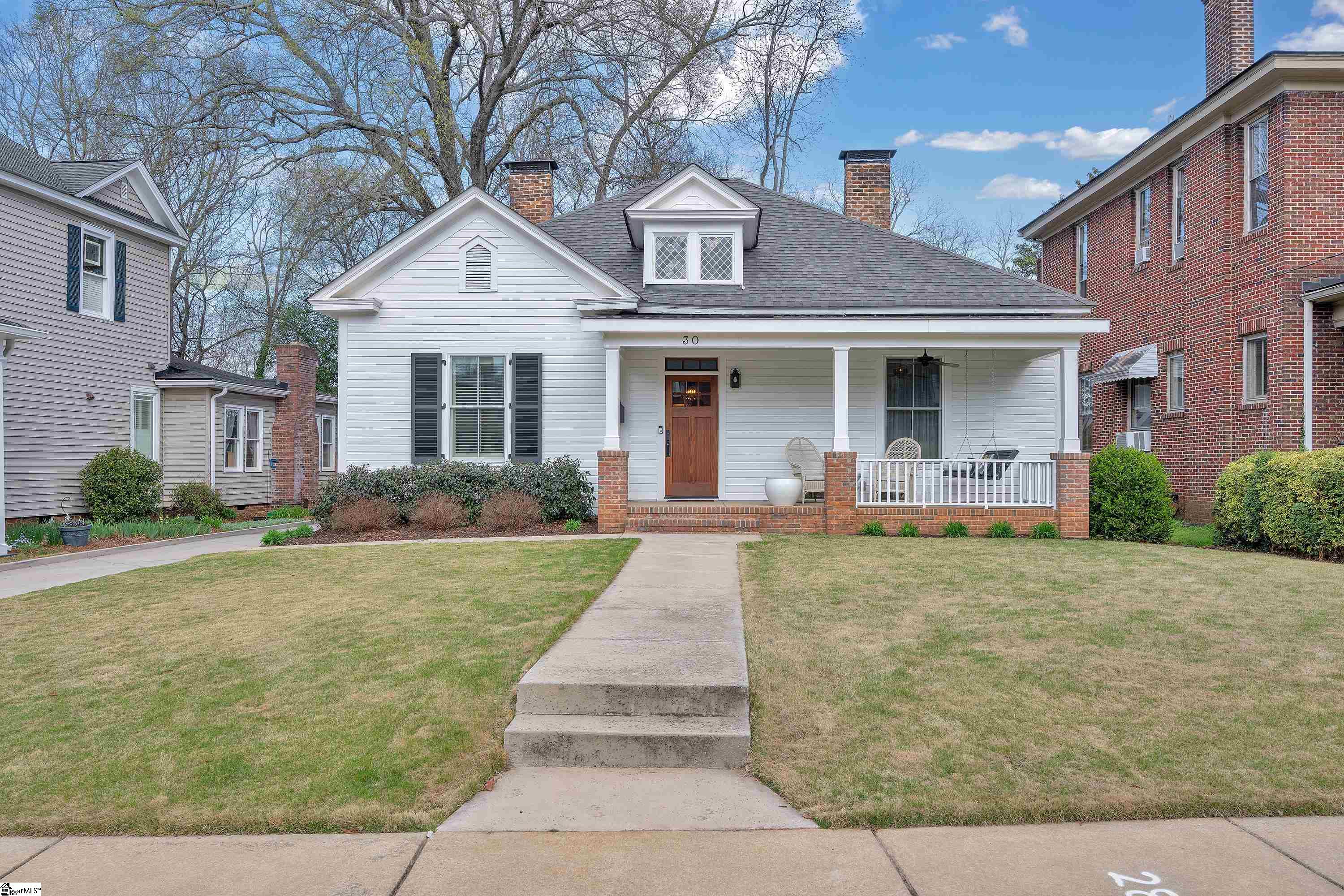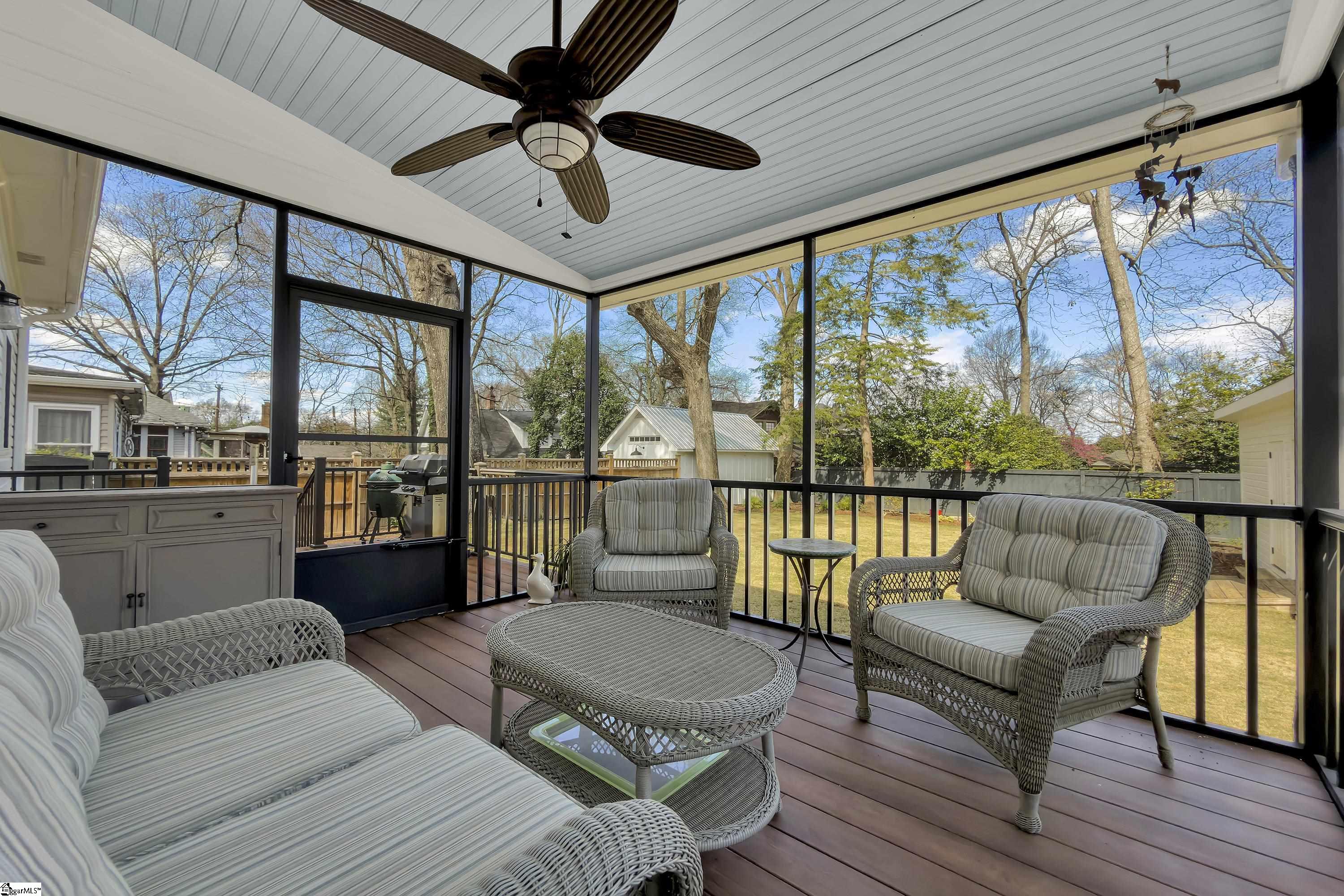 Welcome to 30 Pinckney Street, located in the historic Hampton-Pinckney neighborhood—Greenville’s National Register Historic District—where this beautifully restored 1905 home blends timeless character with modern living. Just a 10-minute walk to Main Street and only minutes to Unity Park, this property provides walkable access to Greenville’s award-winning restaurants, shops, parks, and the Swamp Rabbit Trail. Fully and thoughtfully renovated, this move-in-ready home preserves its historic charm while featuring stylish updates throughout. The beautifully designed kitchen is the heart of the home with custom white cabinetry, Thermador appliances, artesian-stone tile backsplash, oversized island with a prep sink, a built-in speed oven microwave, and a generous wine chiller—perfect for entertaining and everyday living. Original heart-pine floors run throughout the home, complemented by tile in the bathrooms and laundry room. A traditional center hallway floorplan creates a natural flow from room to room, while large, oversized windows fill the home with natural light. Four original fireplaces add character in the living room, dining room, and both bedrooms. The primary suite offers a relaxing retreat with two closets, large vanity with an oversized sink, soaking tub, and a walk-in shower with built-in seat and multiple shower heads. A laundry room with sink and cabinetry adds everyday convenience. Outdoor living is just as inviting, with a welcoming front porch, and an additional screened porch, deck, and patio overlooking the private fenced backyard—ideal for relaxing evenings or entertaining guests. The property also includes a storage shed with electricity and an extra-long paved driveway, providing ample parking. Renovated historic homes in downtown Greenville with this level of character, outdoor living, and walkability rarely come available, making this an incredible opportunity to enjoy modern comfort and timeless character in one of the city’s most sought-after neighborhoods.