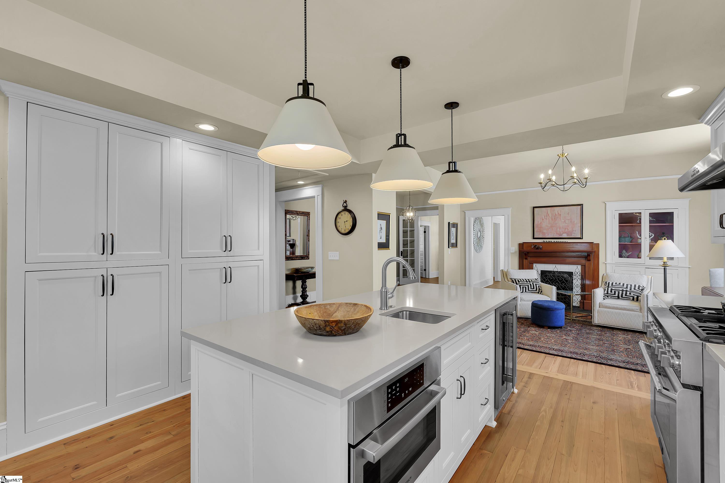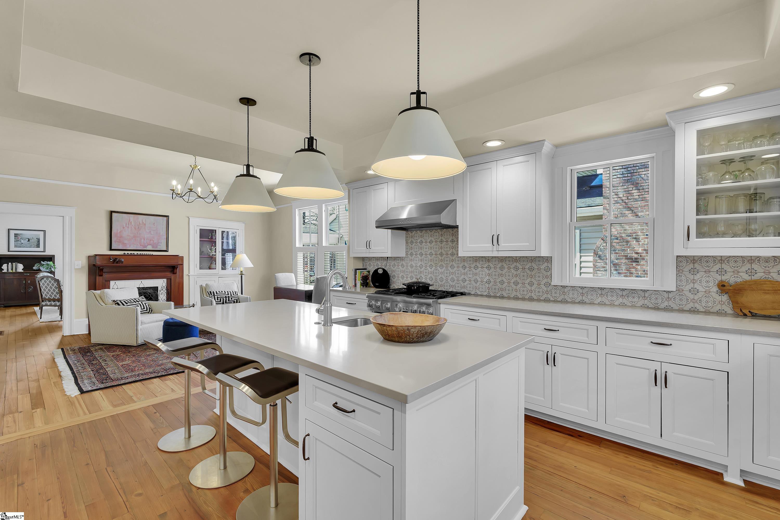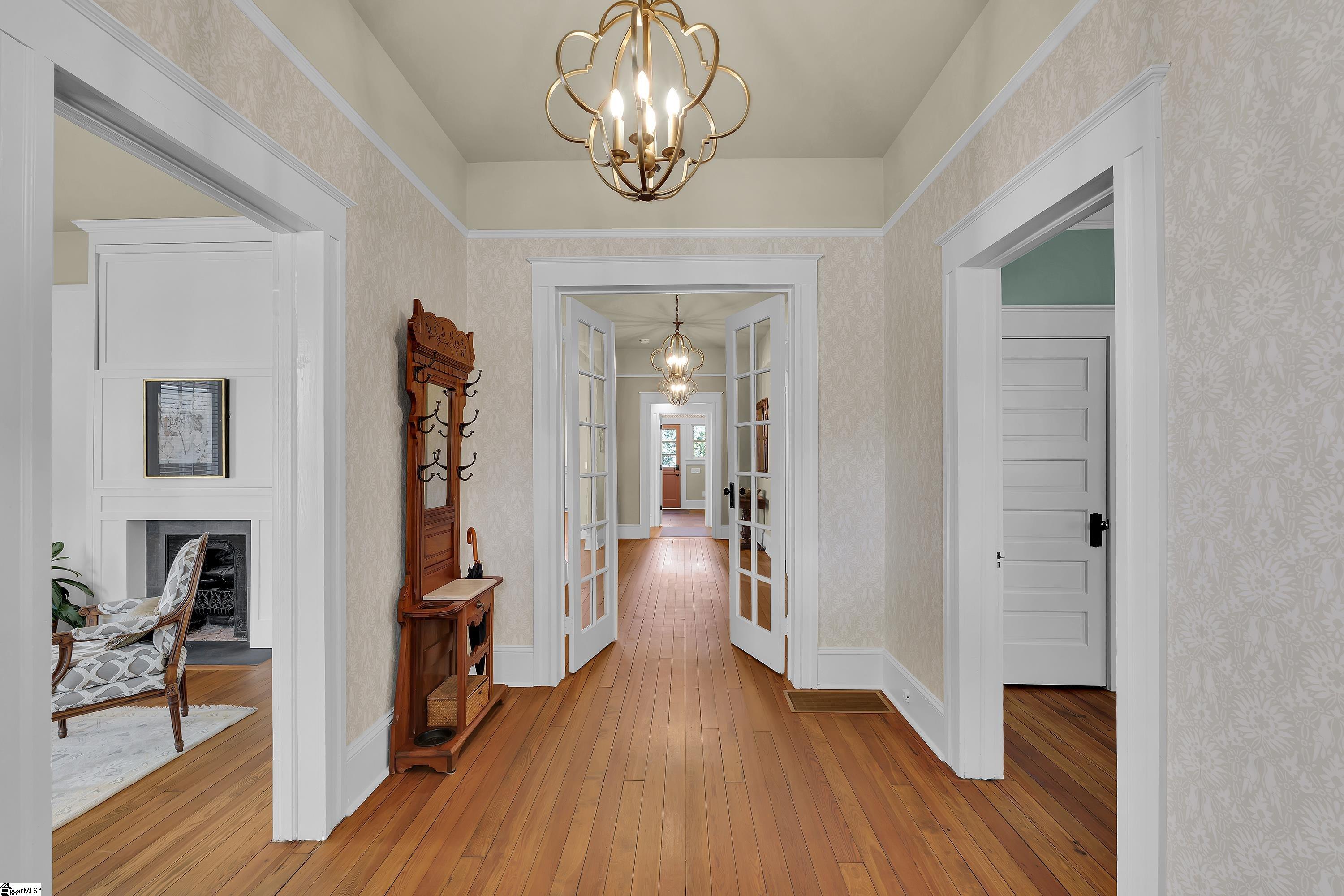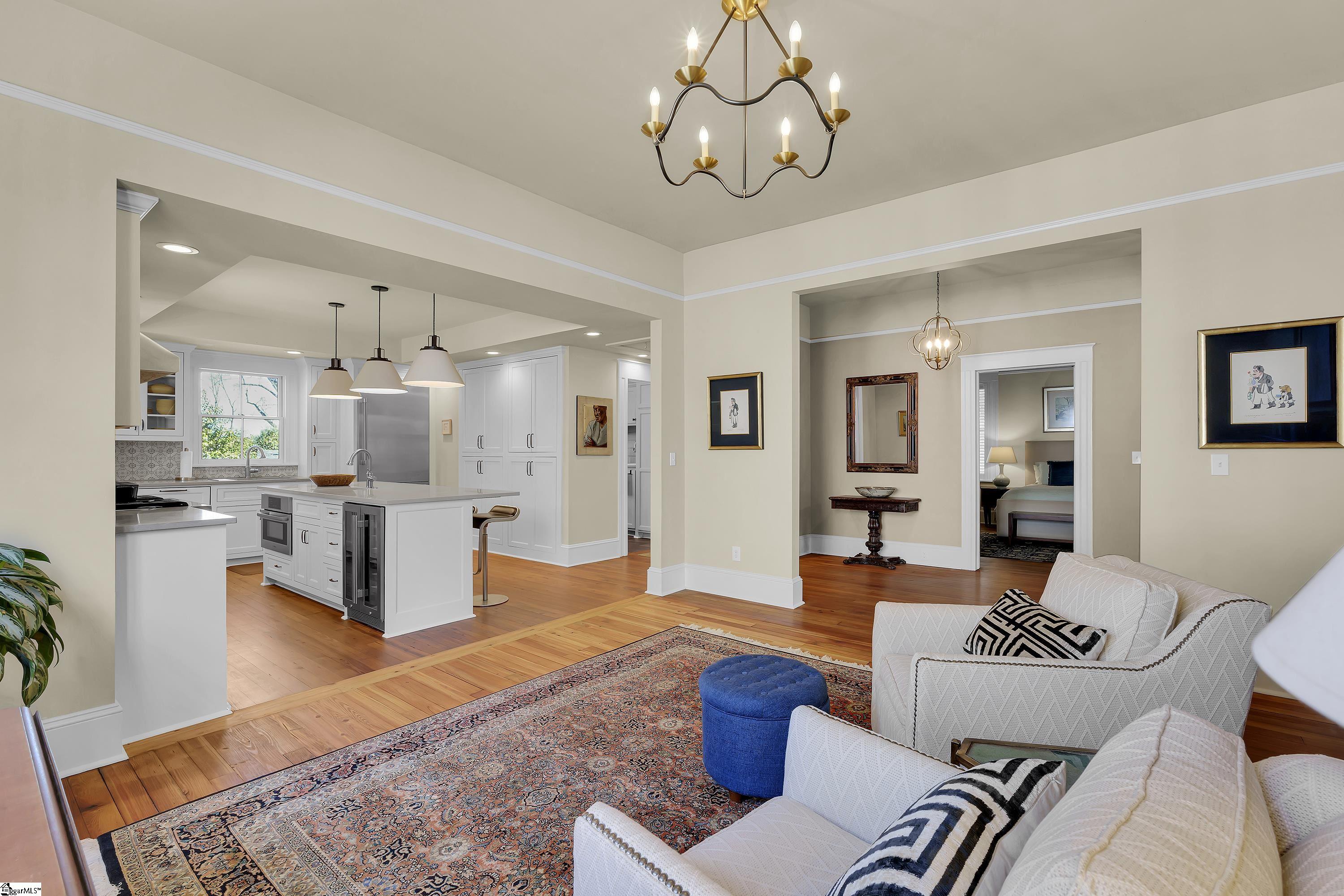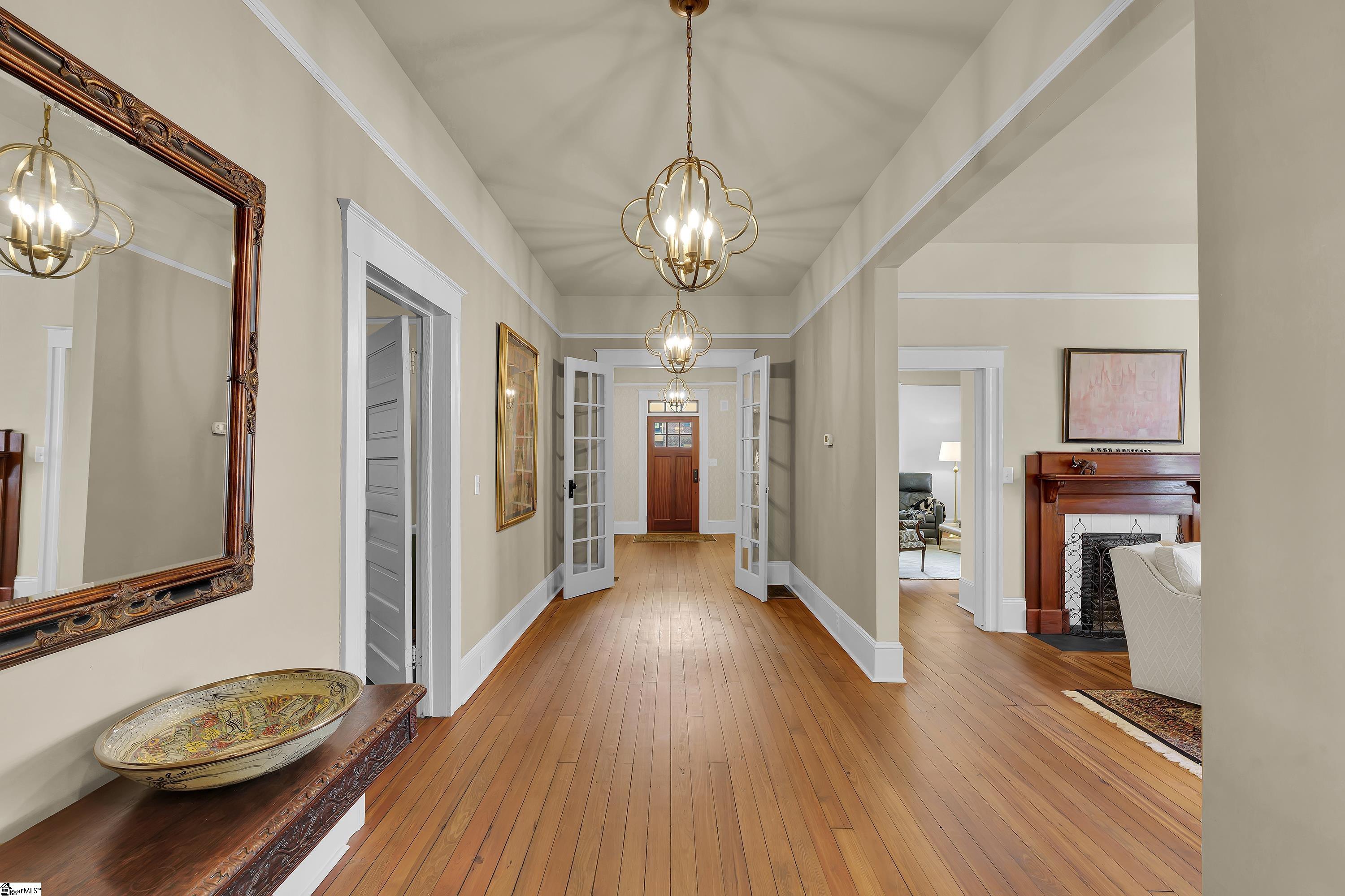 Welcome to 30 Pinckney Street, located in the historic Hampton-Pinckney neighborhood—Greenville’s National Register Historic District—where this beautifully restored 1905 home blends timeless character with modern living. Just a 10-minute walk to Main Street and only minutes to Unity Park, this property provides walkable access to Greenville’s award-winning restaurants, shops, parks, and the Swamp Rabbit Trail. Fully and thoughtfully renovated, this move-in-ready home preserves its historic charm while featuring stylish updates throughout. The beautifully designed kitchen is the heart of the home with custom white cabinetry, Thermador appliances, artesian-stone tile backsplash, oversized island with a prep sink, a built-in speed oven microwave, and a generous wine chiller—perfect for entertaining and everyday living. Original heart-pine floors run throughout the home, complemented by tile in the bathrooms and laundry room. A traditional center hallway floorplan creates a natural flow from room to room, while large, oversized windows fill the home with natural light. Four original fireplaces add character in the living room, dining room, and both bedrooms. The primary suite offers a relaxing retreat with two closets, large vanity with an oversized sink, soaking tub, and a walk-in shower with built-in seat and multiple shower heads. A laundry room with sink and cabinetry adds everyday convenience. Outdoor living is just as inviting, with a welcoming front porch, and an additional screened porch, deck, and patio overlooking the private fenced backyard—ideal for relaxing evenings or entertaining guests. The property also includes a storage shed with electricity and an extra-long paved driveway, providing ample parking. Renovated historic homes in downtown Greenville with this level of character, outdoor living, and walkability rarely come available, making this an incredible opportunity to enjoy modern comfort and timeless character in one of the city’s most sought-after neighborhoods.