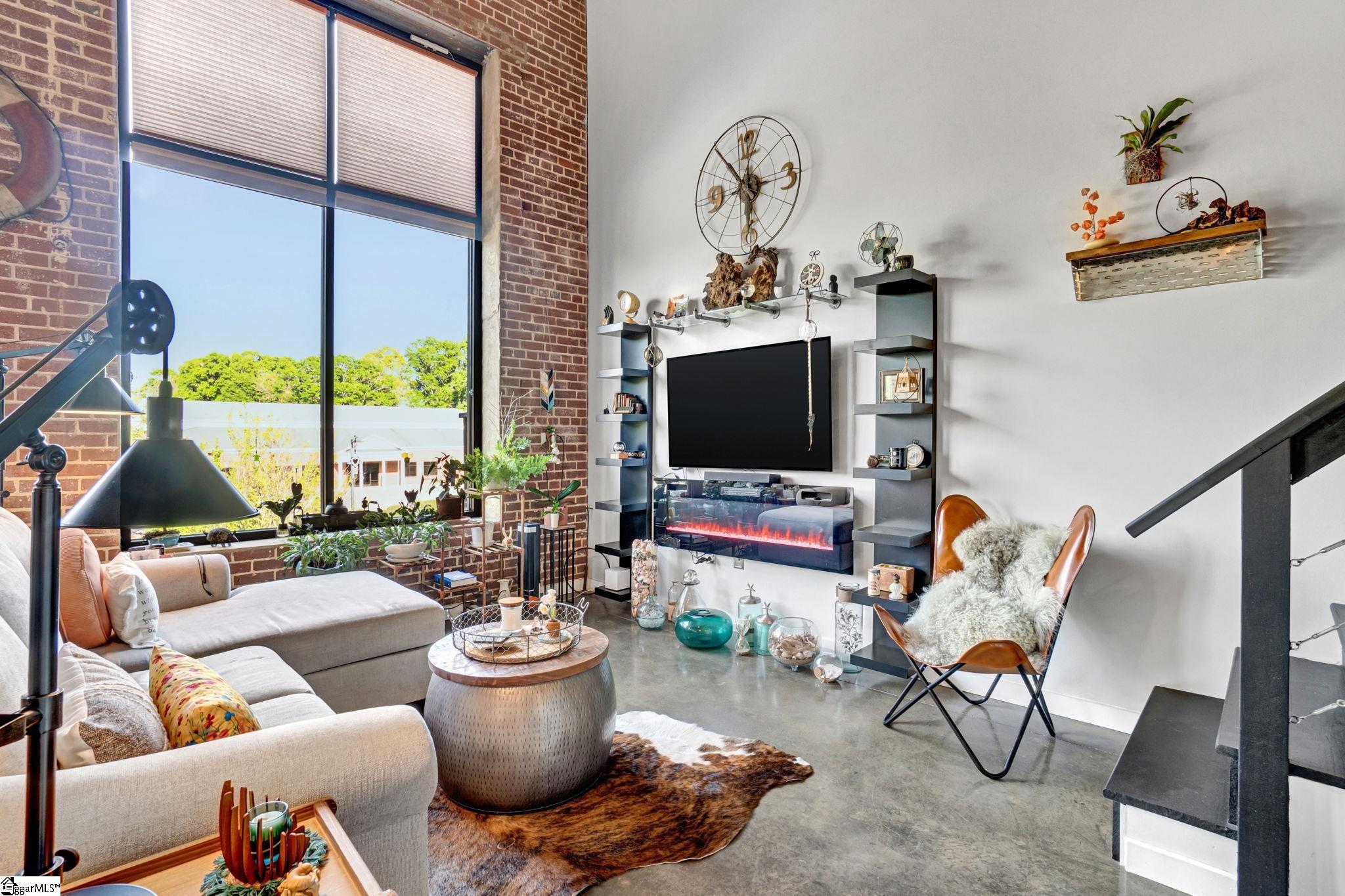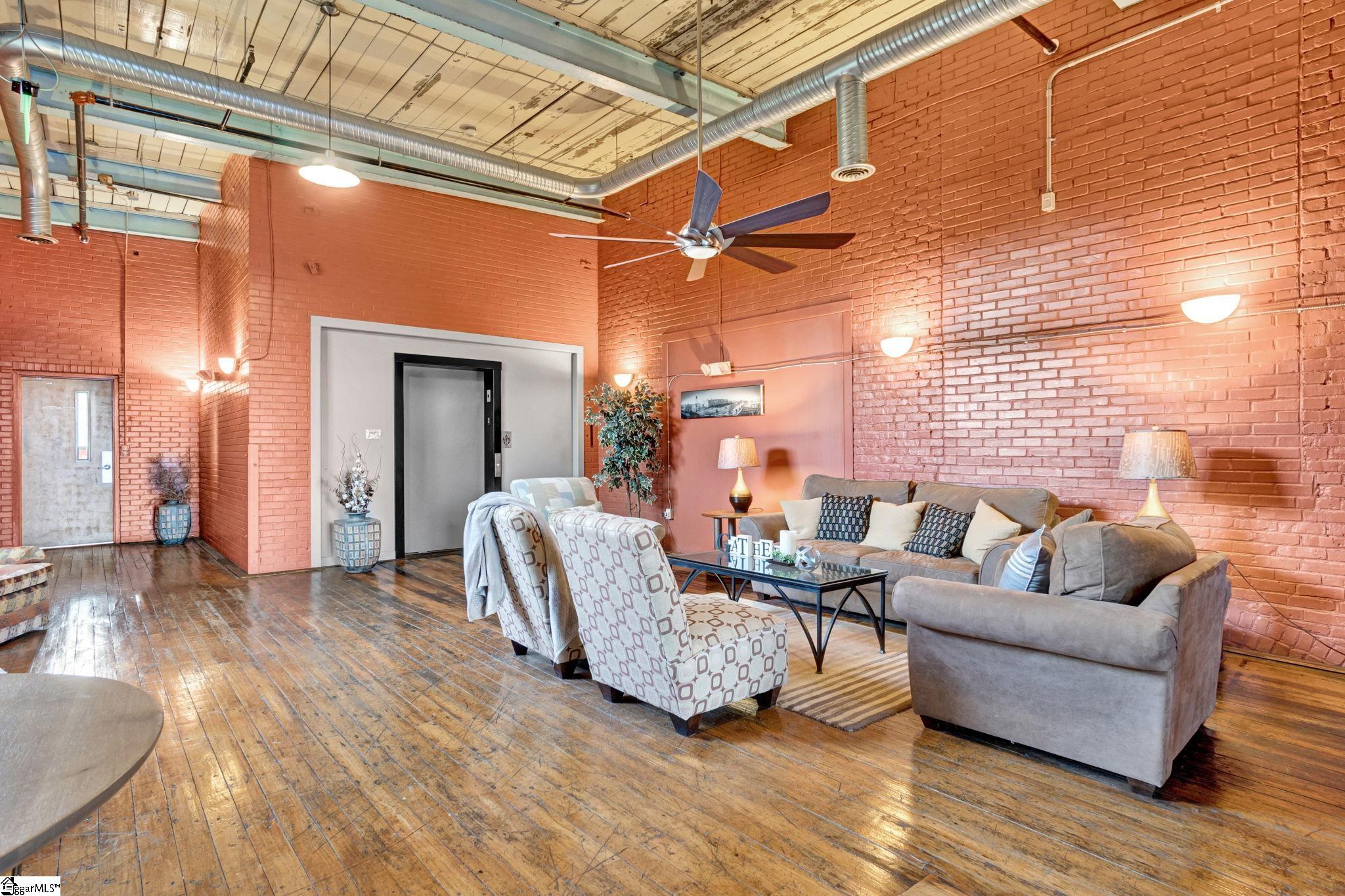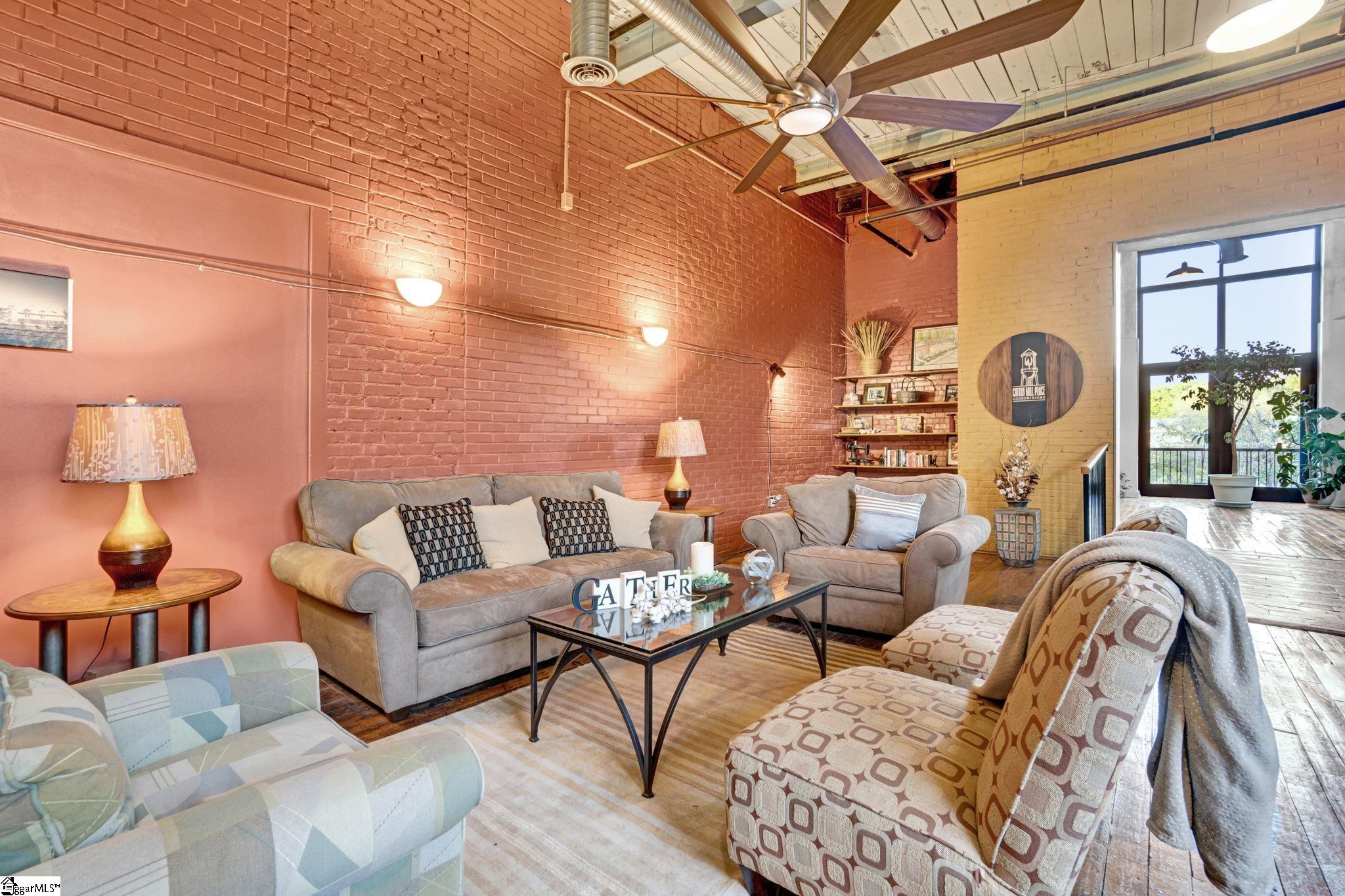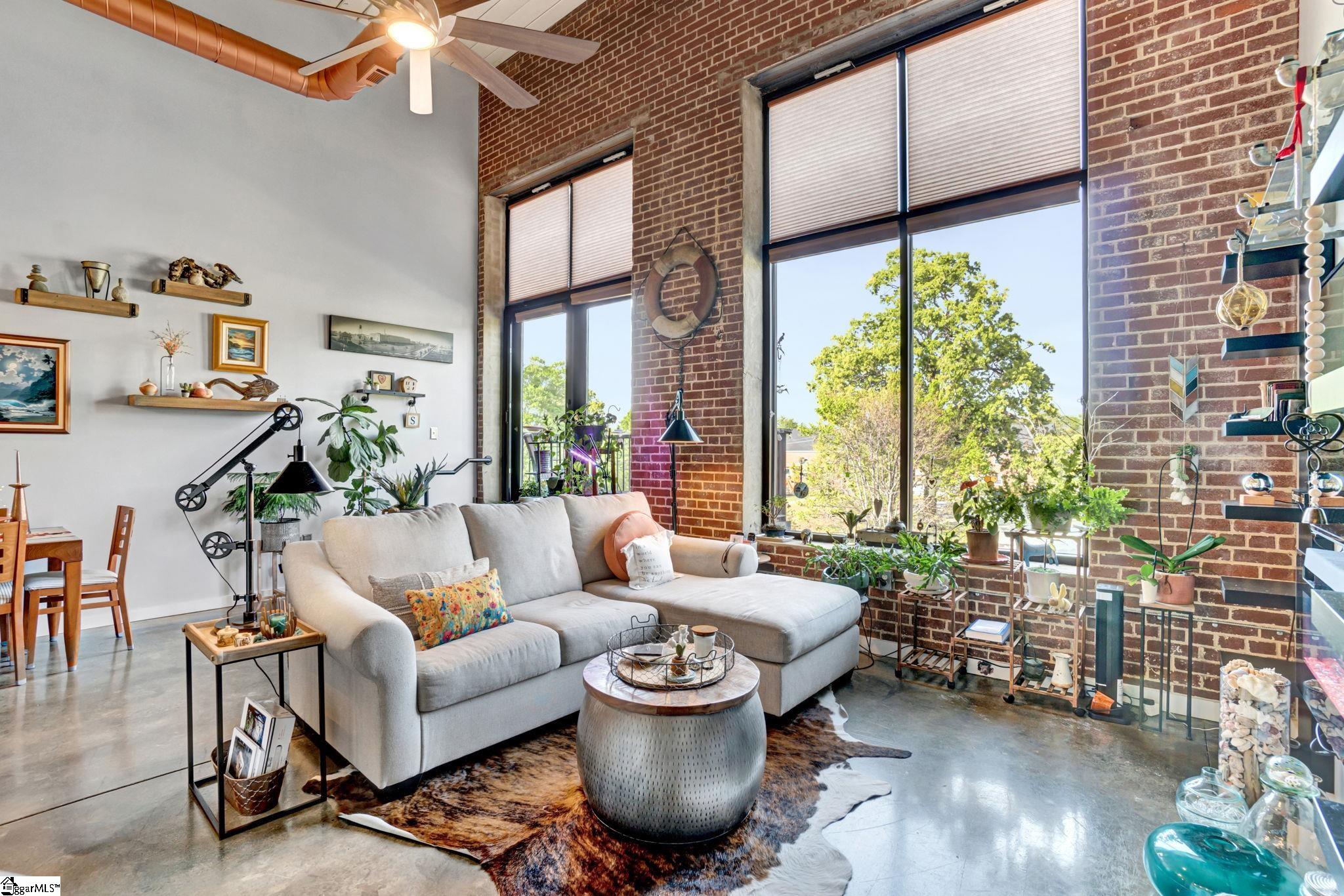 Unique Contemporary Living with Vintage Appeal! This well-maintained 2 BR, 1 BA condo offers an open, airy floor plan highlighted by 18-foot ceilings and oversized windows that fill the space with natural light. Distinctive architectural details – including original brick walls, wood ceilings, exposed beams, and columns – create a warm, character-rich atmosphere. The spacious 16’ x 14’ second bedroom/loft provides flexible living options and can be used as a bedroom, office, or additional living space. Just off the great room, a quaint balcony offers a private outdoor retreat. Community amenities include on-site fitness center, community room, beautifully maintained courtyard with tables/benches, serene pond w/ swings and deck area. A 90 sq. ft. climate-controlled private storage unit adds valuable convenience.Ideally located with quick access to I-85/I-385 and within walking distance to Historic Downtown Simpsonville, this property offers both charm and accessibility.