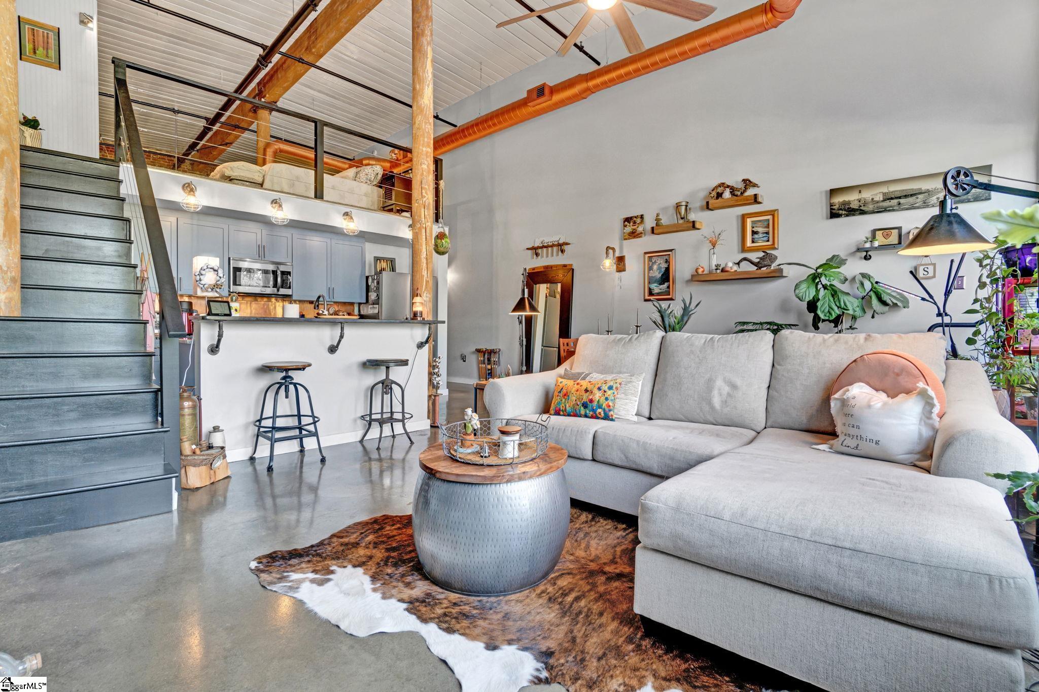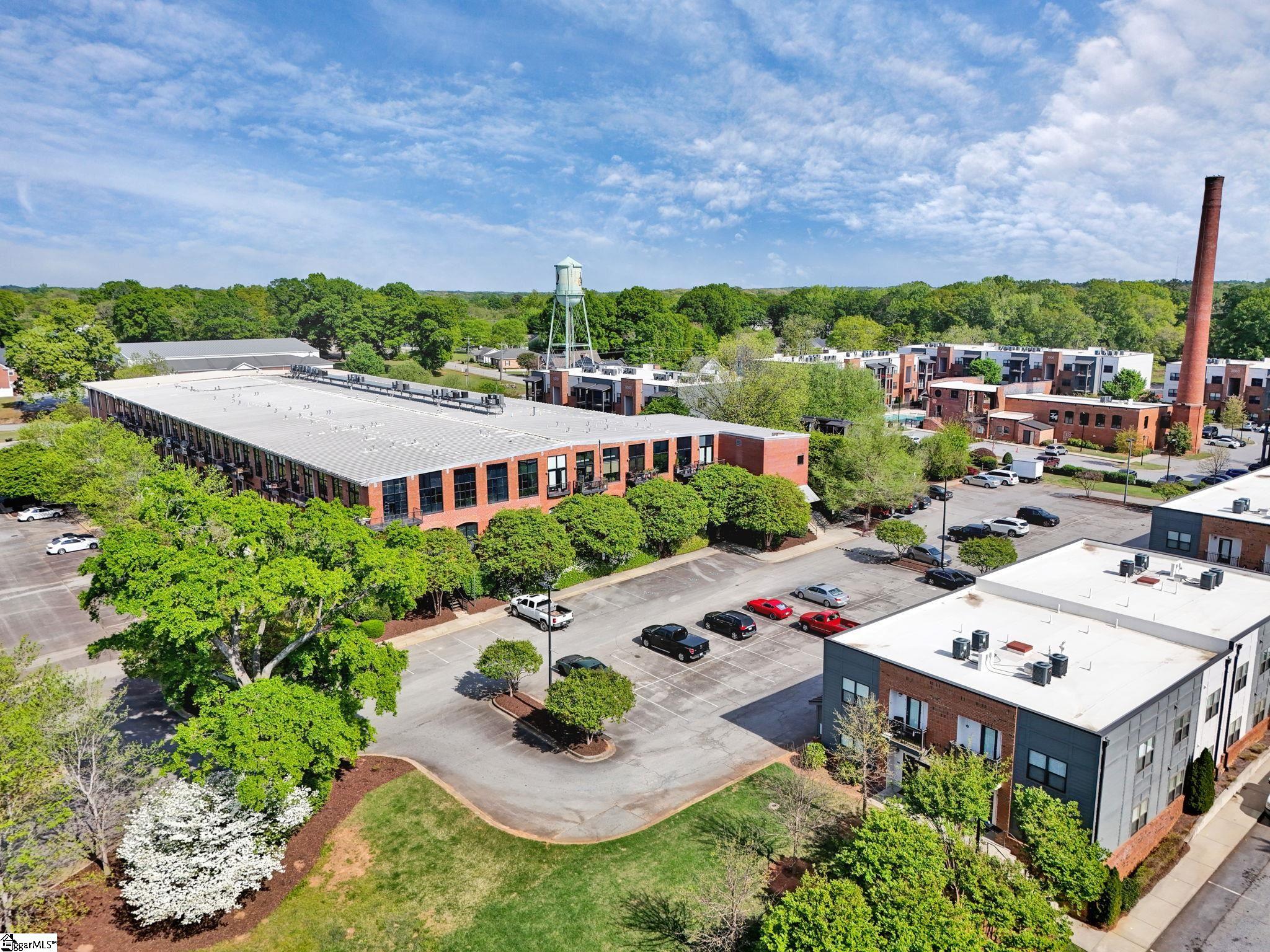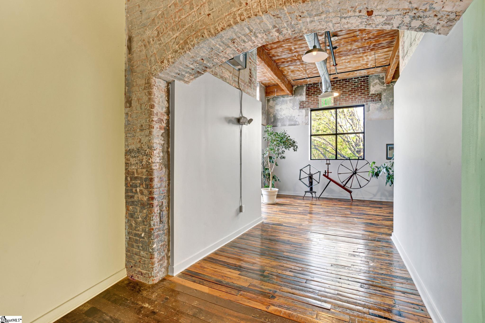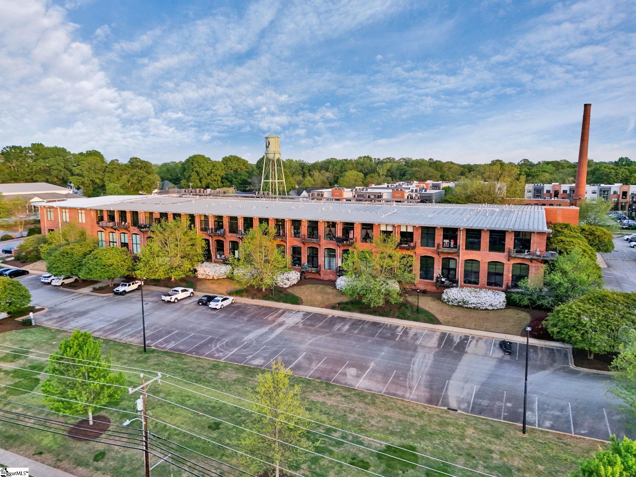 Unique Contemporary Living with Vintage Appeal! This well-maintained 2 BR, 1 BA condo offers an open, airy floor plan highlighted by 18-foot ceilings and oversized windows that fill the space with natural light. Distinctive architectural details – including original brick walls, wood ceilings, exposed beams, and columns – create a warm, character-rich atmosphere. The spacious 16’ x 14’ second bedroom/loft provides flexible living options and can be used as a bedroom, office, or additional living space. Just off the great room, a quaint balcony offers a private outdoor retreat. Community amenities include on-site fitness center, community room, beautifully maintained courtyard with tables/benches, serene pond w/ swings and deck area. A 90 sq. ft. climate-controlled private storage unit adds valuable convenience.Ideally located with quick access to I-85/I-385 and within walking distance to Historic Downtown Simpsonville, this property offers both charm and accessibility.