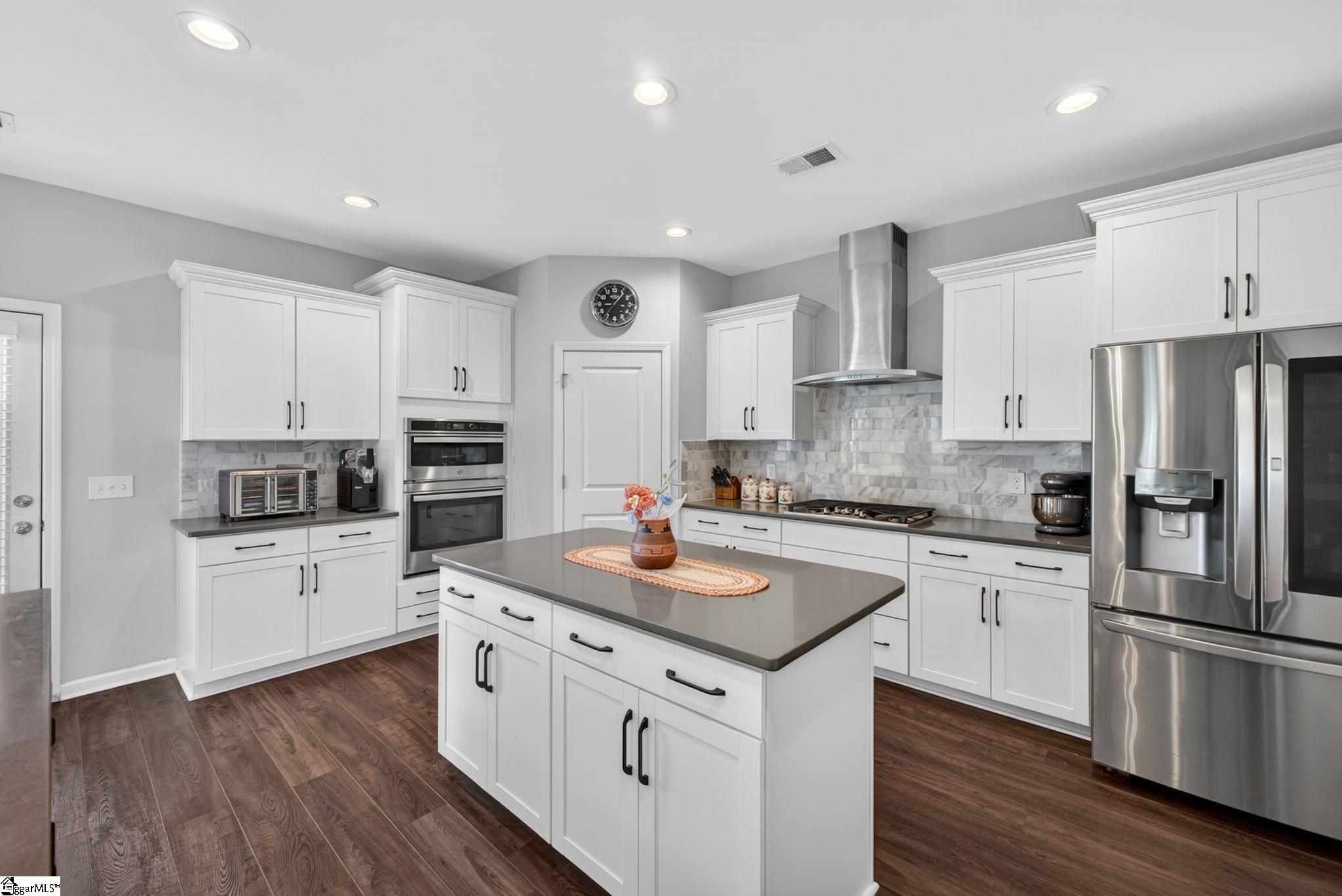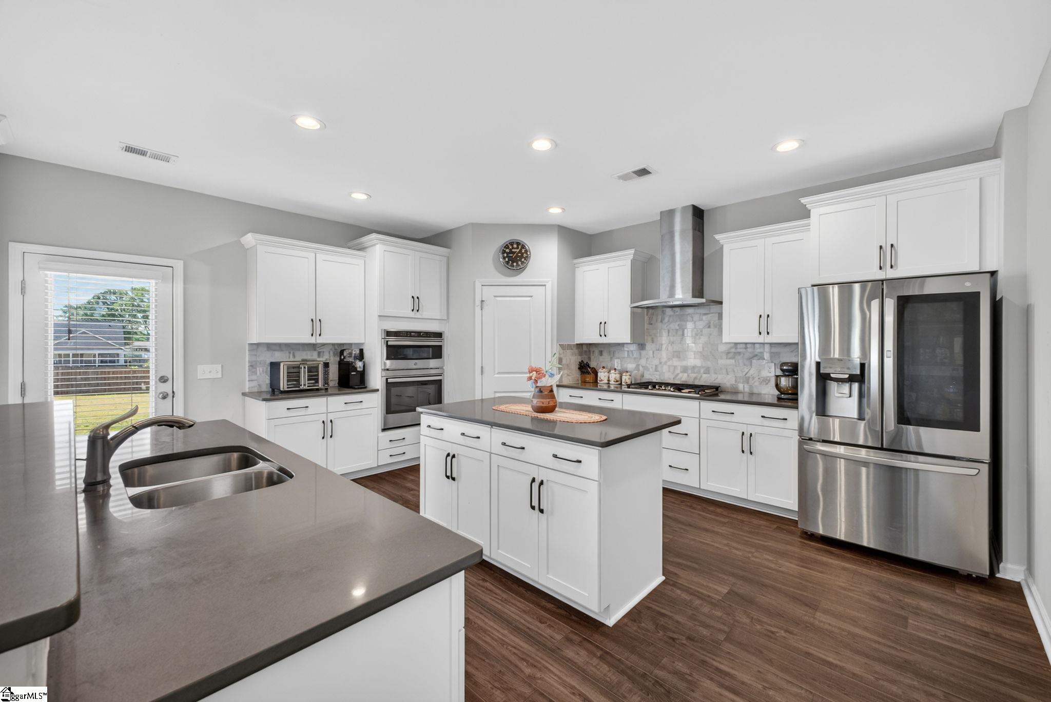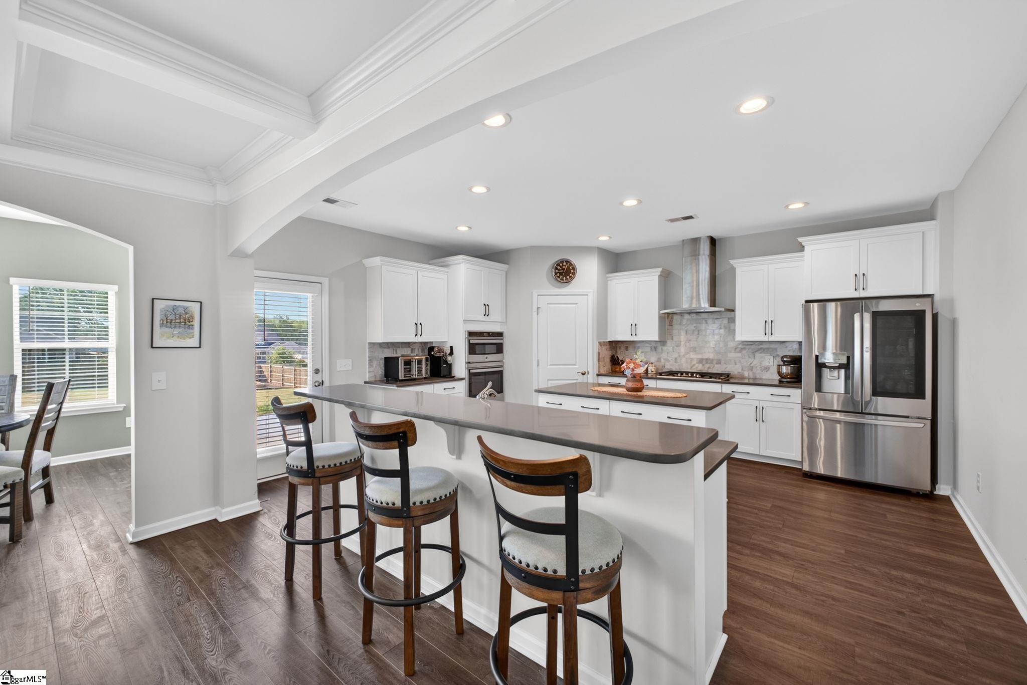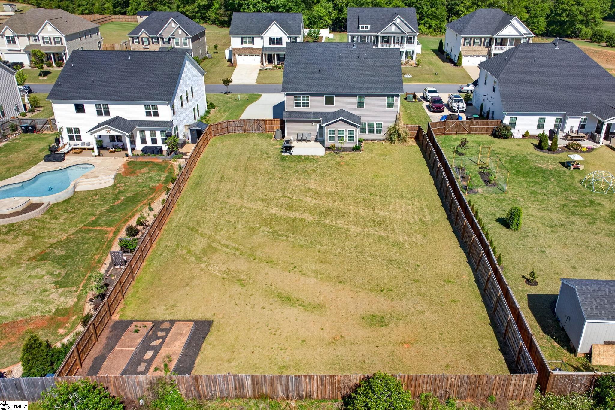 Imagine stepping into a bright two-story foyer that opens to a dream entertaining space. This stunning home offers an open-concept layout that seamlessly connects the spacious great room, dining room, sunroom, and chef’s kitchen. The gourmet kitchen is designed to impress with two islands, quartz countertops, abundant cabinet and counter space, custom tile backsplash, stainless steel appliances, gas cooktop, wall oven, built-in microwave, and a large walk-in pantry. The dining area has a coffered ceilings and comfortably seats eight, making it the heart of the home. Just off the kitchen, the sunroom, currently used as a dining area, overlooks the expansive backyard—perfect for morning coffee or relaxing at the end of the day. A main-level bedroom with access to a Jack-and-Jill-style bath offers a convenient space for guests or in-laws. Upstairs, you’ll find a large loft, walk-in laundry room, three additional bedrooms with walk-in closets, and well-appointed baths. The primary suite is a true retreat with a trey ceiling, oversized walk-in closet, double vanities, soaking tub, separate shower, and upgraded fixtures. Move-in ready and beautifully designed, this home features on-trend colors, LVP flooring, elegant archways, and upgraded lighting. Outside, enjoy a large patio, fully fenced backyard with raised garden beds, and almost a half acre. This yard is perfect for entertaining, gardening, play, pets, and more.
