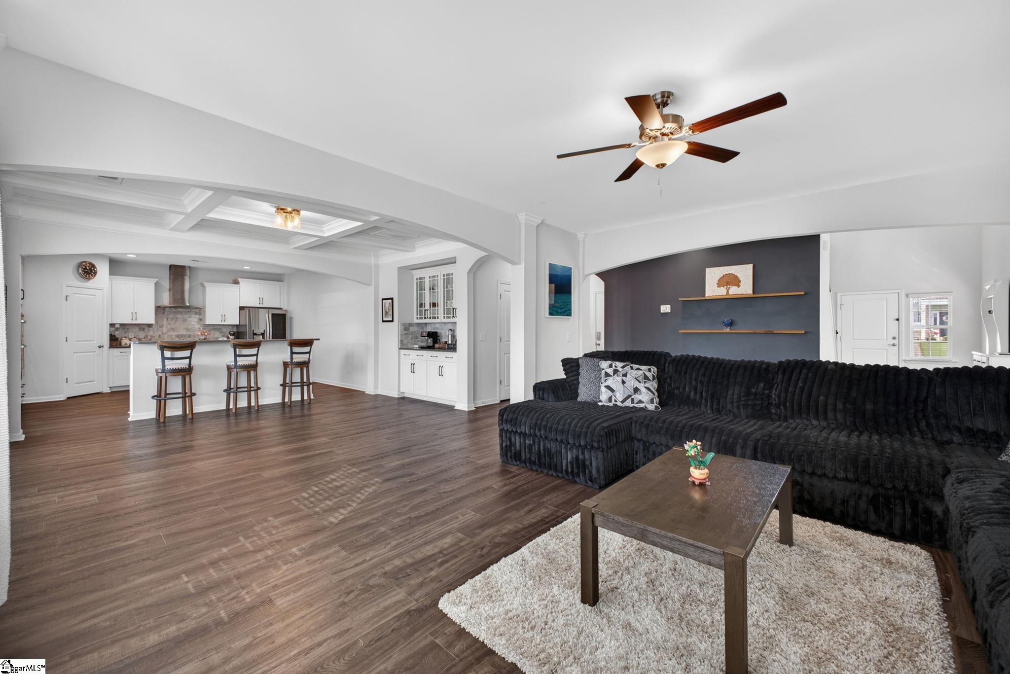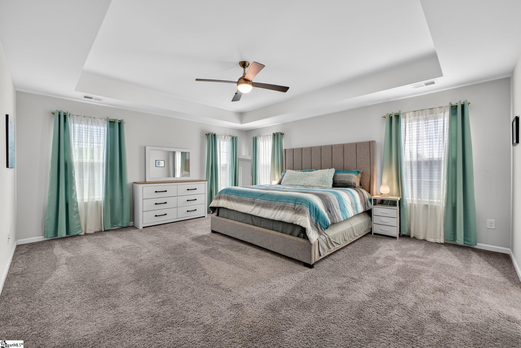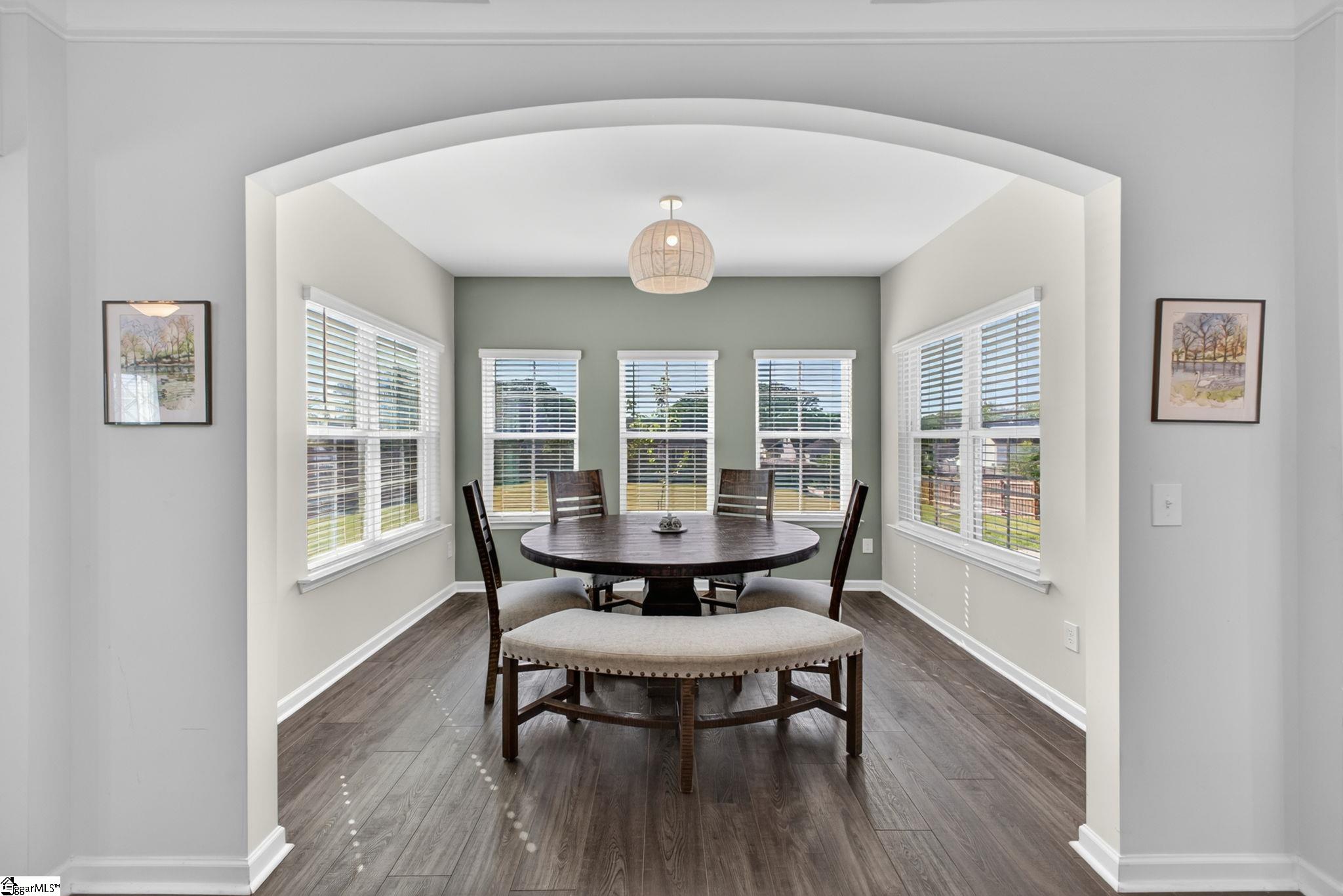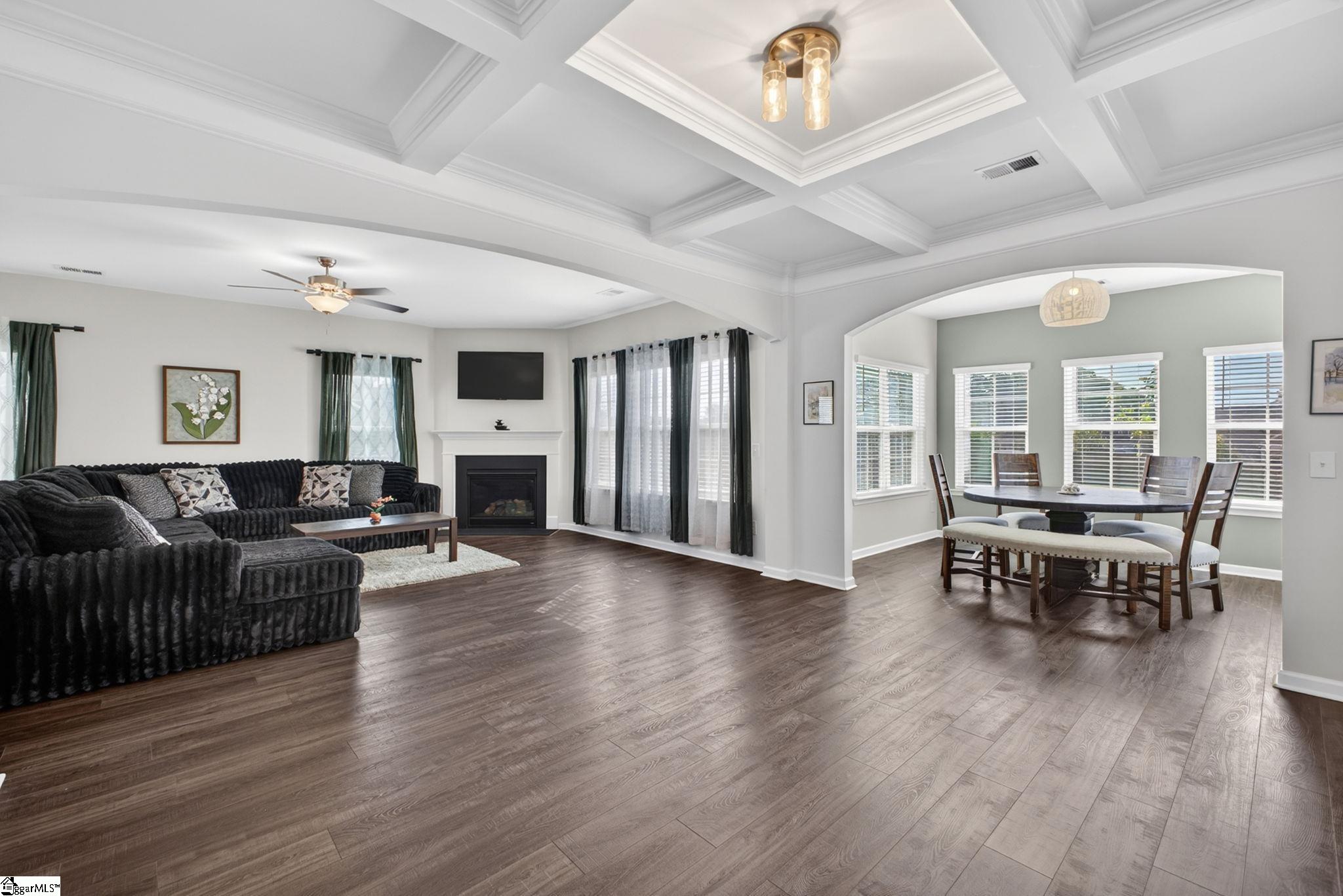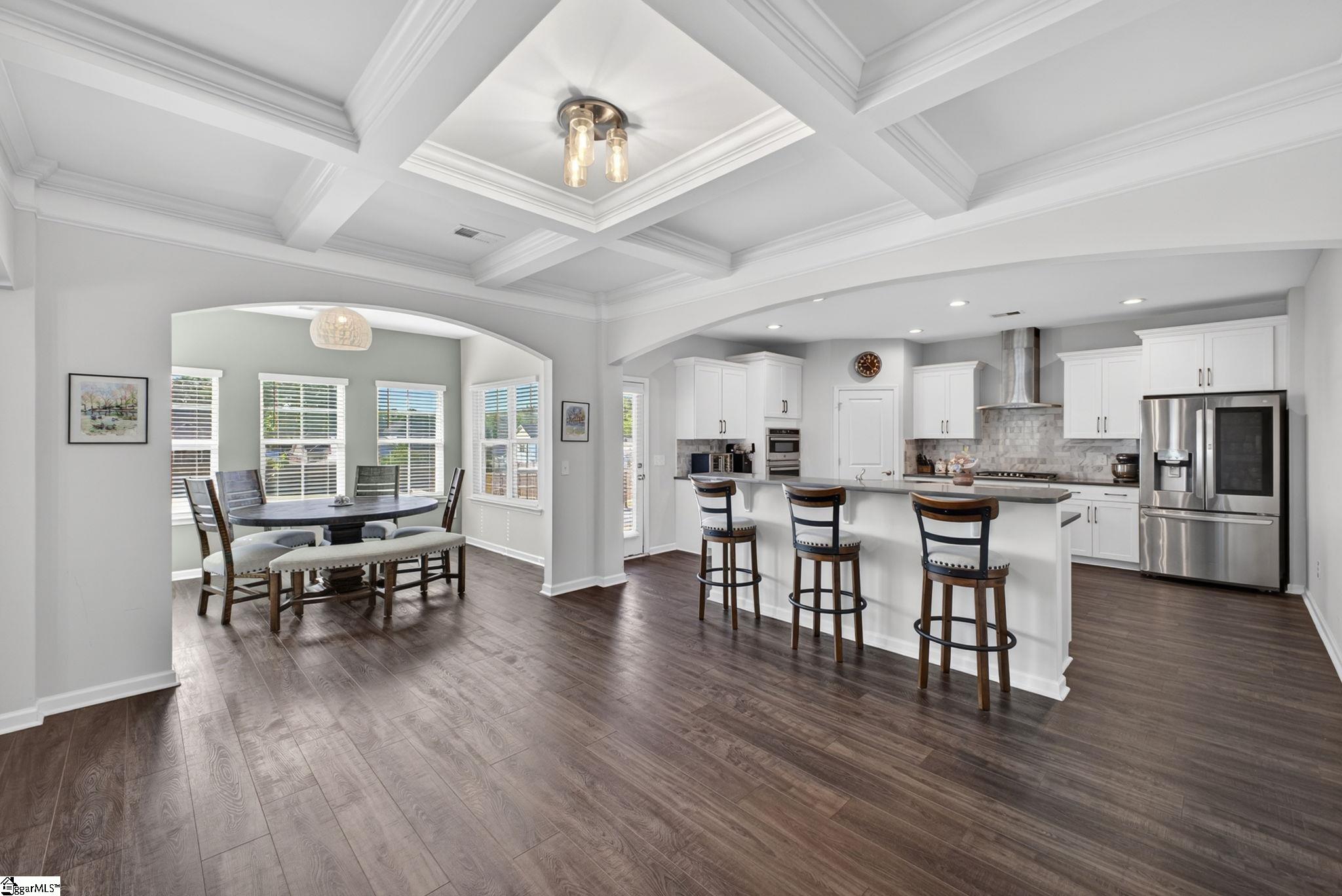 Imagine stepping into a bright two-story foyer that opens to a dream entertaining space. This stunning home offers an open-concept layout that seamlessly connects the spacious great room, dining room, sunroom, and chef’s kitchen. The gourmet kitchen is designed to impress with two islands, quartz countertops, abundant cabinet and counter space, custom tile backsplash, stainless steel appliances, gas cooktop, wall oven, built-in microwave, and a large walk-in pantry. The dining area has a coffered ceilings and comfortably seats eight, making it the heart of the home. Just off the kitchen, the sunroom, currently used as a dining area, overlooks the expansive backyard—perfect for morning coffee or relaxing at the end of the day. A main-level bedroom with access to a Jack-and-Jill-style bath offers a convenient space for guests or in-laws. Upstairs, you’ll find a large loft, walk-in laundry room, three additional bedrooms with walk-in closets, and well-appointed baths. The primary suite is a true retreat with a trey ceiling, oversized walk-in closet, double vanities, soaking tub, separate shower, and upgraded fixtures. Move-in ready and beautifully designed, this home features on-trend colors, LVP flooring, elegant archways, and upgraded lighting. Outside, enjoy a large patio, fully fenced backyard with raised garden beds, and almost a half acre. This yard is perfect for entertaining, gardening, play, pets, and more.