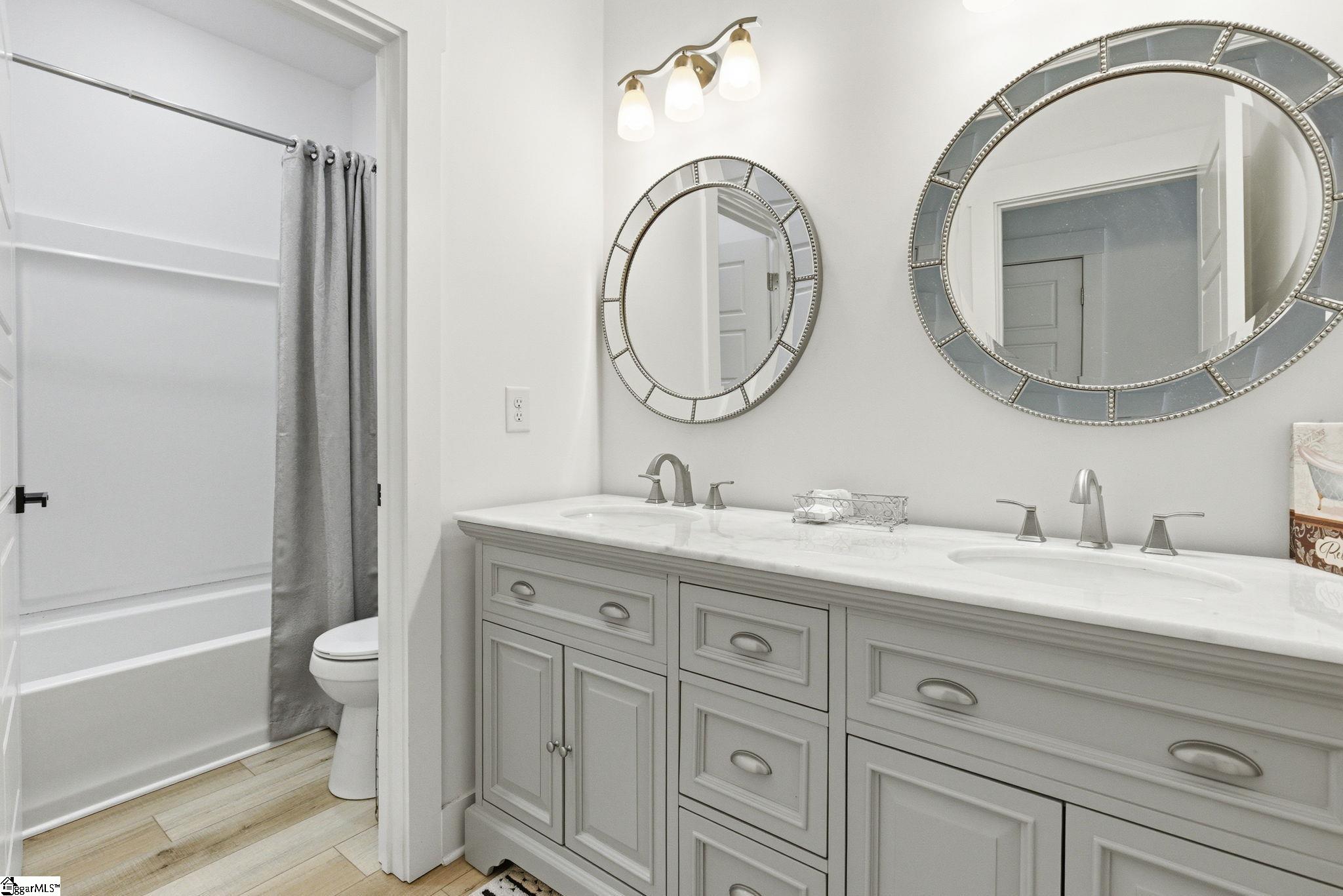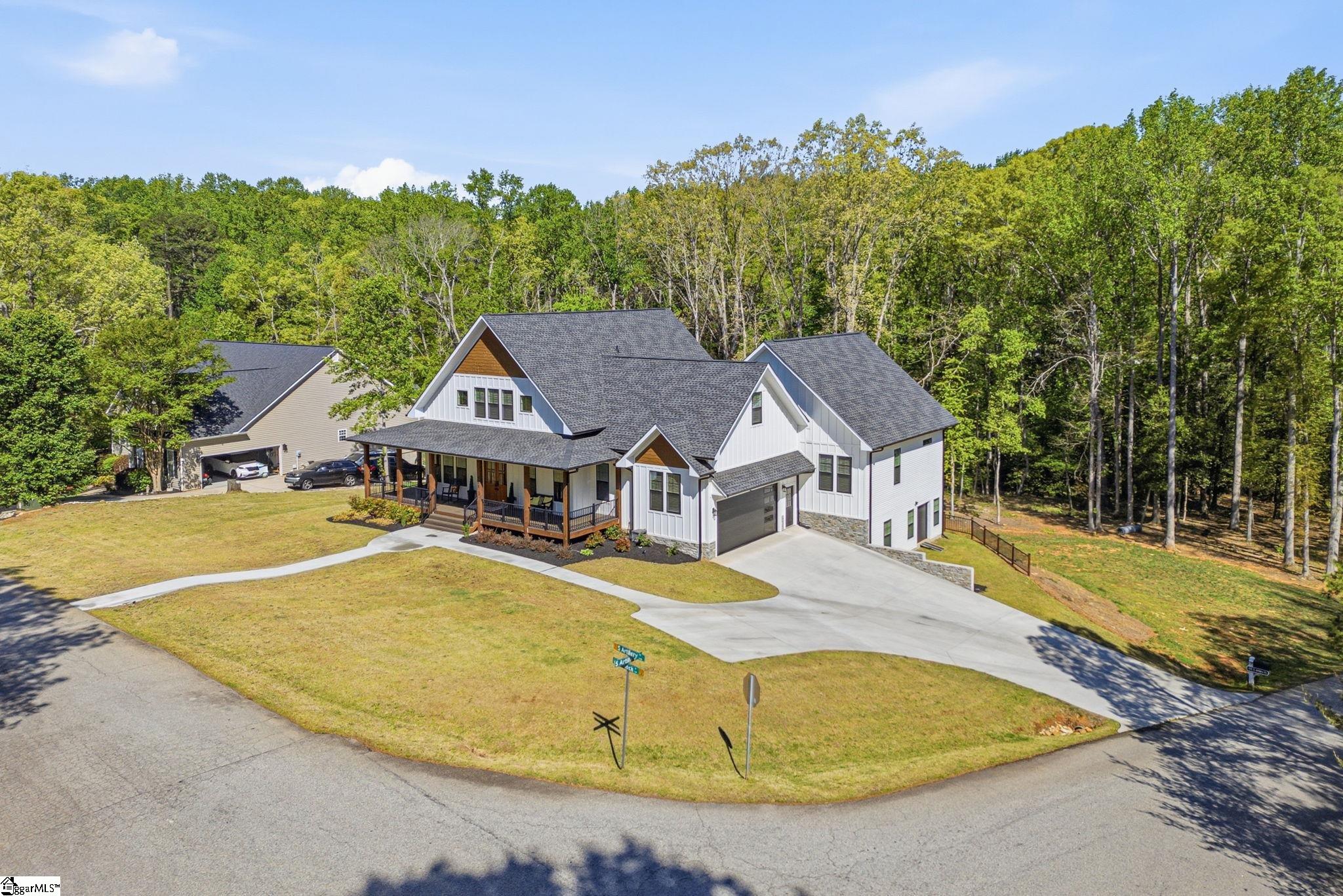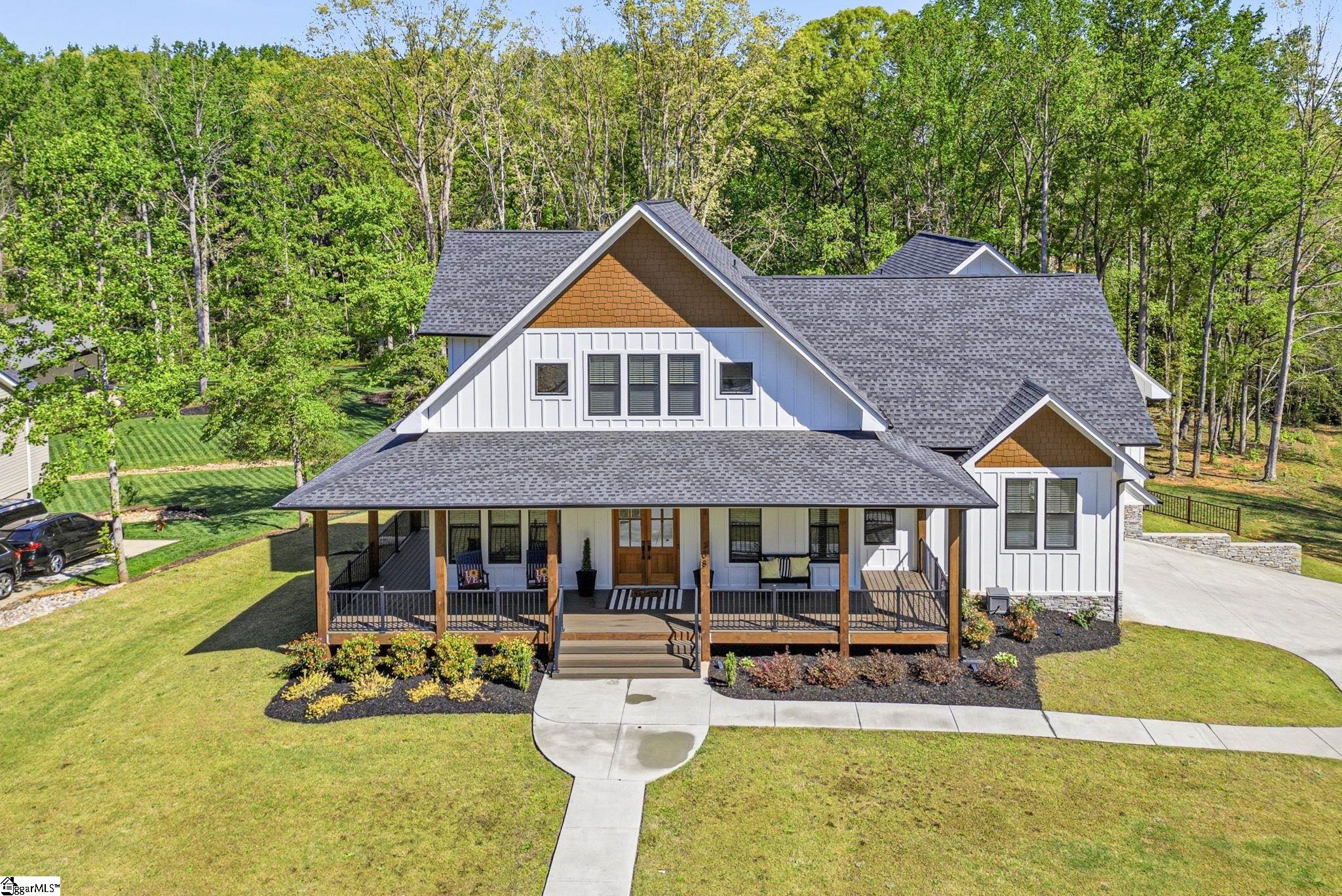 Welcome to a stunning, nearly-new Craftsman estate where timeless design meets modern luxury—perfectly positioned on a private, wooded 1.45-acre corner lot. This impressive 2-story home with a fully livable walkout basement offers over 6,200 square feet of thoughtfully designed living space. From the moment you arrive, the classic hardboard siding accented with stone and the inviting wraparound front porch set the tone for what’s inside. Step into an open-concept main level anchored by a chef’s kitchen featuring a large eat-at island, double wall ovens, and high-end appliances—ideal for entertaining or everyday living. The main-level primary suite is a true retreat, complete with a luxurious, well-appointed bath showcasing a freestanding soaking tub, oversized walk-in shower, and an expansive dressing room. A second main-level bedroom—currently used as an extension of the dressing space—offers flexibility and can easily be converted back into a sixth bedroom. A dedicated office/study and screened porch add both function and comfort. Upstairs, you’ll find three spacious bedrooms, along with a versatile loft and additional rec space—perfect for study, relaxation, or play. In addition is a finished attic storage area. The fully finished basement expands the home’s possibilities with a second primary suite, full kitchen, media room, recreation room, Den, workshop, and abundant storage with convenient garage door access. Walk out onto an impressive 43’ x 28’ patio overlooking the serene, tree-lined backyard. Additional highlights include multiple water heaters, conditioned walk-in attic storage, and a side-entry oversized two-car garage. Enjoy the best of both worlds—peaceful, nature-filled surroundings in a neighborhood known for its larger lots and privacy, while still being just 15 minutes from shopping, dining, and everyday conveniences, and approximately 30 minutes to GSP International Airport. Located near highly regarded schools, this home truly offers space, flexibility, and lifestyle without compromise. Key Features: 5 Bedrooms (potential 6) | 4 Full Baths | 2 Half Baths Over 6,200 sq ft of living space 1.45-acre private, wooded corner lot Wraparound front porch + screened porch Main-level primary suite with luxury bath & dressing room Open-concept living with high-end kitchen & large island Double wall ovens + premium appliances Dedicated office/study on main Fully finished walkout basement with: Second primary suite Full kitchen Media room + rec room Workshop + storage with garage access Expansive 43’ x 28’ outdoor patio 3 bedrooms upstairs + loft + additional rec space Side-entry 2-car garage Multiple water heaters Conditioned walk-in attic storage Quiet, wooded neighborhood with spacious homesites Convenient to shopping, dining & major routes Approx. 30 minutes to GSP International Airport