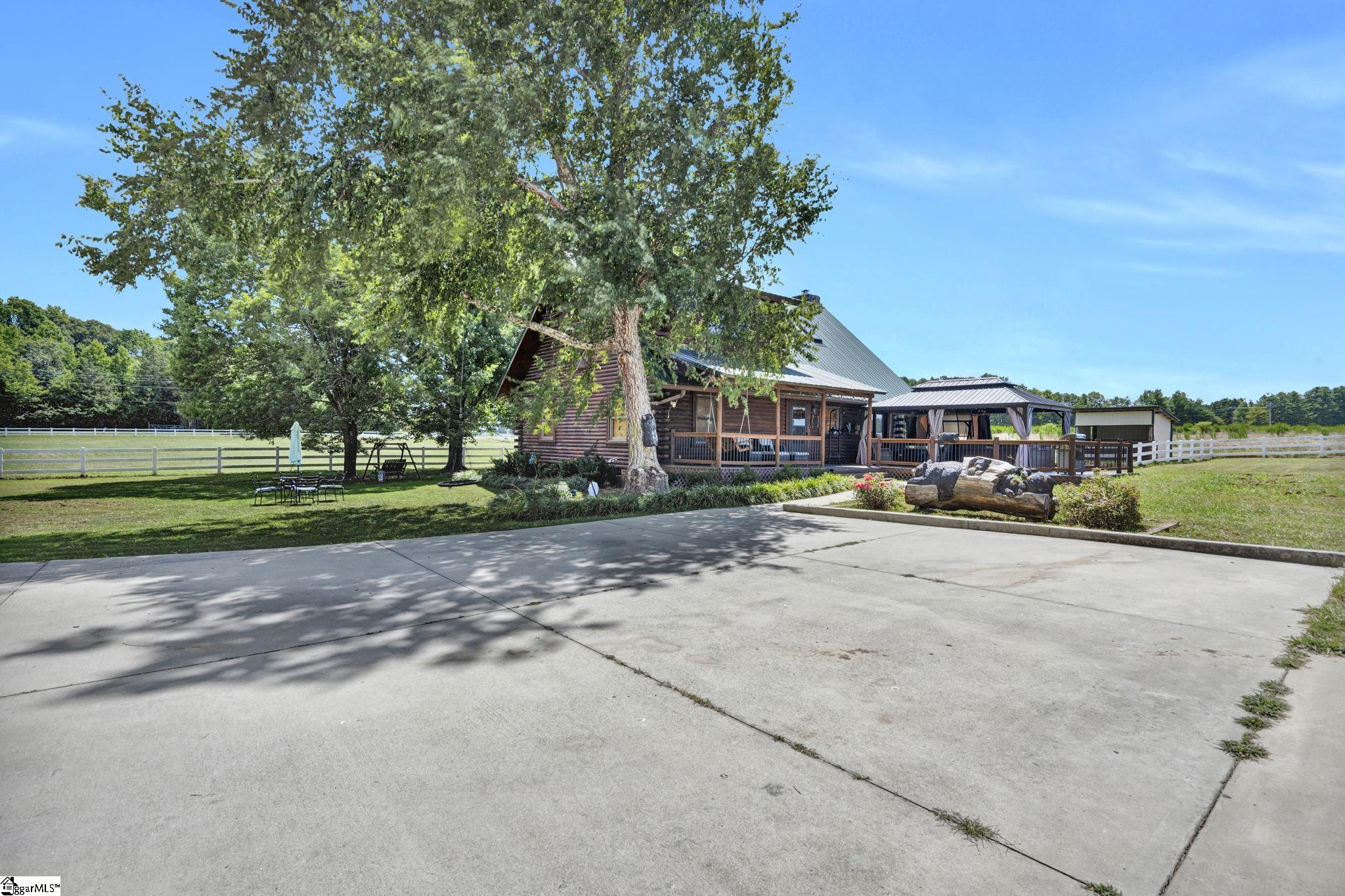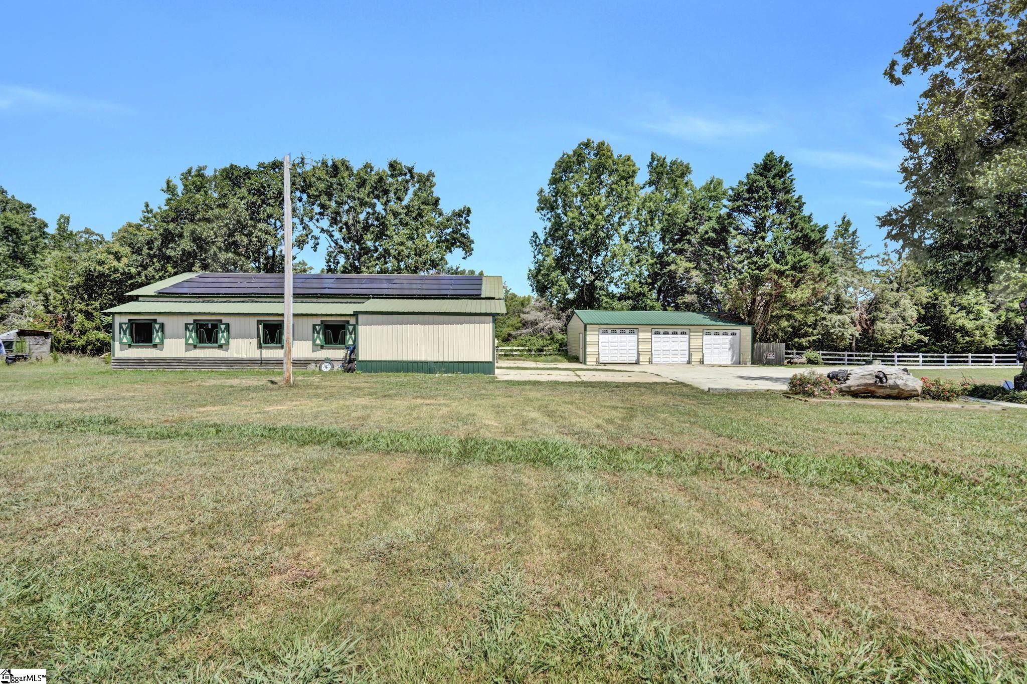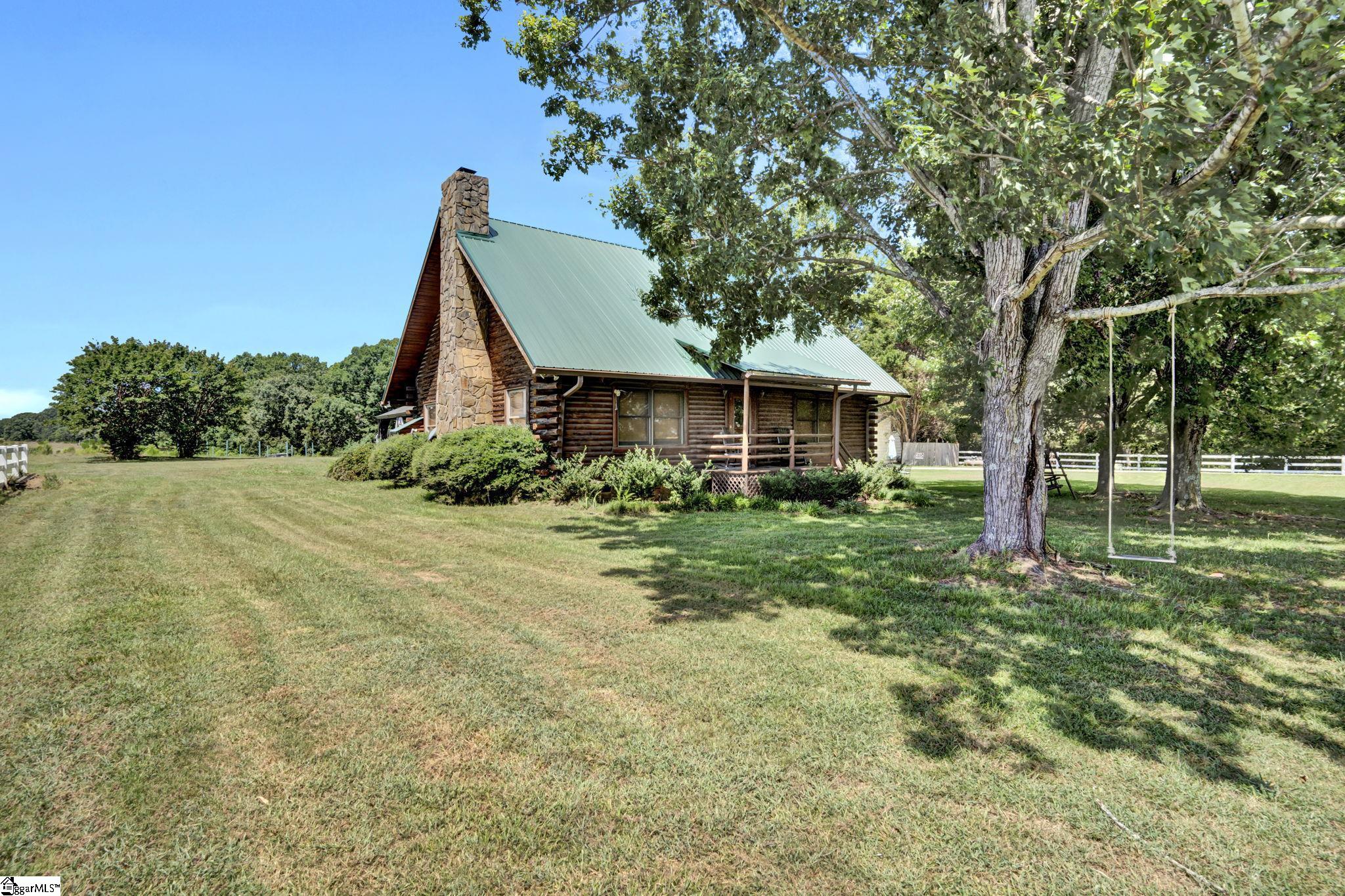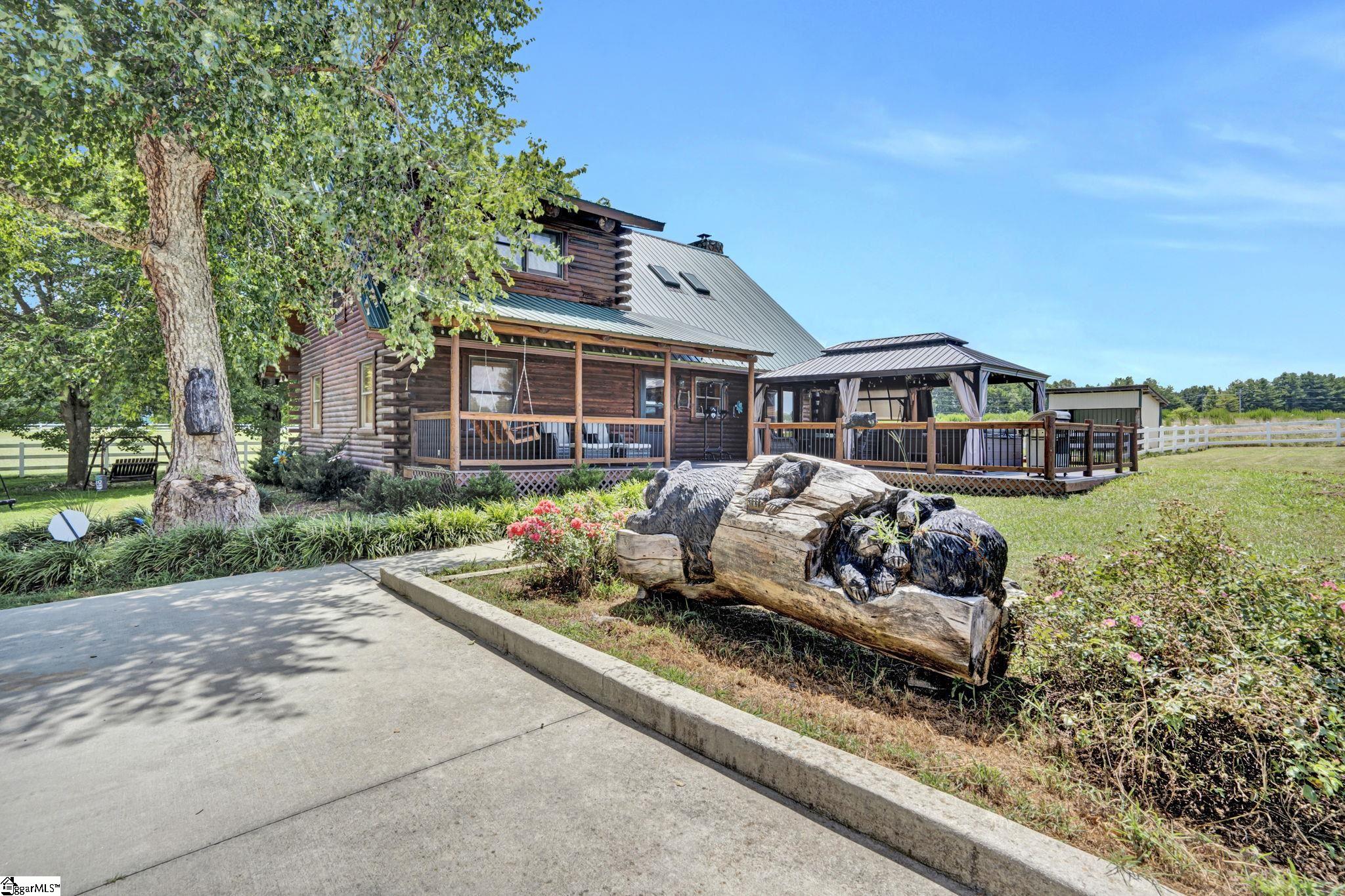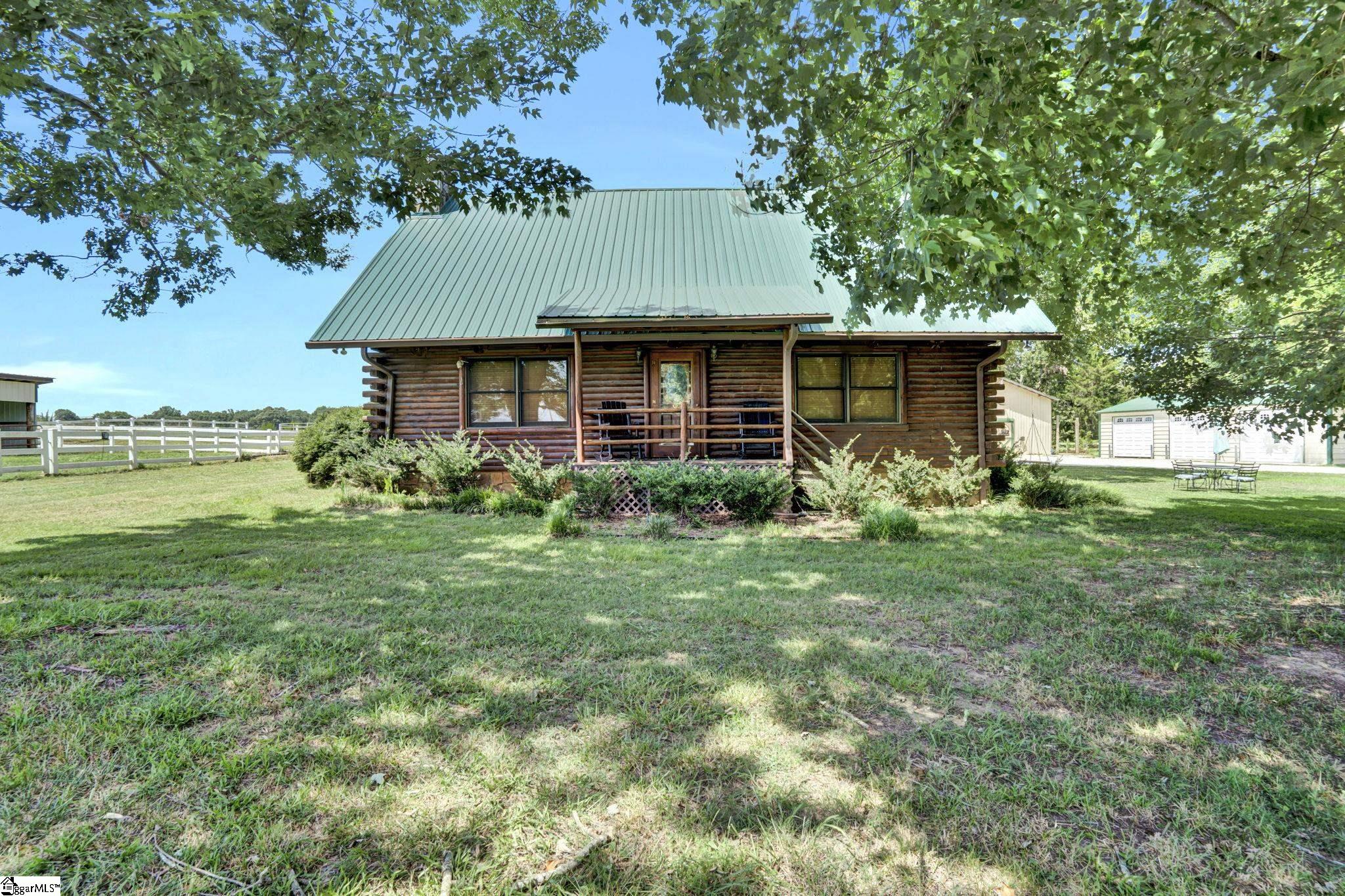 Home being Sold As-Is. Welcome to 313 Henderson Rd in Gray Court, SC—a modern rustic retreat set on approximately 5.92 acres of level, pasture-like land with a standing pond. This custom log-style home offers 3 bedrooms, 2 full baths, and approximately 2,060 sq ft of charming, energy-efficient living space. The property features excellent parking and storage, including a detached 3-car garage and an additional 1-car garage attached to the barn, providing ample space for vehicles, equipment, or hobbies. With 40 owned solar panels powering the home, barn, and detached garage, electric costs are nearly nonexistent. Inside, you’ll find vaulted ceilings, wood floors, granite countertops, and insulated windows. The cozy living room showcases cathedral-style vaulted ceilings and a wood stove, while the kitchen includes an electric cooktop, built-in microwave, and a bright breakfast nook. The spacious upstairs primary suite is a true retreat, featuring a jetted tub and a walk-in closet. Outdoor living shines with covered front and back porches, a hot tub, and a barn/stall plus multiple outbuildings, all equipped with electric and water—ideal for a mini-farm or hobby homestead. The standing pond adds to the property’s peaceful, country setting and usability. Zoned for Gray Court-Owings schools and Laurens District 55, this unique property offers privacy, sustainability, and versatility. Schedule your private showing today.