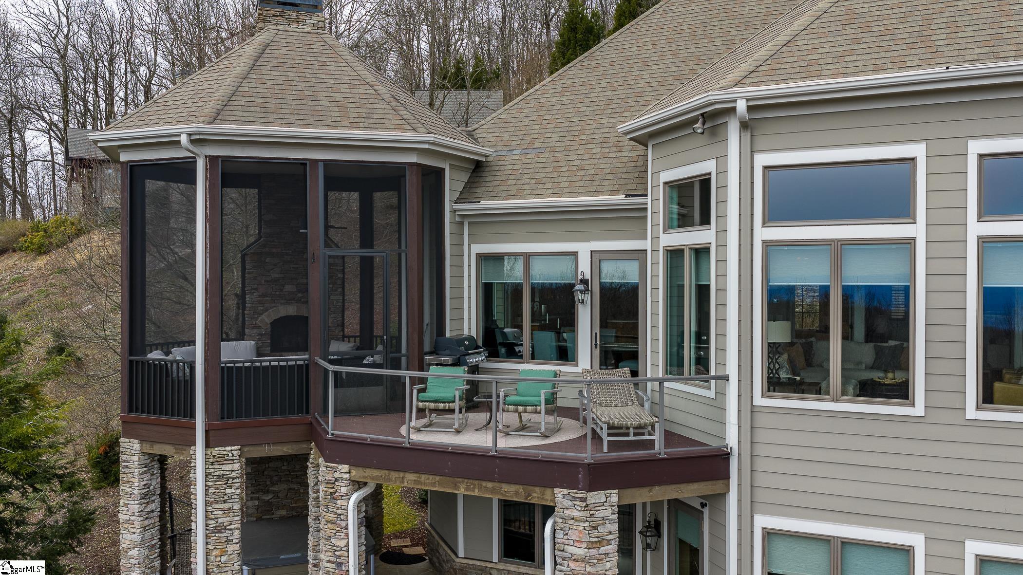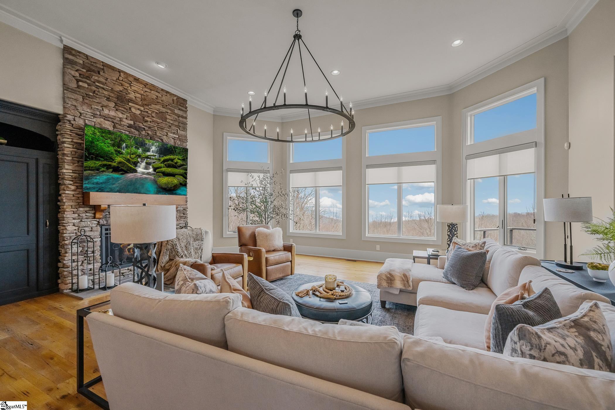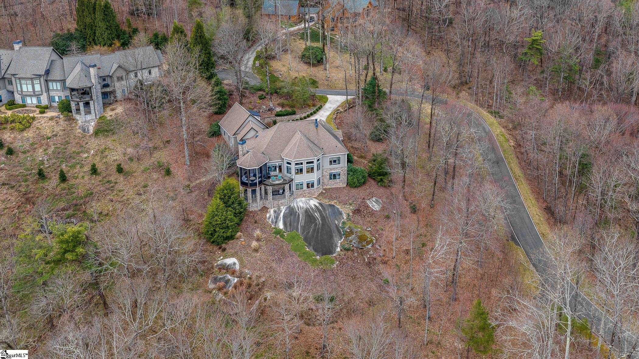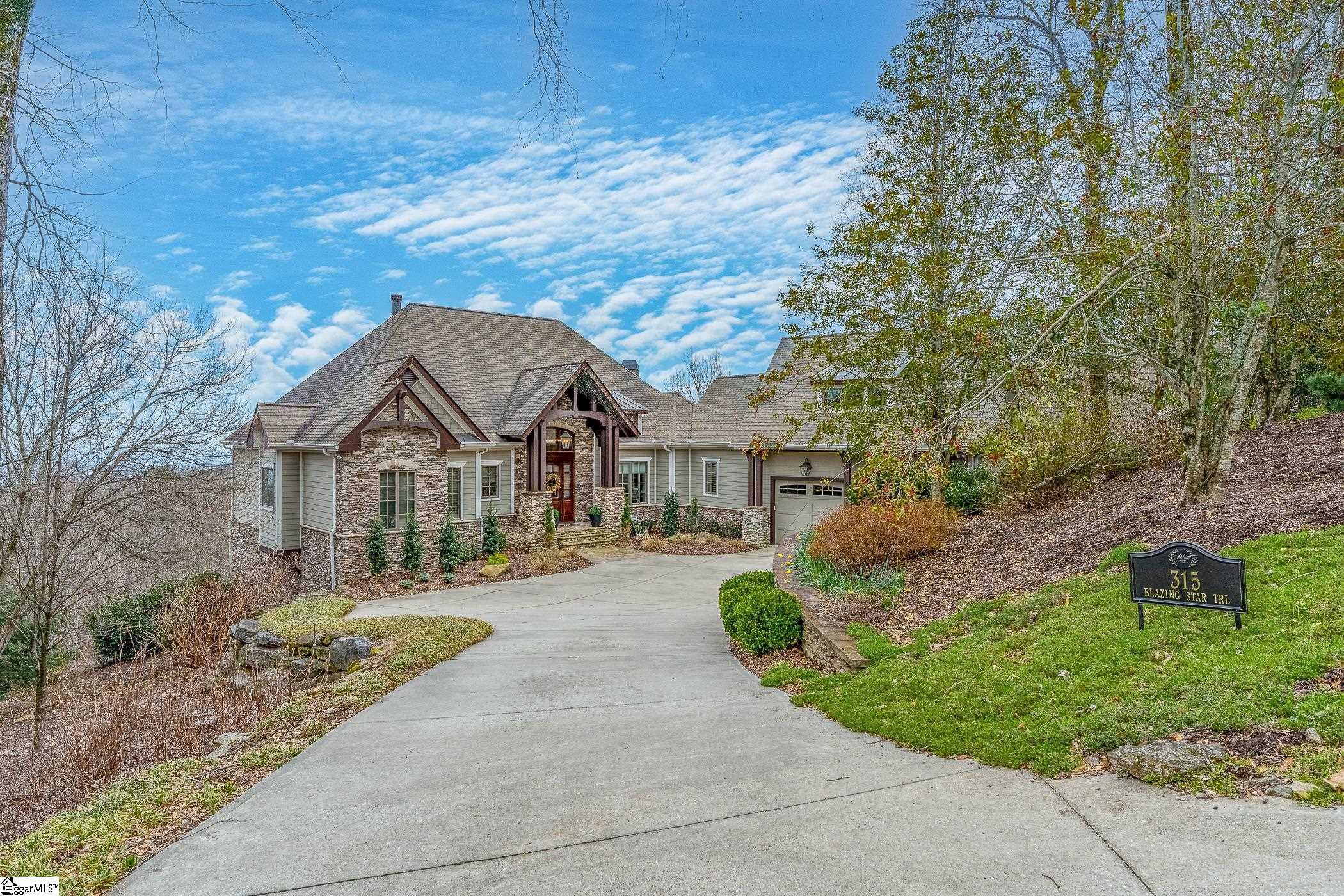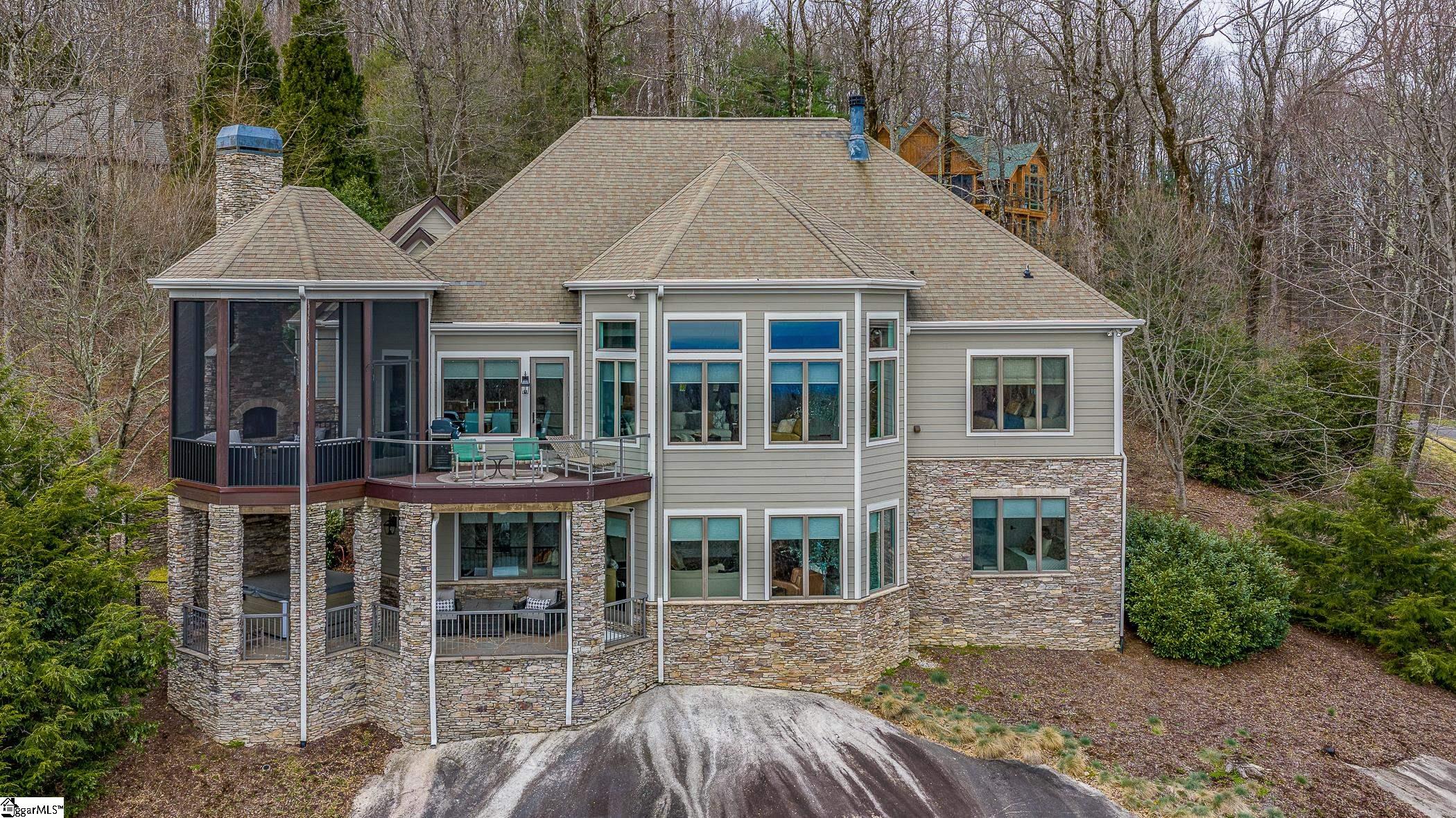 Welcome to 315 Blazing Star Trail, a custom designed, fully furnished, mountain retreat offering long range southeast facing views from nearly every window. Situated on nearly four private acres at an elevation of approximately 3,000 feet, this exceptional property delivers cooler summer temperatures, serene surroundings, and unmatched privacy. Built in 2006 by Bergeron Custom Homes, the residence showcases quality craftsmanship and refined finishes throughout, including mahogany double front doors, extensive crown molding, distressed oak flooring, and floor-to-ceiling Andersen windows that frame the sweeping mountain vistas and flood the home with natural light. The open floor plan flows effortlessly from the foyer, highlighted by a custom barrel oak ceiling with uplighting, into the great room, dining area, and chef’s kitchen. The kitchen is well appointed with a large island featuring a prep sink, a Wolf 6-burner gas cooktop with griddle and vent hood, Sub-Zero refrigerator, Asko dishwasher, custom cabinetry with convenient spice pull-outs, and new quartz countertops. The great room impresses with soaring 10+ foot ceilings, exposed cedar beams, and a dramatic floor-to-ceiling stacked stone gas fireplace with a forged iron screen, creating a warm and inviting gathering space. The main level owner’s suite offers a tray ceiling with cove lighting, an oversized walk-in closet, and a luxurious bath with custom oak vanities, jetted tub, and a spacious walk in shower with designer tile. Outdoor living is equally exceptional, featuring a low-maintenance composite deck and a large octagonal screened porch with a wood burning fireplace, perfect for year round enjoyment while taking in panoramic views. Additional main level features include a private study, central vacuum system, and a custom staircase railing. The lower level is designed for comfort and flexibility, offering a spacious den with a gas fireplace, three ensuite bedrooms with large walk in closets. A lower level mechanics room is easily accessible and includes a very large storage area. Notably, all three lower level bathrooms have been expertly remodeled, enhancing both style and functionality. The lower level outdoor space includes a flagstone patio with a Hot Springs spa featuring six jetted seats, along with a covered deck complete with an under mount drainage system for all weather enjoyment. The fenced side yard is ideal for pets, while the backyard’s natural rock outcropping adds to the home’s distinctive mountain character. The landscaping has been meticulously maintained, further elevating the property’s curb appeal. This offering also includes the adjacent 1.6-acre homesite at 309 Blazing Star Trail (tax id 0646140104400), providing additional privacy or future building potential. Recent updates include new furnishings, lighting, and décor throughout creating a true turn-key opportunity. Additional improvements include a newer HVAC system for the main level as well as a rescreened and refinished porch. A Cliffs Club membership is available to purchase with this property, granting access to all seven Cliffs communities and their world-class amenities.