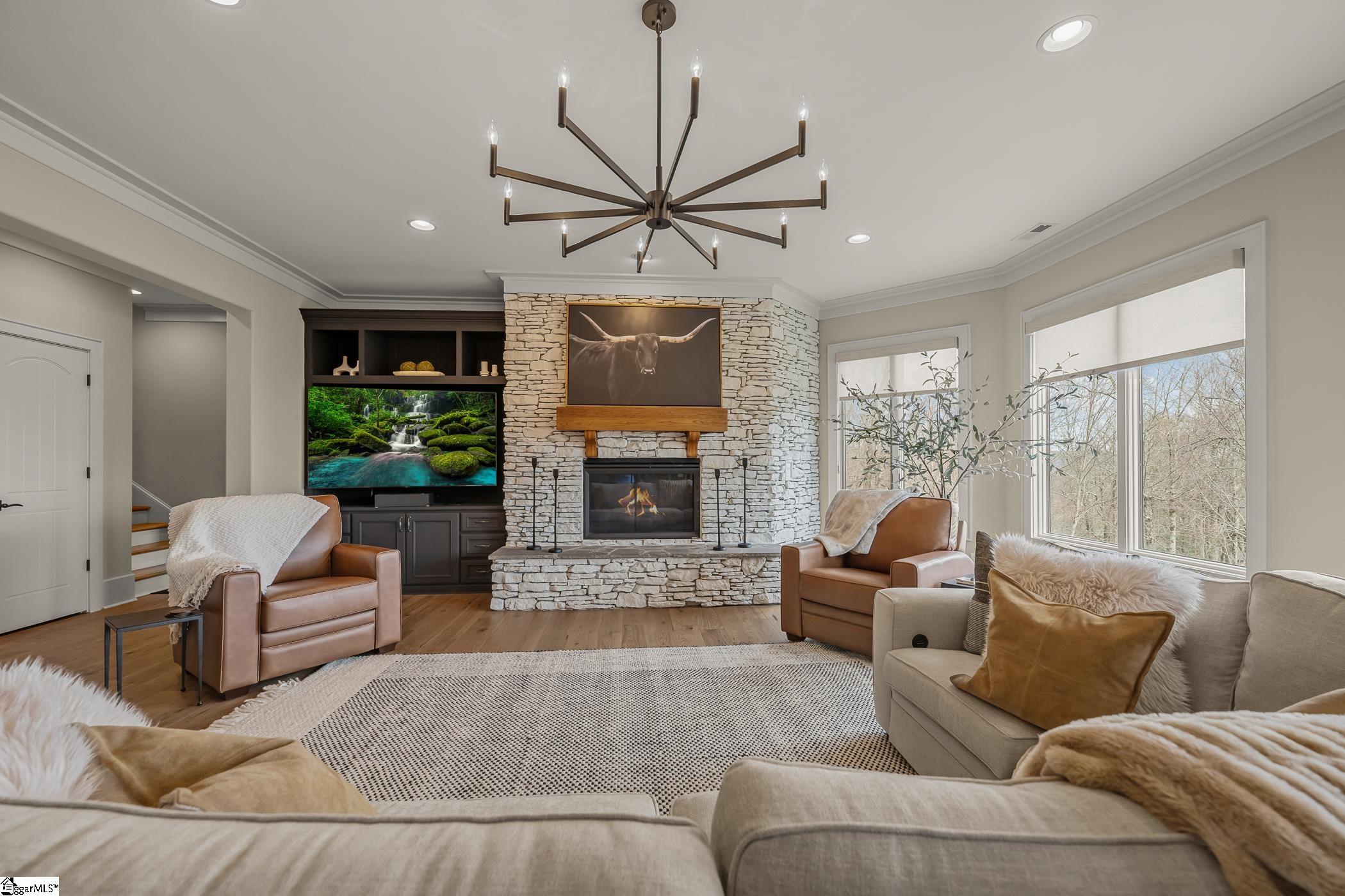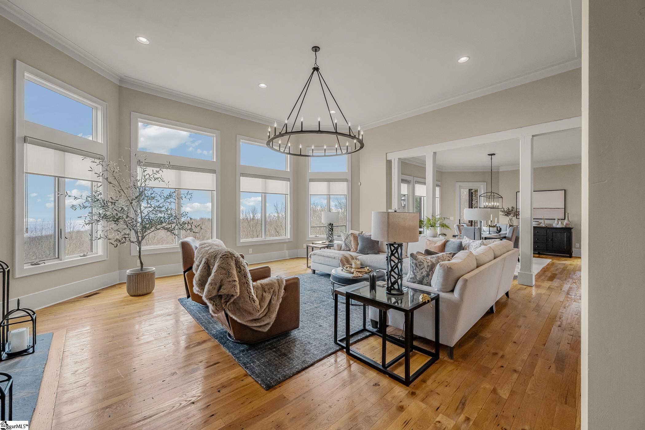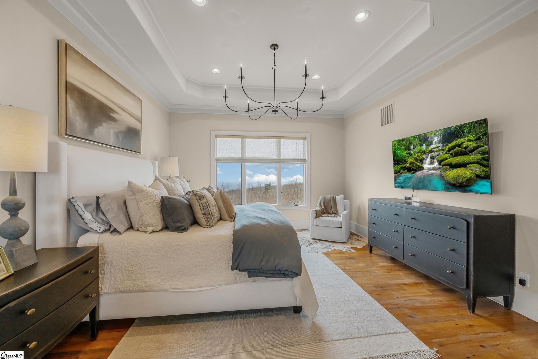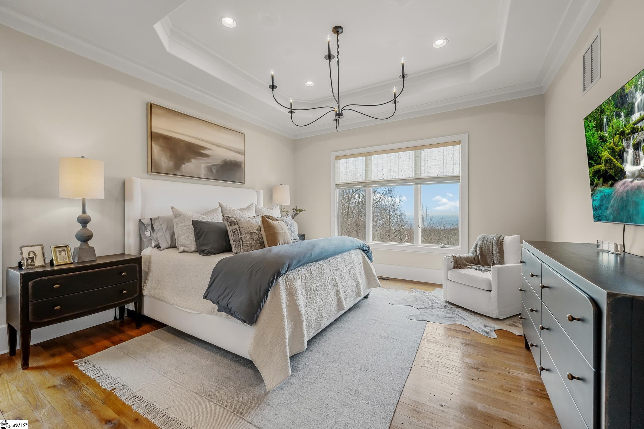 Welcome to 315 Blazing Star Trail, a custom designed, fully furnished, mountain retreat offering long range southeast facing views from nearly every window. Situated on nearly four private acres at an elevation of approximately 3,000 feet, this exceptional property delivers cooler summer temperatures, serene surroundings, and unmatched privacy. Built in 2006 by Bergeron Custom Homes, the residence showcases quality craftsmanship and refined finishes throughout, including mahogany double front doors, extensive crown molding, distressed oak flooring, and floor-to-ceiling Andersen windows that frame the sweeping mountain vistas and flood the home with natural light. The open floor plan flows effortlessly from the foyer, highlighted by a custom barrel oak ceiling with uplighting, into the great room, dining area, and chef’s kitchen. The kitchen is well appointed with a large island featuring a prep sink, a Wolf 6-burner gas cooktop with griddle and vent hood, Sub-Zero refrigerator, Asko dishwasher, custom cabinetry with convenient spice pull-outs, and new quartz countertops. The great room impresses with soaring 10+ foot ceilings, exposed cedar beams, and a dramatic floor-to-ceiling stacked stone gas fireplace with a forged iron screen, creating a warm and inviting gathering space. The main level owner’s suite offers a tray ceiling with cove lighting, an oversized walk-in closet, and a luxurious bath with custom oak vanities, jetted tub, and a spacious walk in shower with designer tile. Outdoor living is equally exceptional, featuring a low-maintenance composite deck and a large octagonal screened porch with a wood burning fireplace, perfect for year round enjoyment while taking in panoramic views. Additional main level features include a private study, central vacuum system, and a custom staircase railing. The lower level is designed for comfort and flexibility, offering a spacious den with a gas fireplace, three ensuite bedrooms with large walk in closets. A lower level mechanics room is easily accessible and includes a very large storage area. Notably, all three lower level bathrooms have been expertly remodeled, enhancing both style and functionality. The lower level outdoor space includes a flagstone patio with a Hot Springs spa featuring six jetted seats, along with a covered deck complete with an under mount drainage system for all weather enjoyment. The fenced side yard is ideal for pets, while the backyard’s natural rock outcropping adds to the home’s distinctive mountain character. The landscaping has been meticulously maintained, further elevating the property’s curb appeal. This offering also includes the adjacent 1.6-acre homesite at 309 Blazing Star Trail (tax id 0646140104400), providing additional privacy or future building potential. Recent updates include new furnishings, lighting, and décor throughout creating a true turn-key opportunity. Additional improvements include a newer HVAC system for the main level as well as a rescreened and refinished porch. A Cliffs Club membership is available to purchase with this property, granting access to all seven Cliffs communities and their world-class amenities.