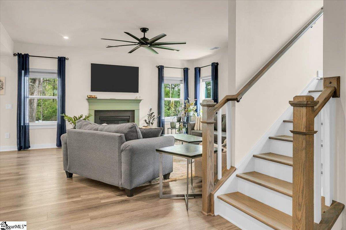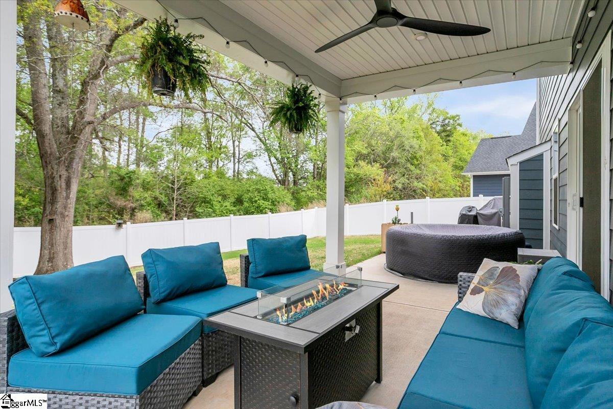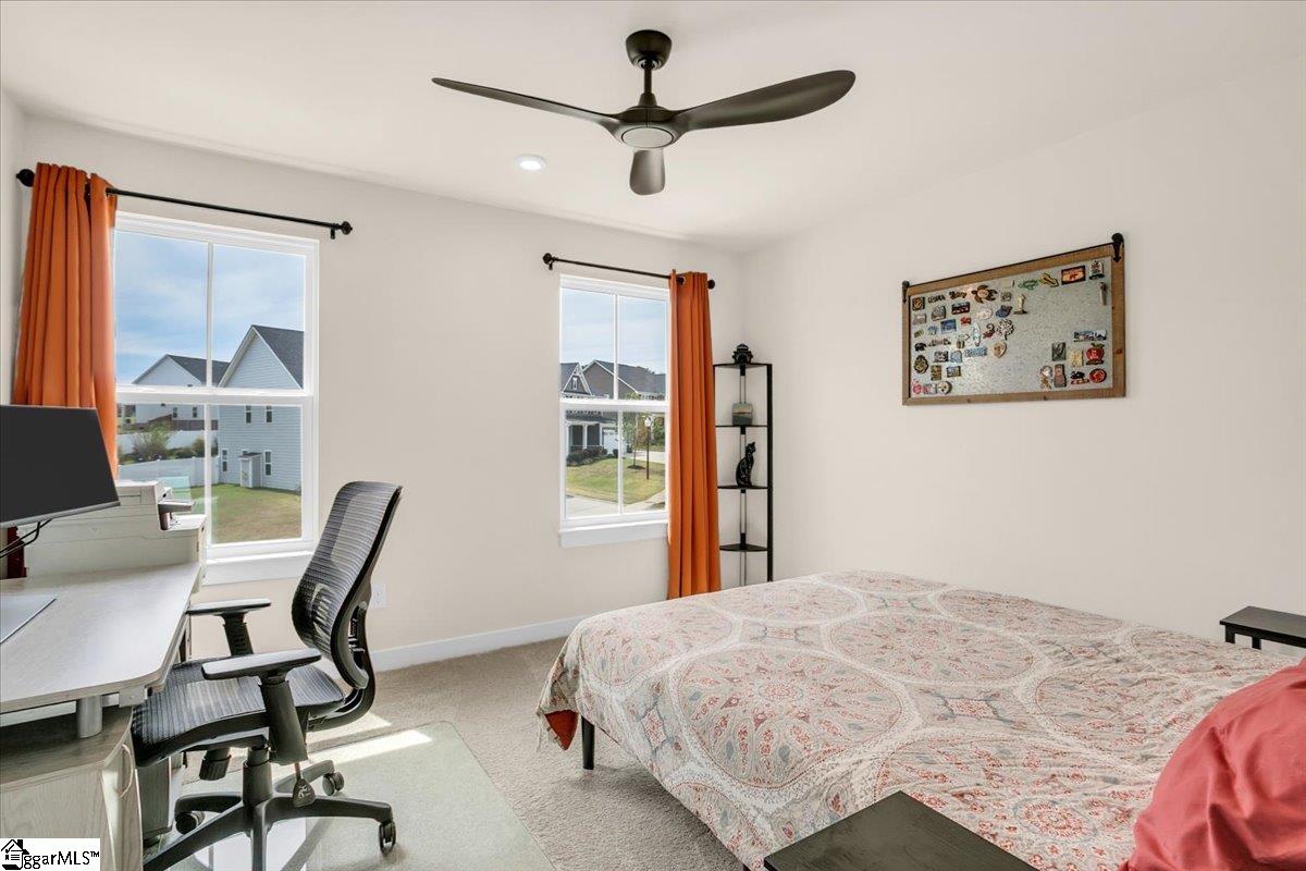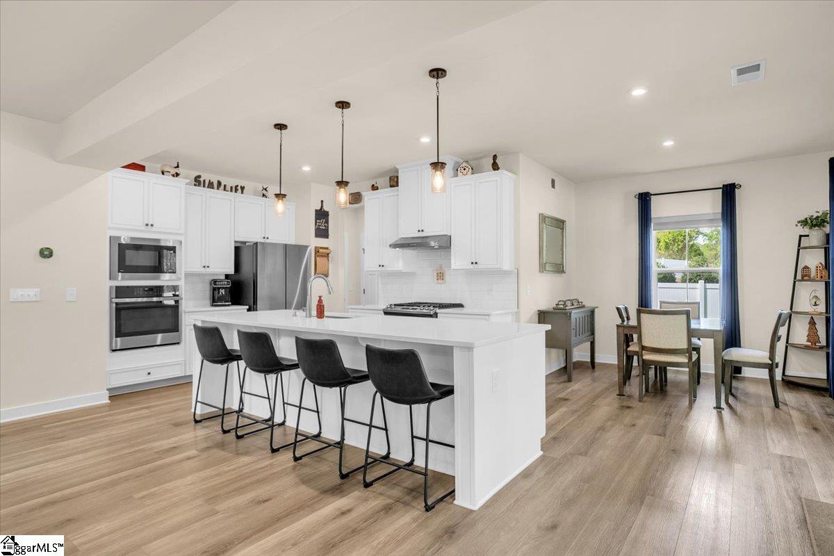 Welcome to Riverstone—where newer construction meets an unbeatable lifestyle in one of the area’s most sought-after communities. This beautifully designed home built in 2023 offers 3 bedrooms, 2.5 baths, plus a dedicated flex/office space and a generously sized loft, giving you the versatility to fit your lifestyle. The main level features wide-plank LVP flooring and hardwood stairs, creating a seamless, polished look throughout. At the heart of the home is an impressive kitchen built for both everyday living and entertainment. Enjoy a massive 10-foot island, quartz countertops, custom tile backsplash, gas cooktop, double ovens, 42″ cabinetry, and the rare bonus of two pantries—providing exceptional storage. The kitchen flows effortlessly into the breakfast area and spacious living room, anchored by a beautiful gas log fireplace. A private flex/office with French doors on the main level offers the perfect space for working from home or quiet retreat. Upstairs, you will find all three bedrooms along with a versatile loft area. The primary suite is truly expansive, featuring a closet so large it feels like an additional room. The en-suite bath includes a double vanity and a stunning tiled walk-in shower with dual shower heads and a built-in bench for a spa-like experience. Step outside to enjoy a private, fully fenced backyard with a large, covered patio—perfect for relaxing or entertaining. With no rear neighbors and a peaceful wooded backdrop, this outdoor space offers rare privacy. Riverstone residents enjoy an exceptional amenity package including a pool, tennis and pickleball courts, playground, fitness facility, and scenic walking trails leading to a pavilion and picnic area by the river. All of this in a prime location just minutes from shopping, dining, and convenient access to I-385—offering the perfect blend of tranquility and accessibility.